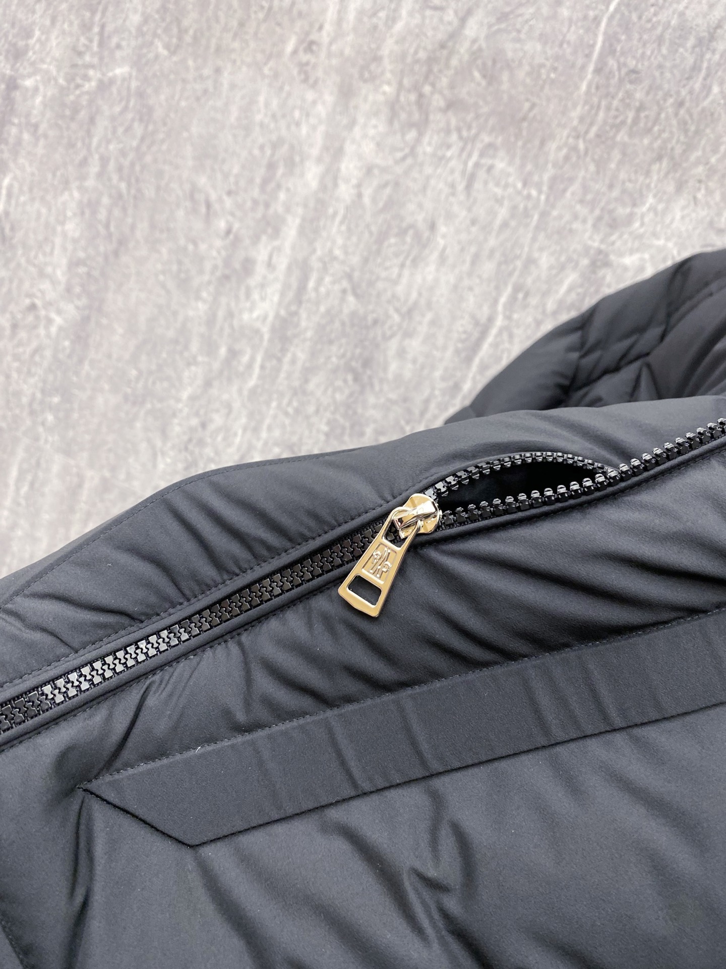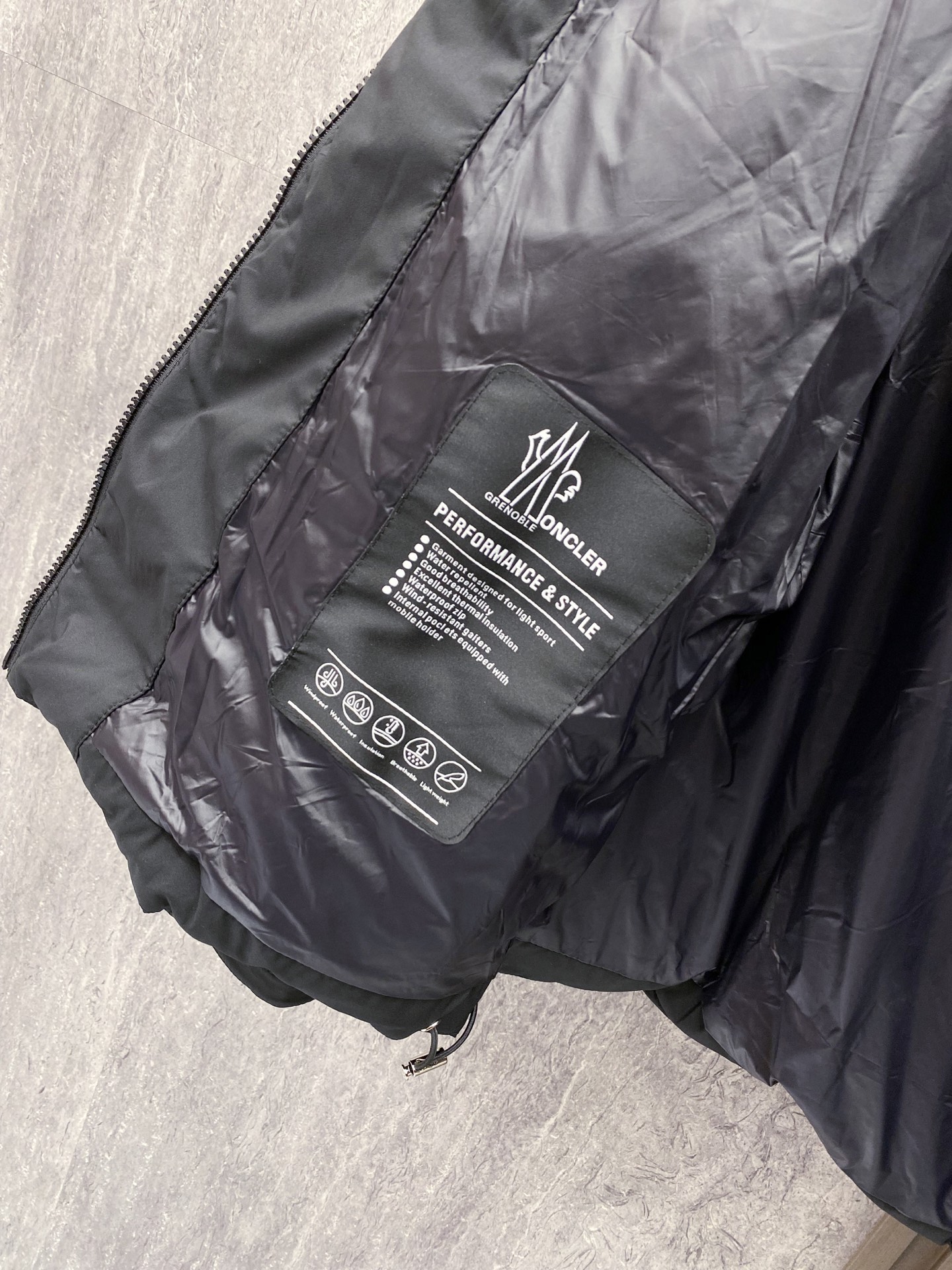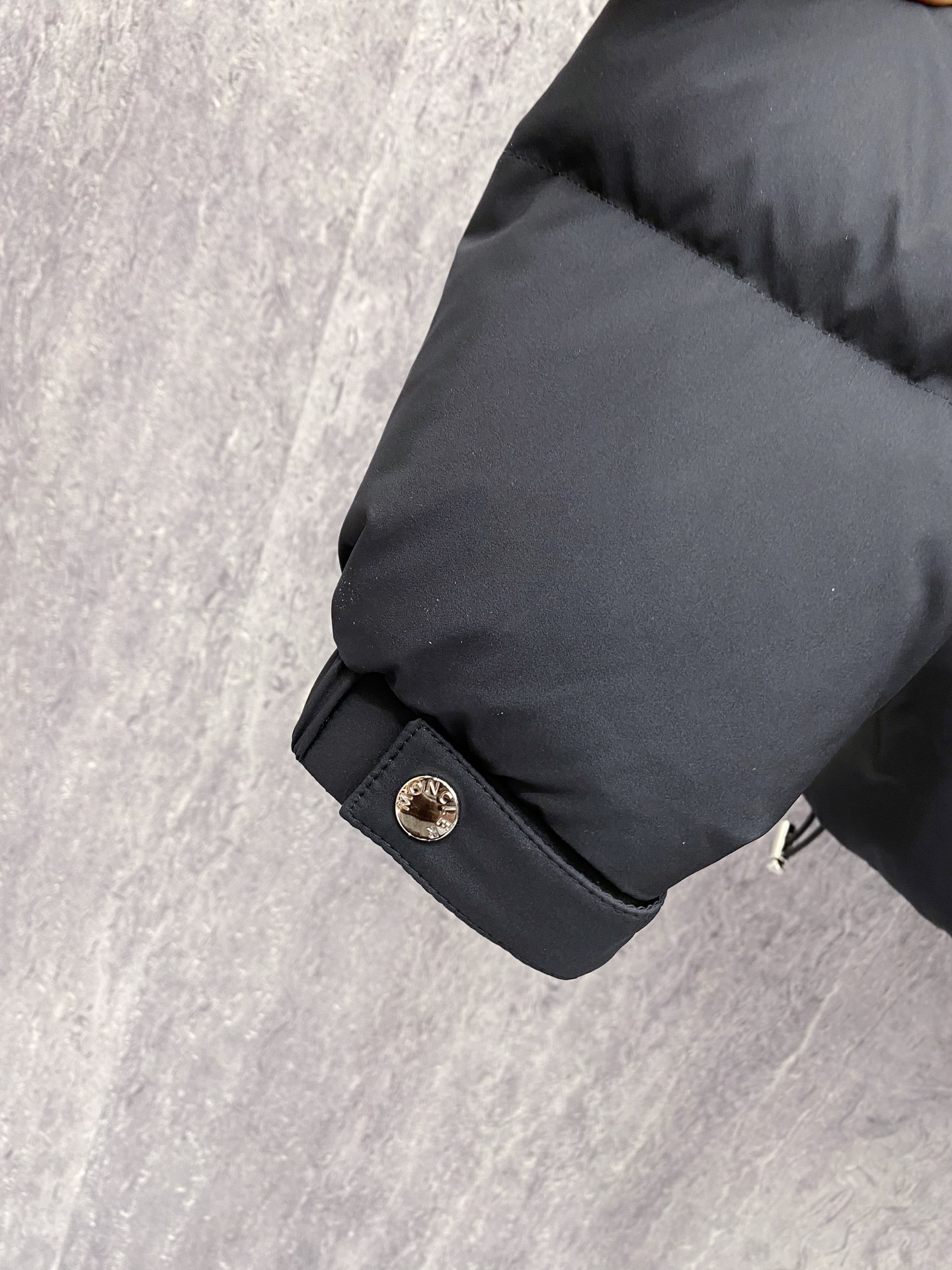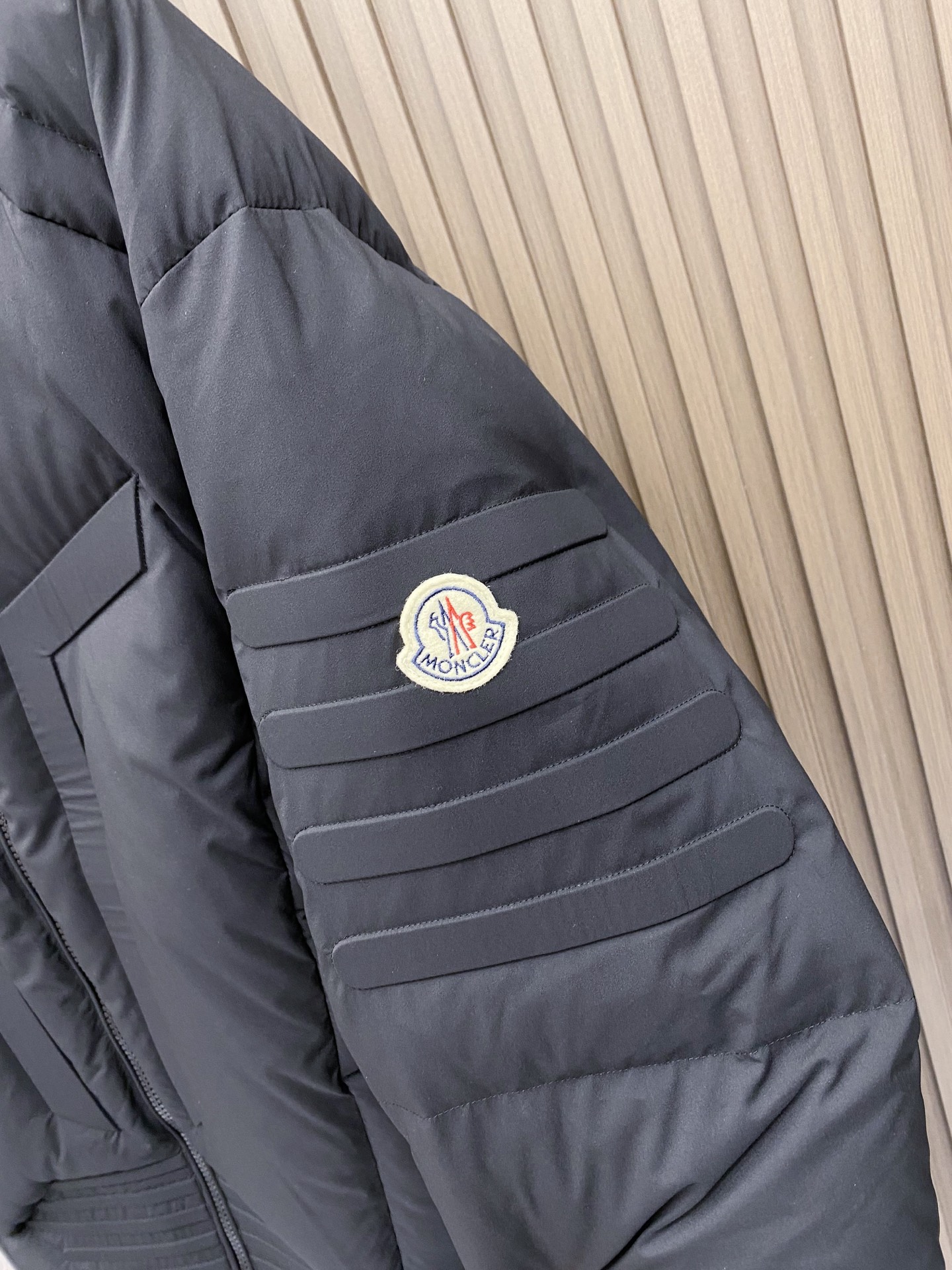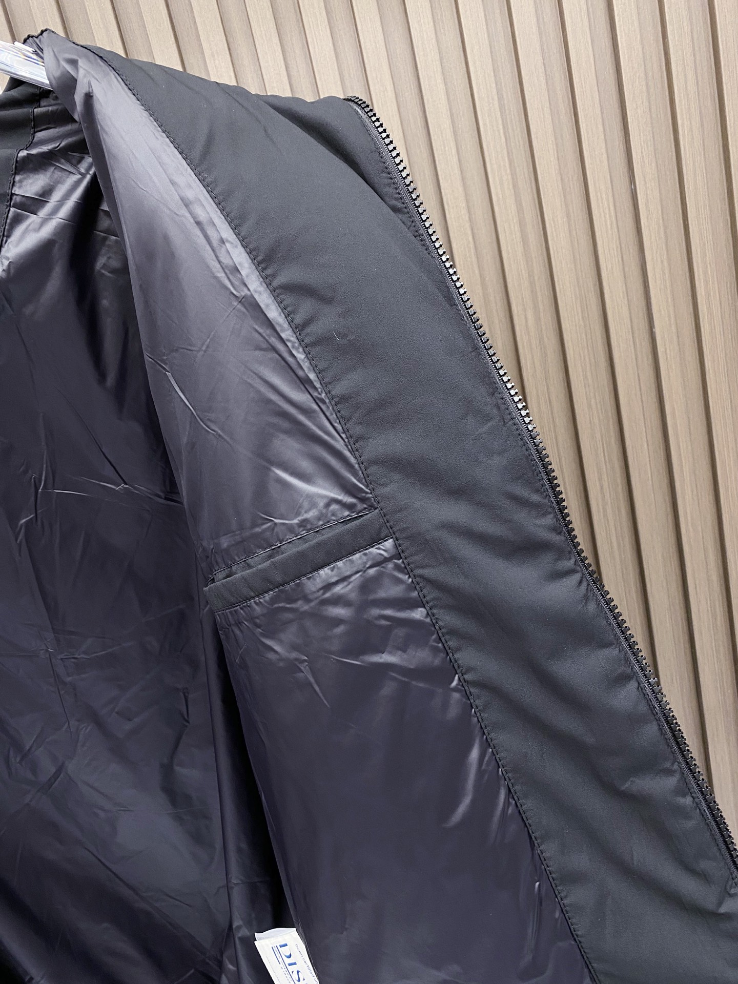 Details: Heavy-duty jacket with a unique cut, stand-up collar, water-repellent nylon fabric, embroidered logo, hidden pockets, and adjustable cuffs and hem