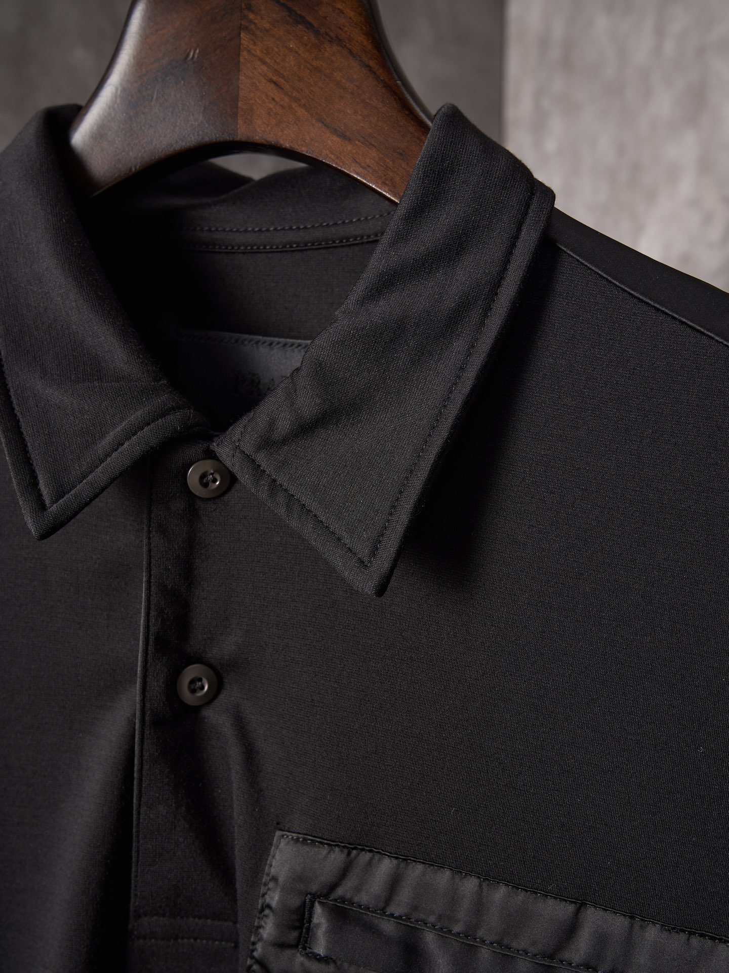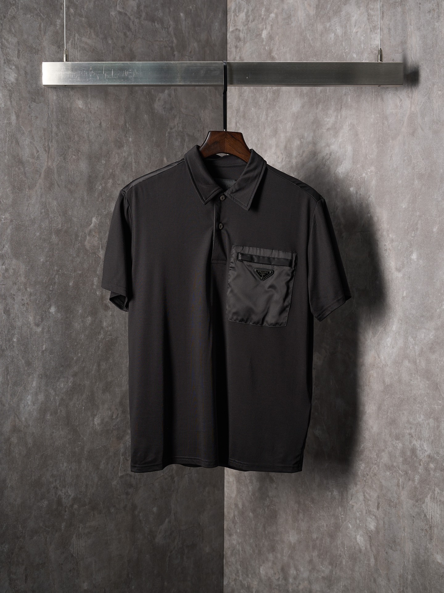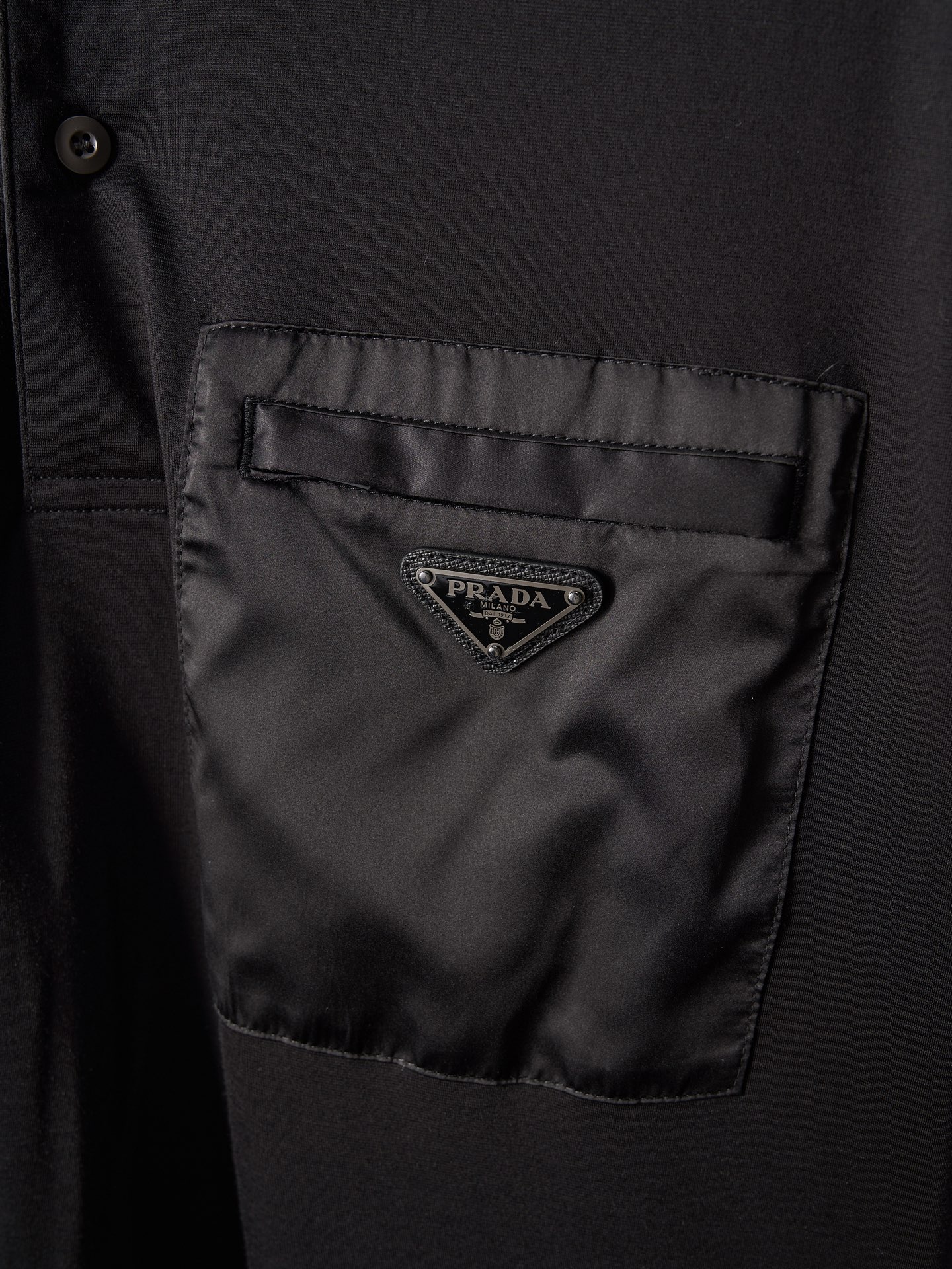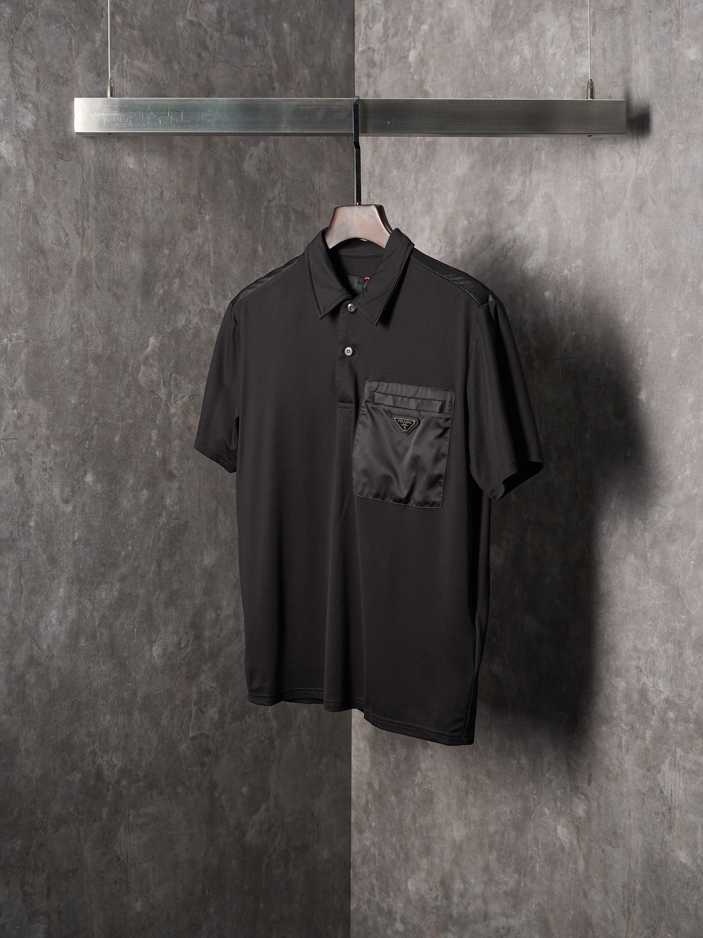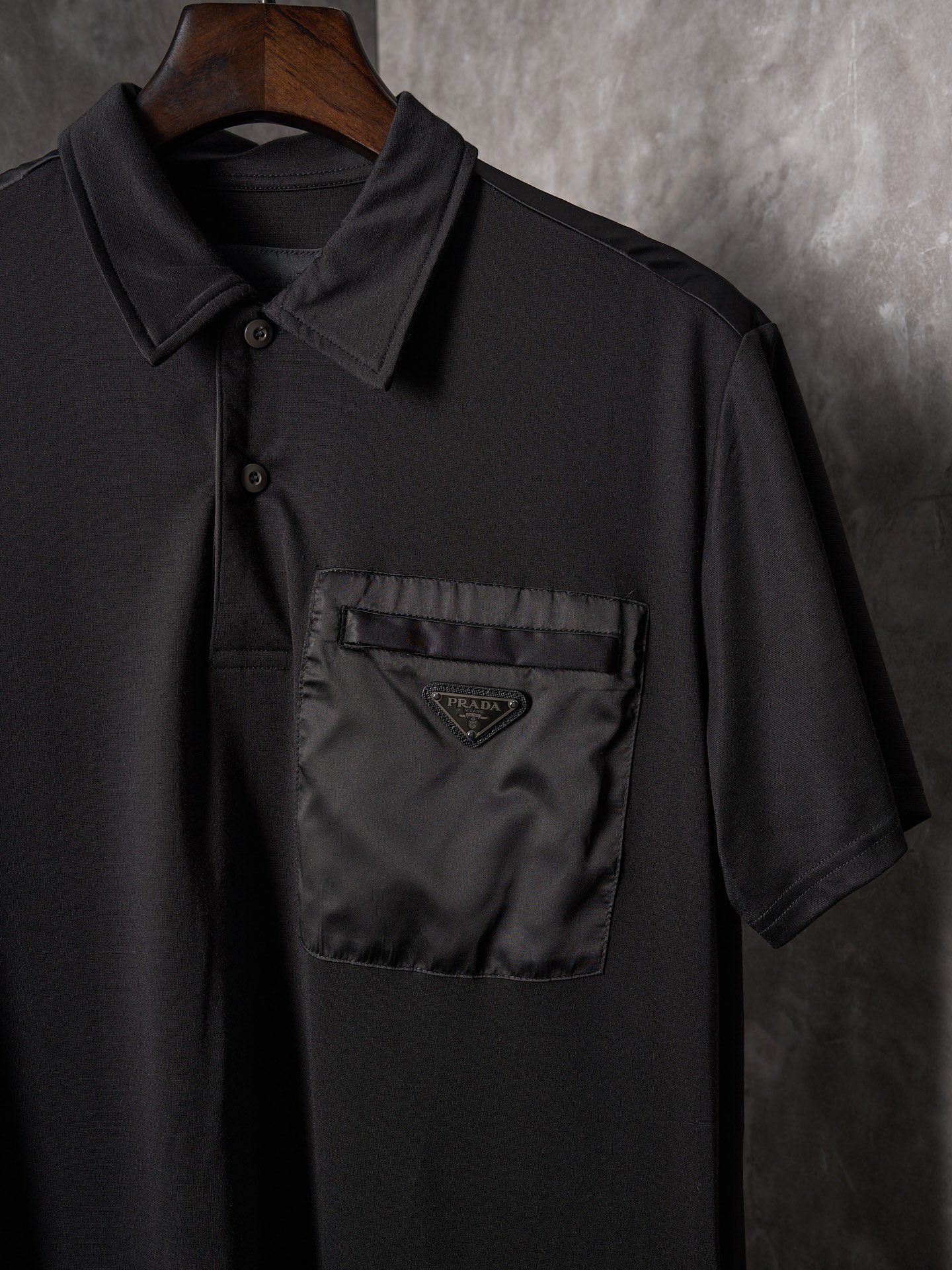Details: Black Polo Shirt with Triangle Logo and Zipper Pocket, Smooth and Elegant Design