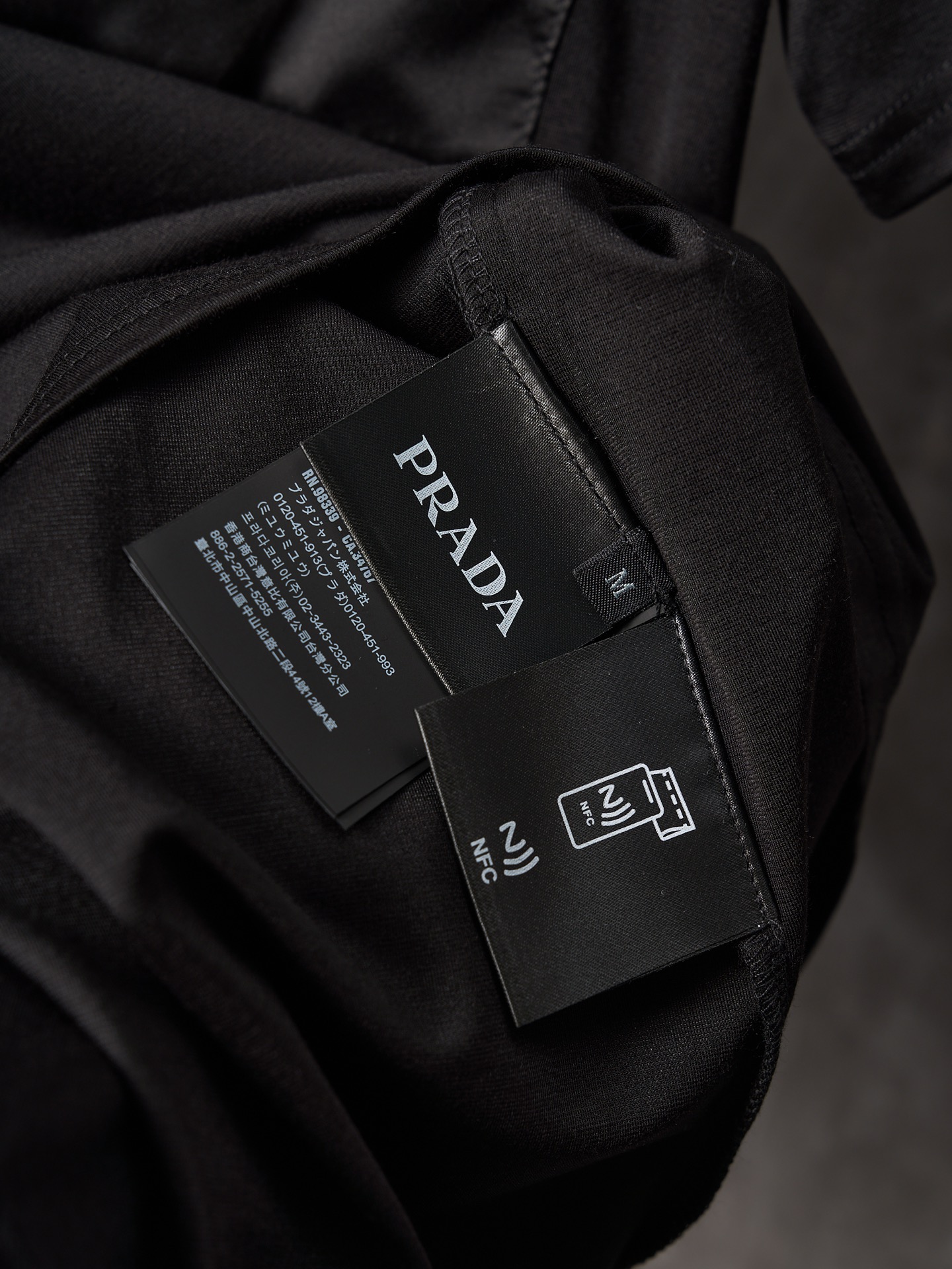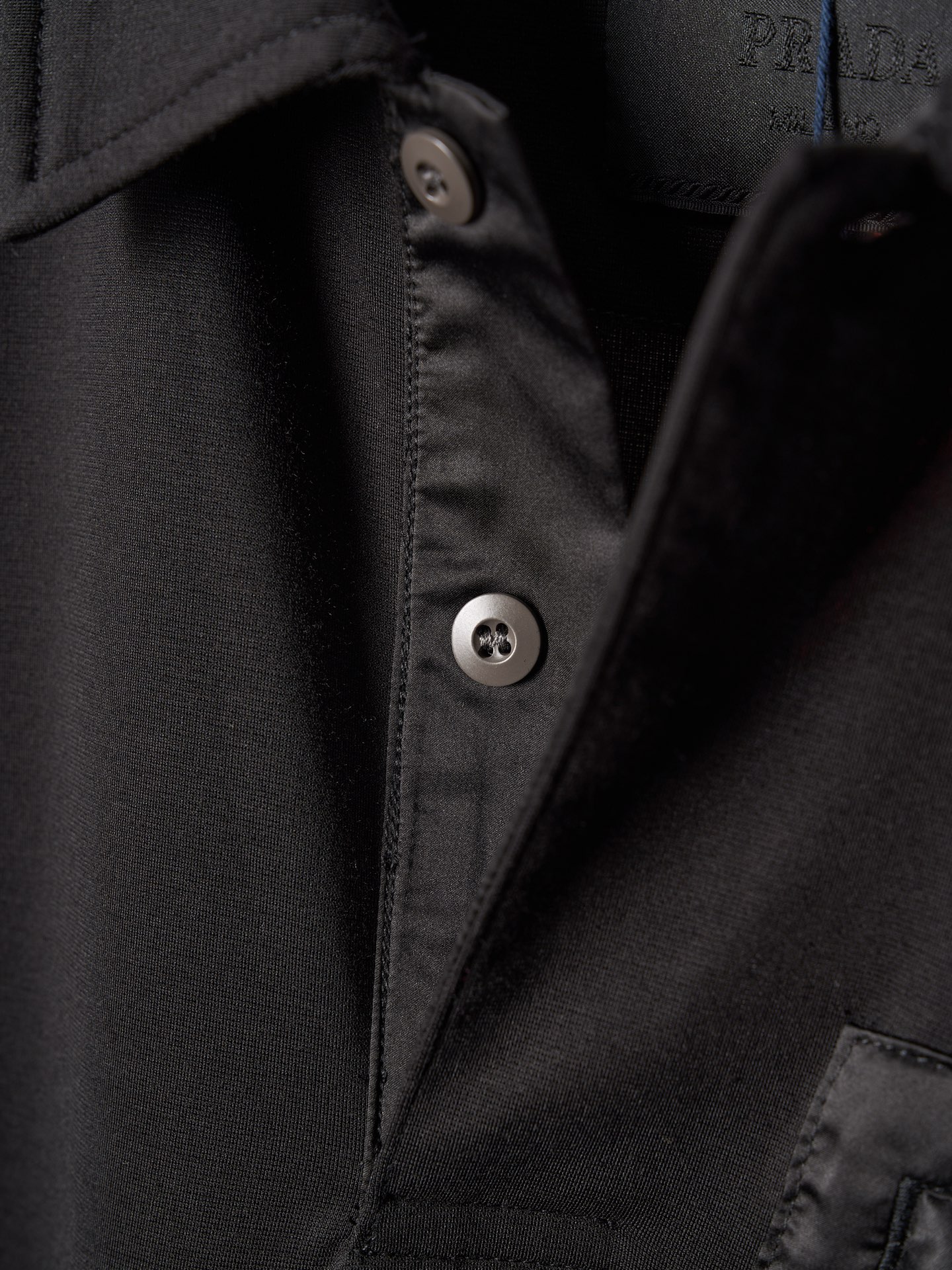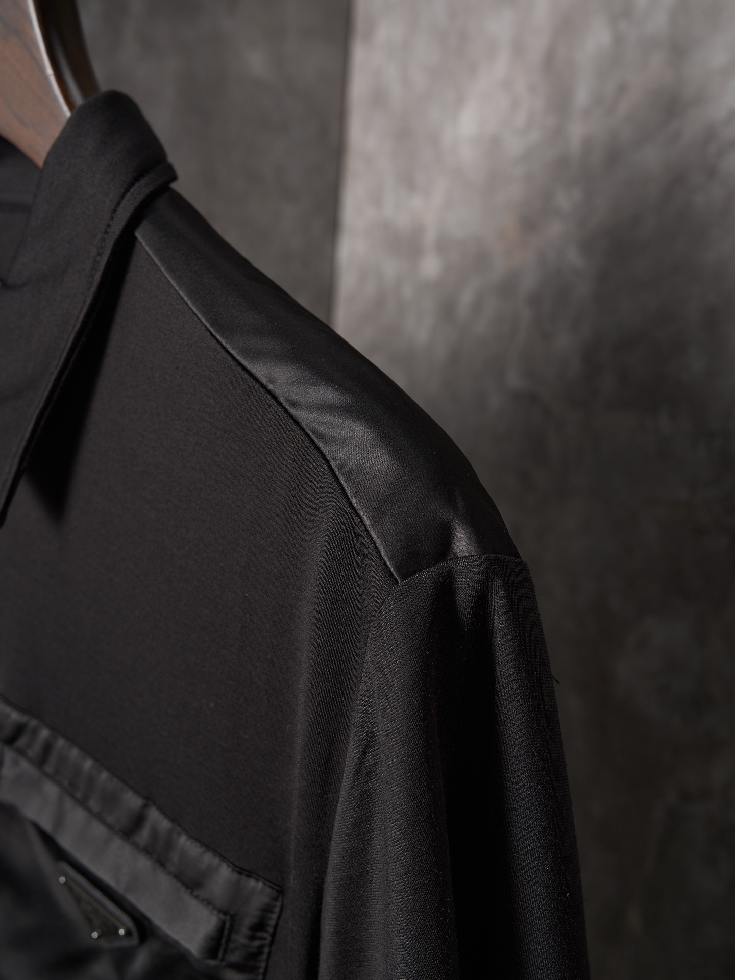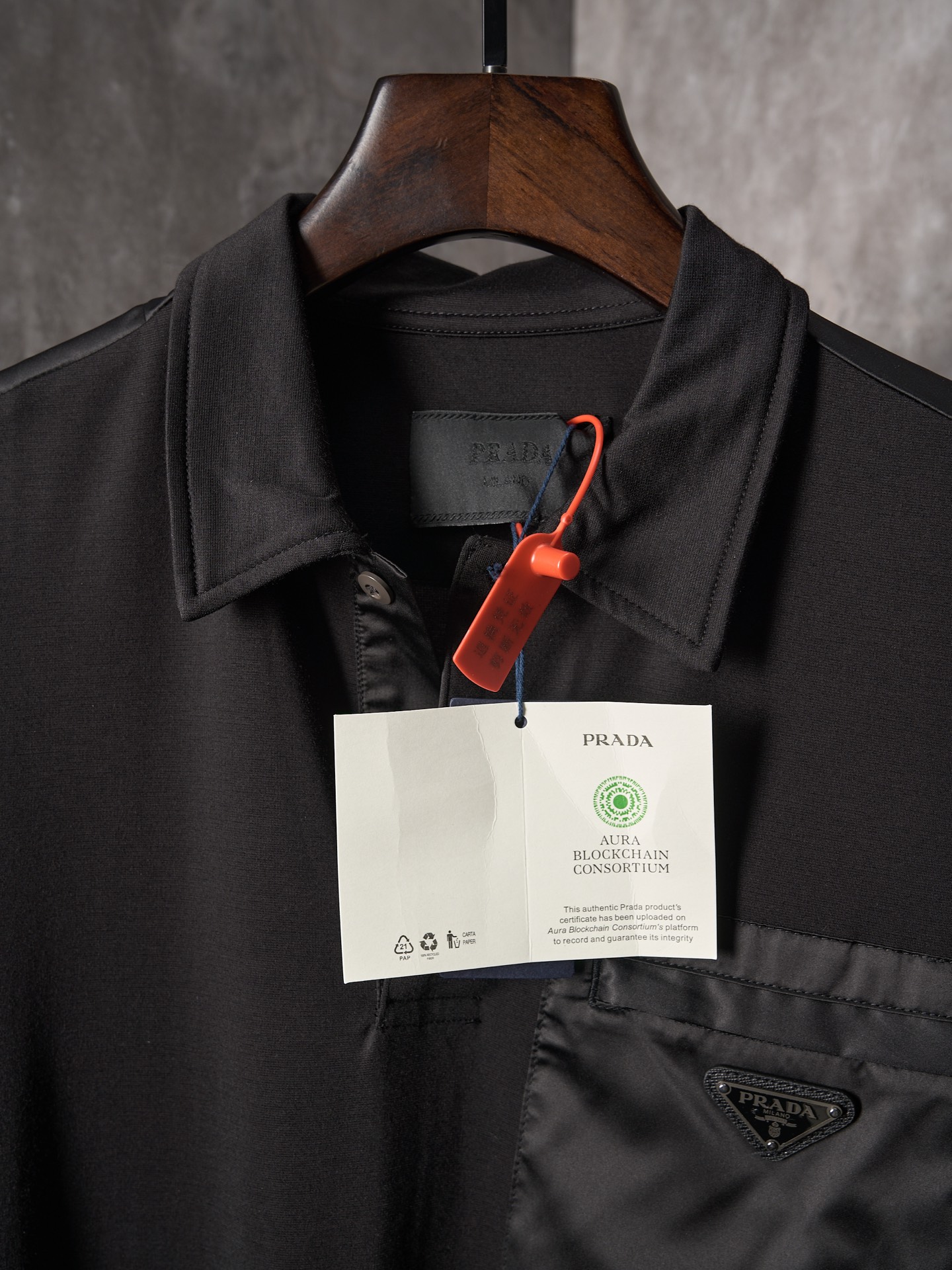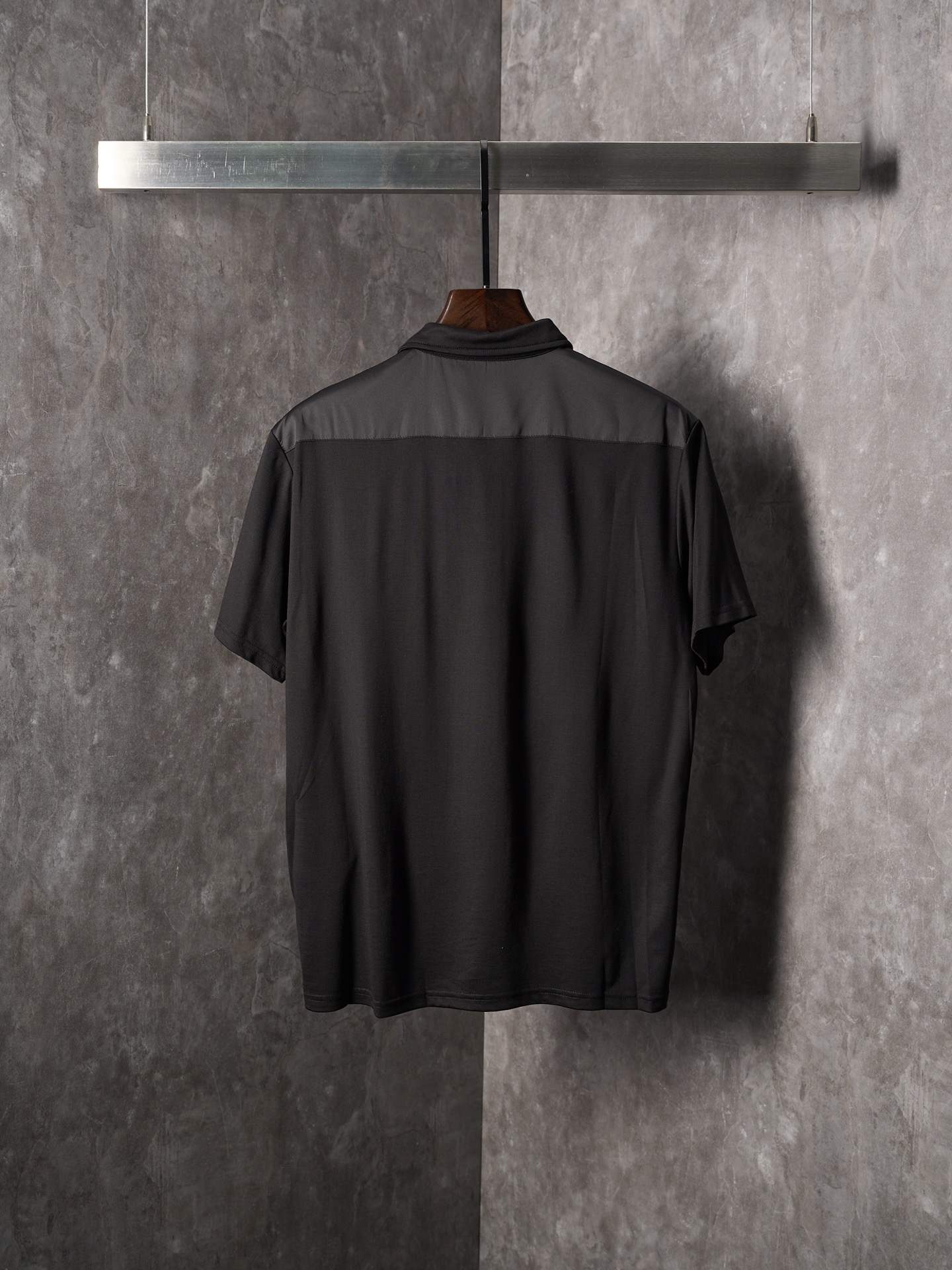 Details: Black Polo Shirt with Triangle Logo and Zipper Pocket, Smooth and Elegant Design