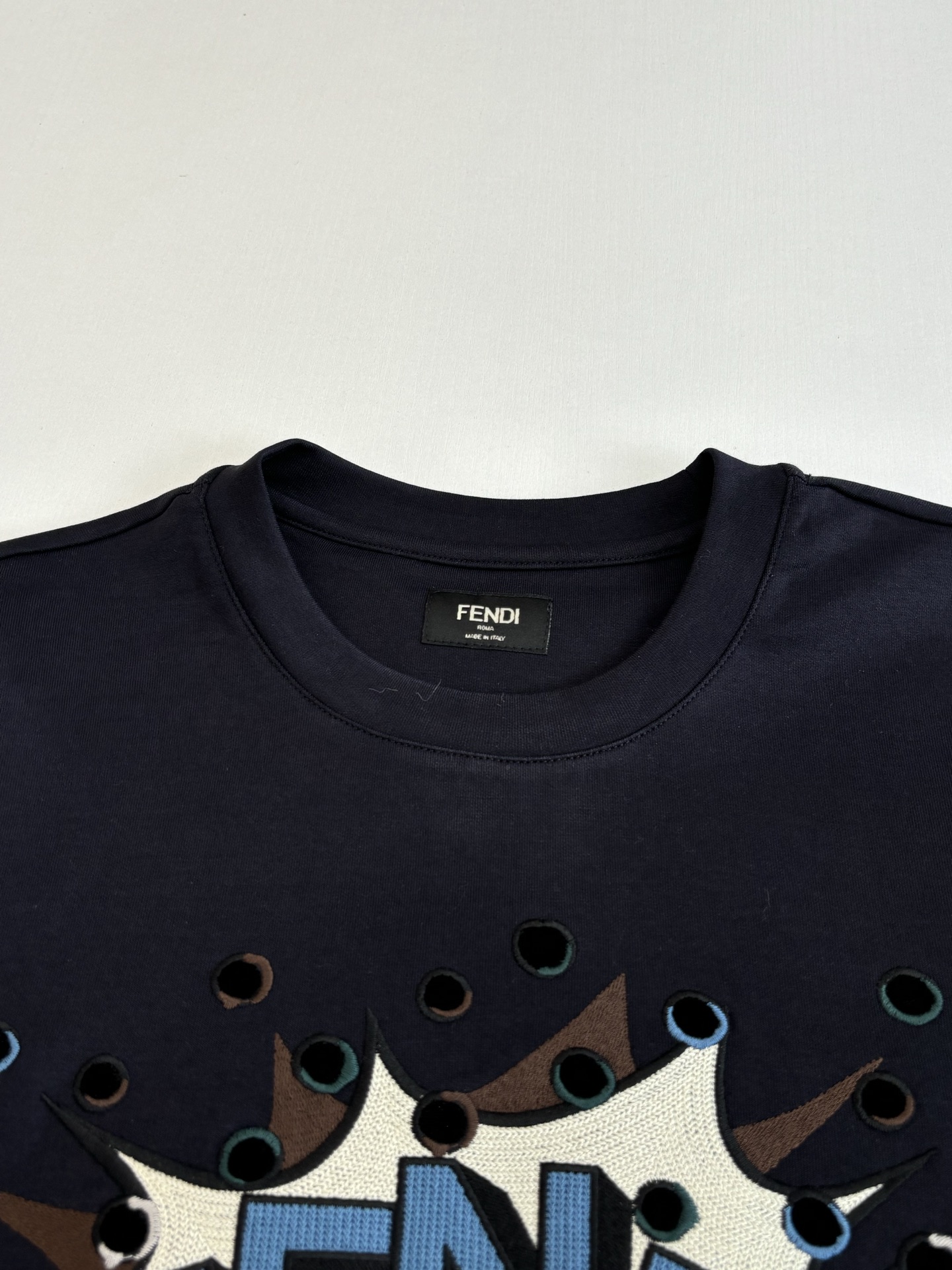 Details: Short-sleeved T-shirt with a custom embroidered pattern and a tailored fit