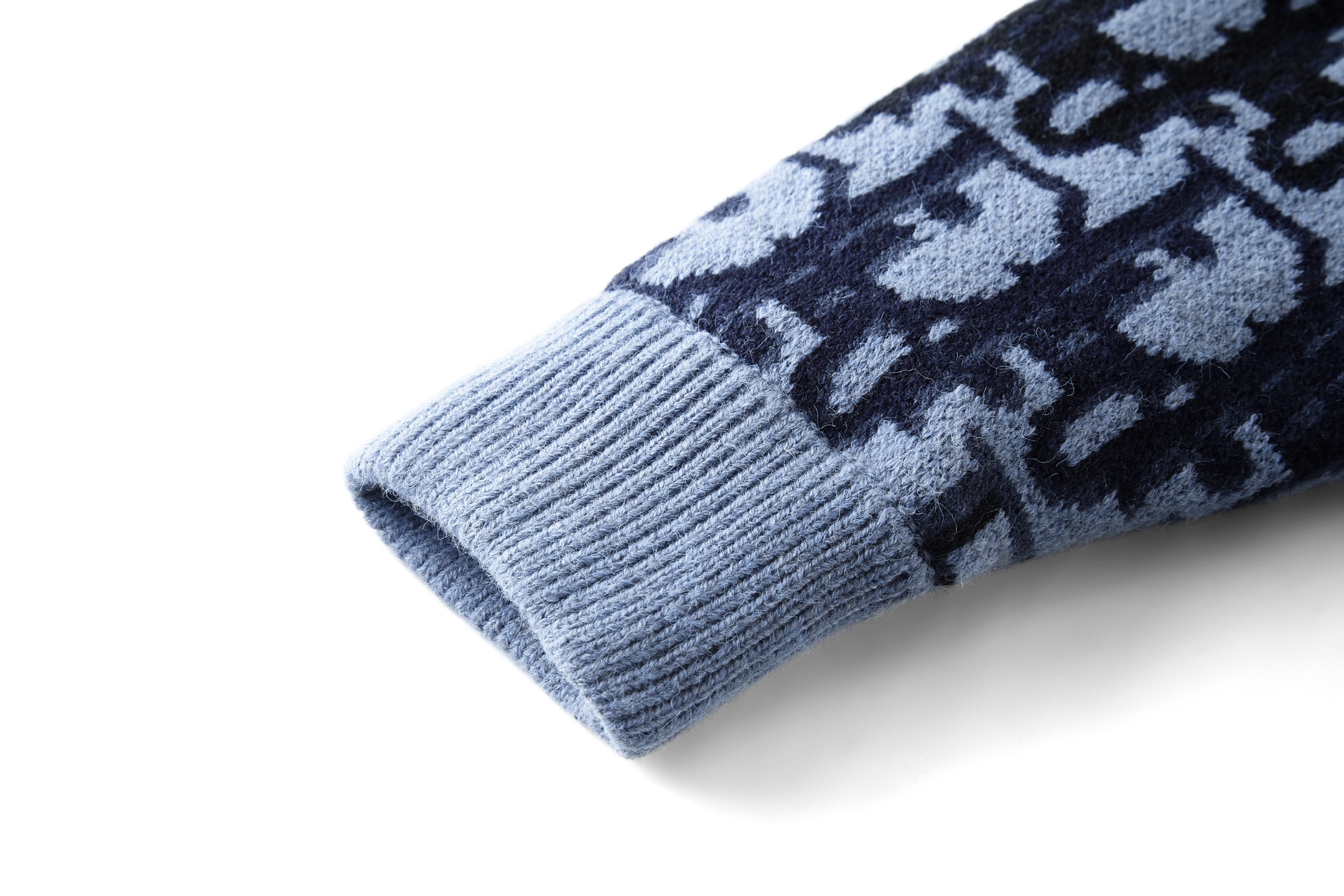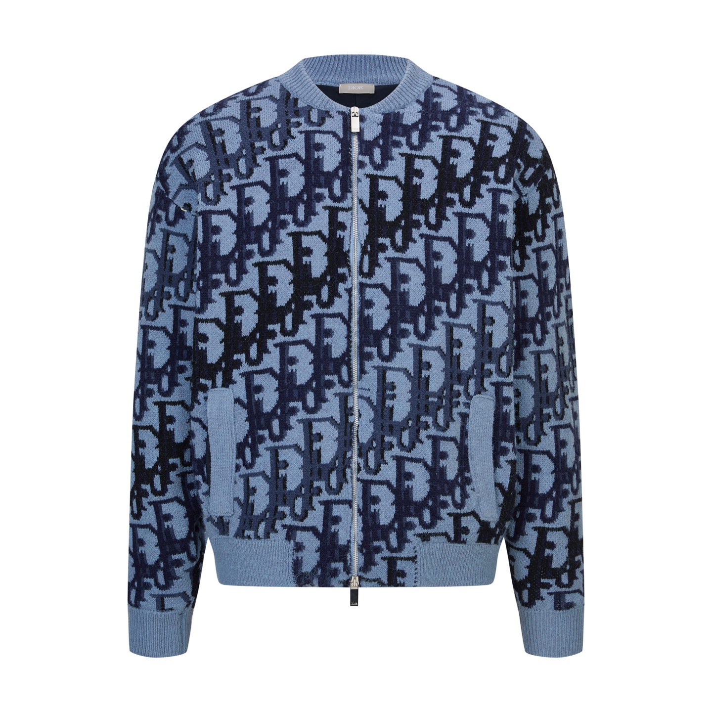 Details: Blue knitted zip-up jacket with a jacquard logo, soft and stylish