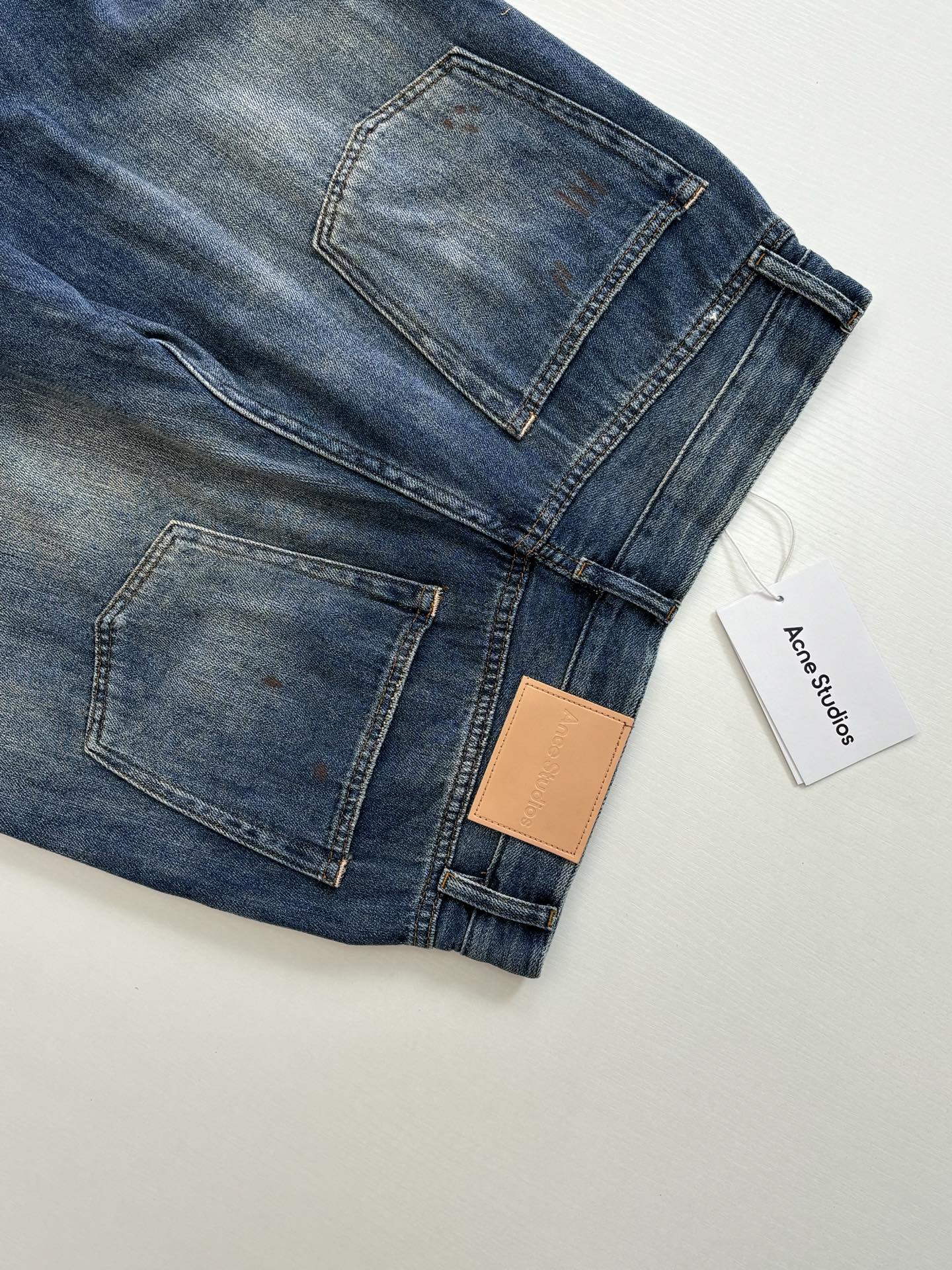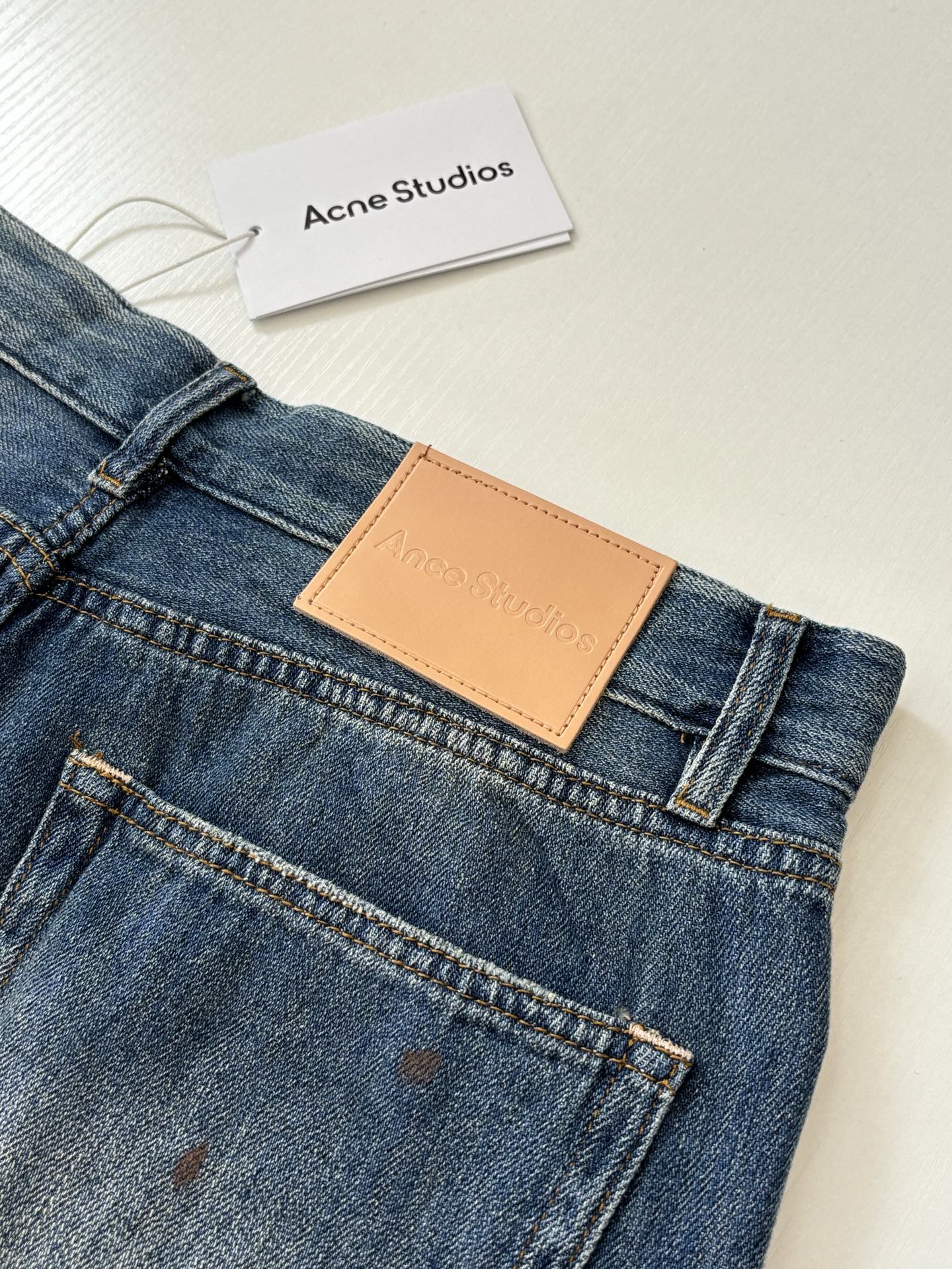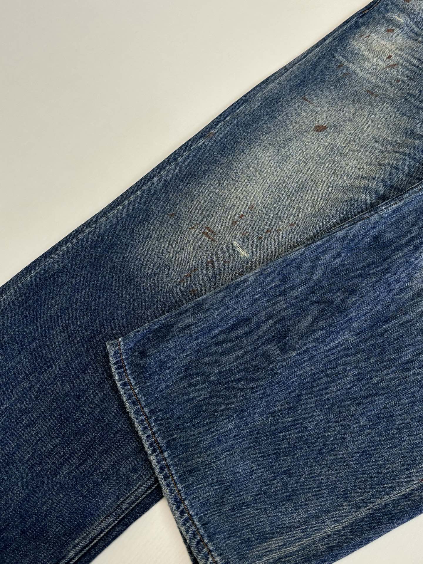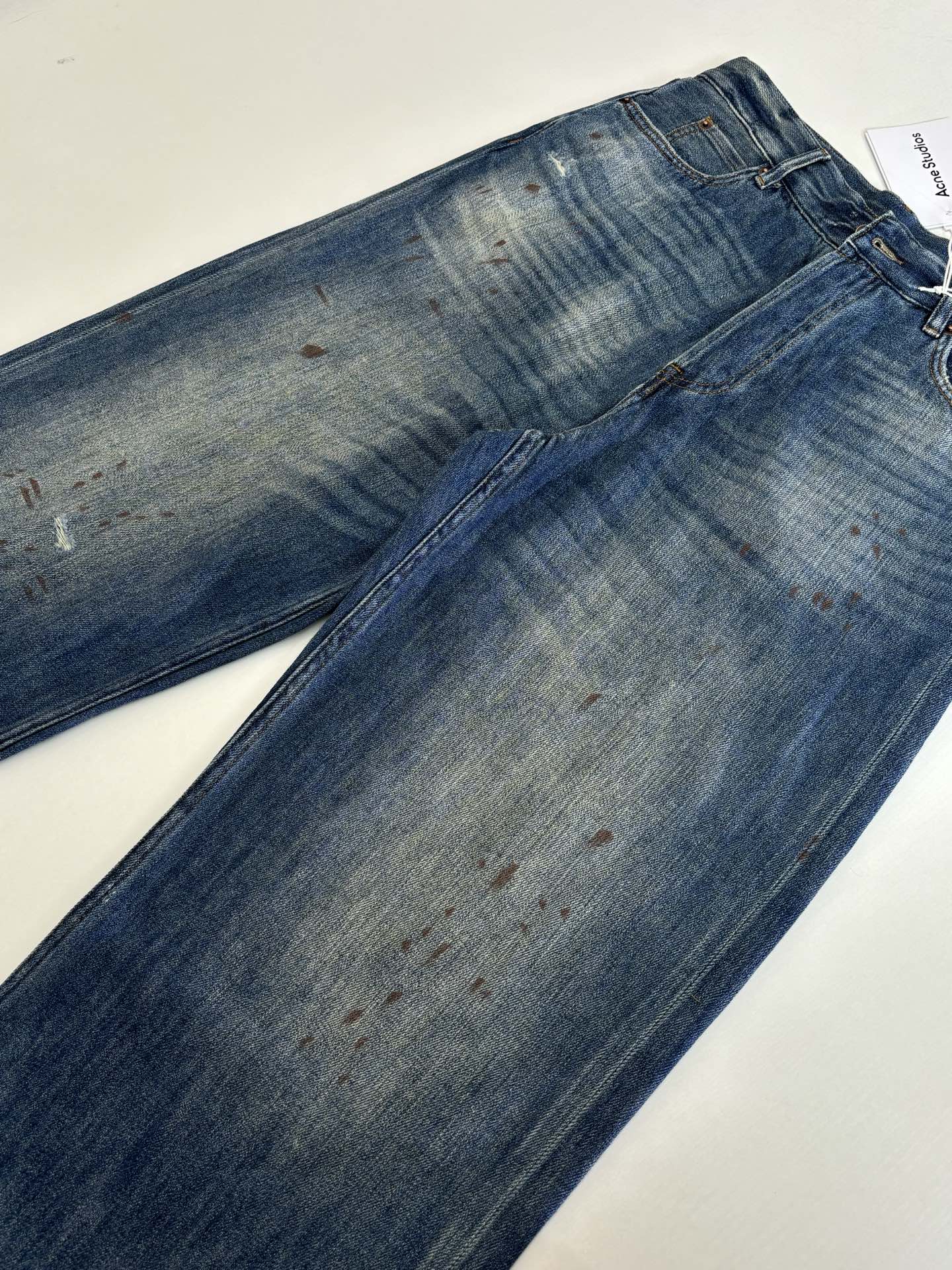 Details: High-combed cotton jeans with hand-splattered pattern and vintage details