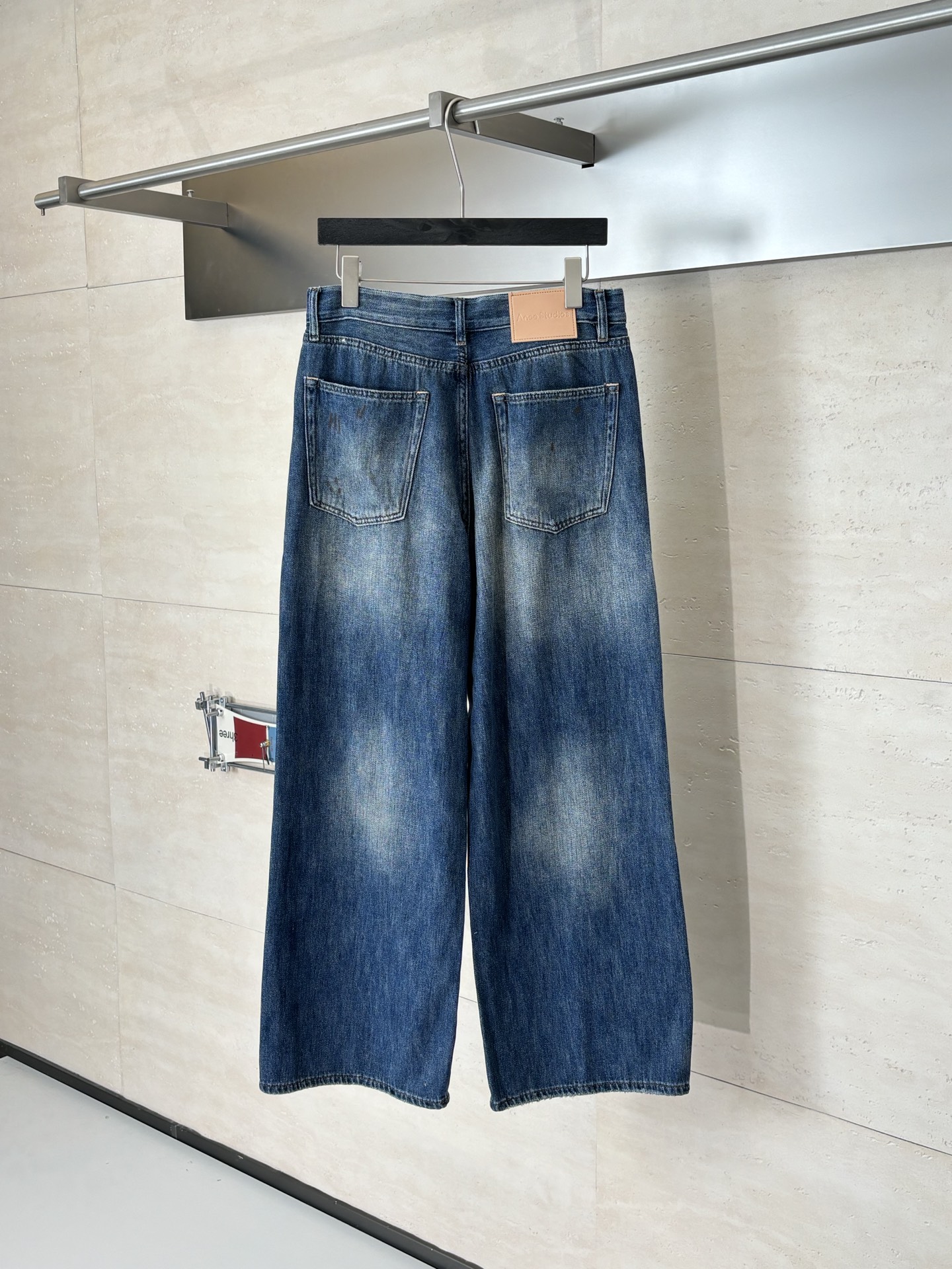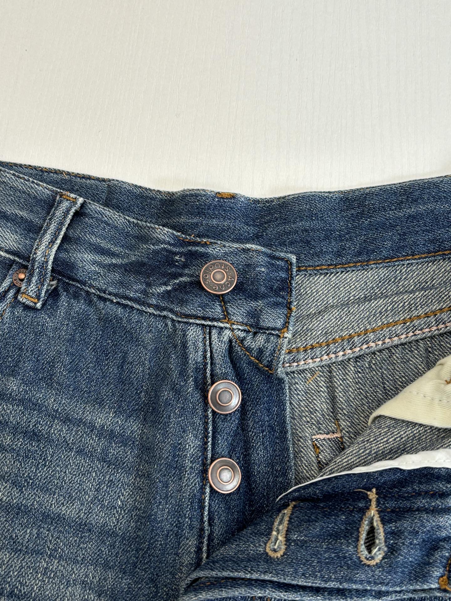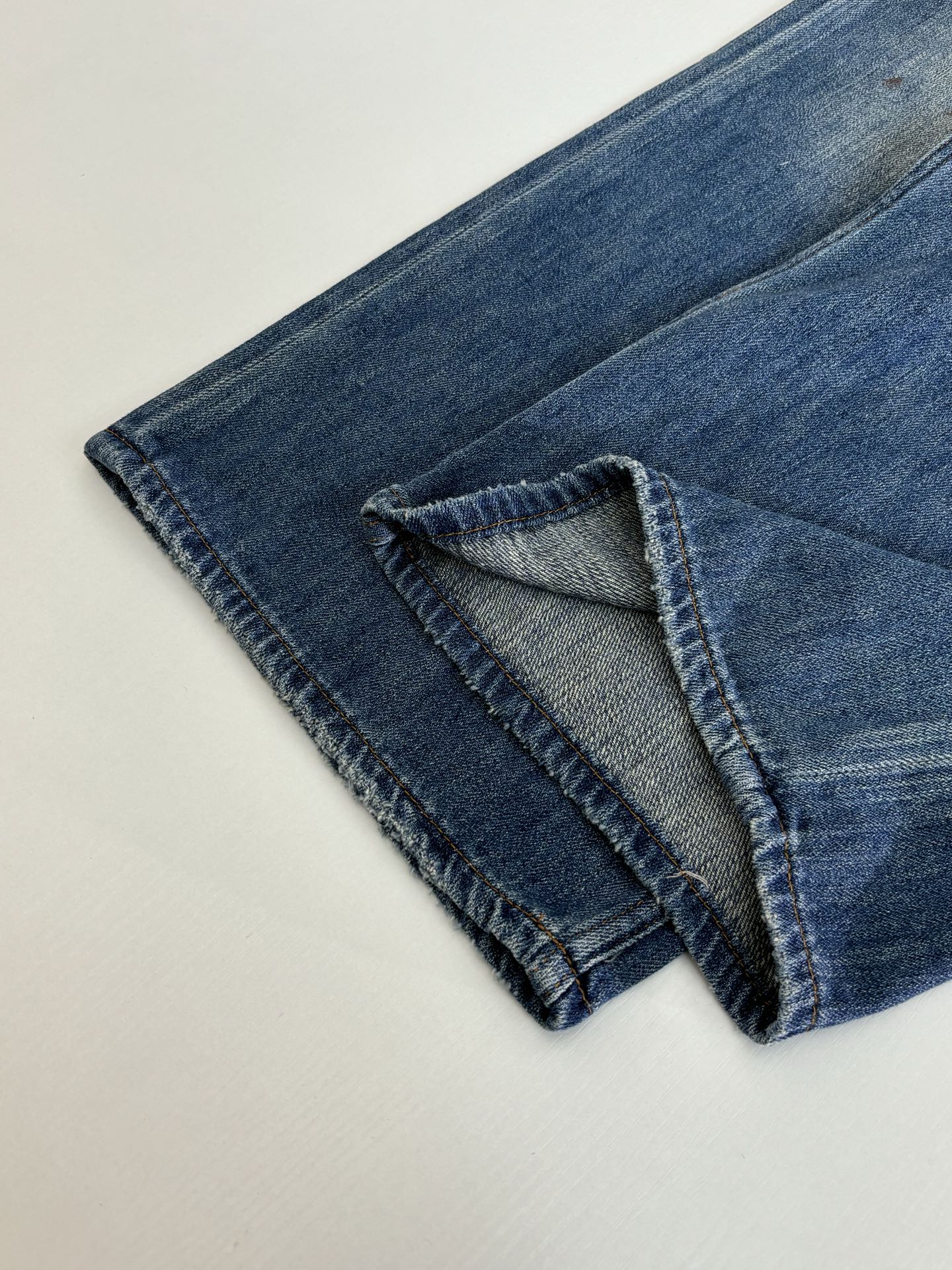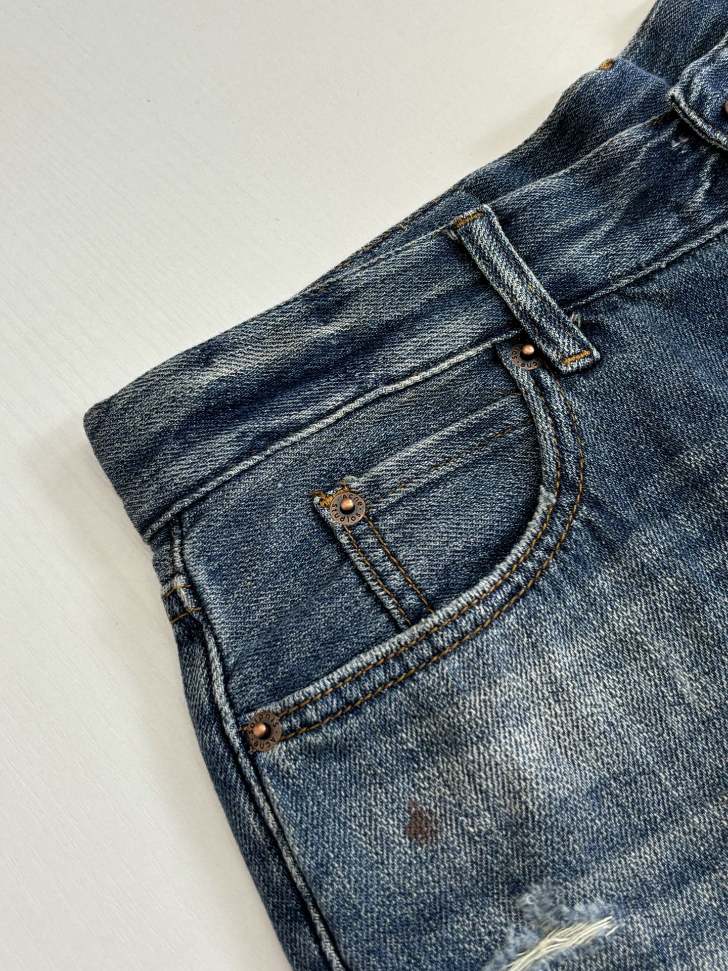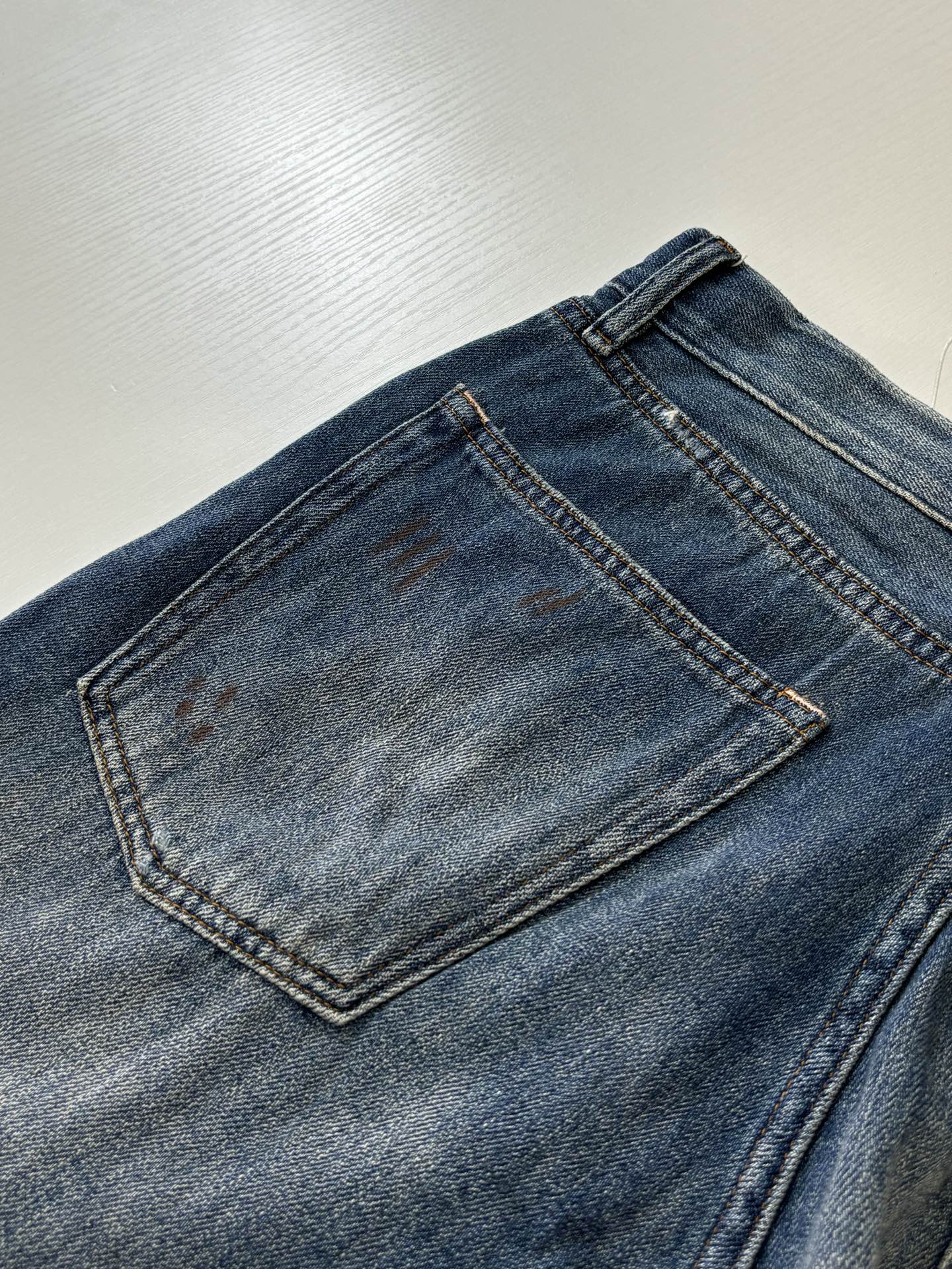 Details: High-combed cotton jeans with hand-splattered pattern and vintage details