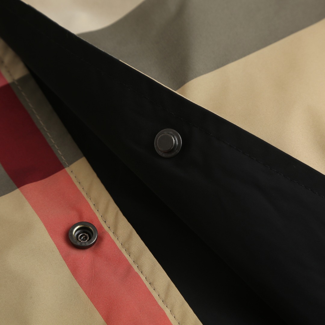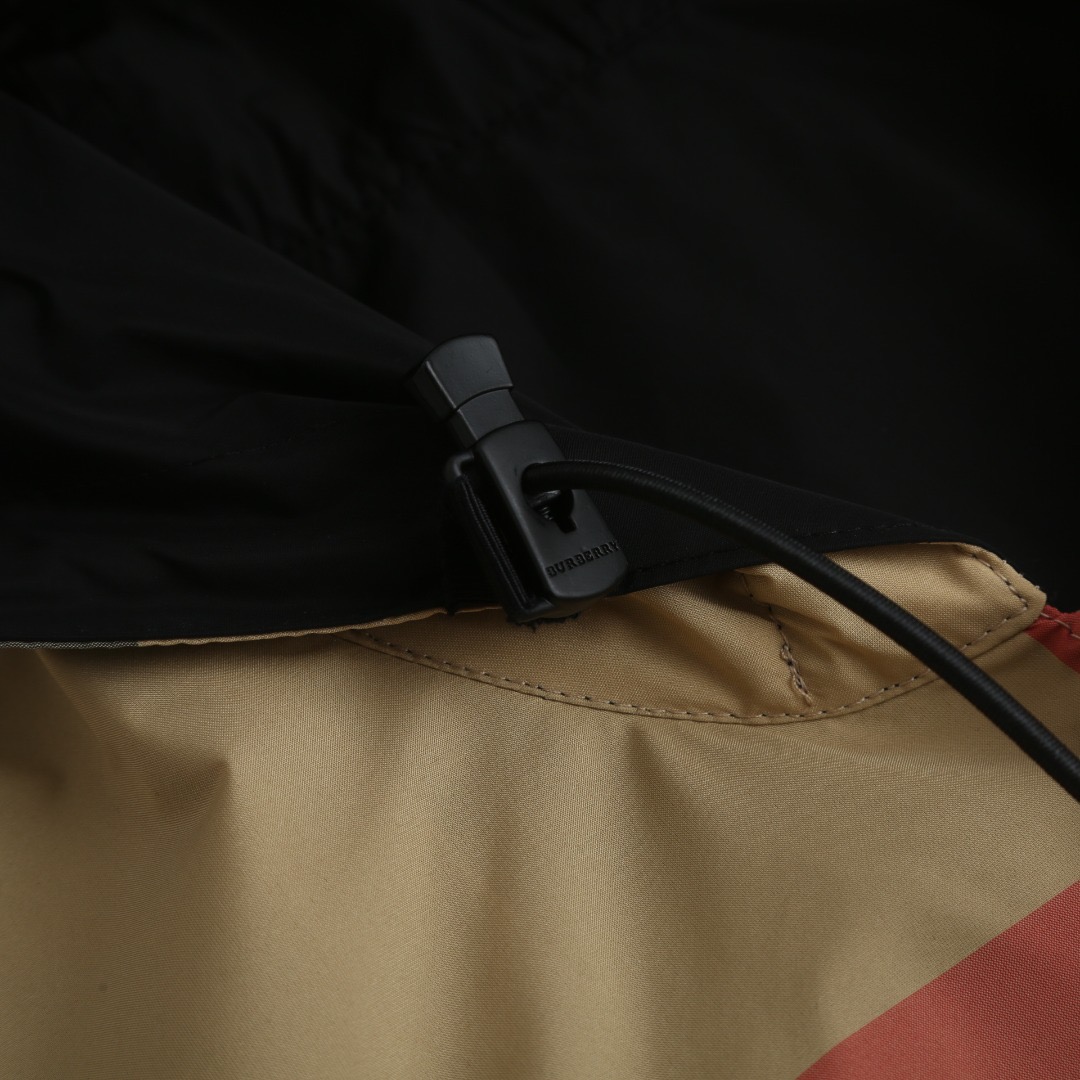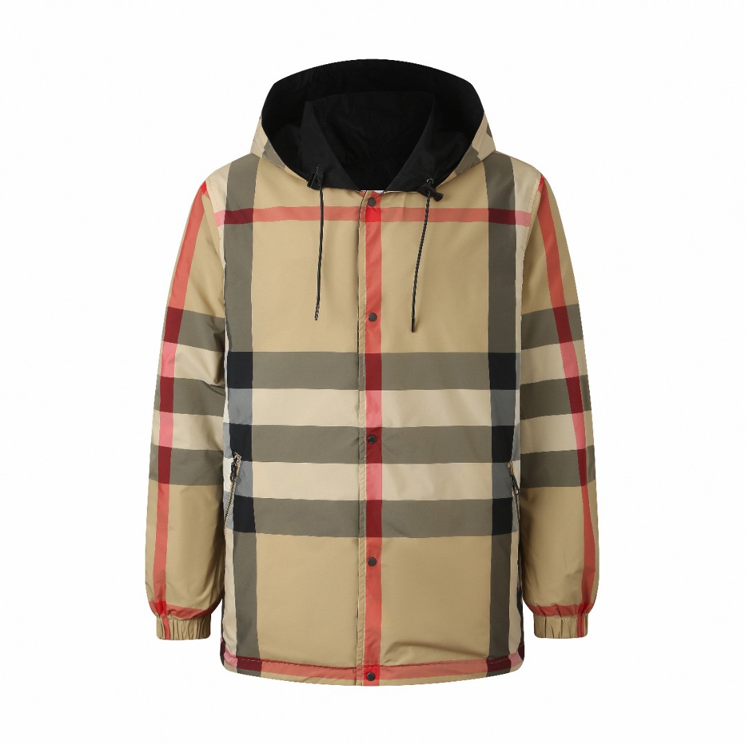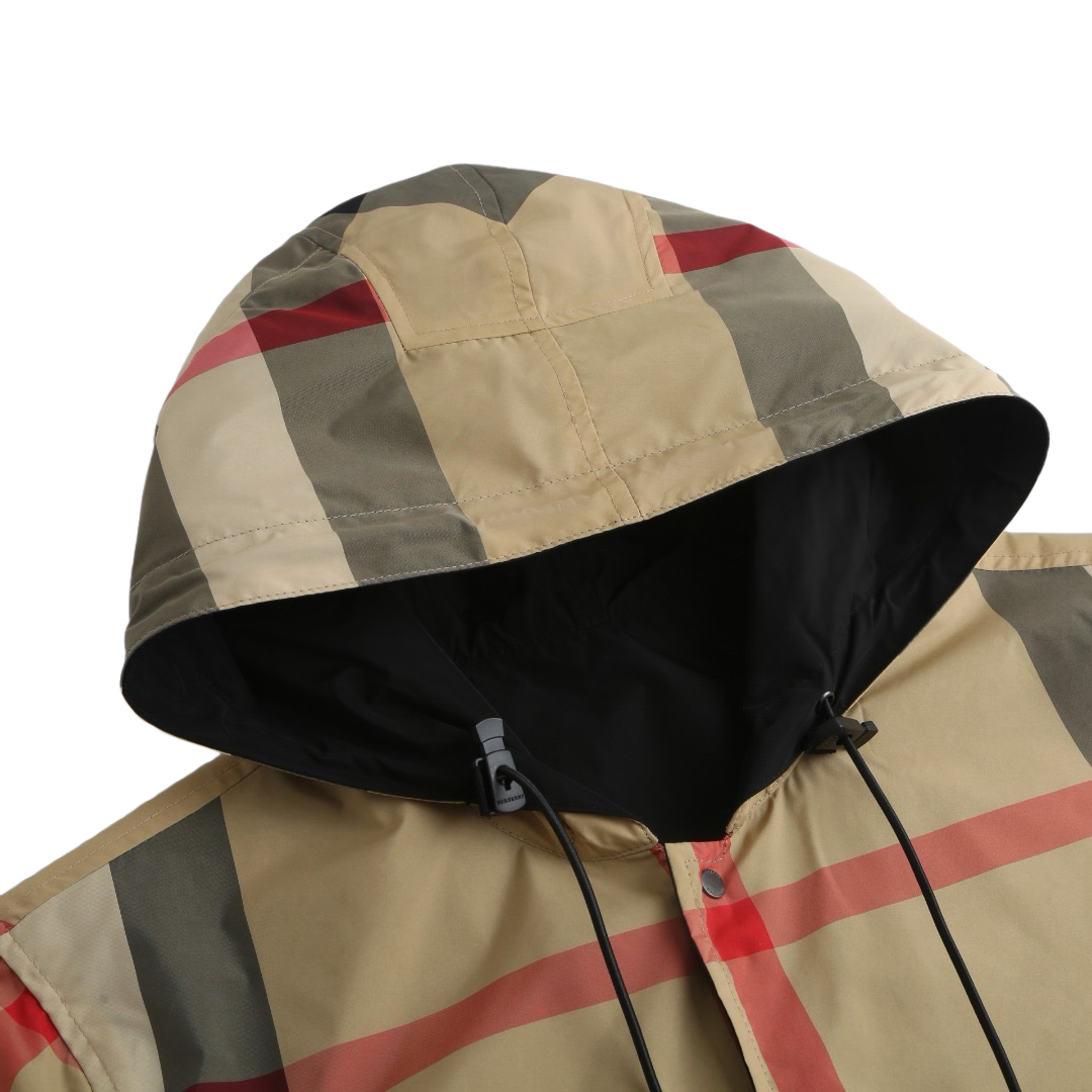 Details: Classic large checkered reversible hooded jacket crafted from 100% polyester, featuring a smooth texture and wrinkle resistance. It has a camel - black - red checkered pattern on one side and a solid black on the other, with an adjustable drawstring hood and hem and practical side pockets.