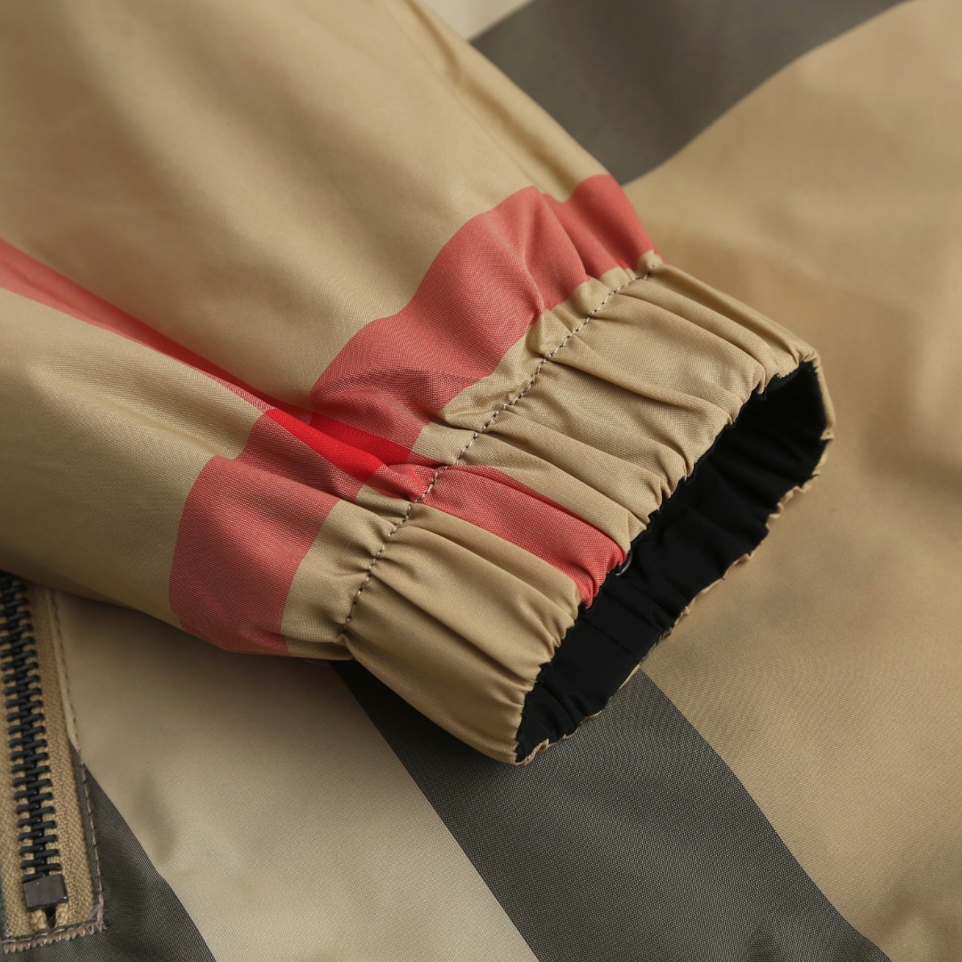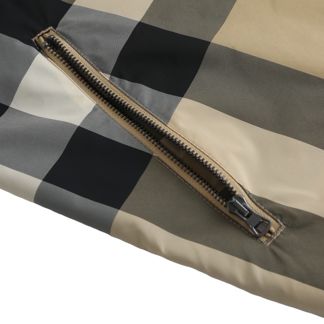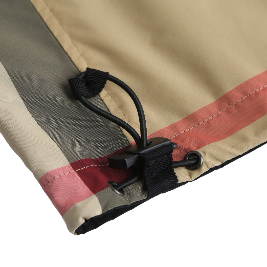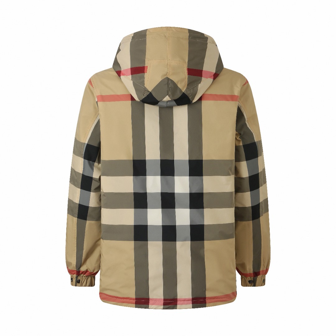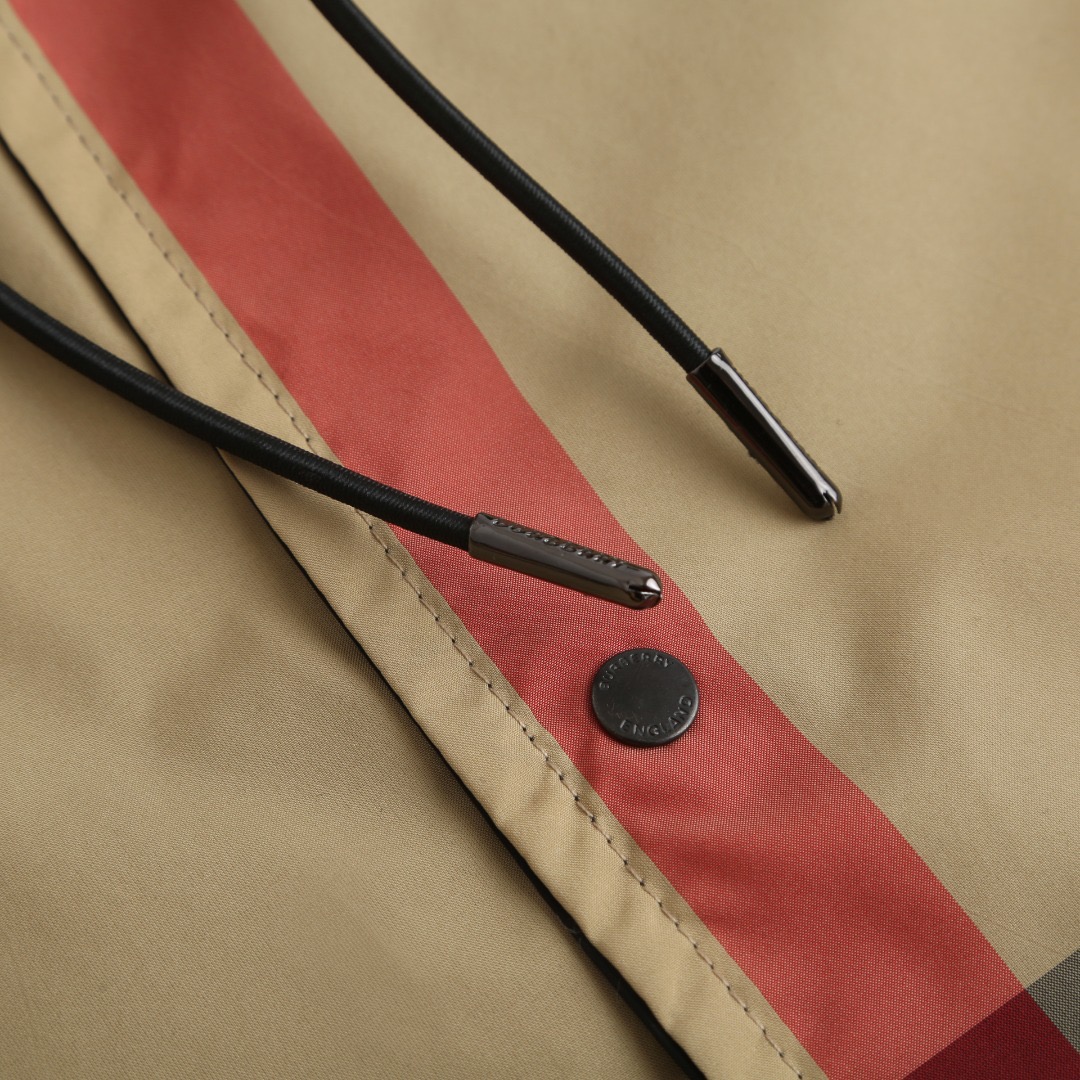 Details: Classic large checkered reversible hooded jacket crafted from 100% polyester, featuring a smooth texture and wrinkle resistance. It has a camel - black - red checkered pattern on one side and a solid black on the other, with an adjustable drawstring hood and hem and practical side pockets.