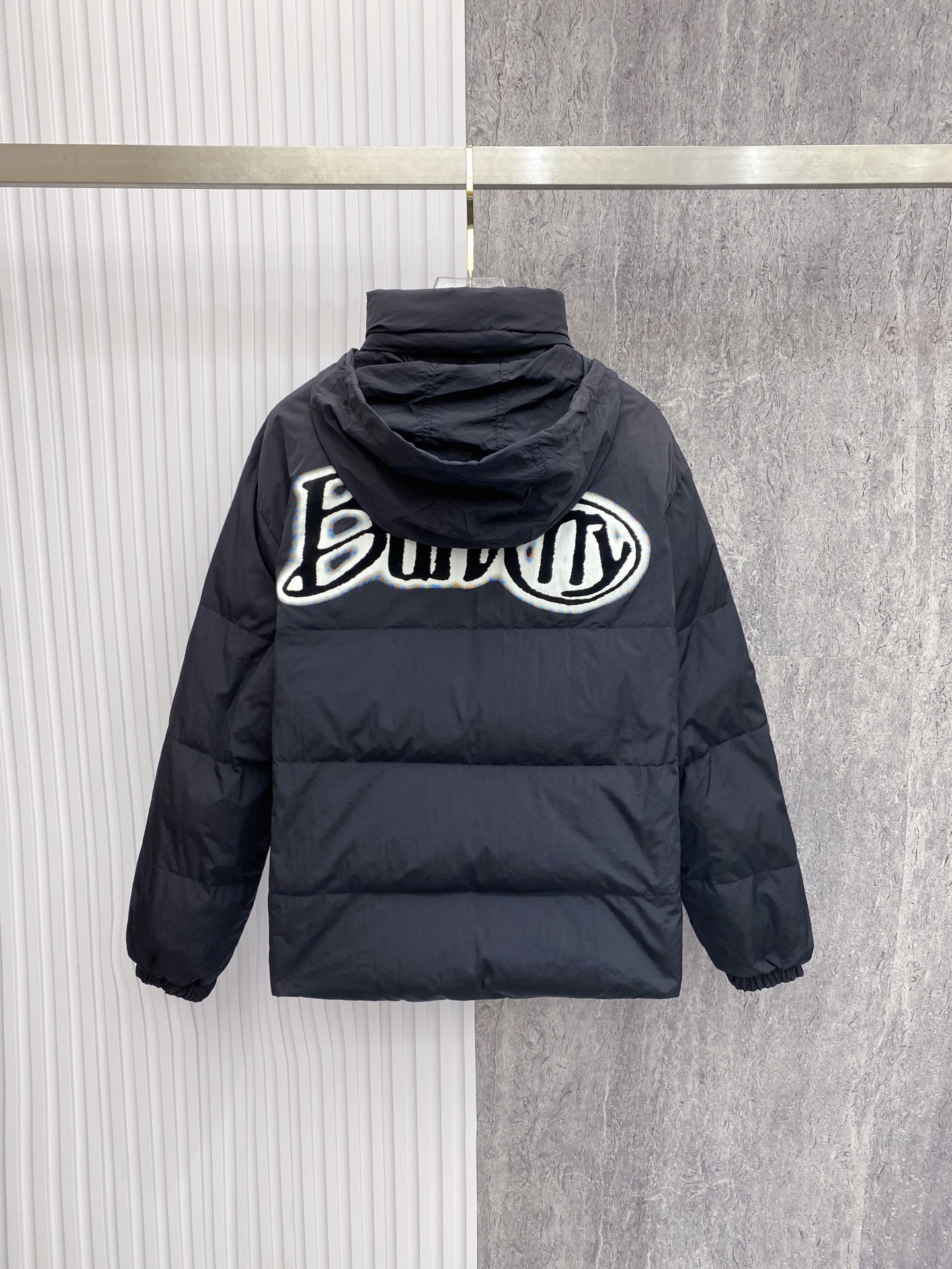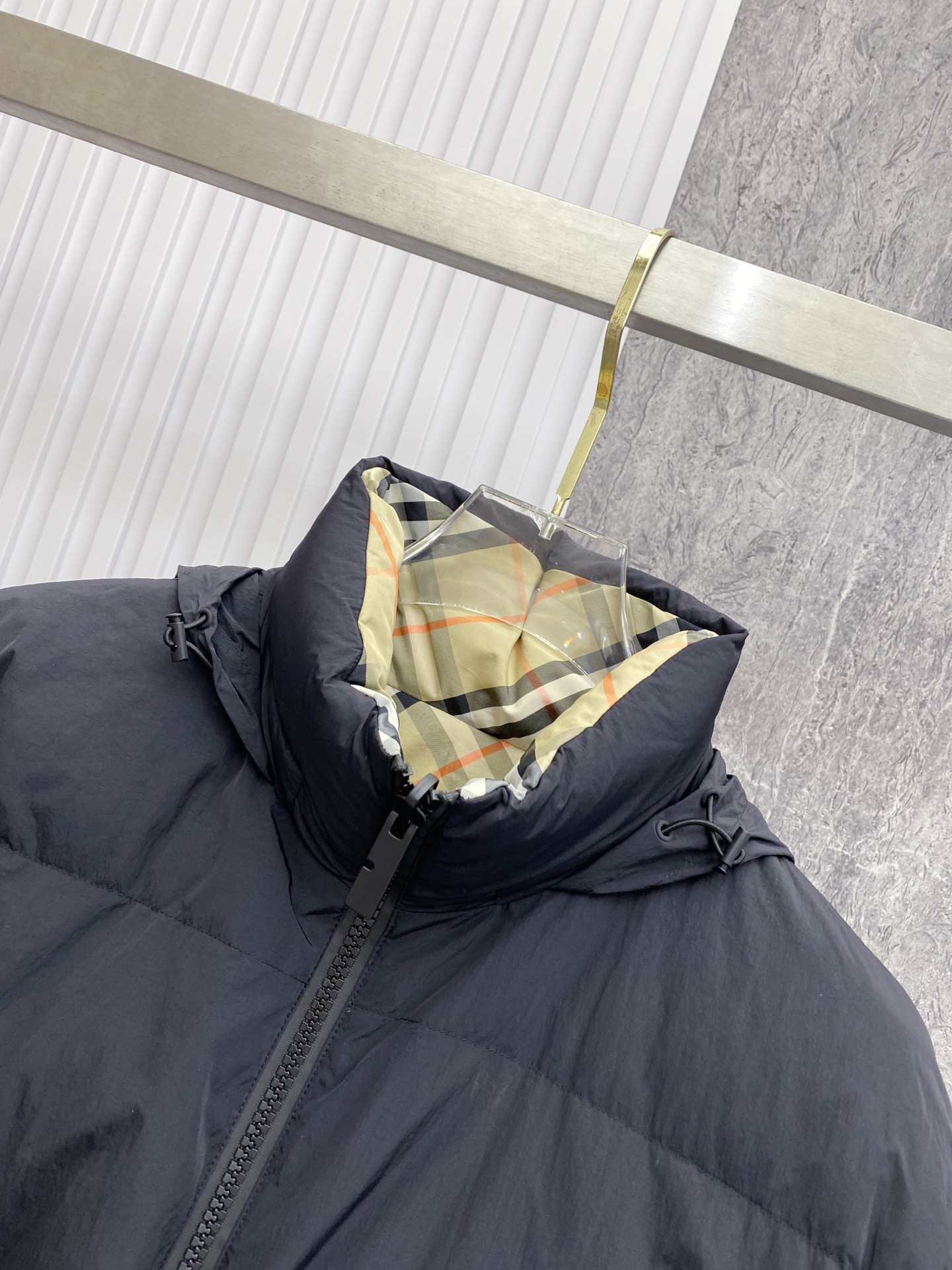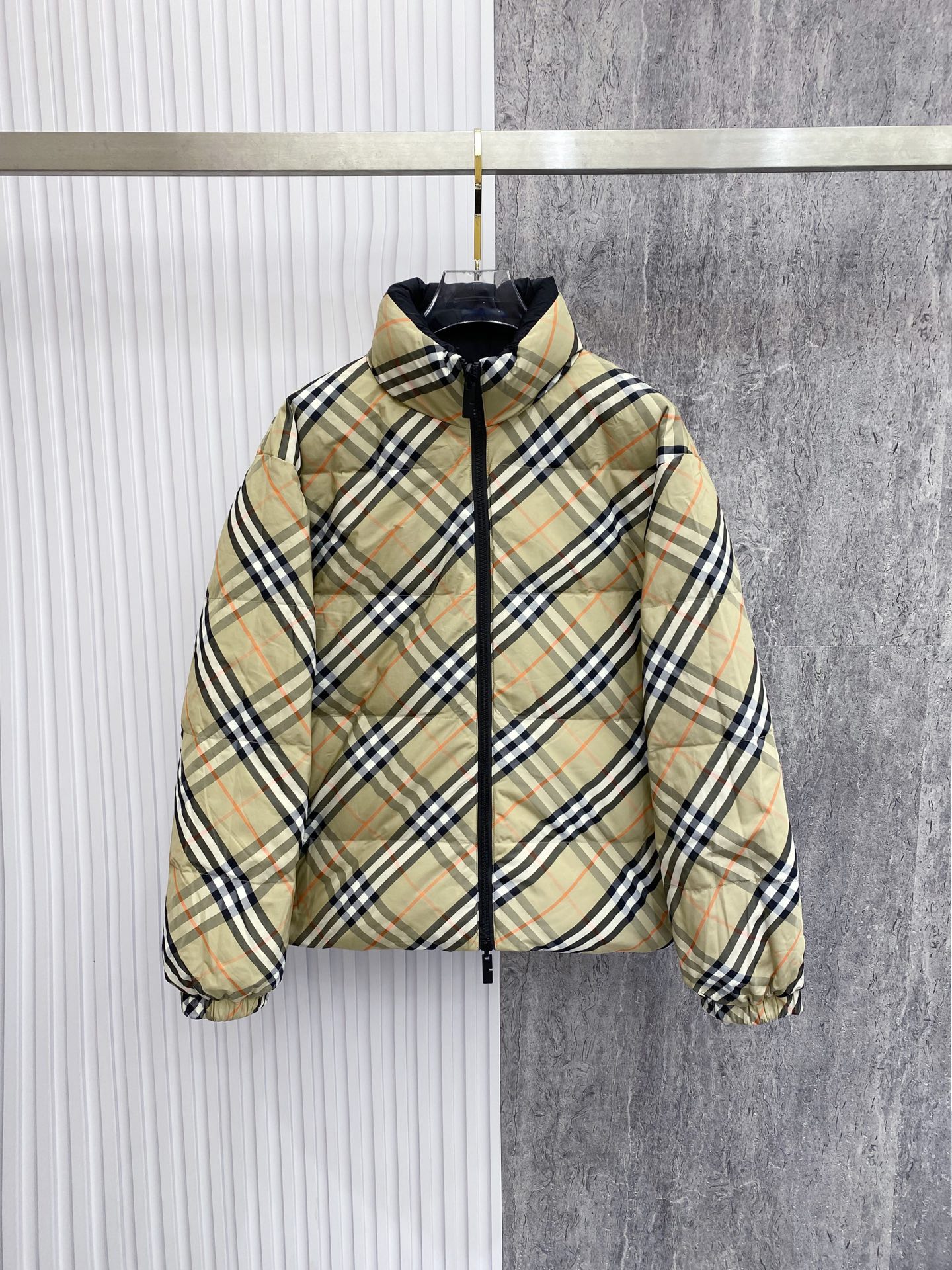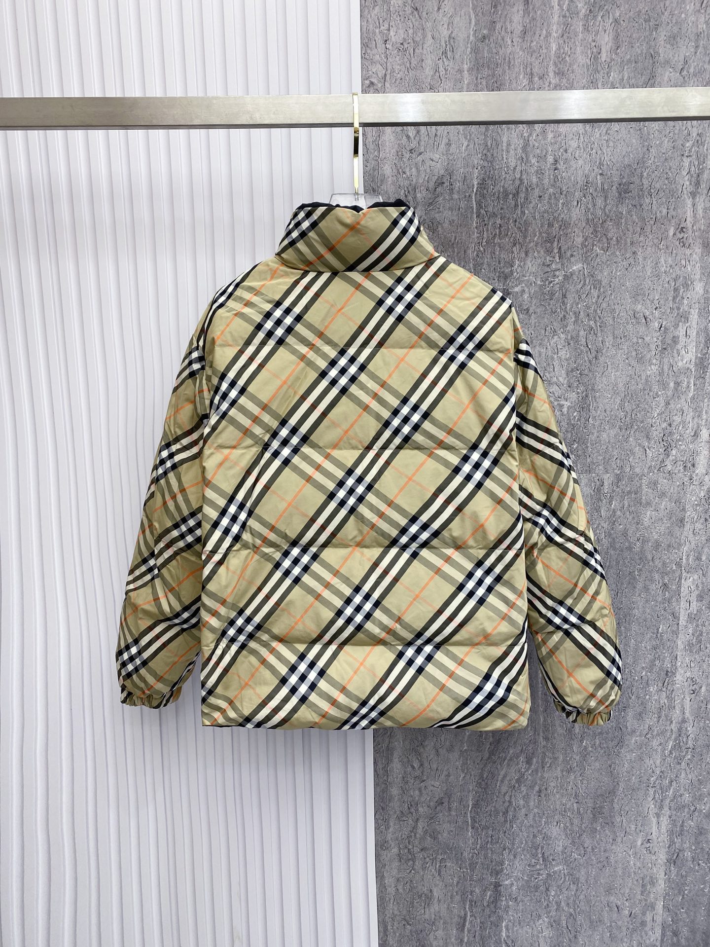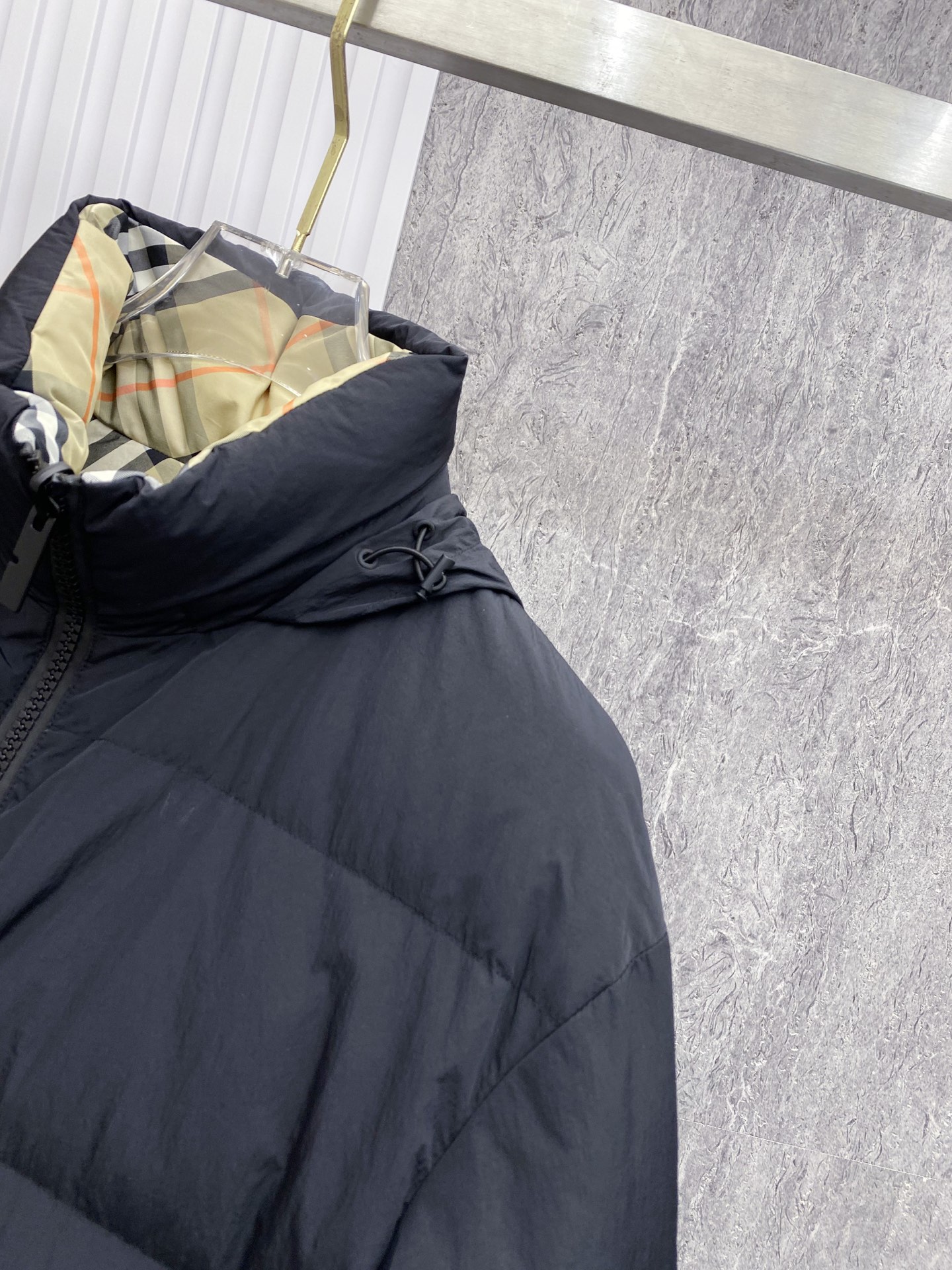 Details: Double-Sided Stand-Up Collar Down Jacket Made of Eco-Friendly Fabric with Logo Badge