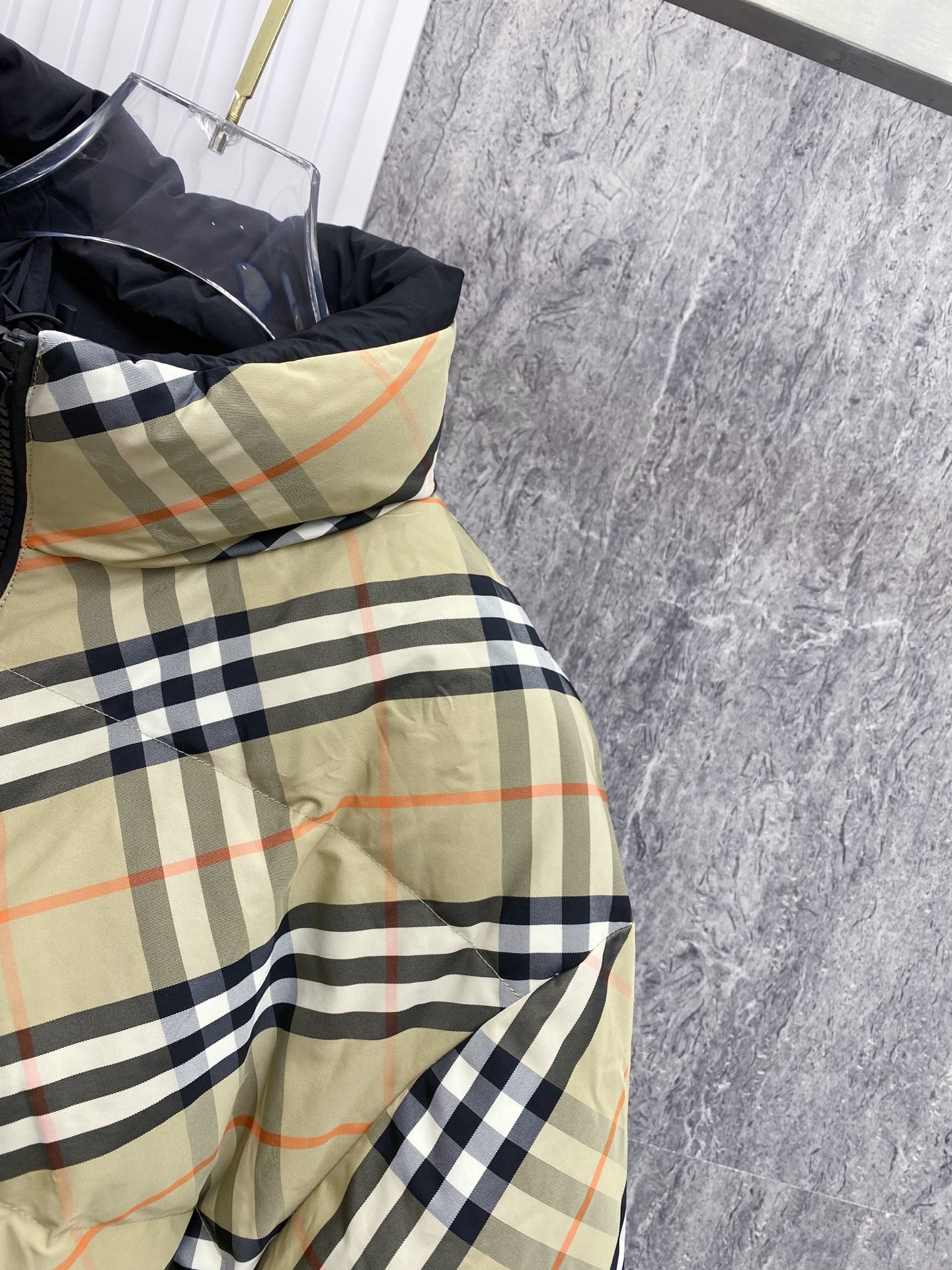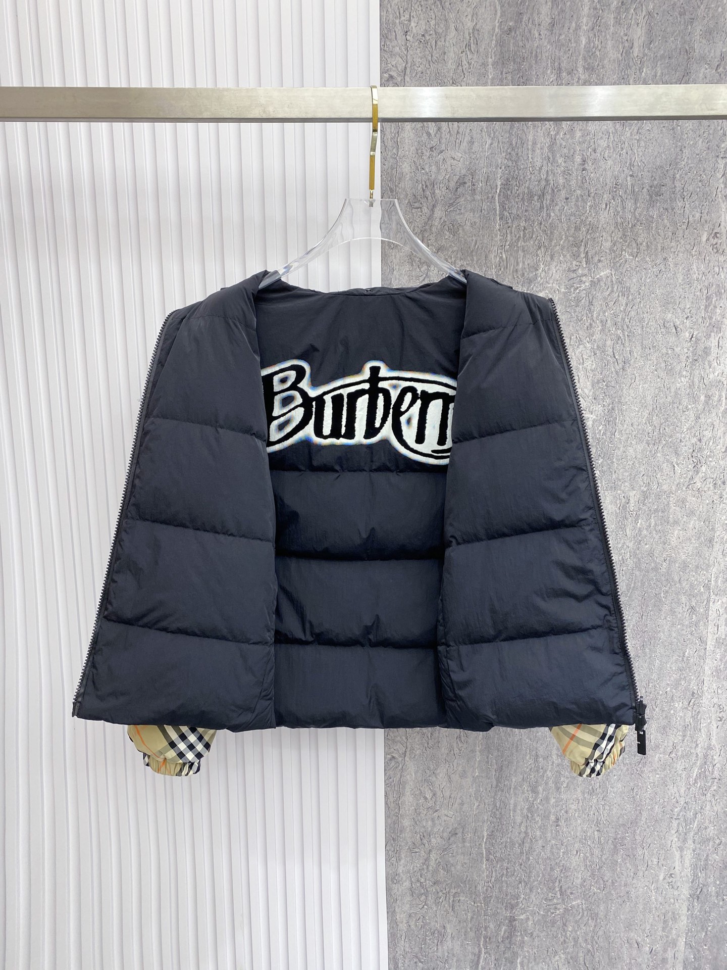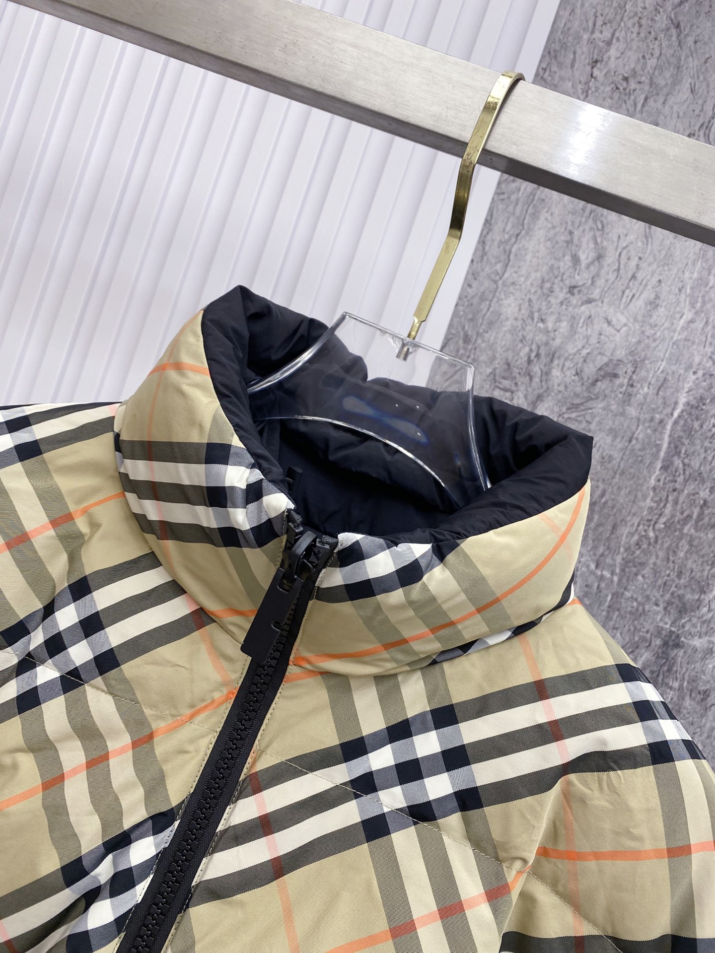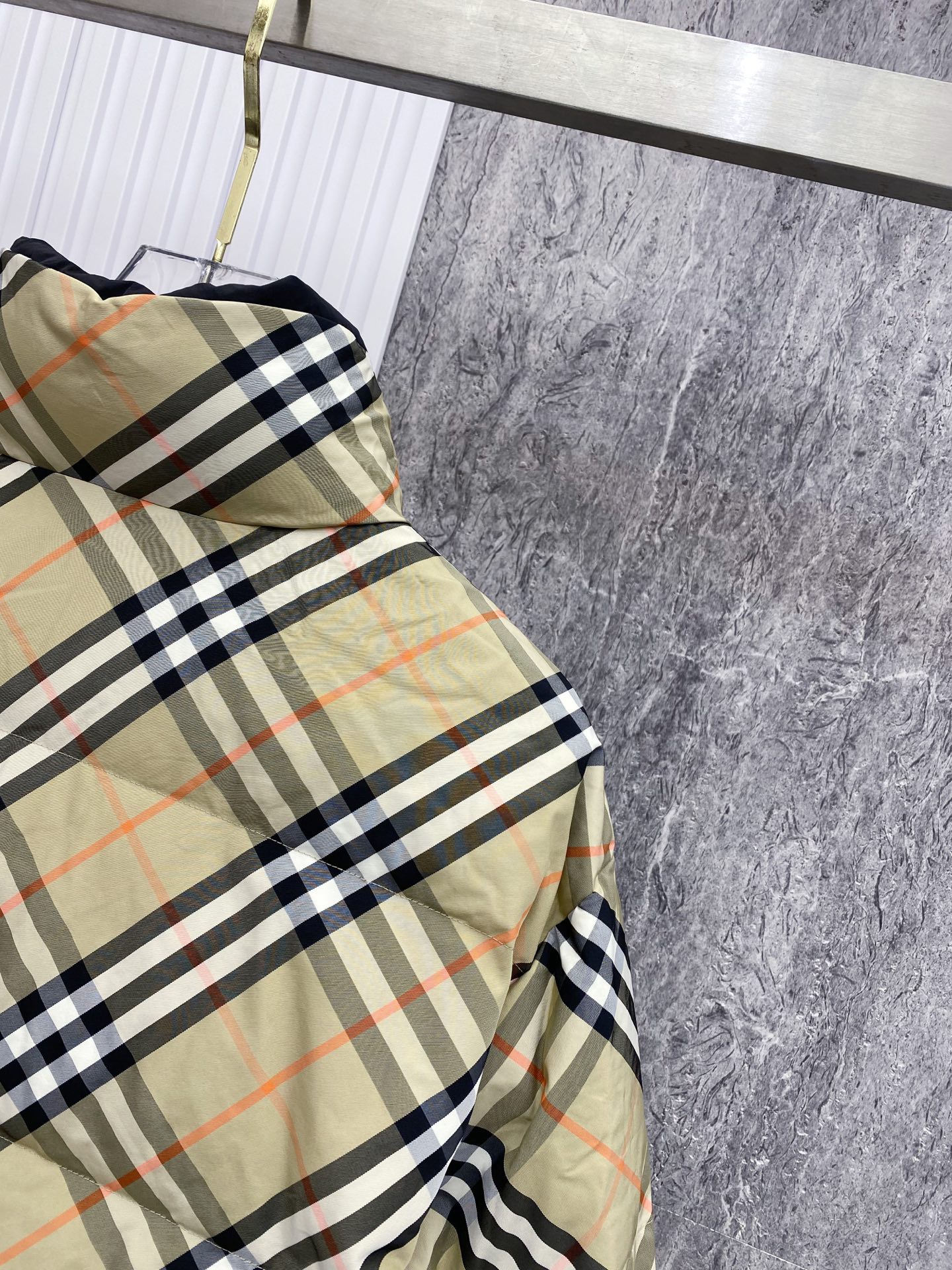 Details: Double-Sided Stand-Up Collar Down Jacket Made of Eco-Friendly Fabric with Logo Badge