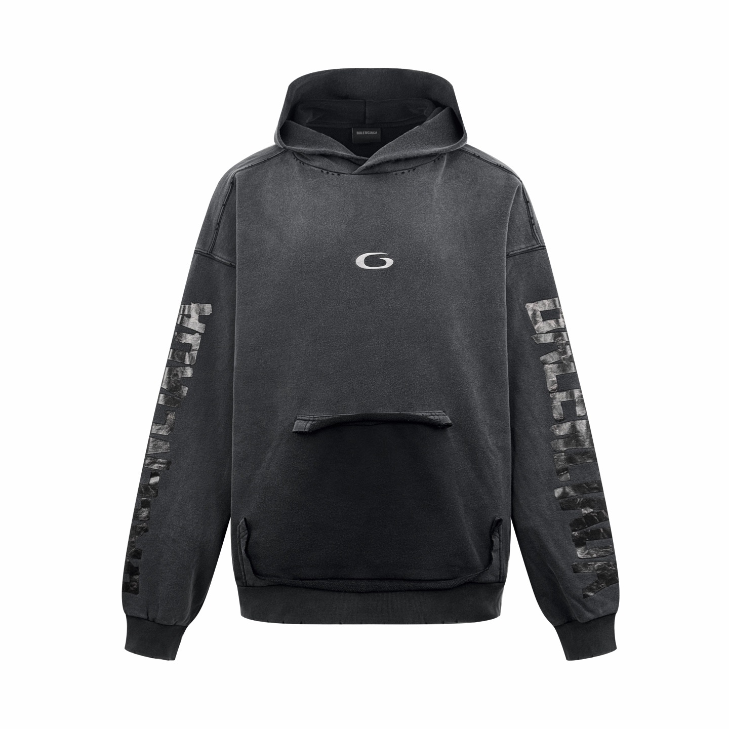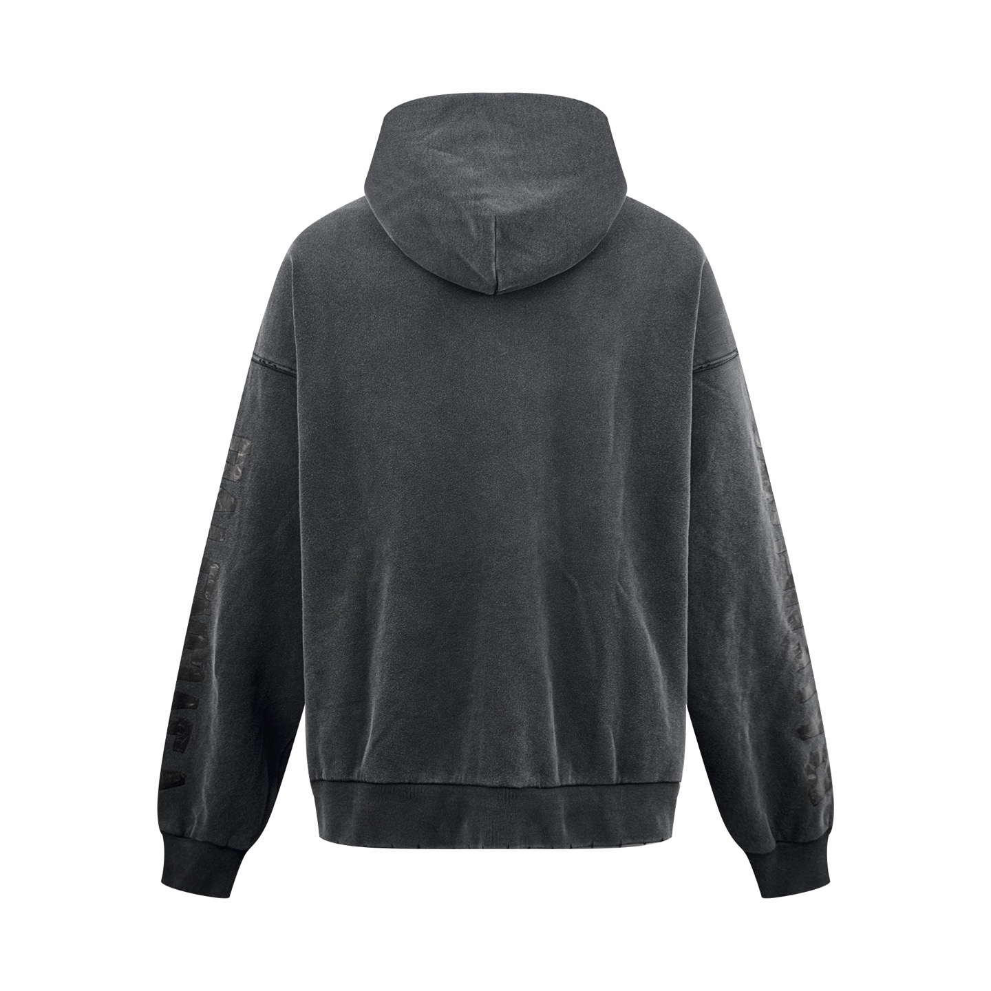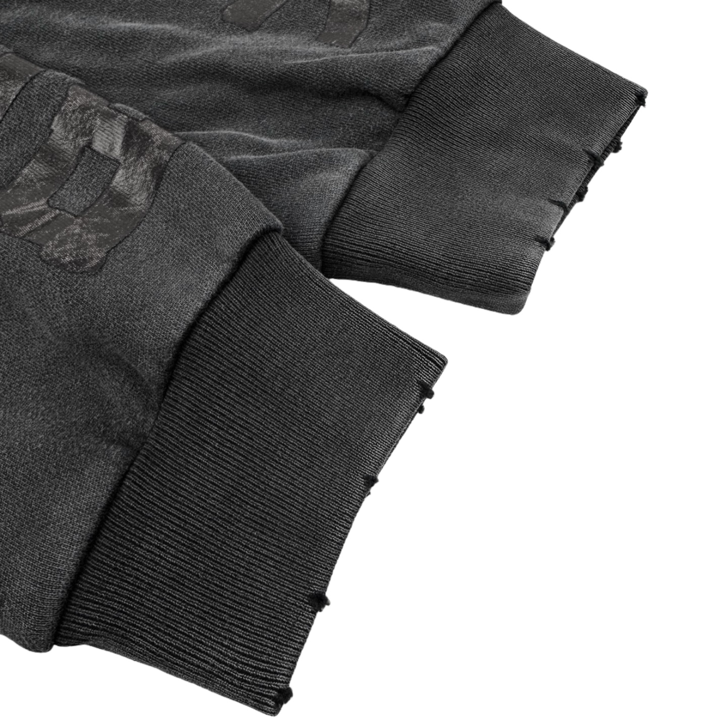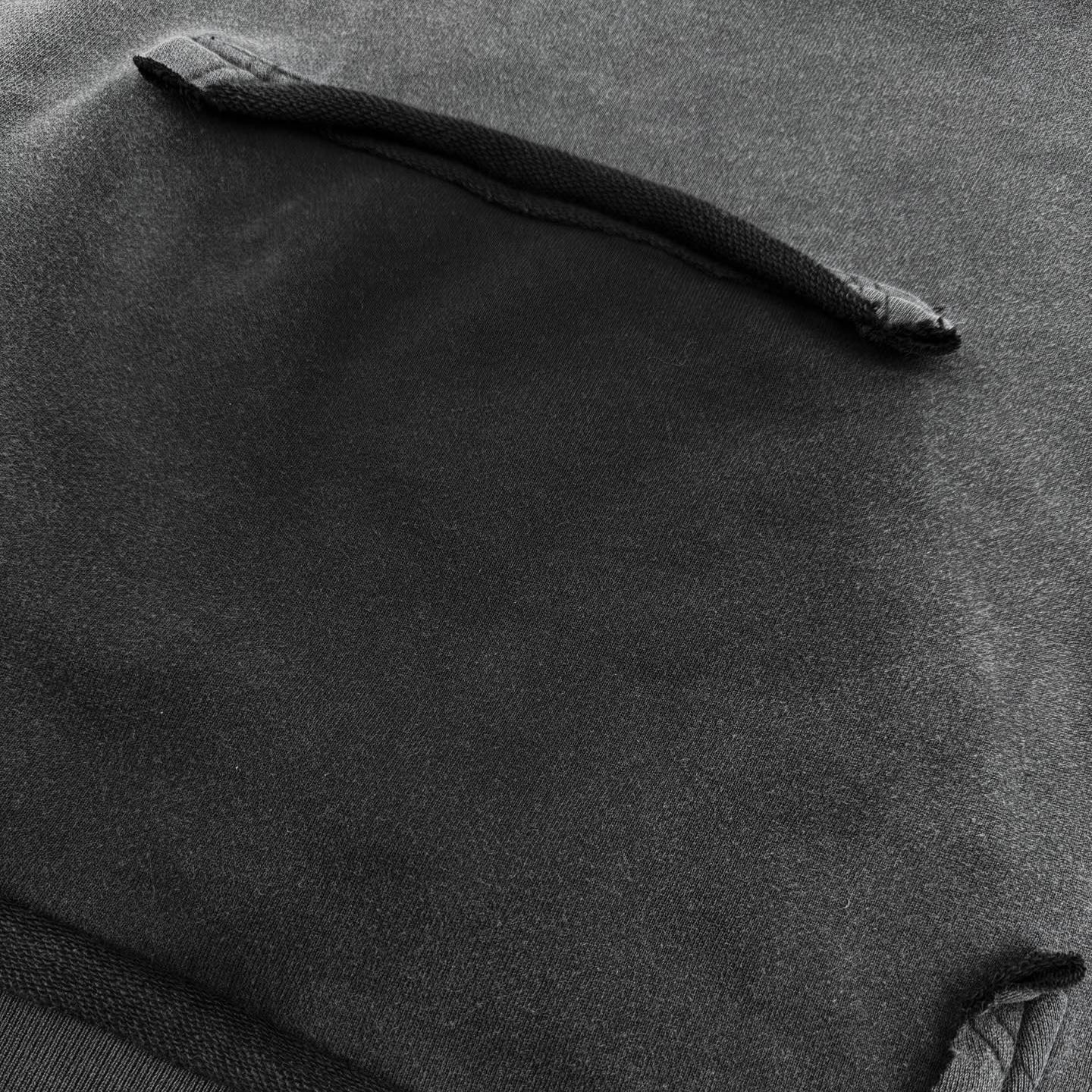 Details: Vintage distressed hoodie with art print and embroidery, made of soft washed black fabric.