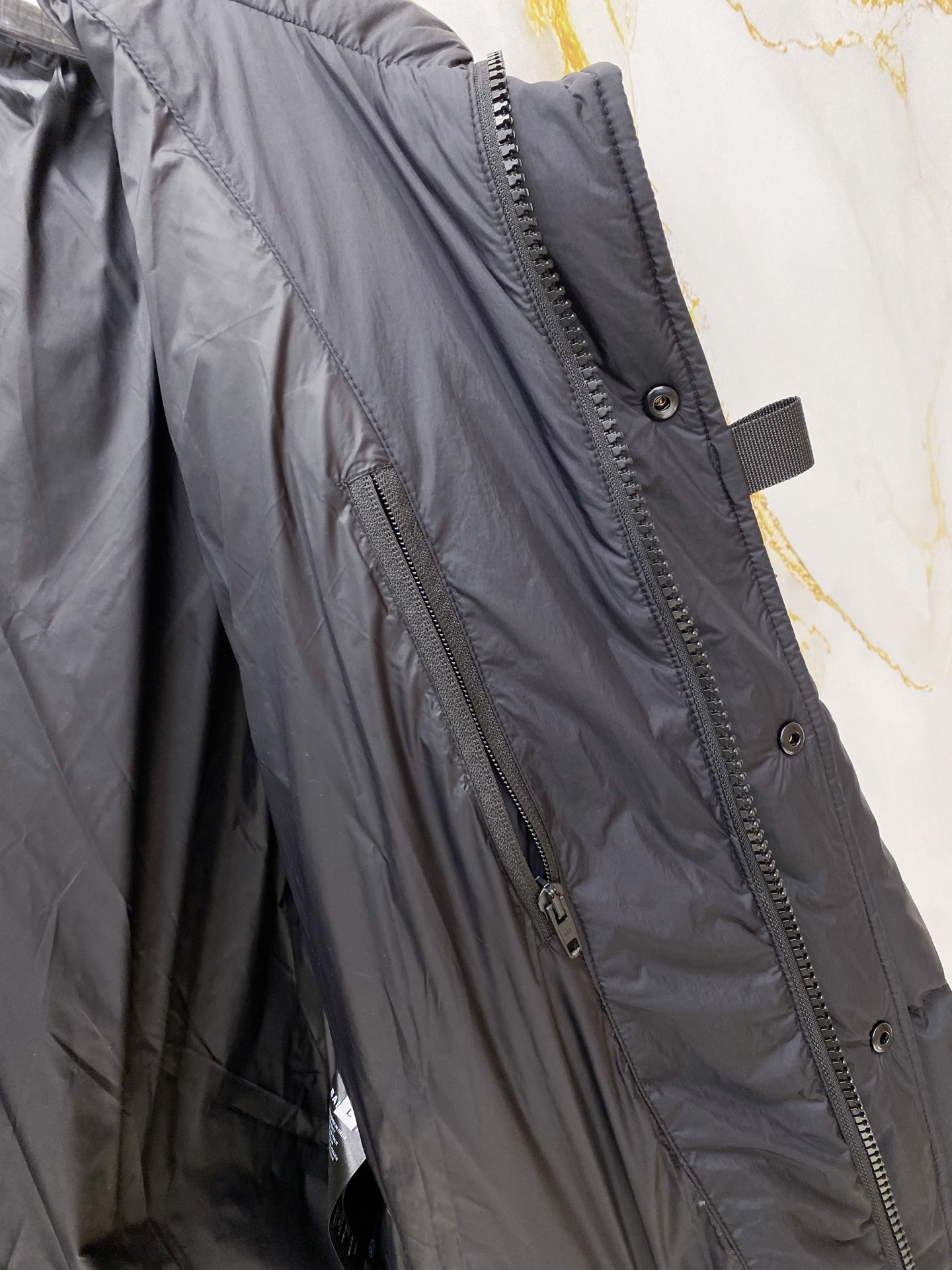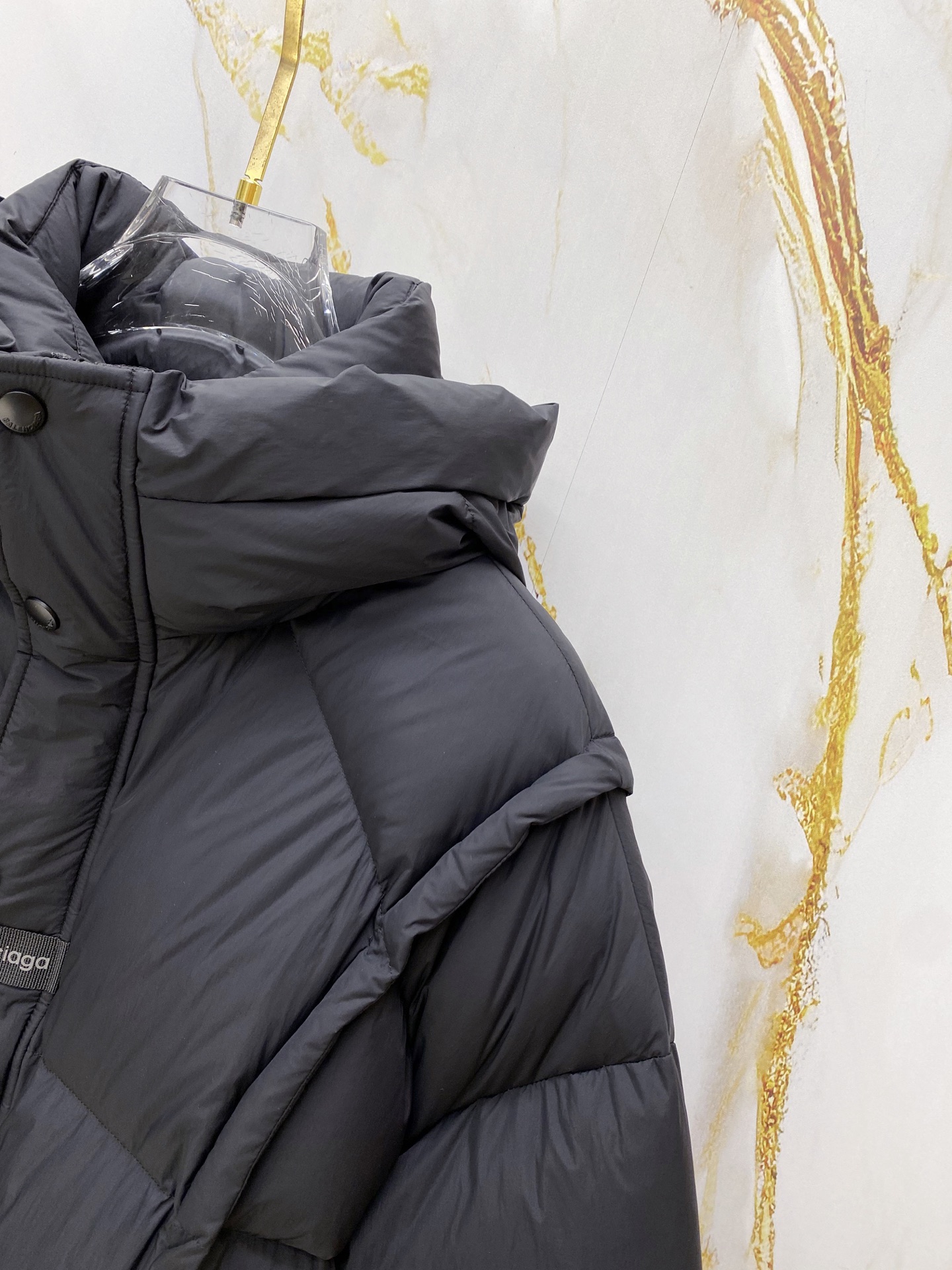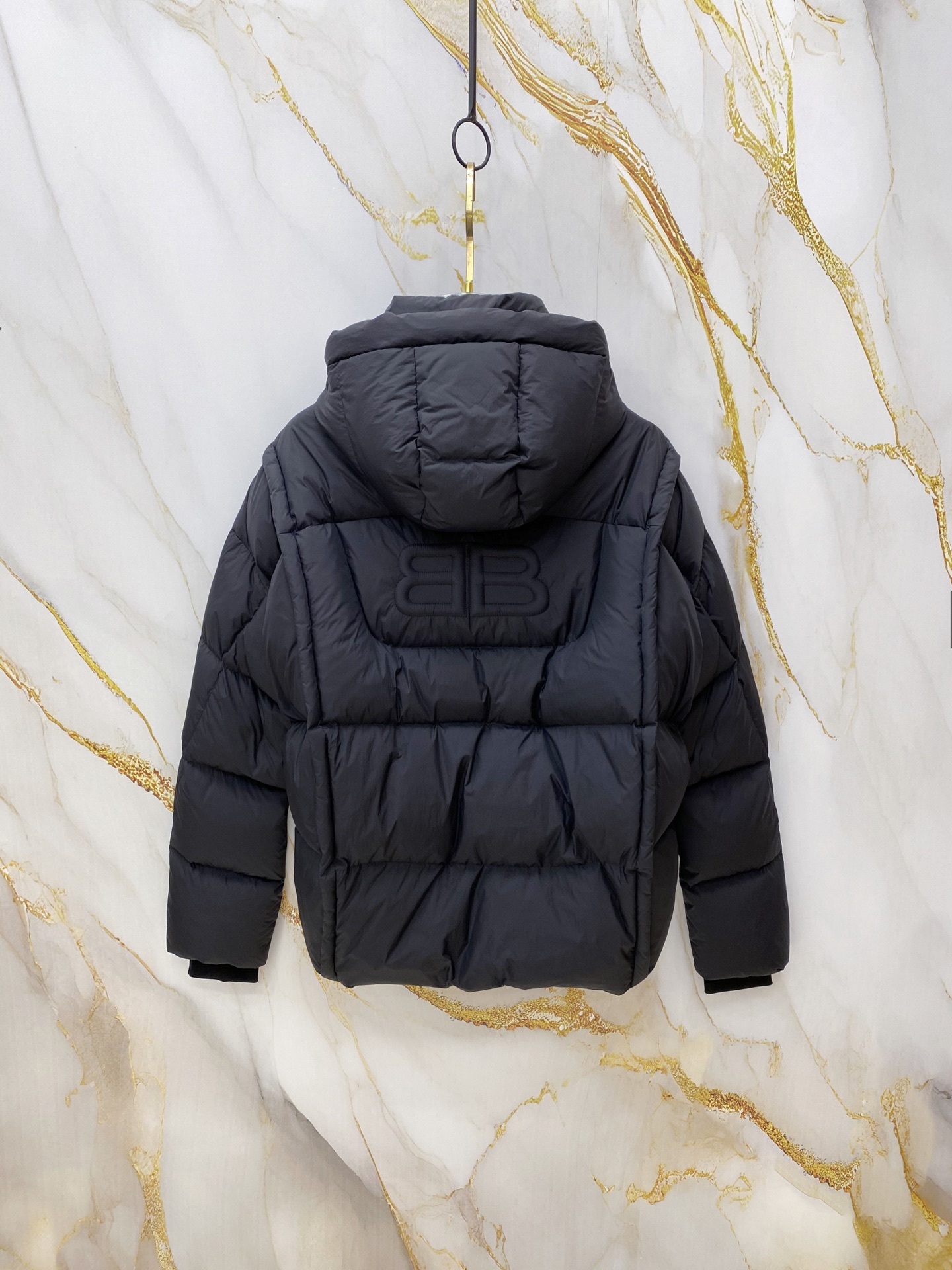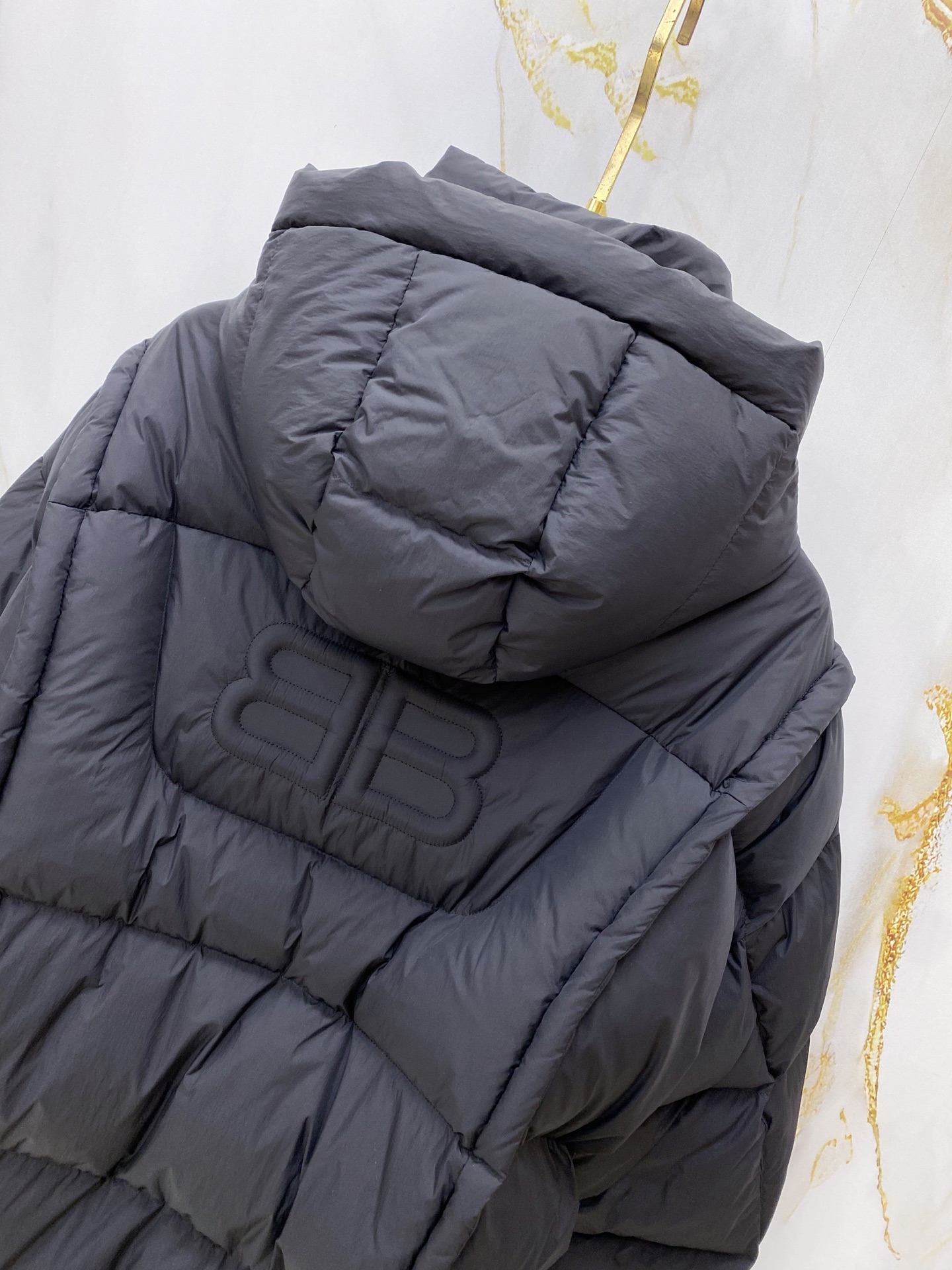 Details: Matte hooded down jacket made of high-density fabric. It is wind-resistant and lightweight, with a quilted design, a brand logo, and hidden zip pockets. It has a relaxed fit.