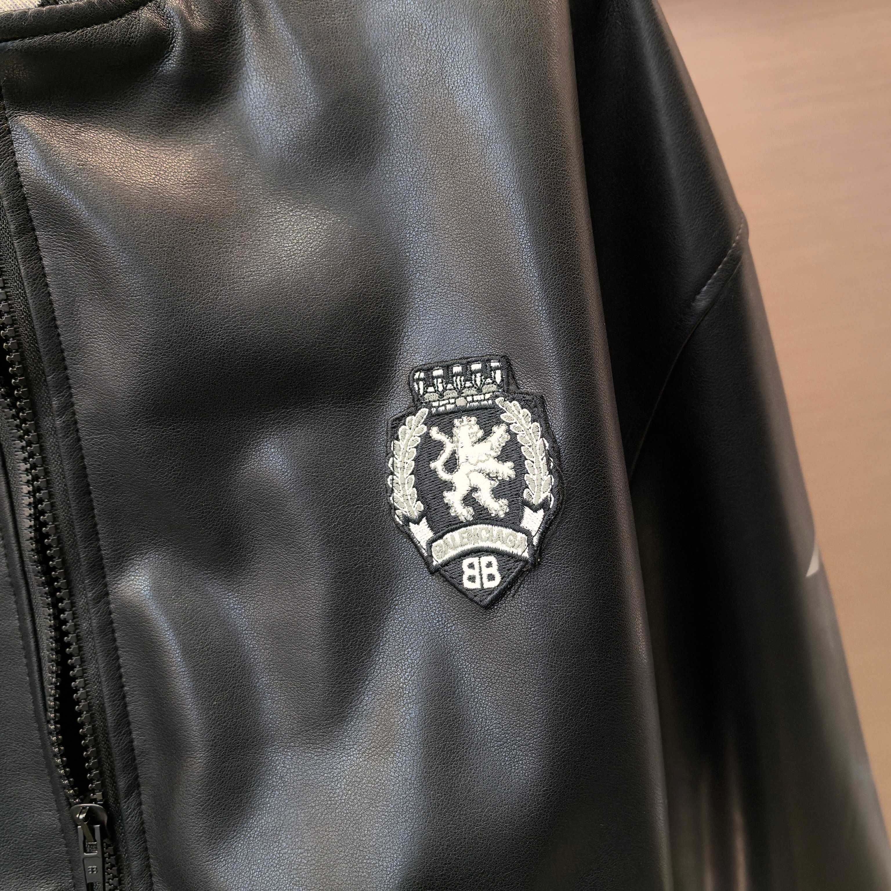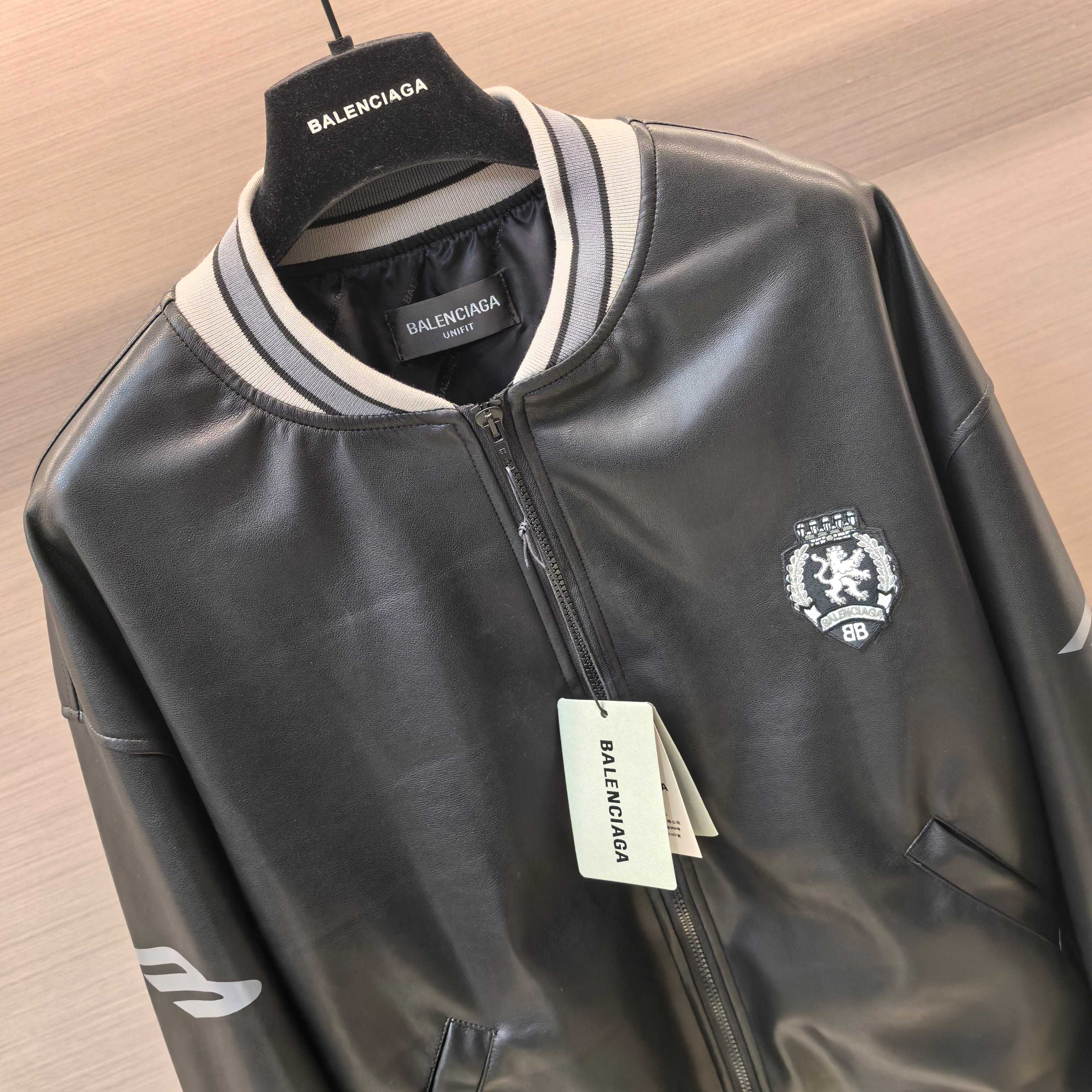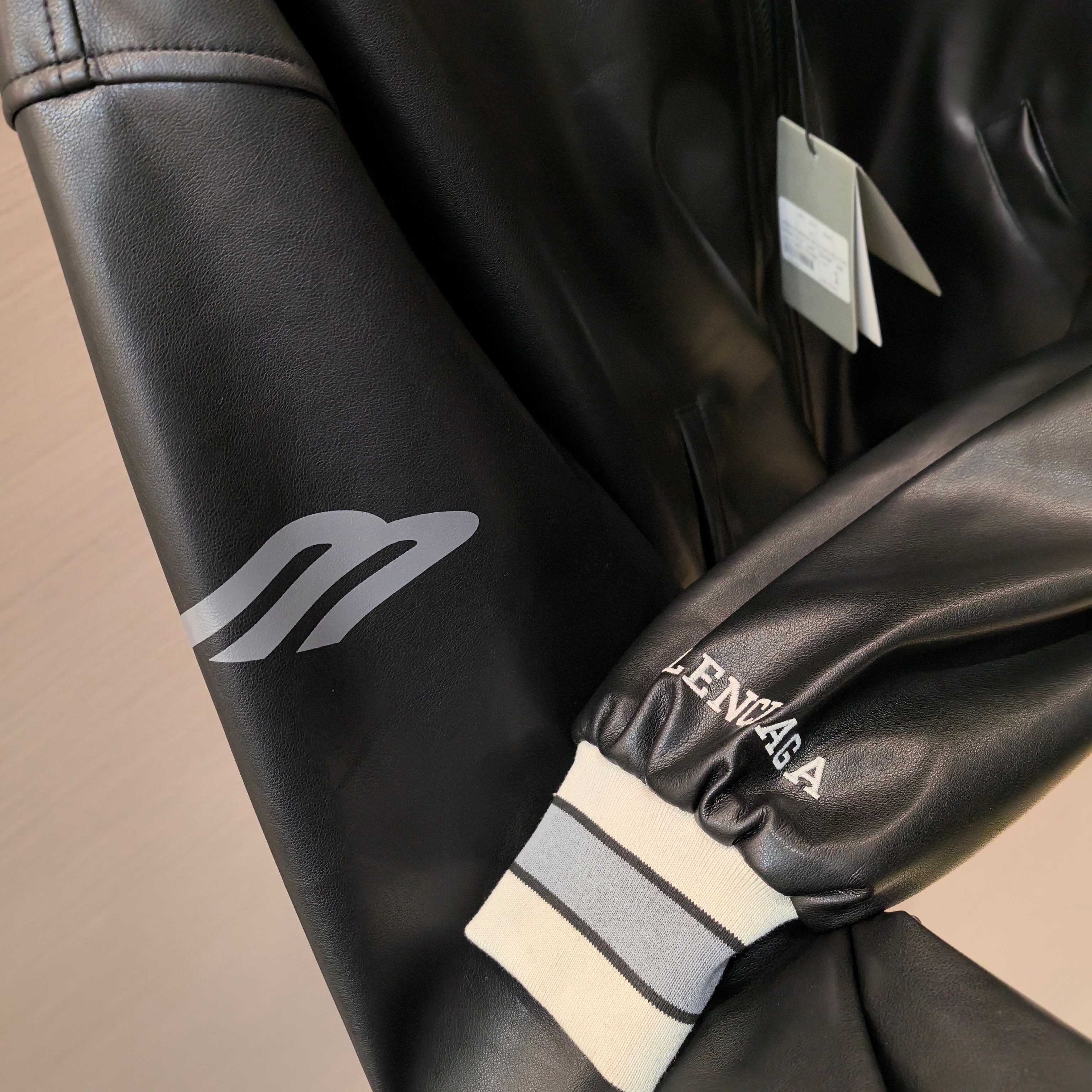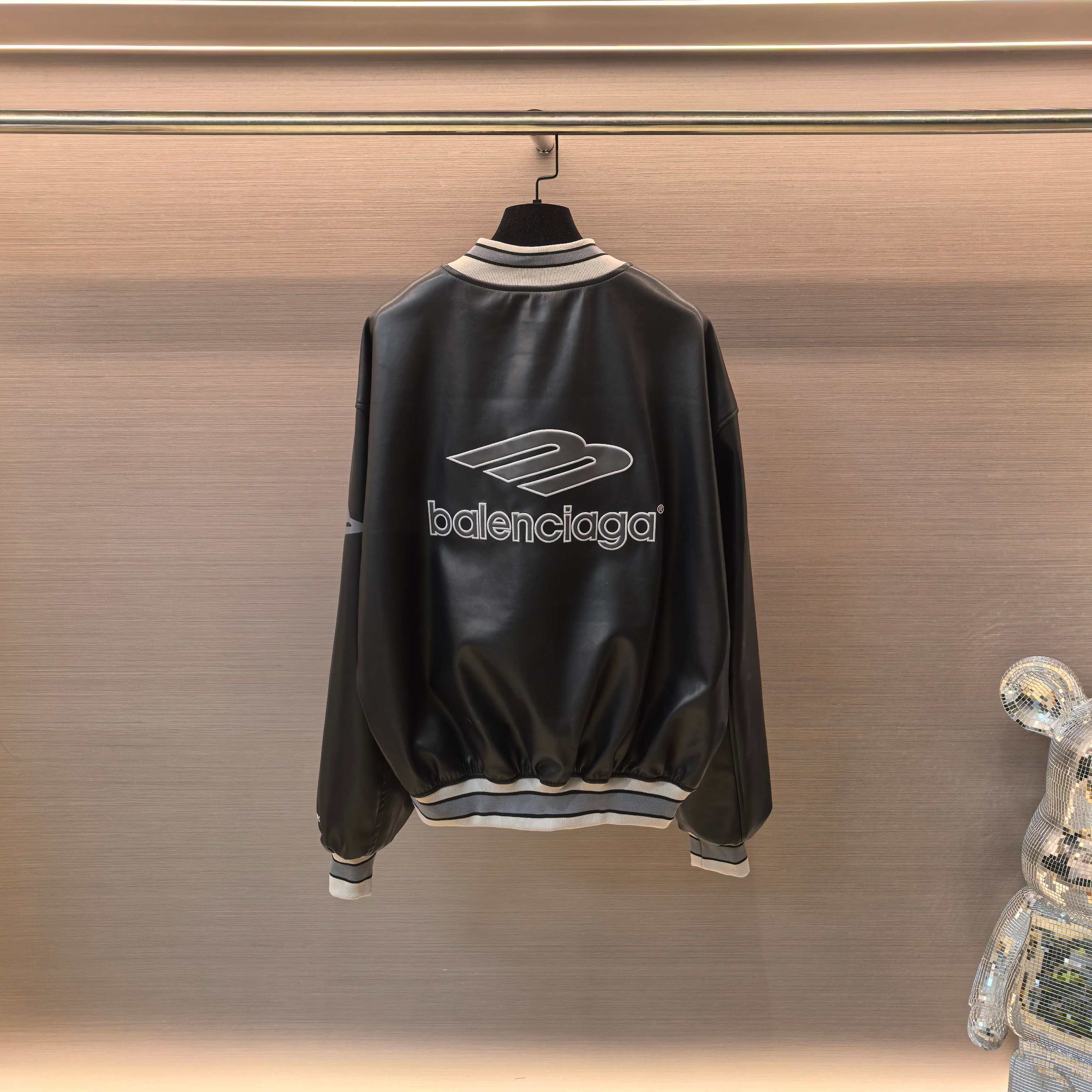 Details: Heavy embroidered leather baseball jacket with pure lines and attitude, featuring an oversized logo, neutral style, front zipper, two zippered side pockets, embroidered letters on sleeves, M letter print on arms, and artworks embroidery on front, sleeves, and back, in black color