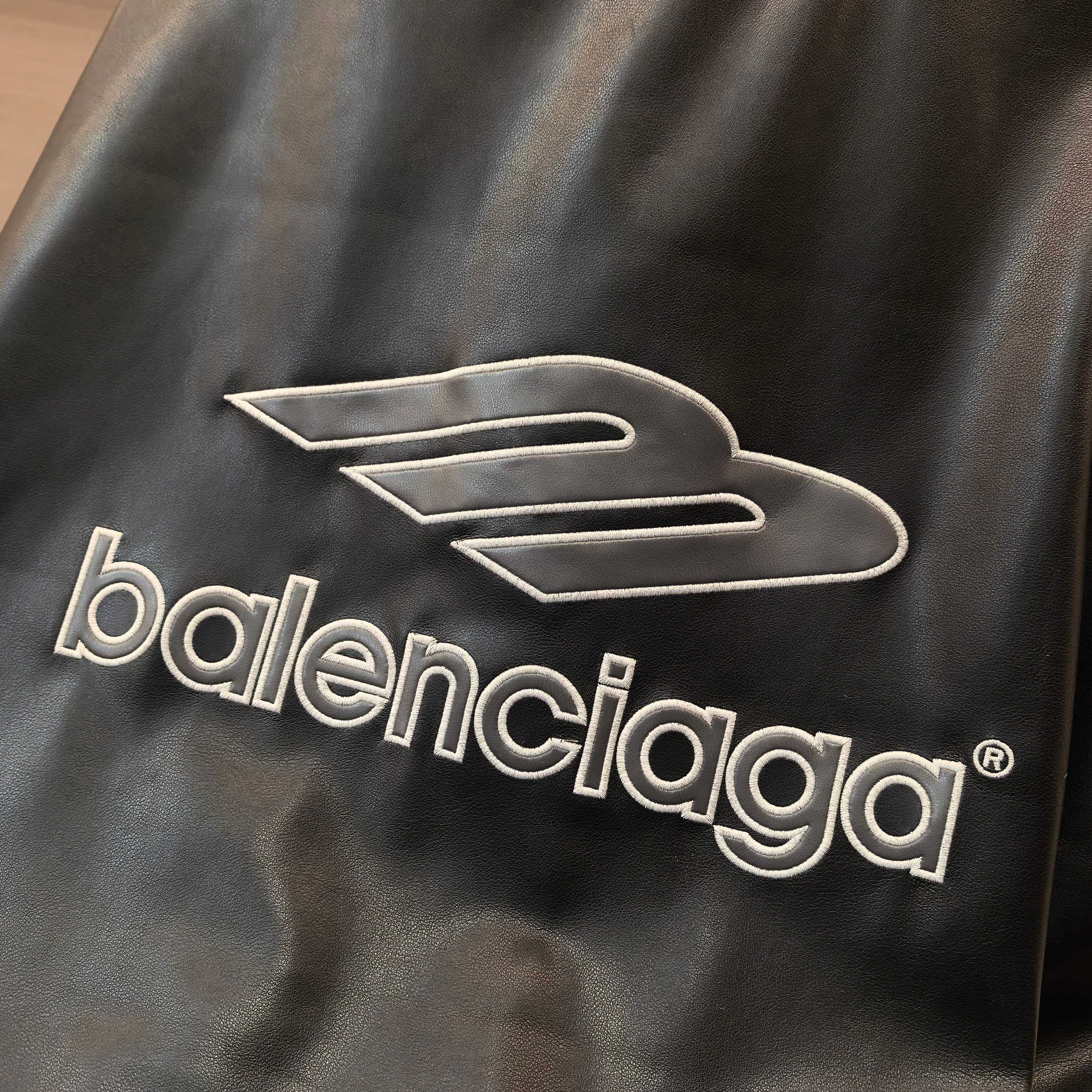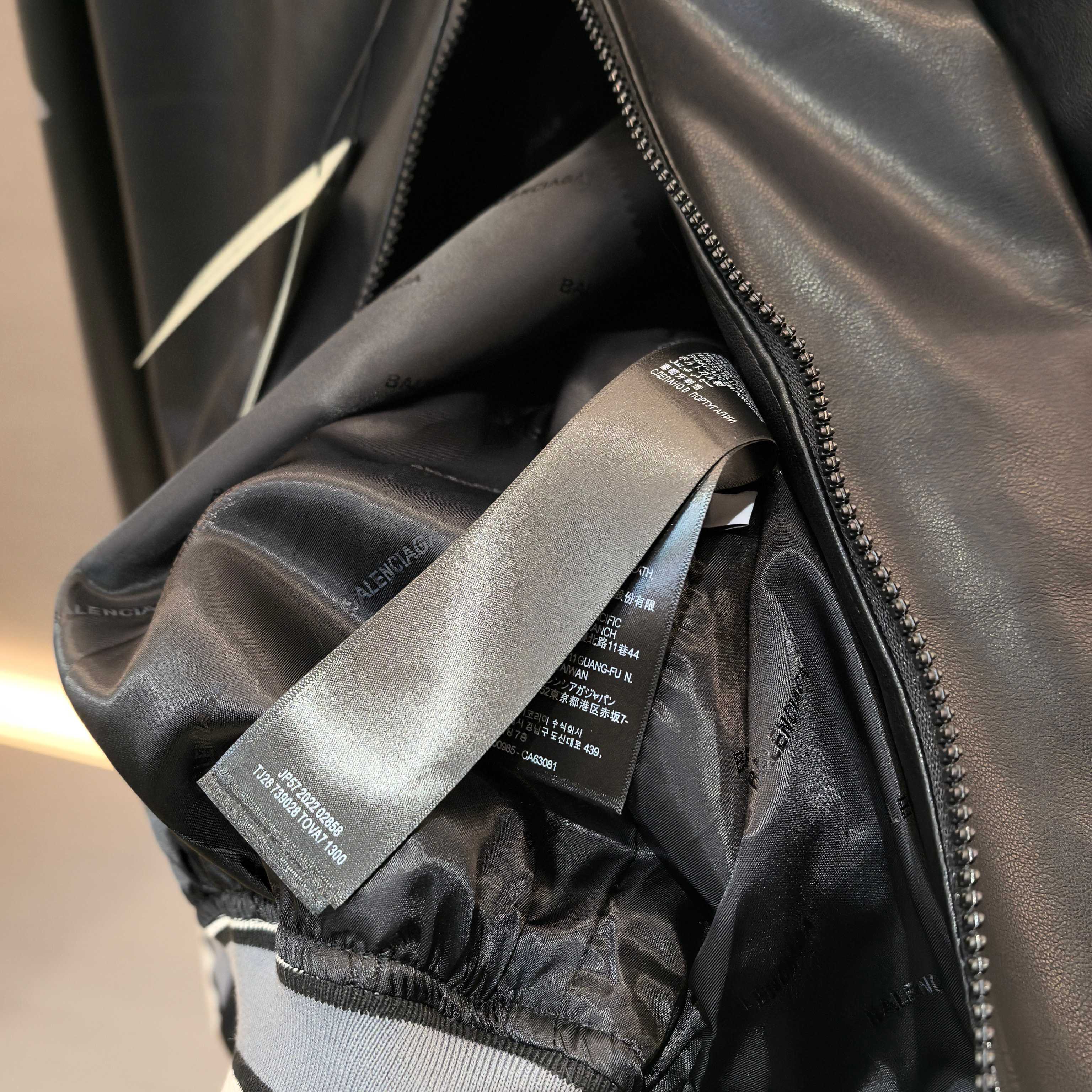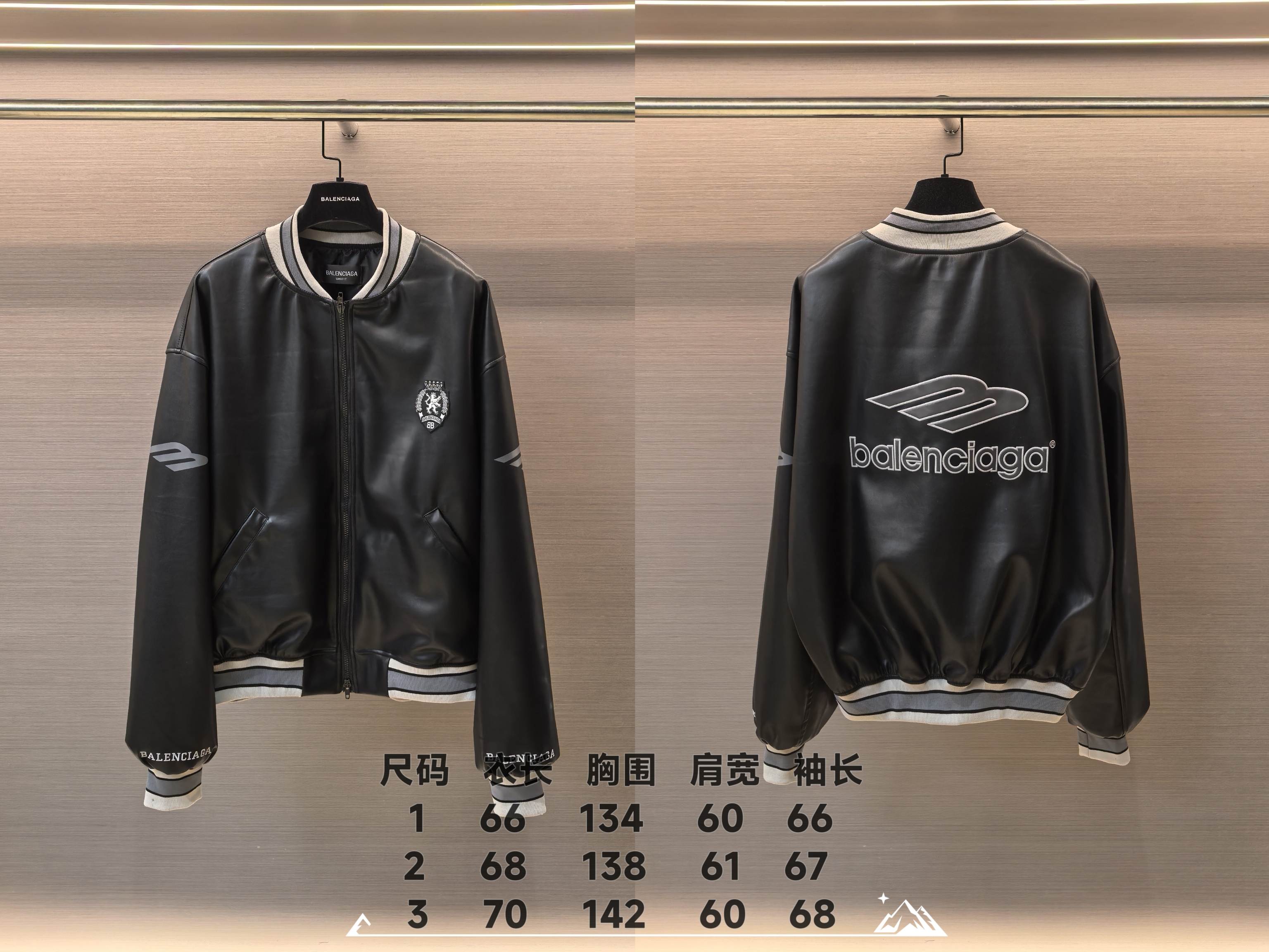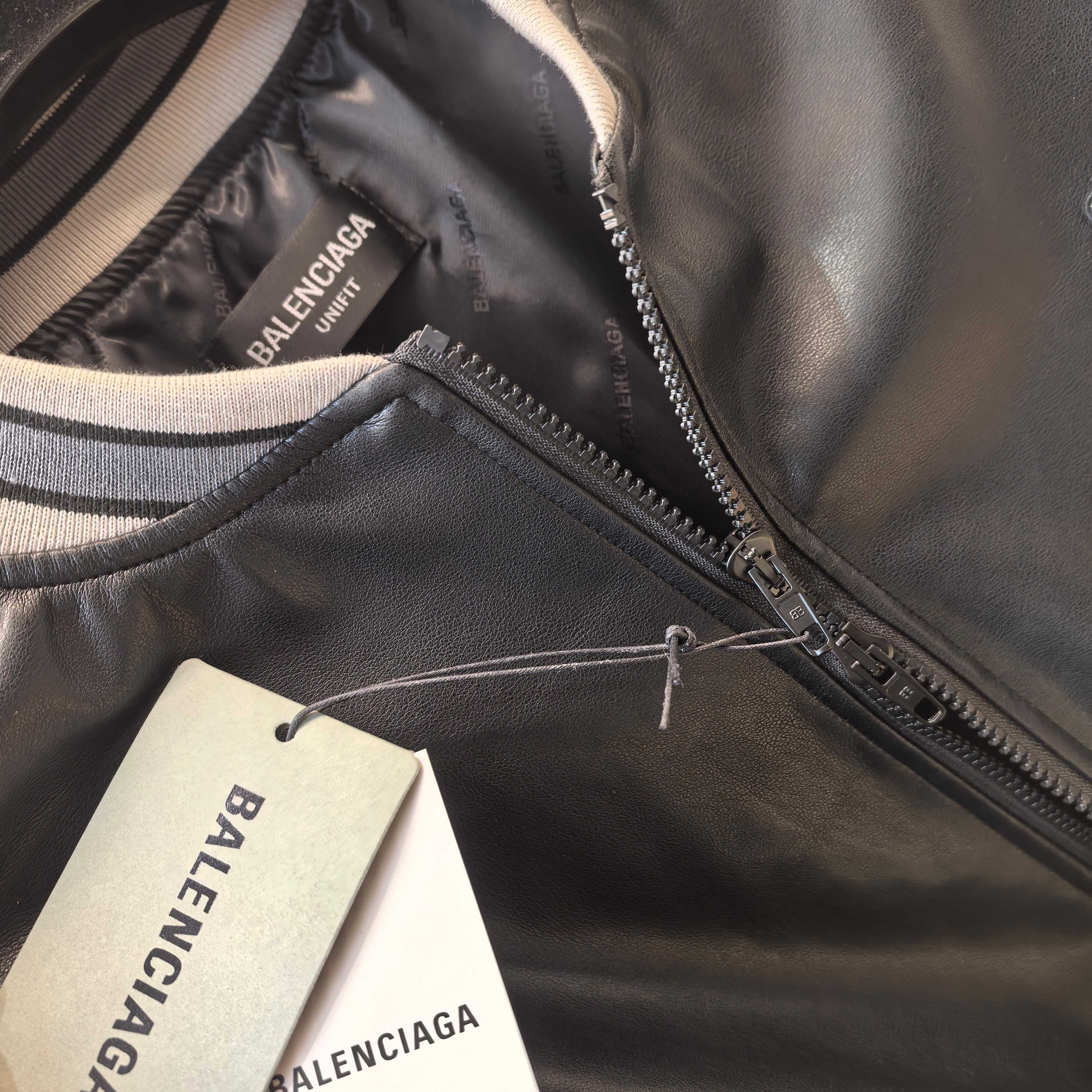 Details: Heavy embroidered leather baseball jacket with pure lines and attitude, featuring an oversized logo, neutral style, front zipper, two zippered side pockets, embroidered letters on sleeves, M letter print on arms, and artworks embroidery on front, sleeves, and back, in black color