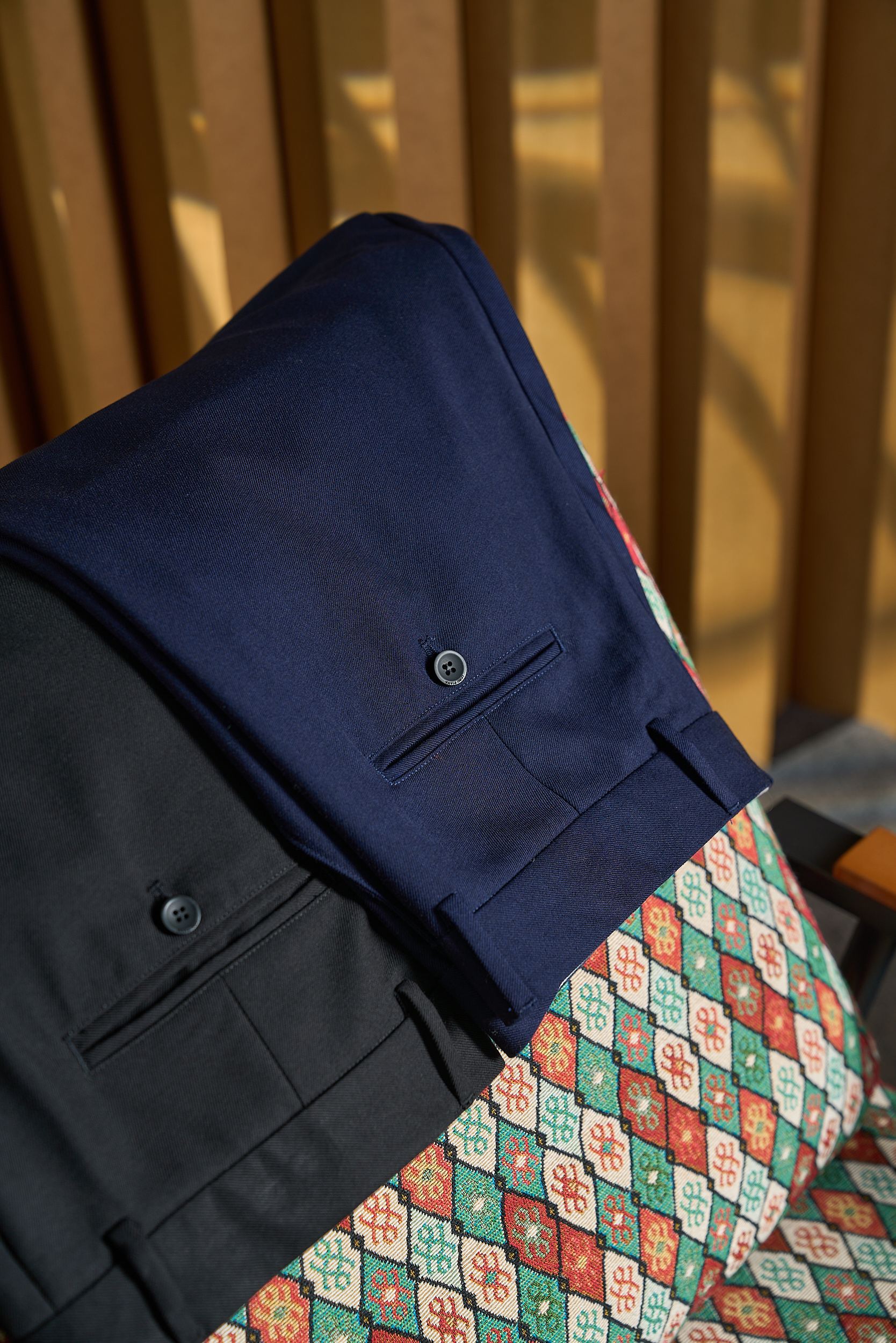 Details: 100% Wool Trousers in Two Colors with Unique Waist Design, Suitable for Various Occasions