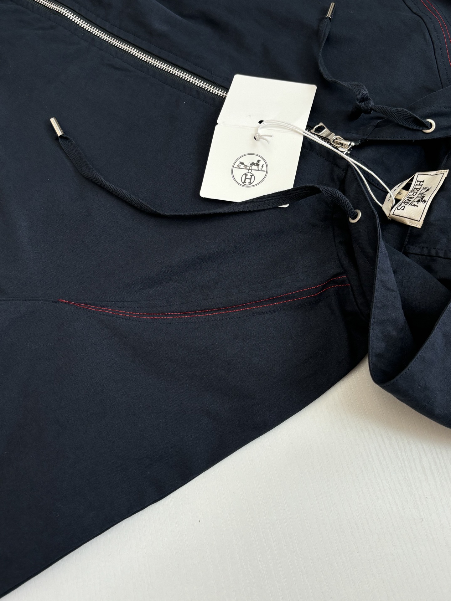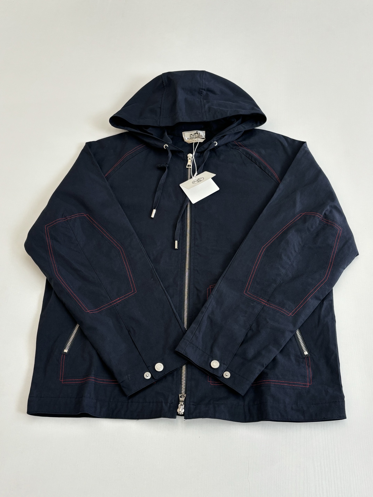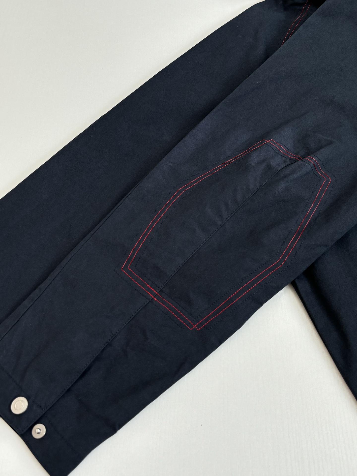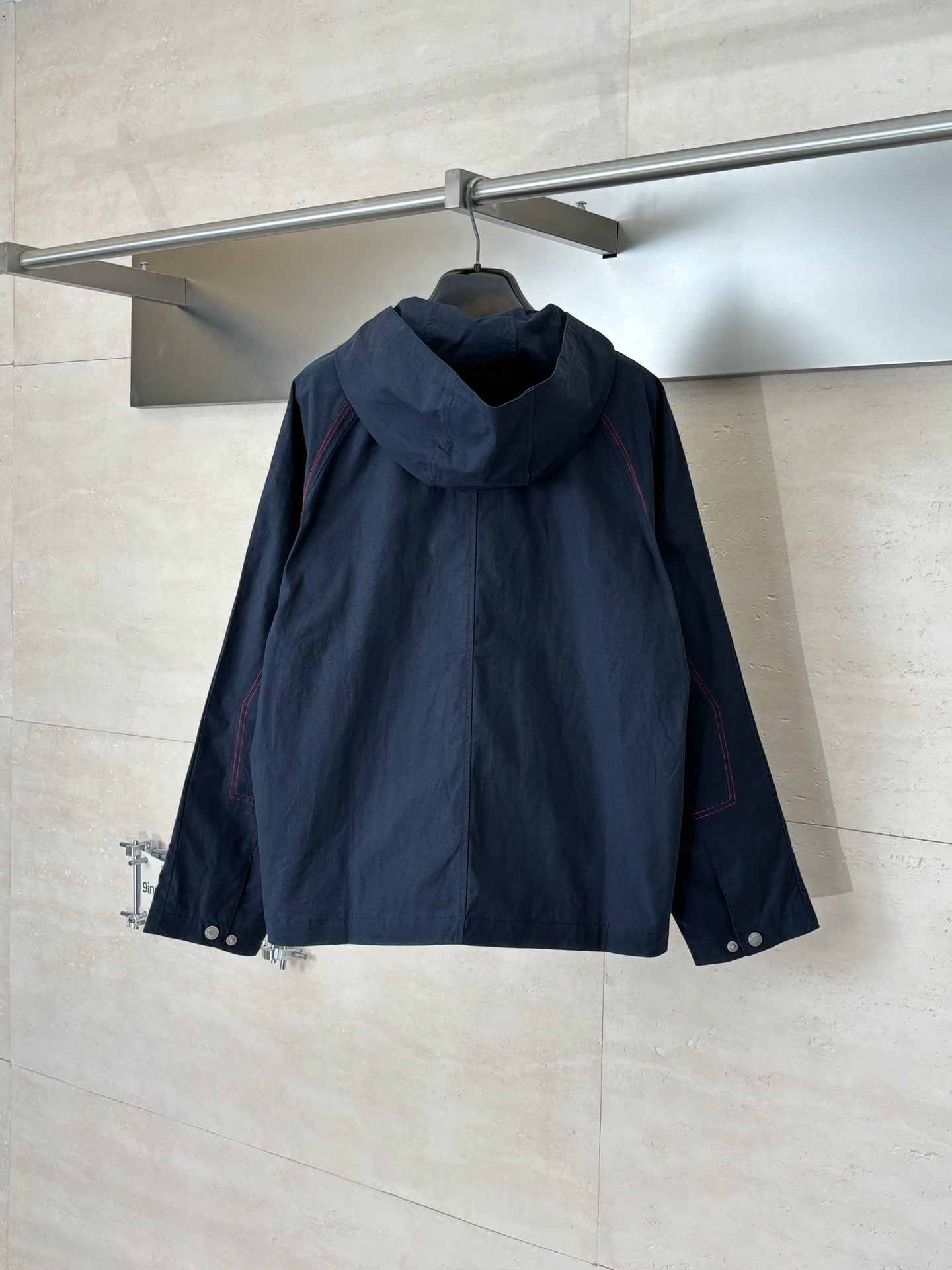 Details: Work-style jacket with red stitching and a durable zipper, both practical and stylish