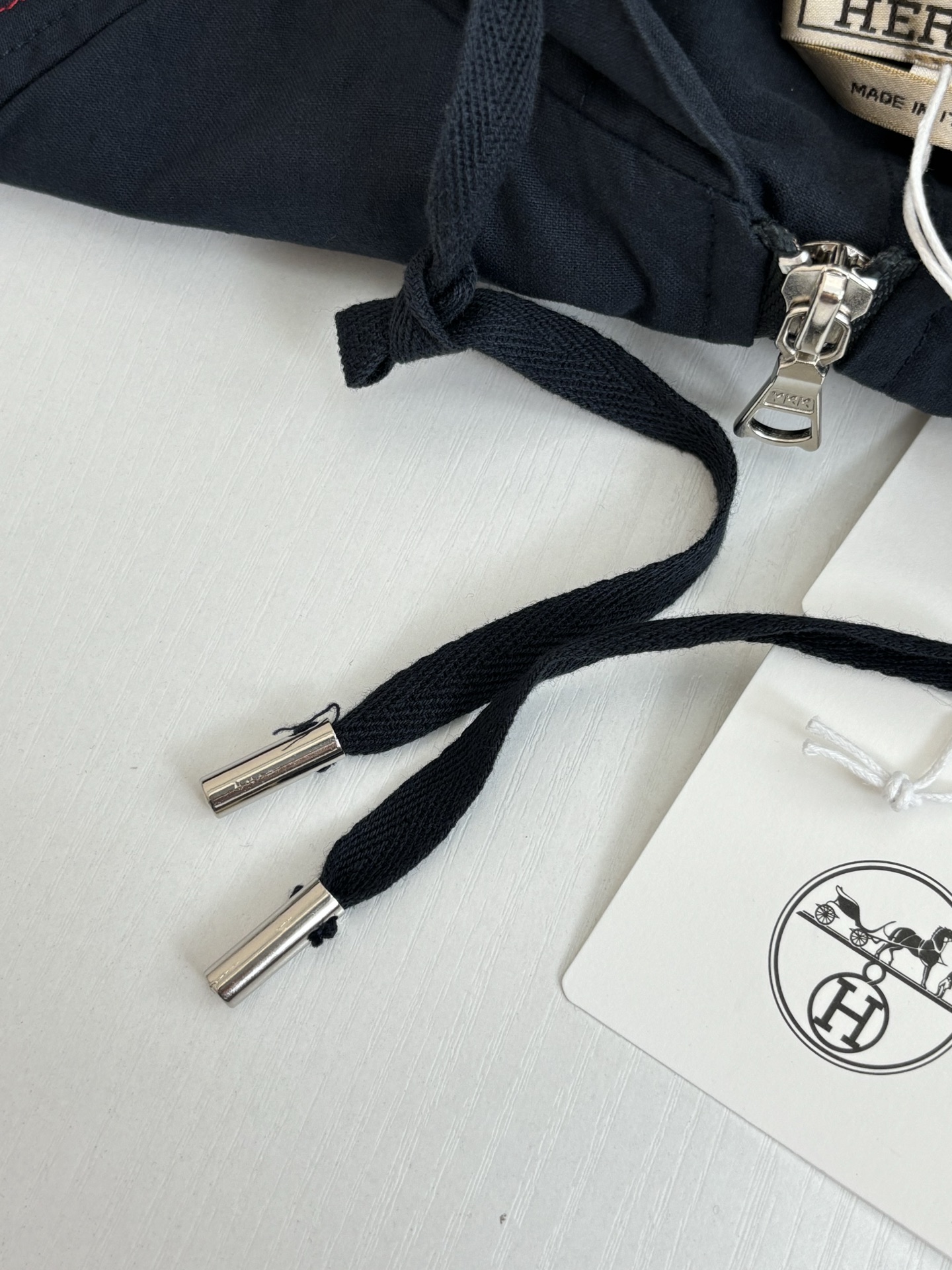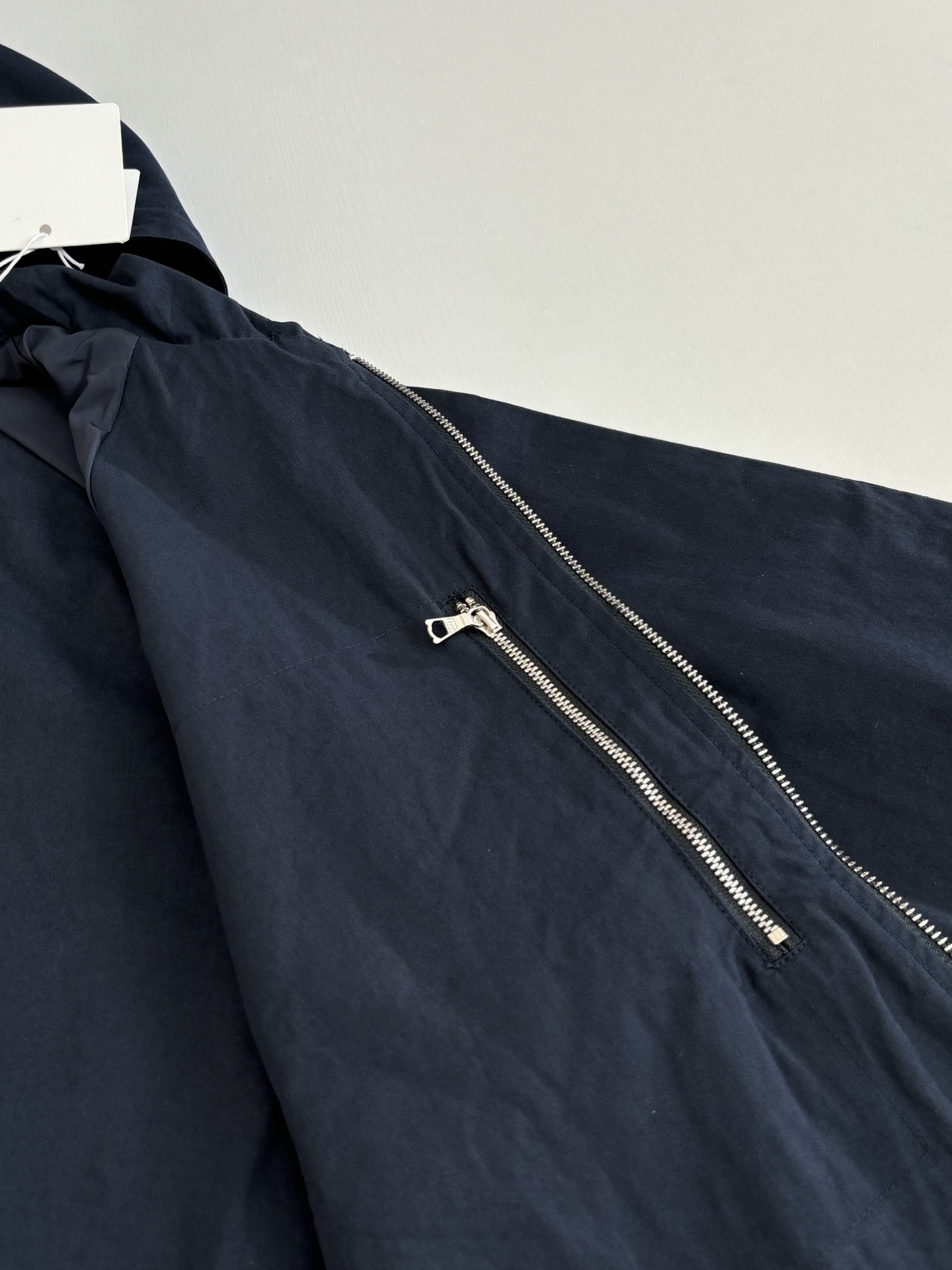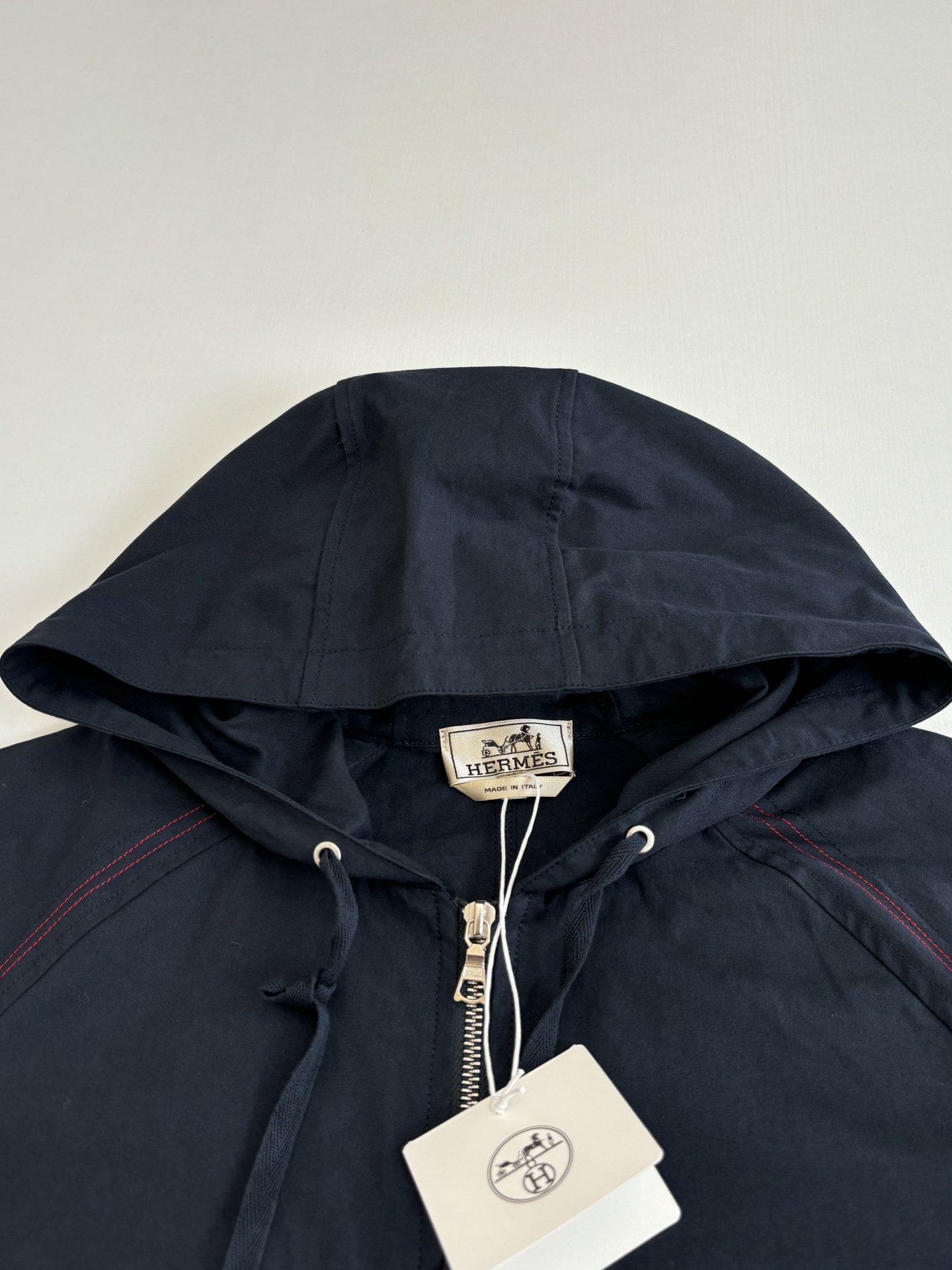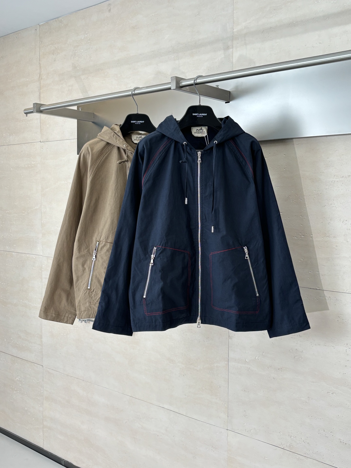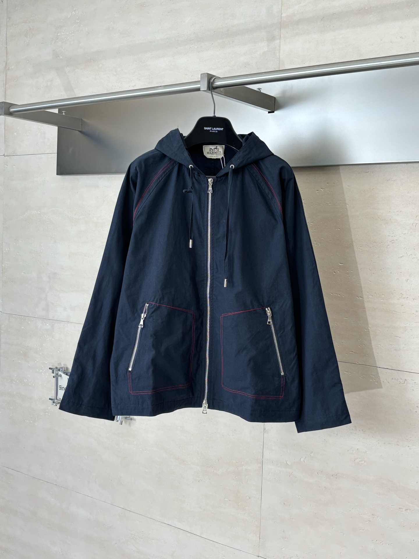 Details: Work-style jacket with red stitching and a durable zipper, both practical and stylish