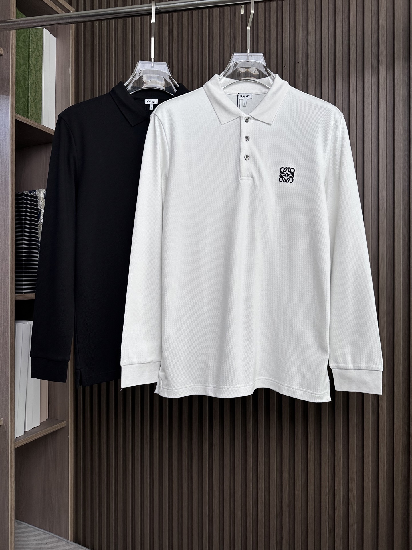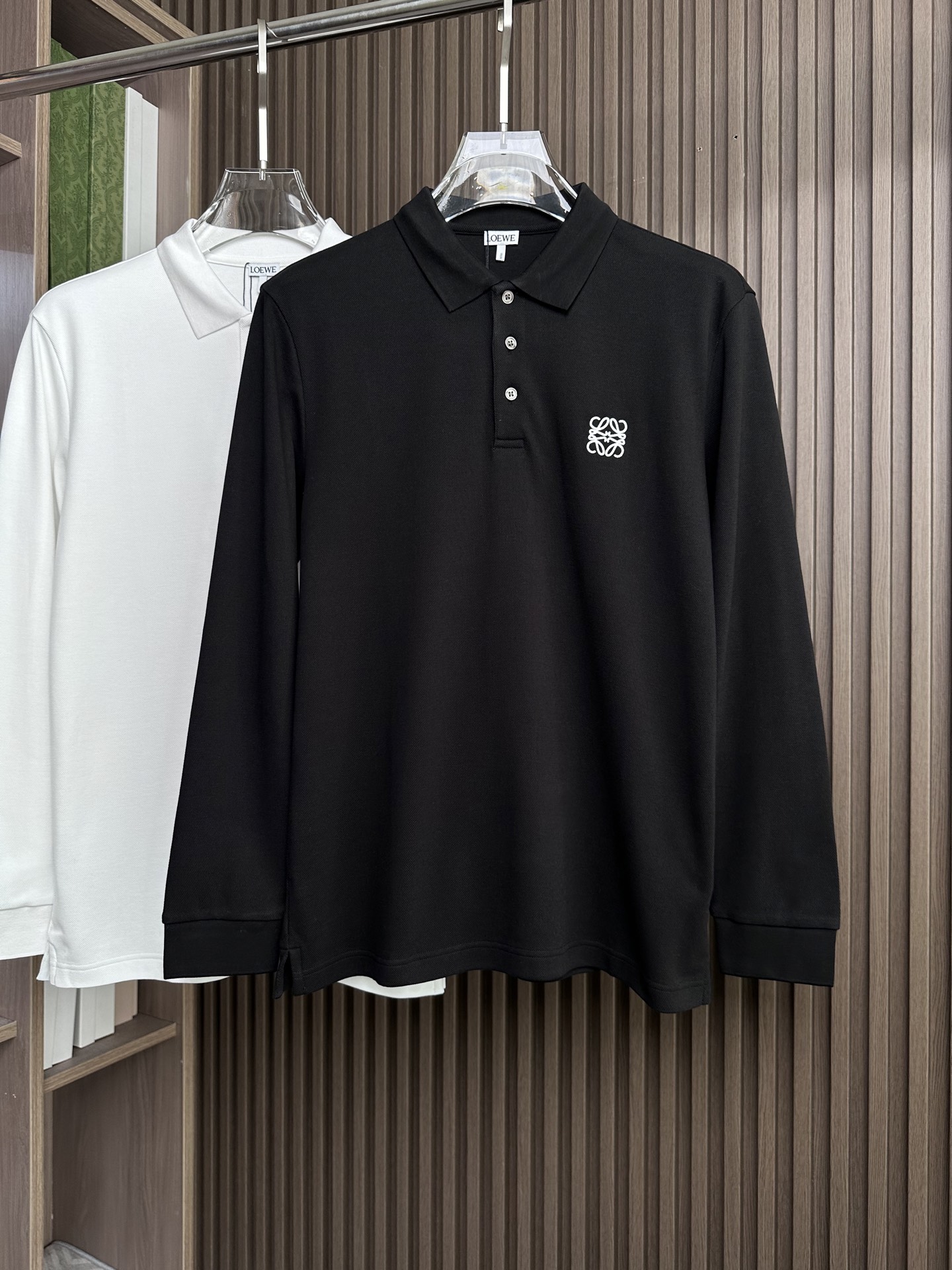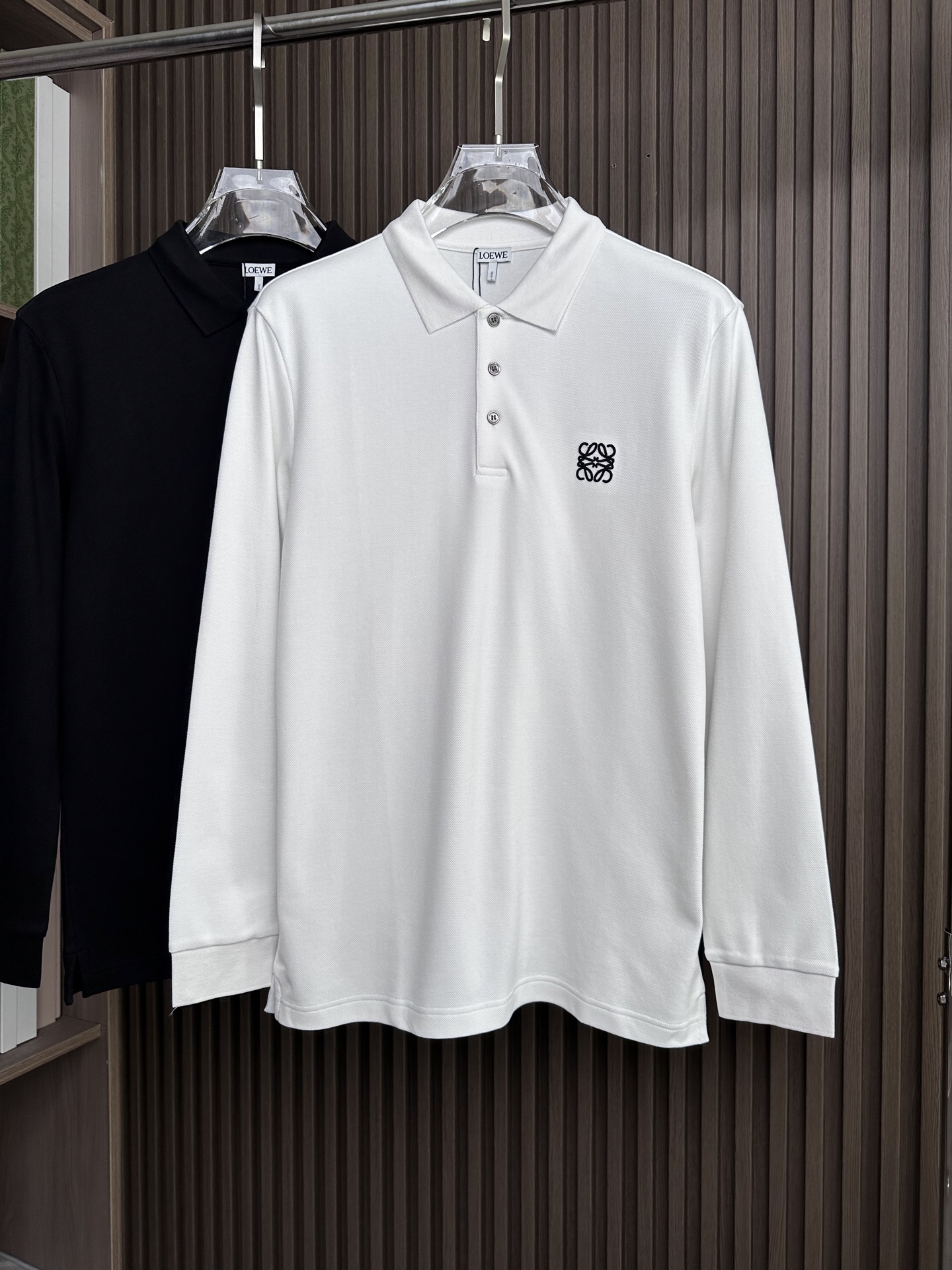 Details: Long-sleeve polo shirt with three-button placket and collar, available in black and white, elegant and versatile.