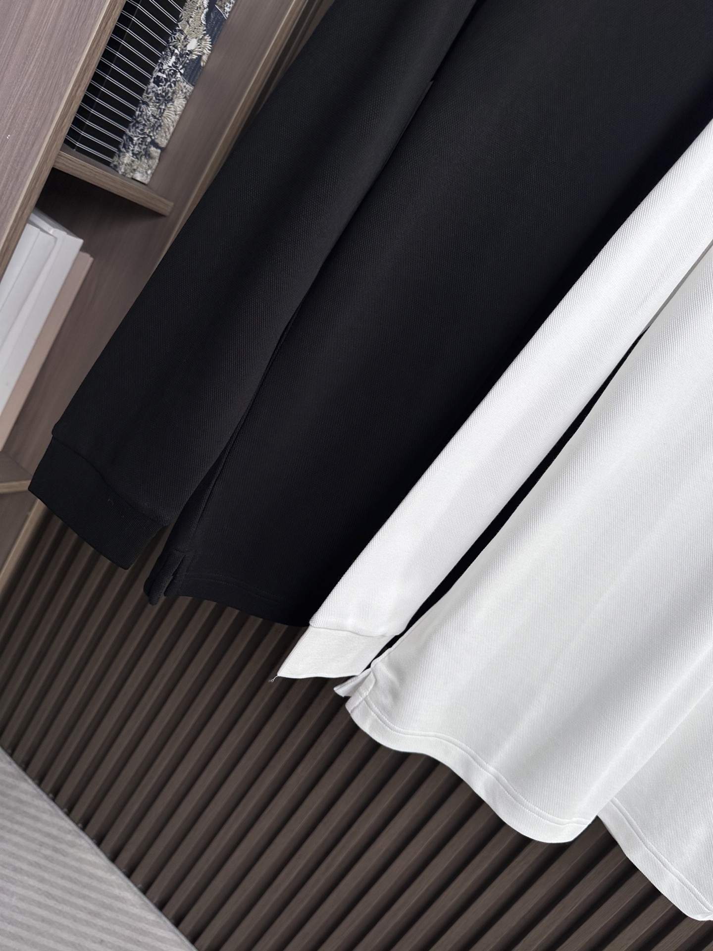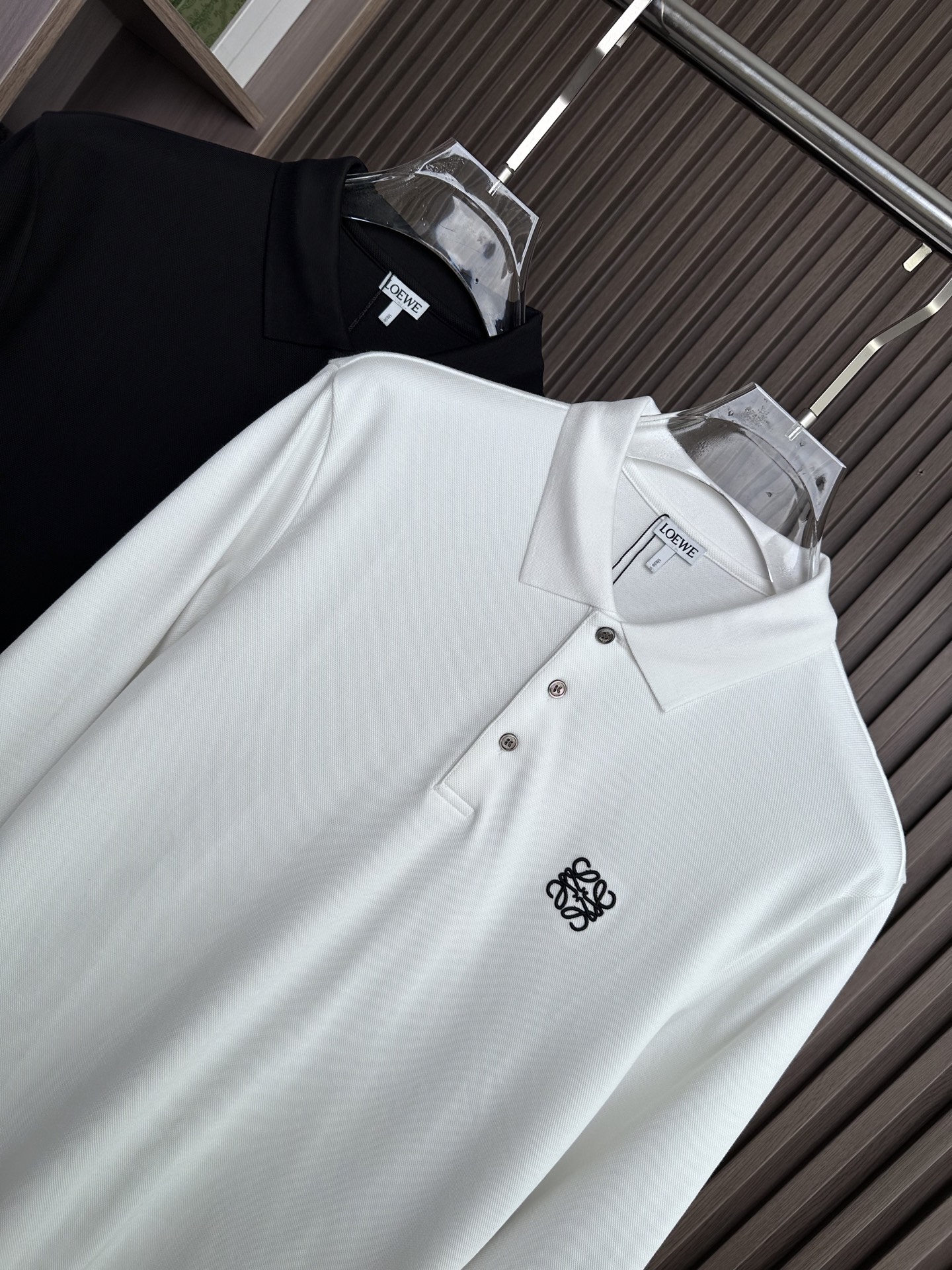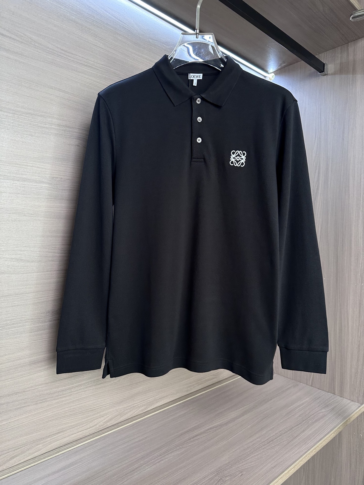 Details: Long-sleeve polo shirt with three-button placket and collar, available in black and white, elegant and versatile.