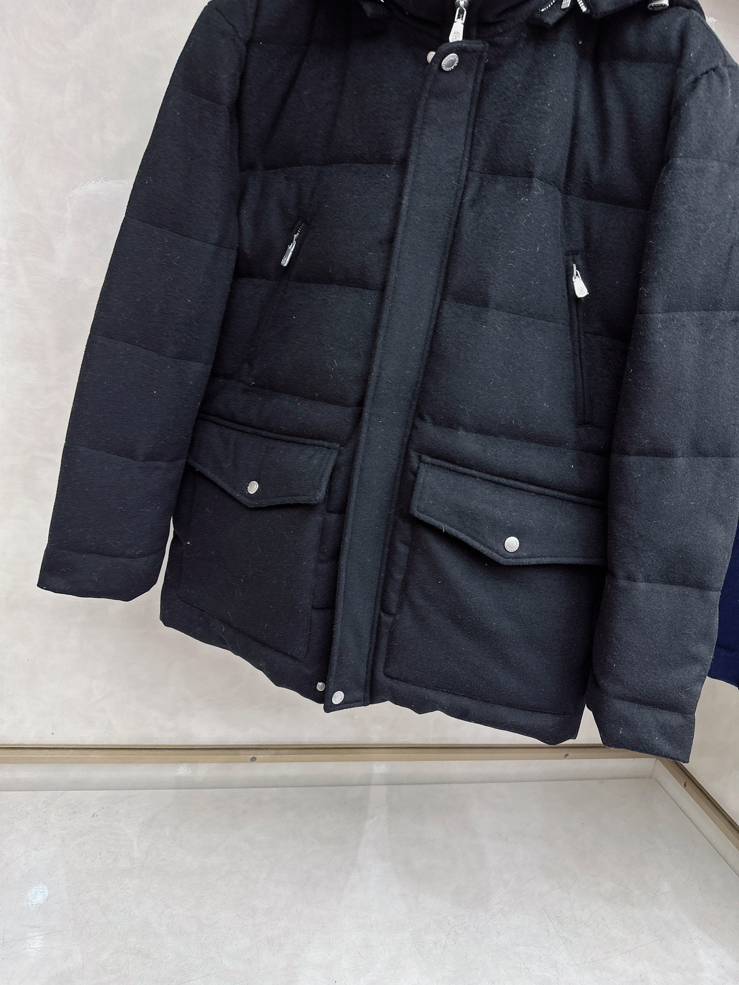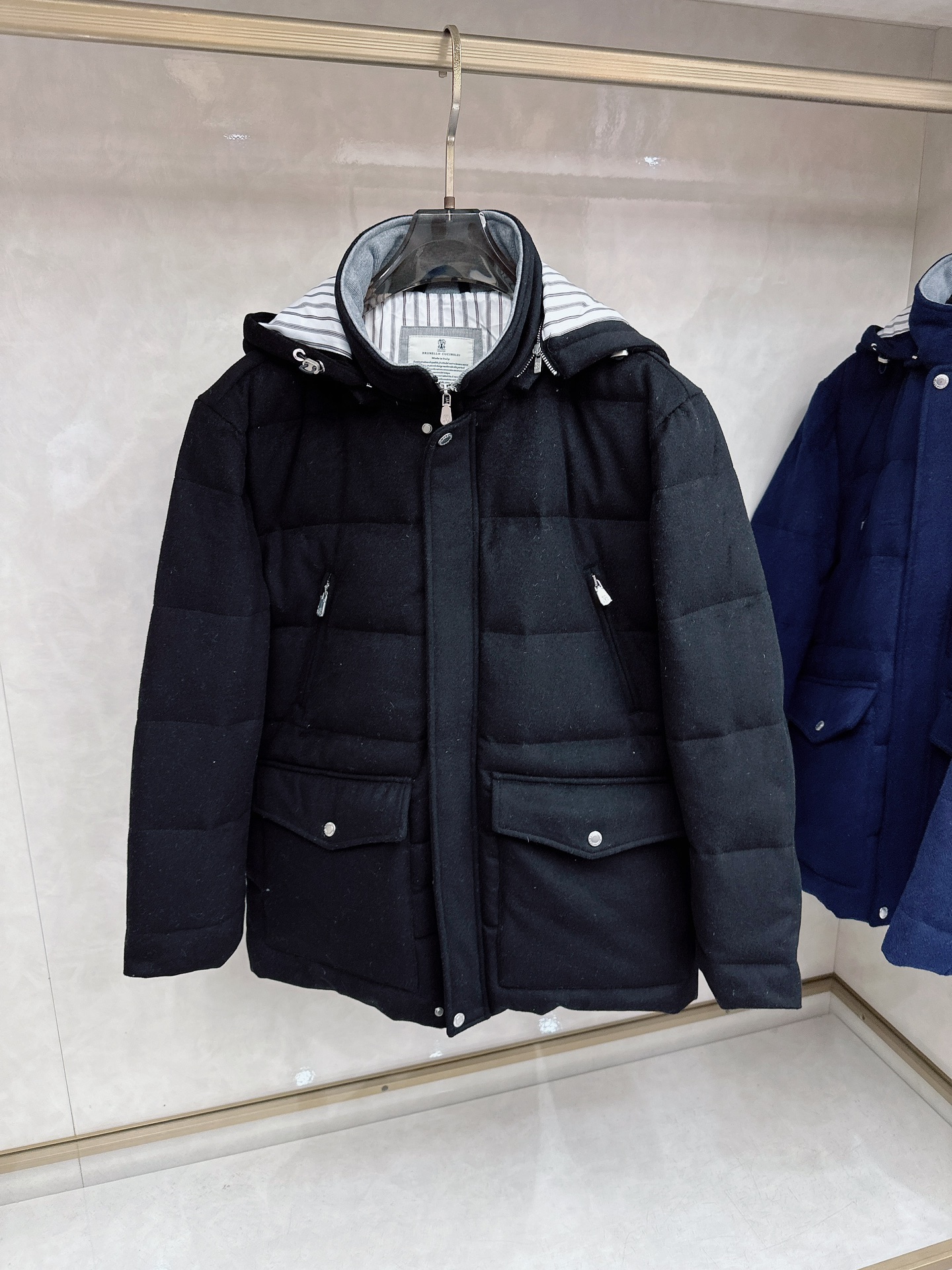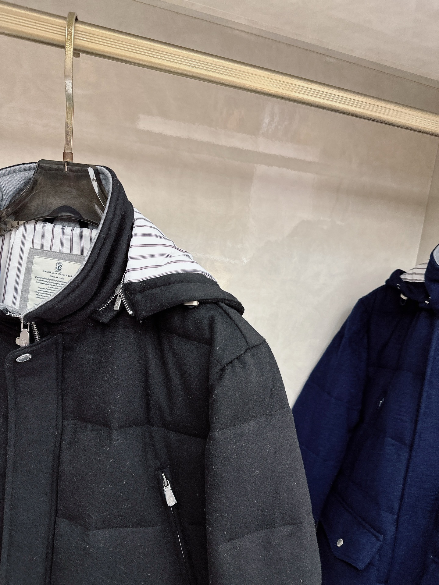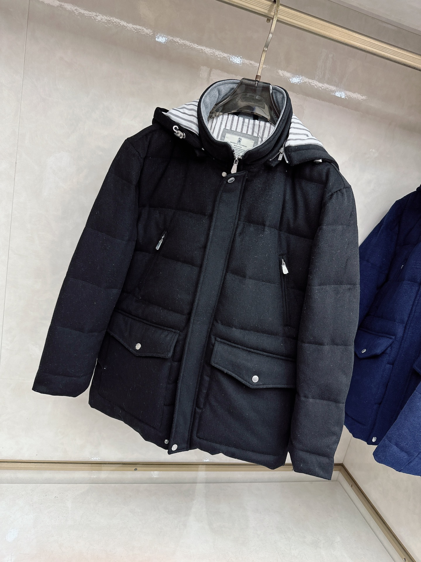 Details: Wool-Cashmere Blend Down Jacket: High-Quality Details in Black, White, Blue