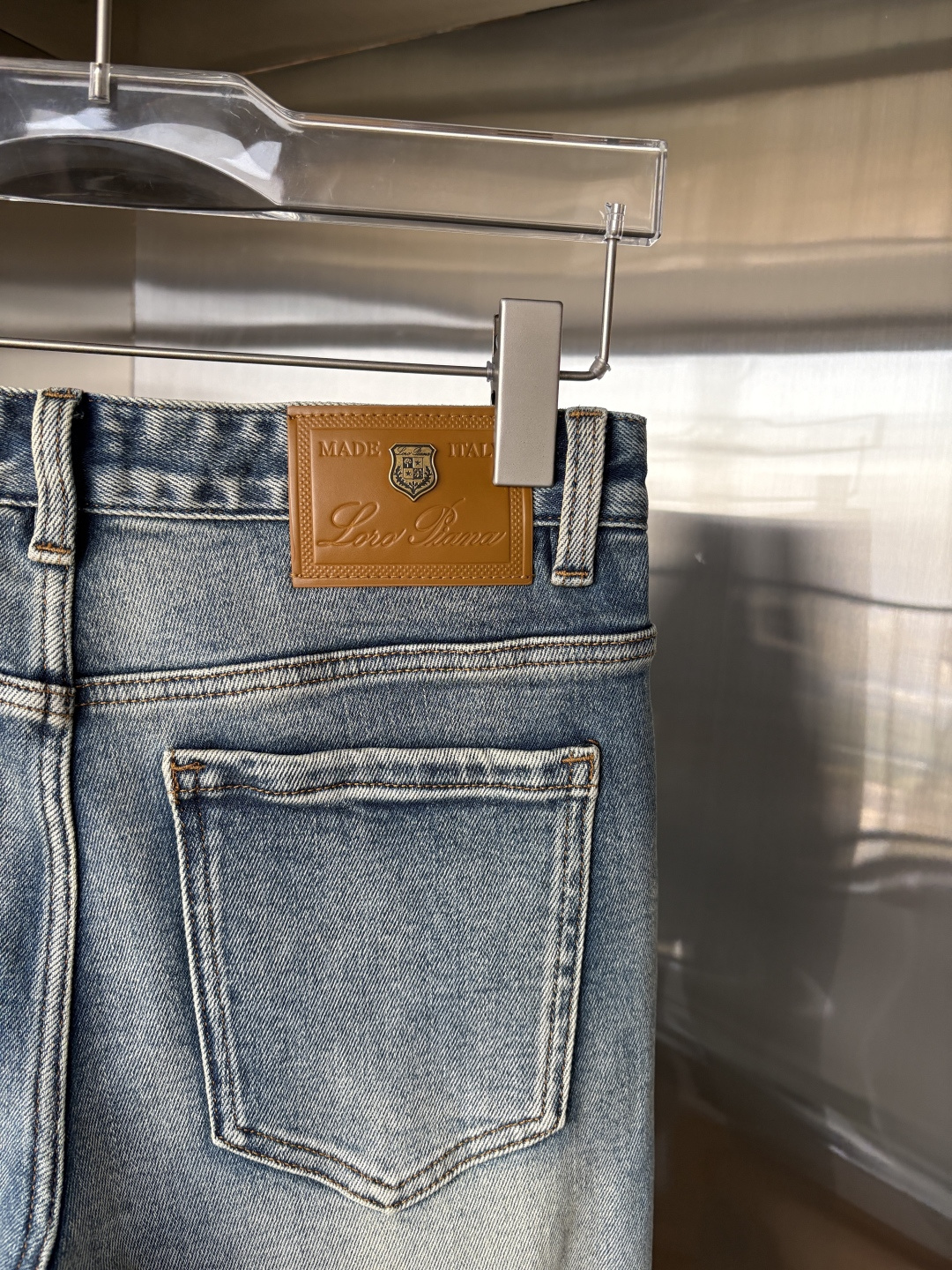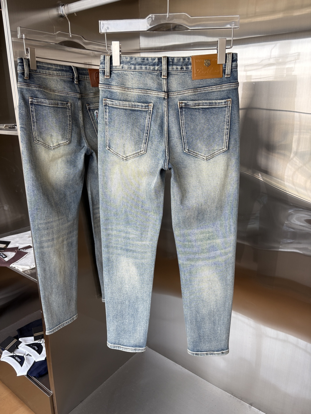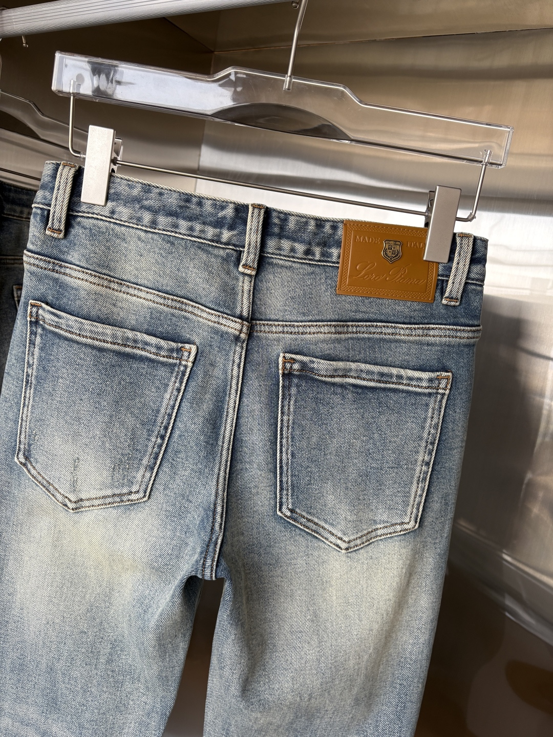 Details: Popular jeans made of soft fabric, featuring a leather waist tag and a classic blue wash