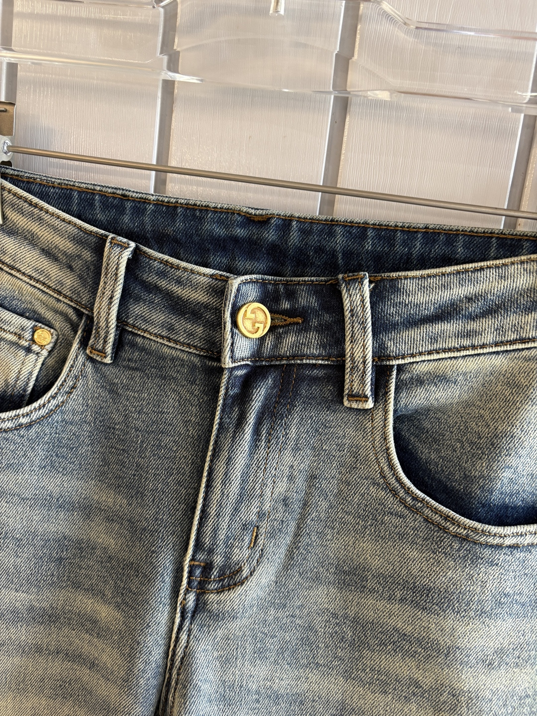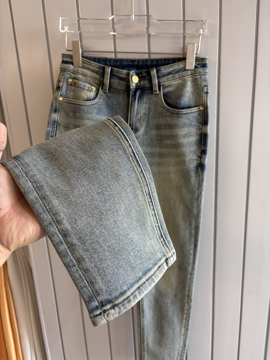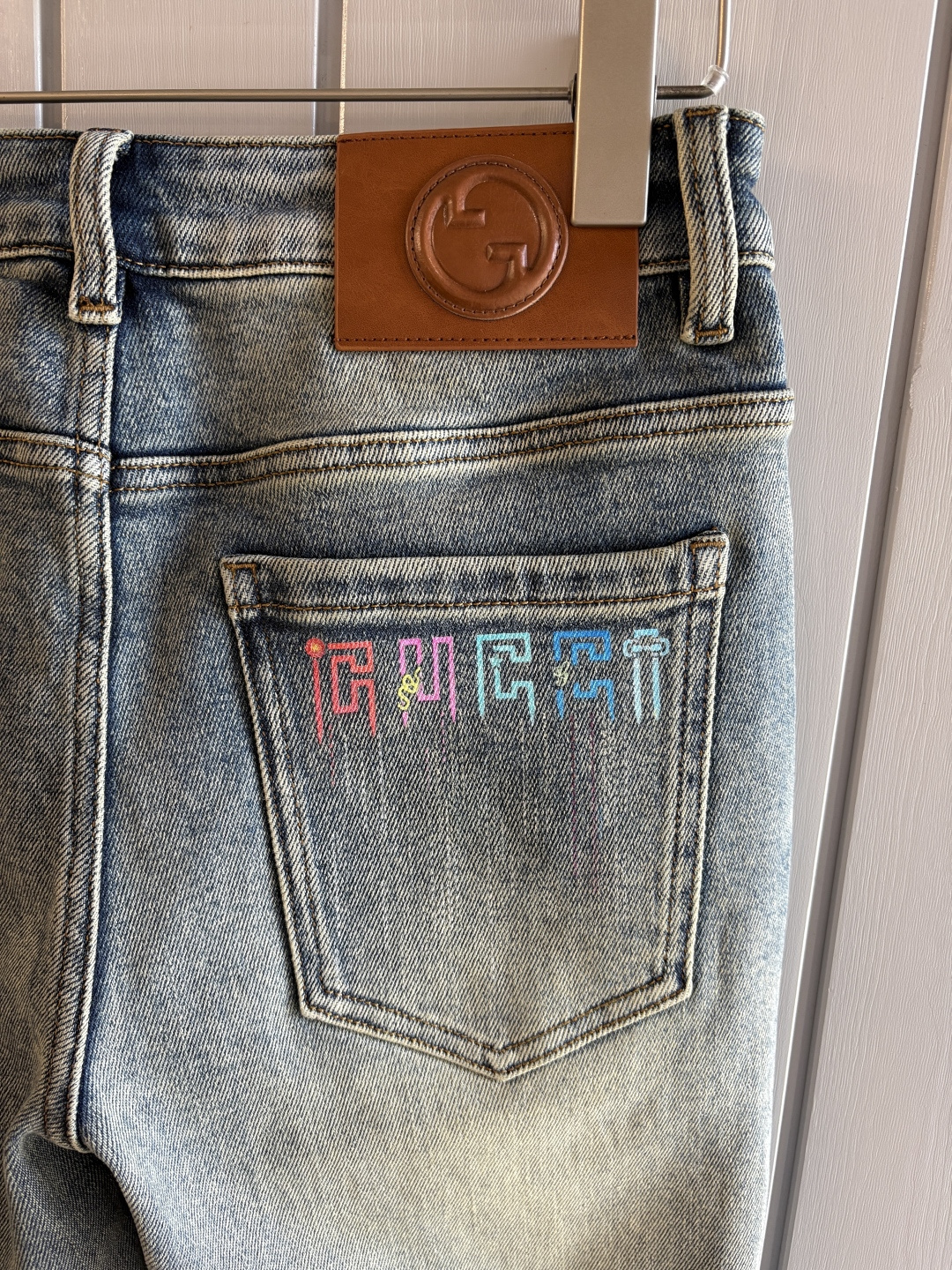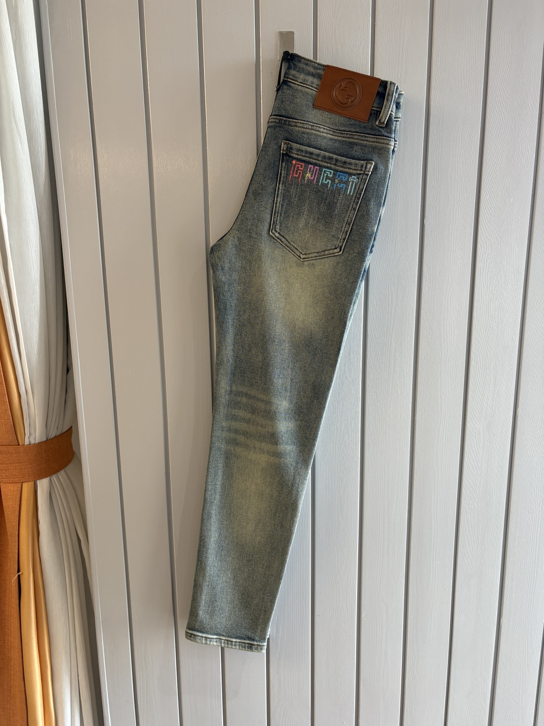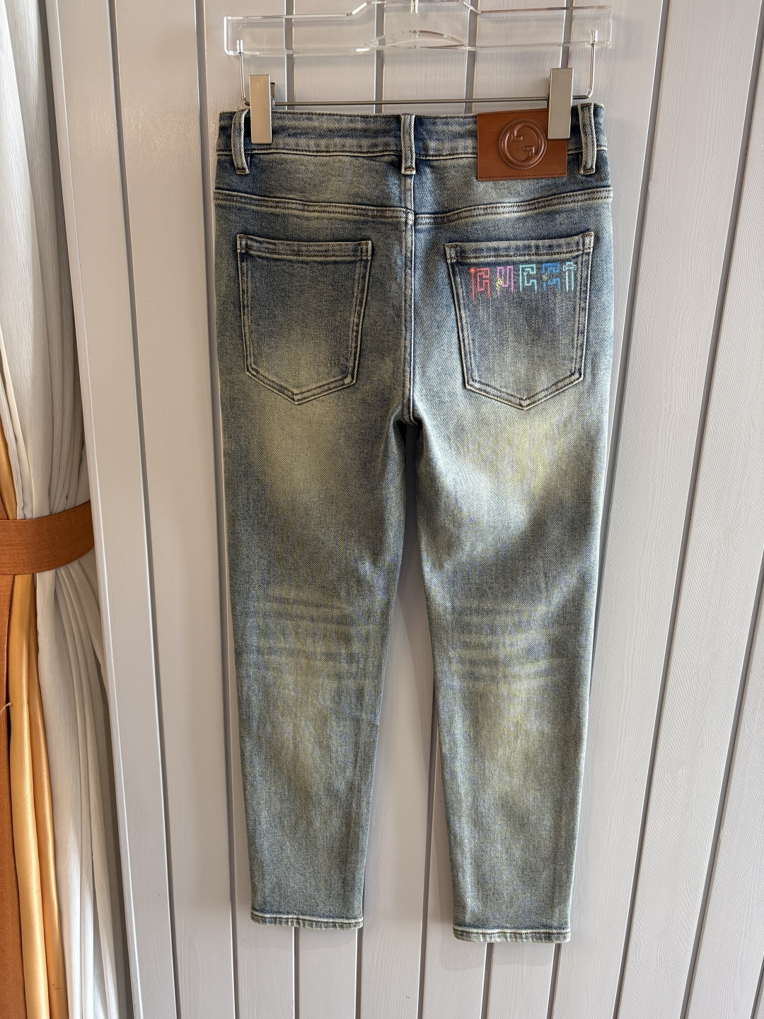 Details: Soft denim jeans with a calfskin waist tag, elastic straight-leg style