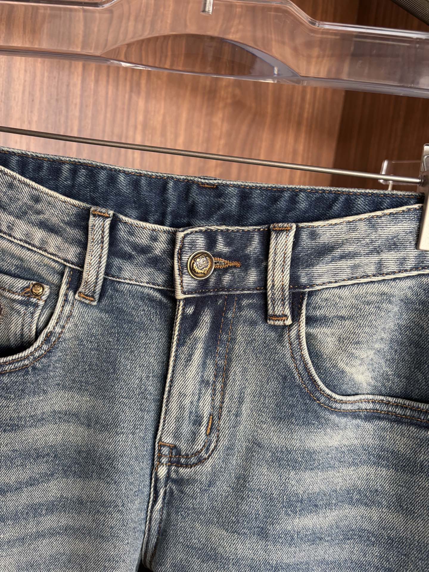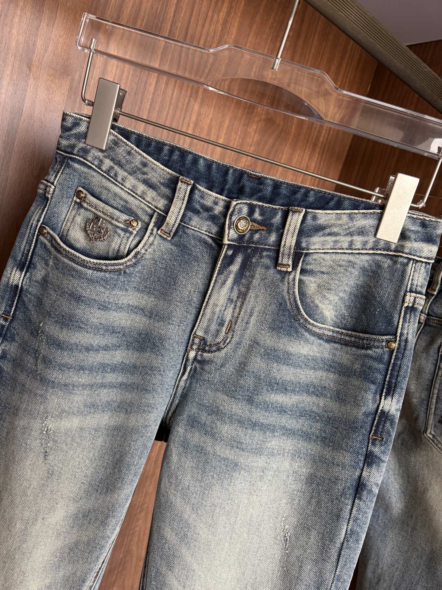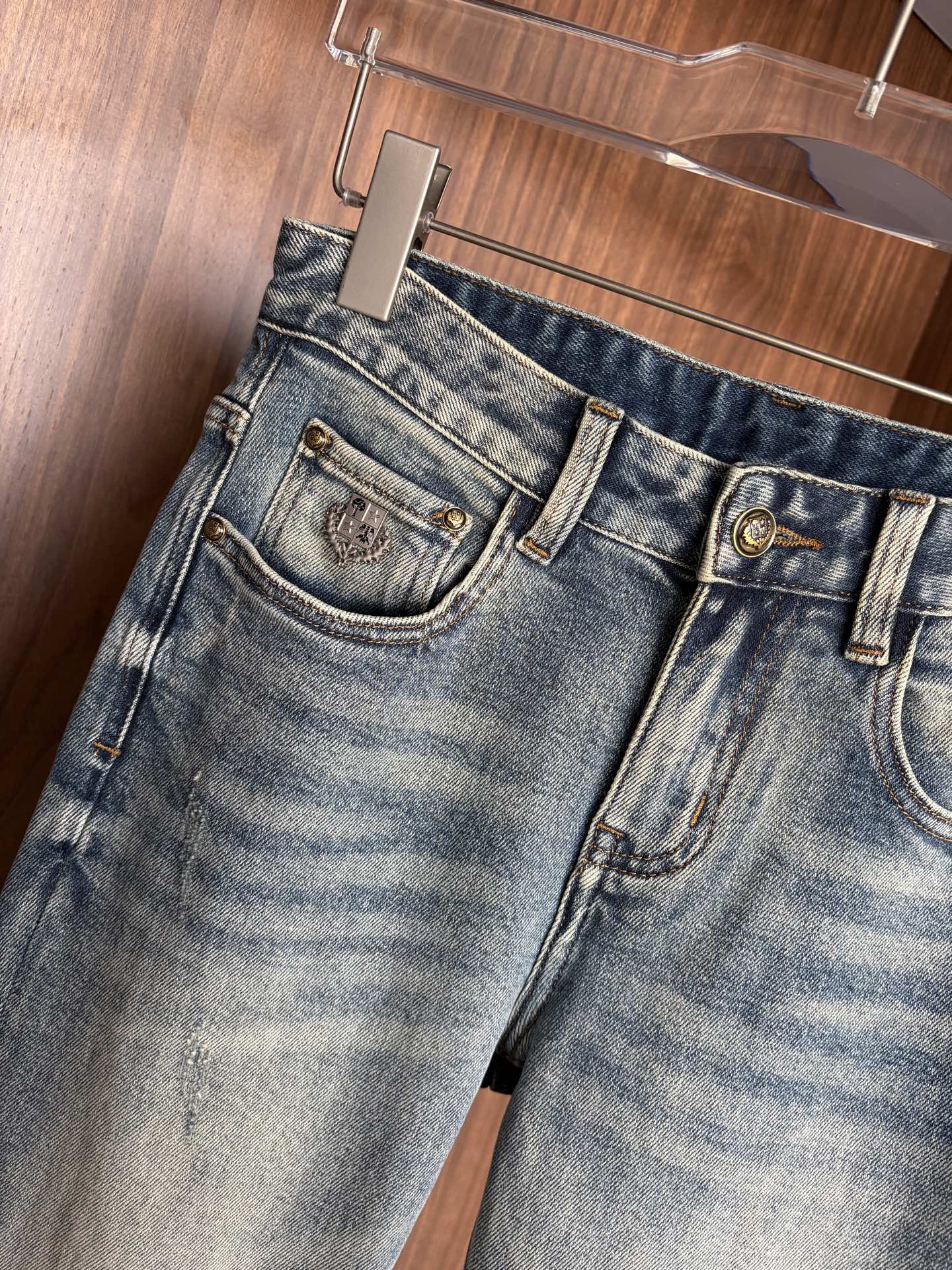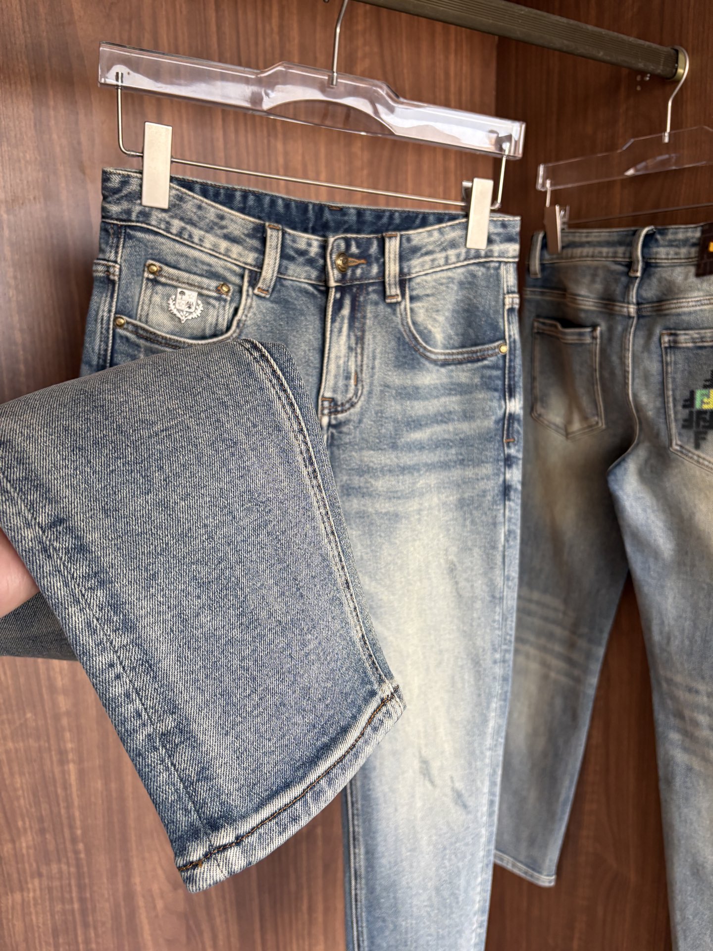 Details: Soft jeans with a leather waist tag, a classic blue wash, and a stretchy straight fit