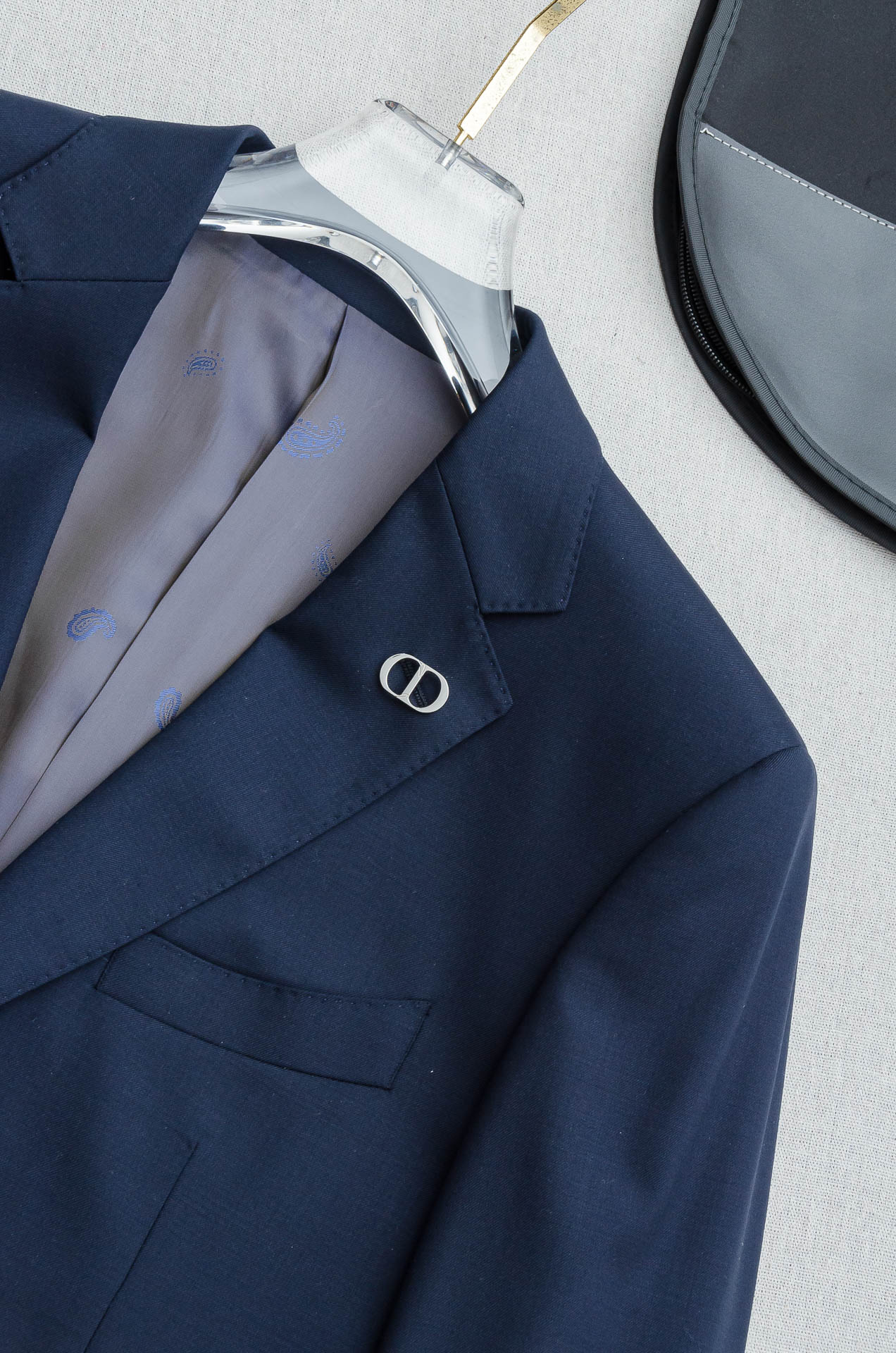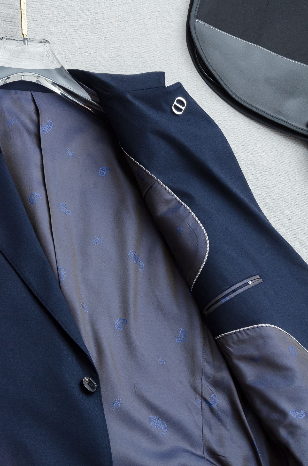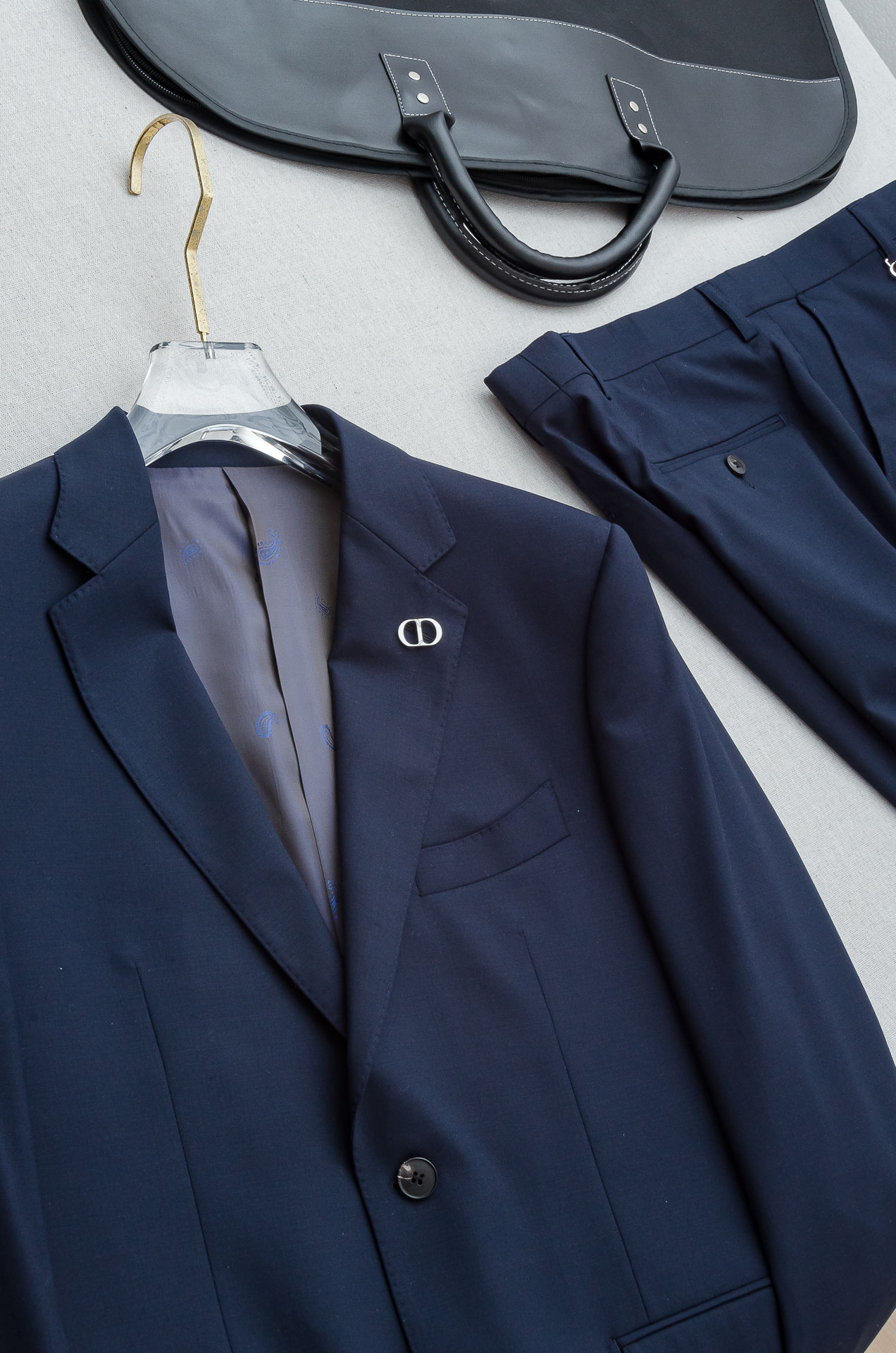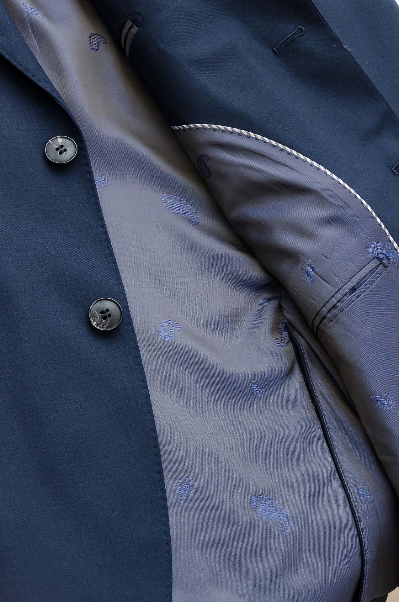 Details: Luxurious wool suit with a fine texture, a unique pattern, and a stylish design