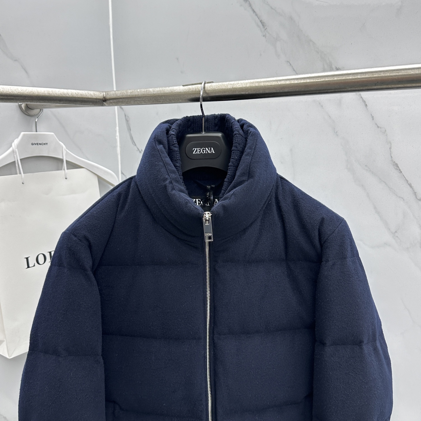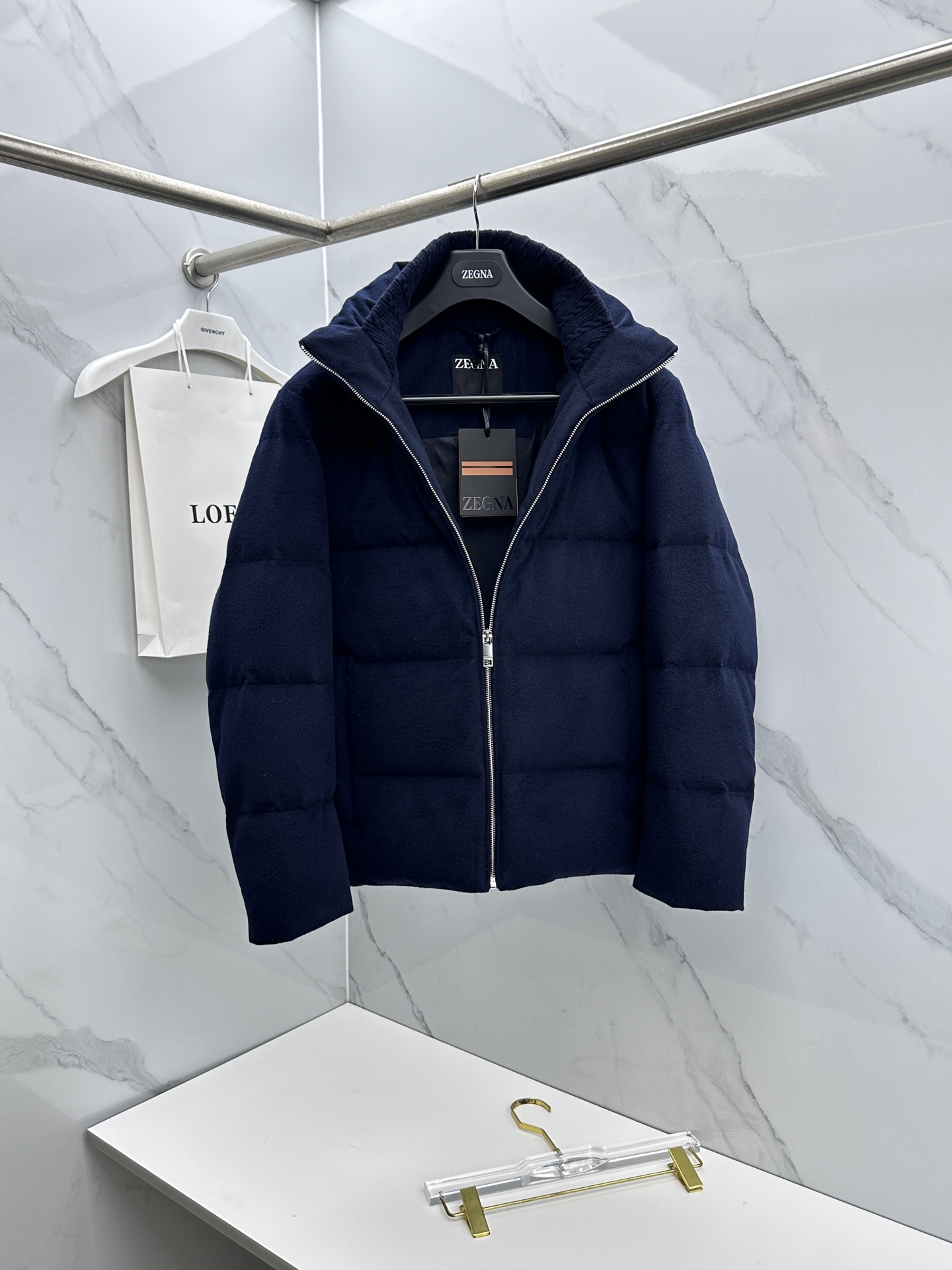 Details: Stylish stand-collar down jacket filled with 90% white duck down, expertly tailored