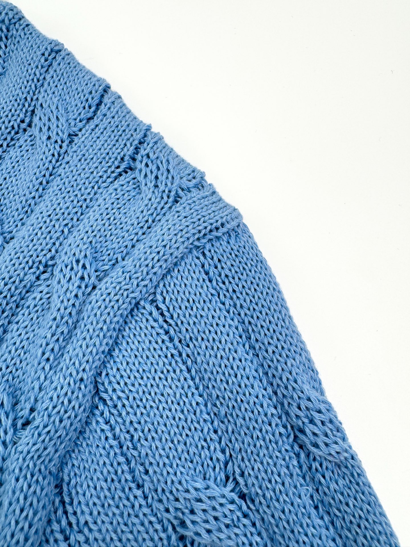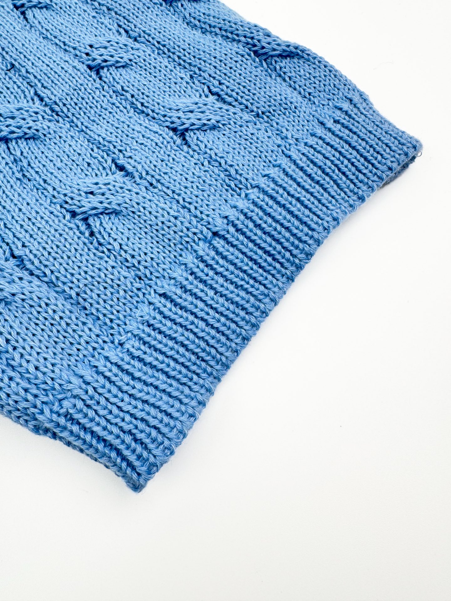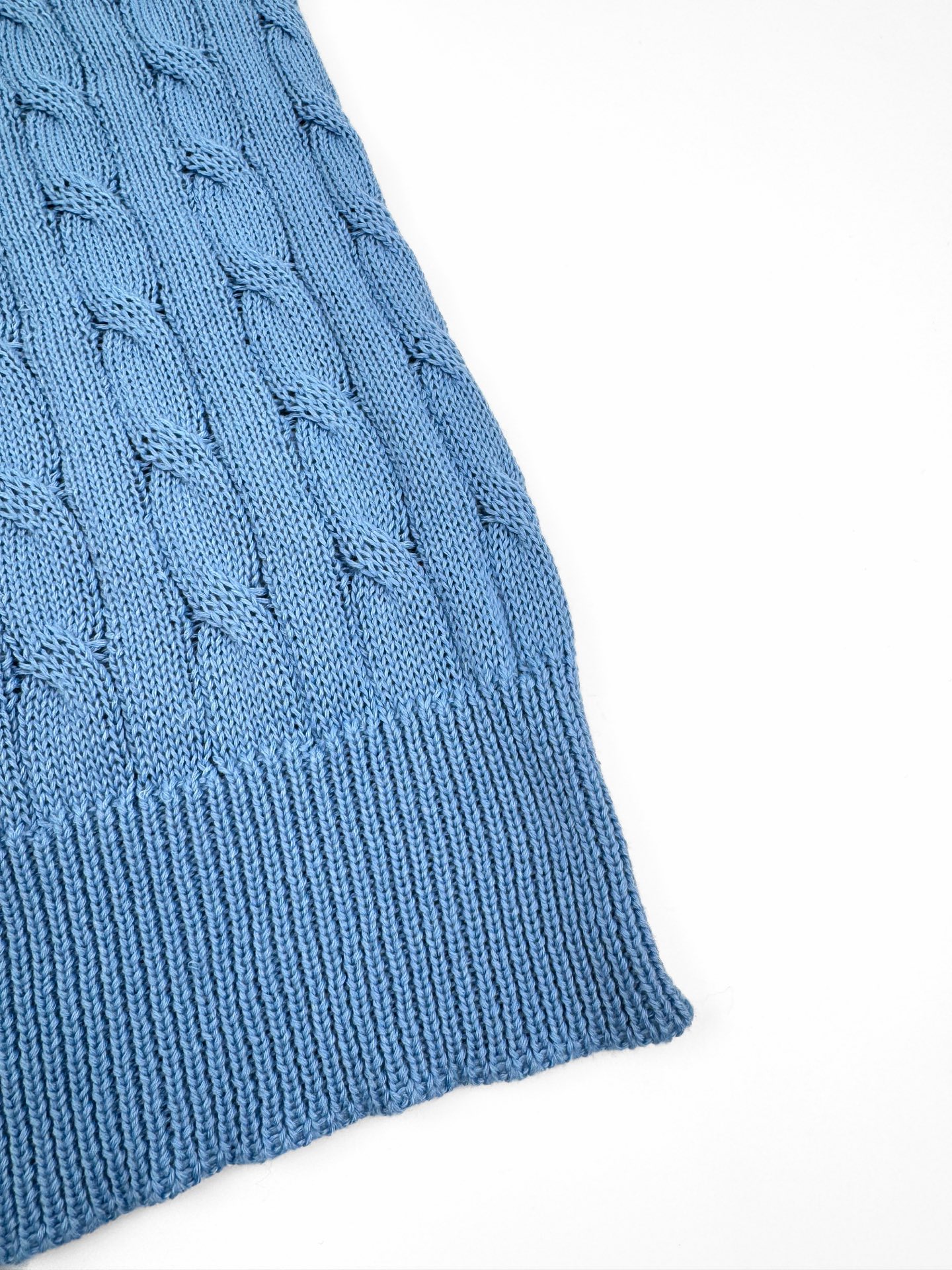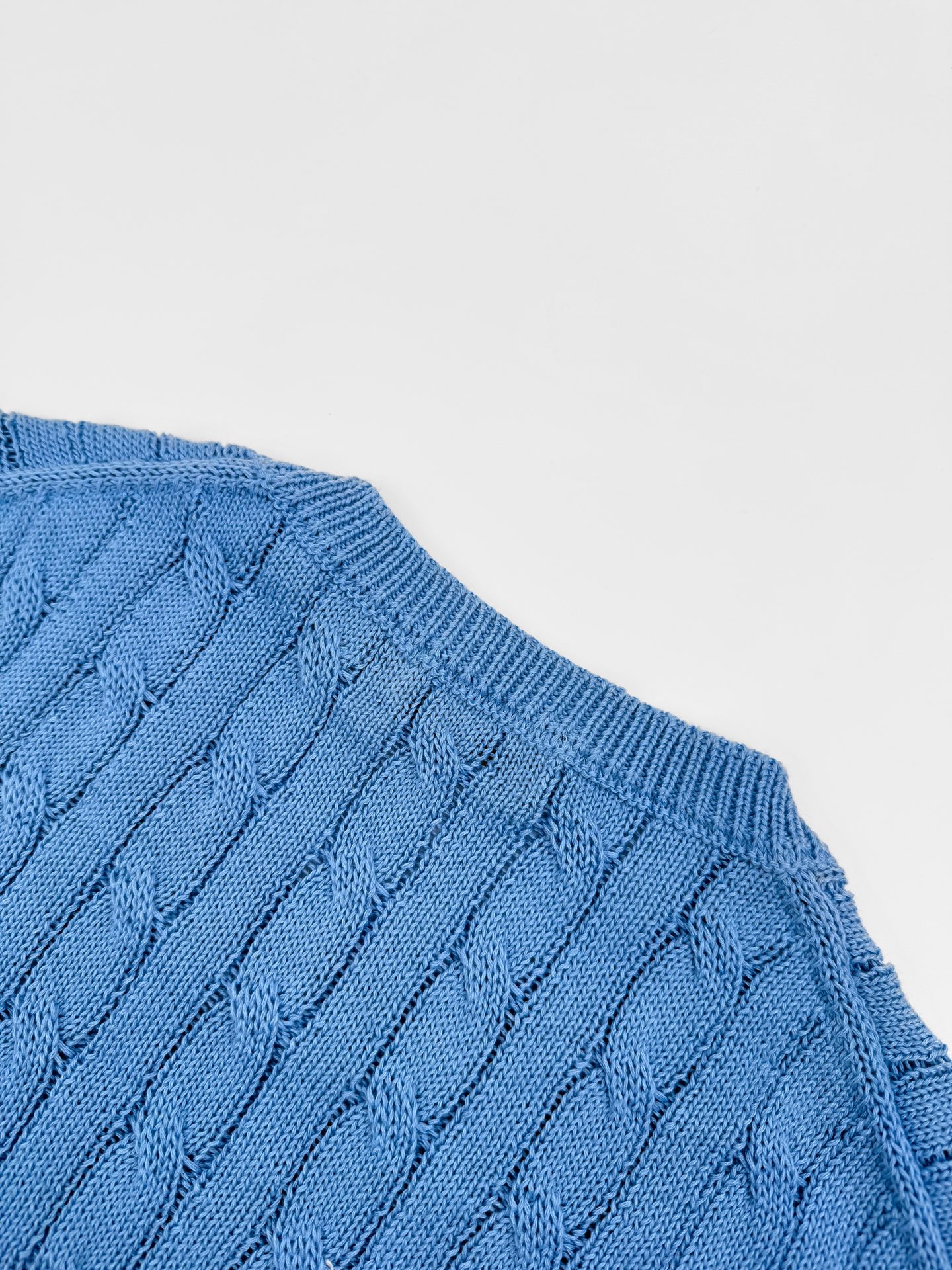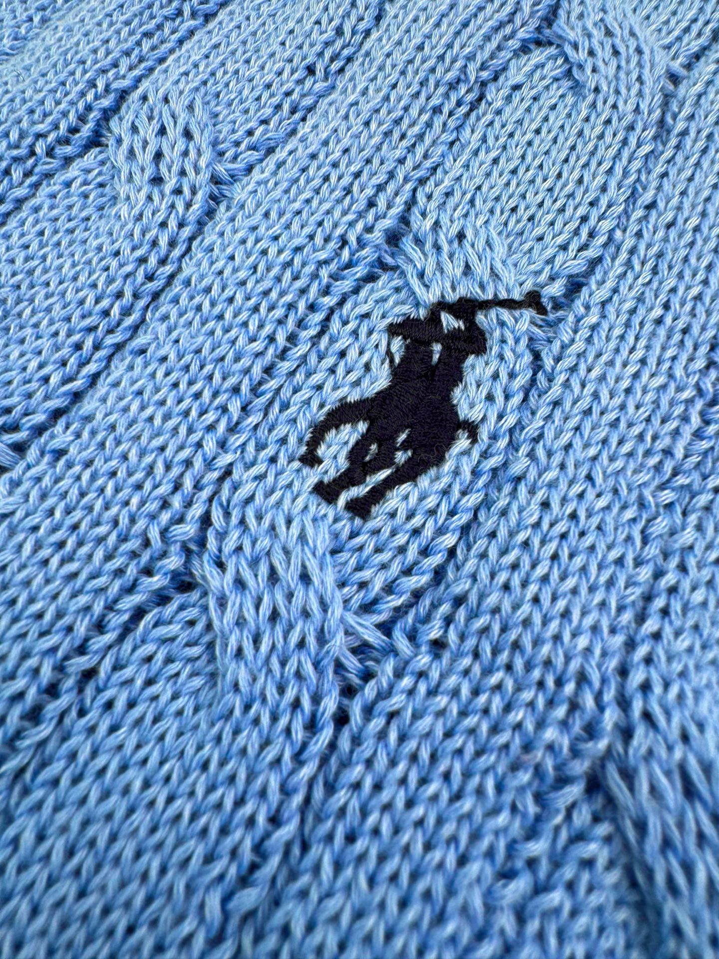 Details: Icy blue cable - knit short - sleeve sweater, soft and comfortable to wear. With a precise cable design and an embroidered horse logo, it offers a flattering shape.