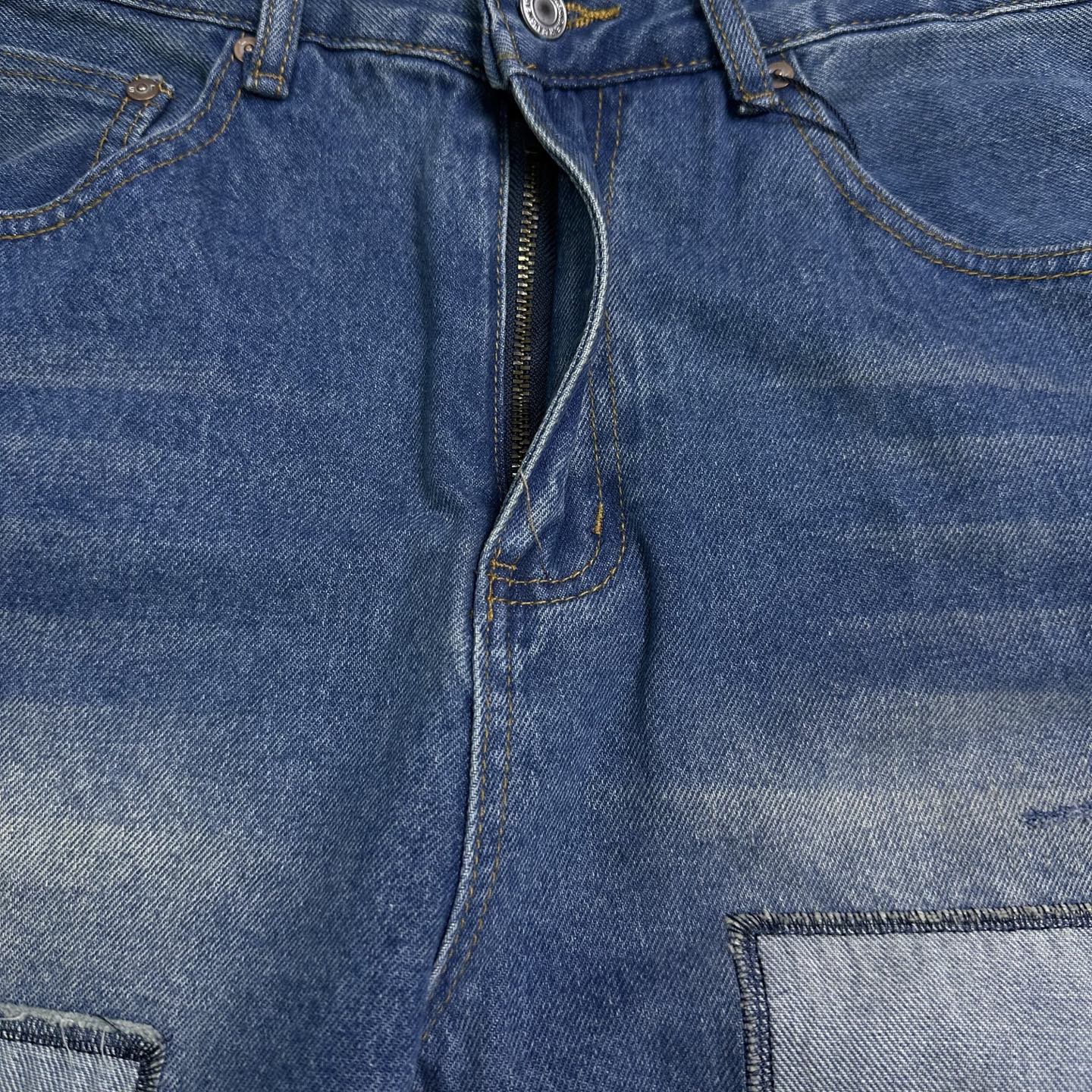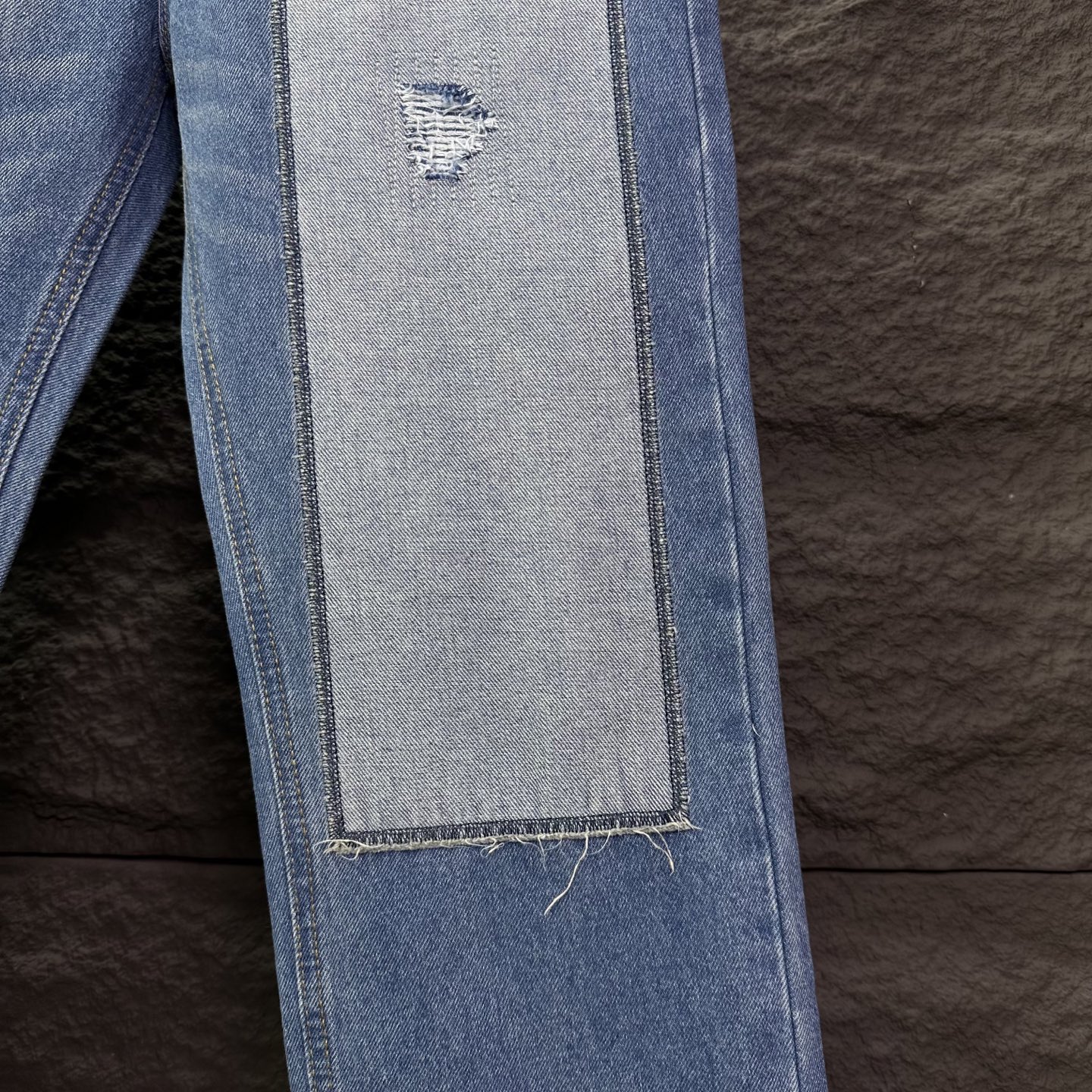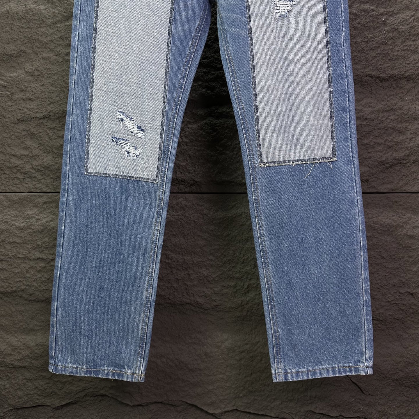 Details: New vintage distressed jeans with patchwork. Straight fit, versatile length, soft and textured fabric