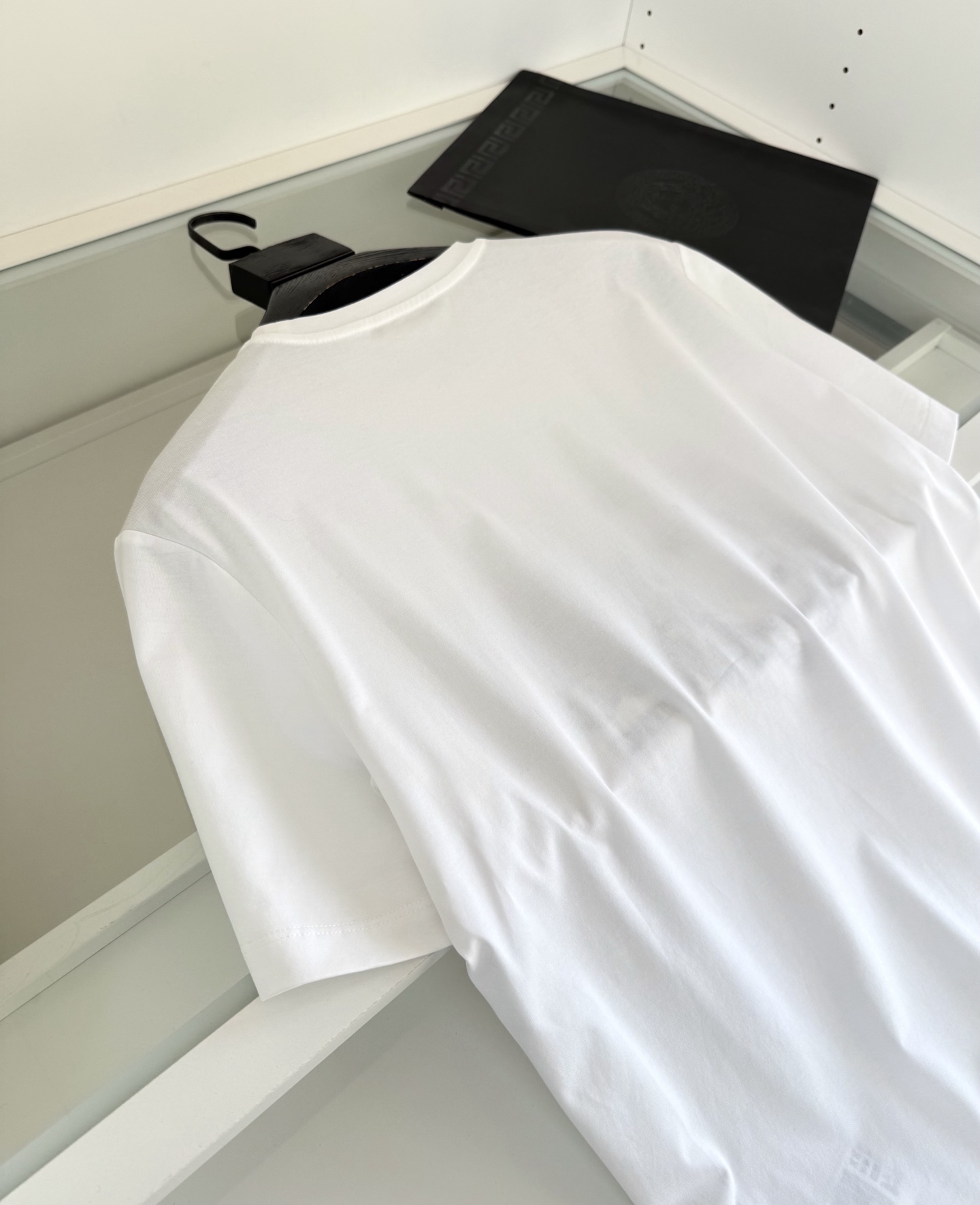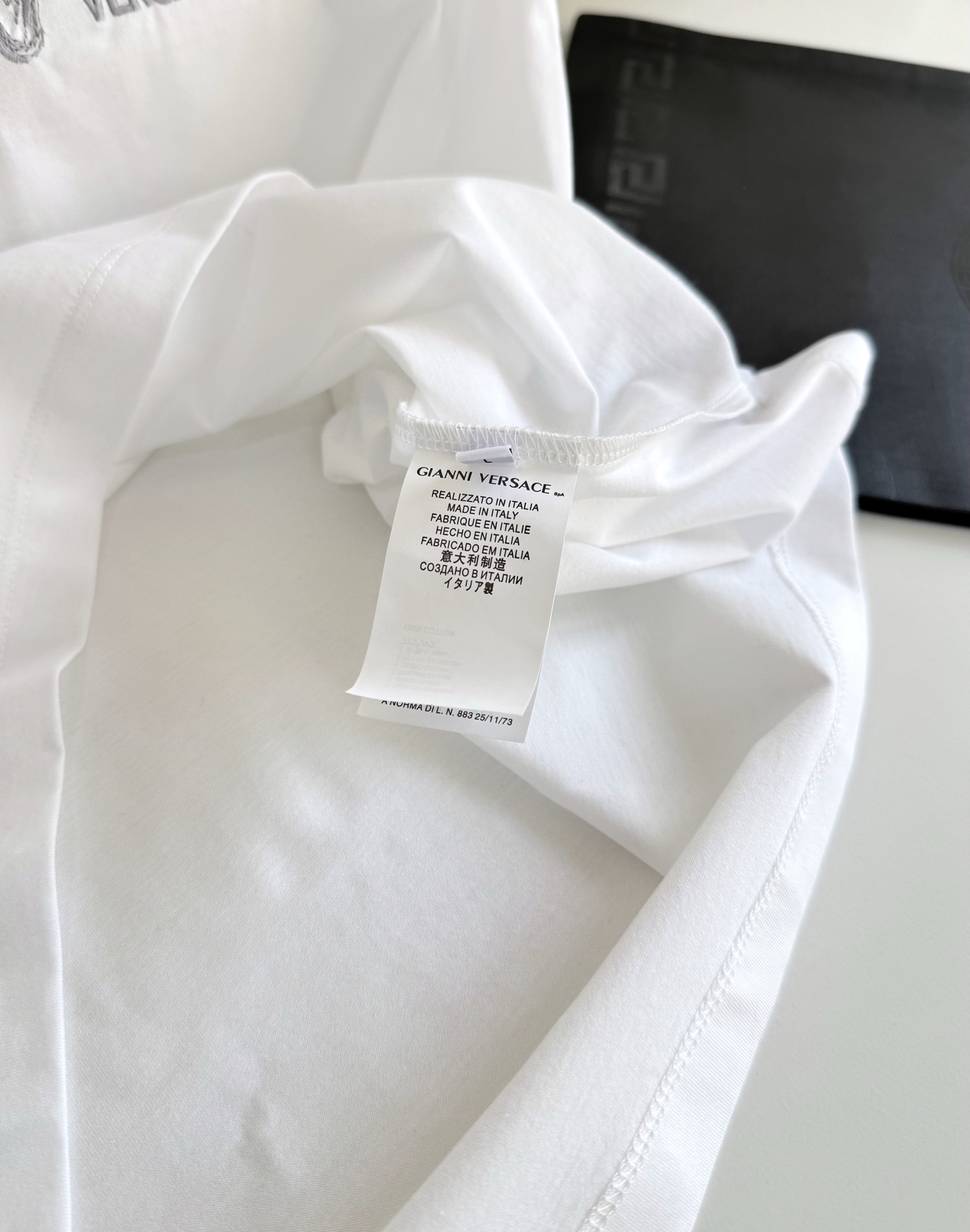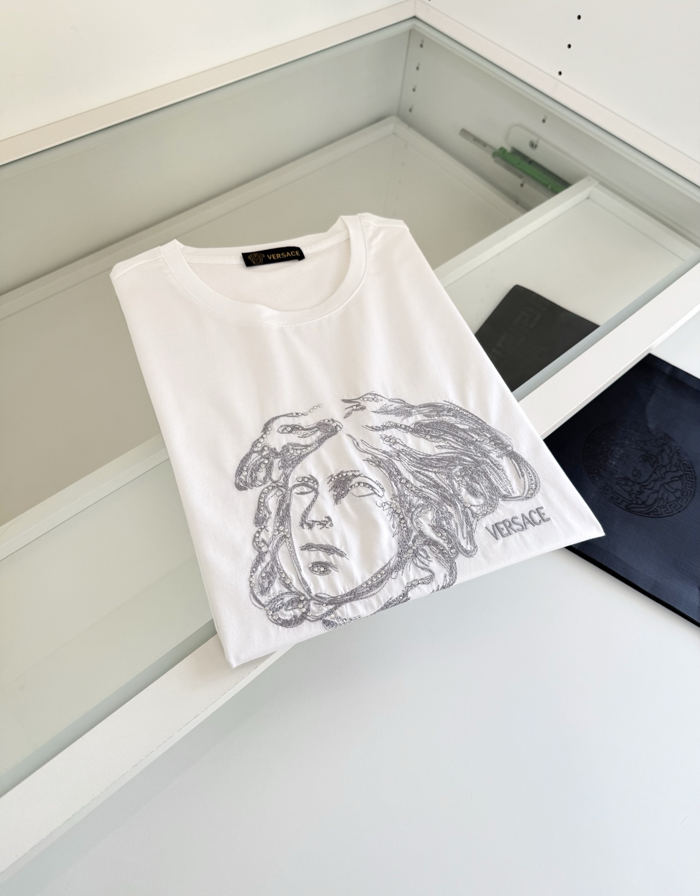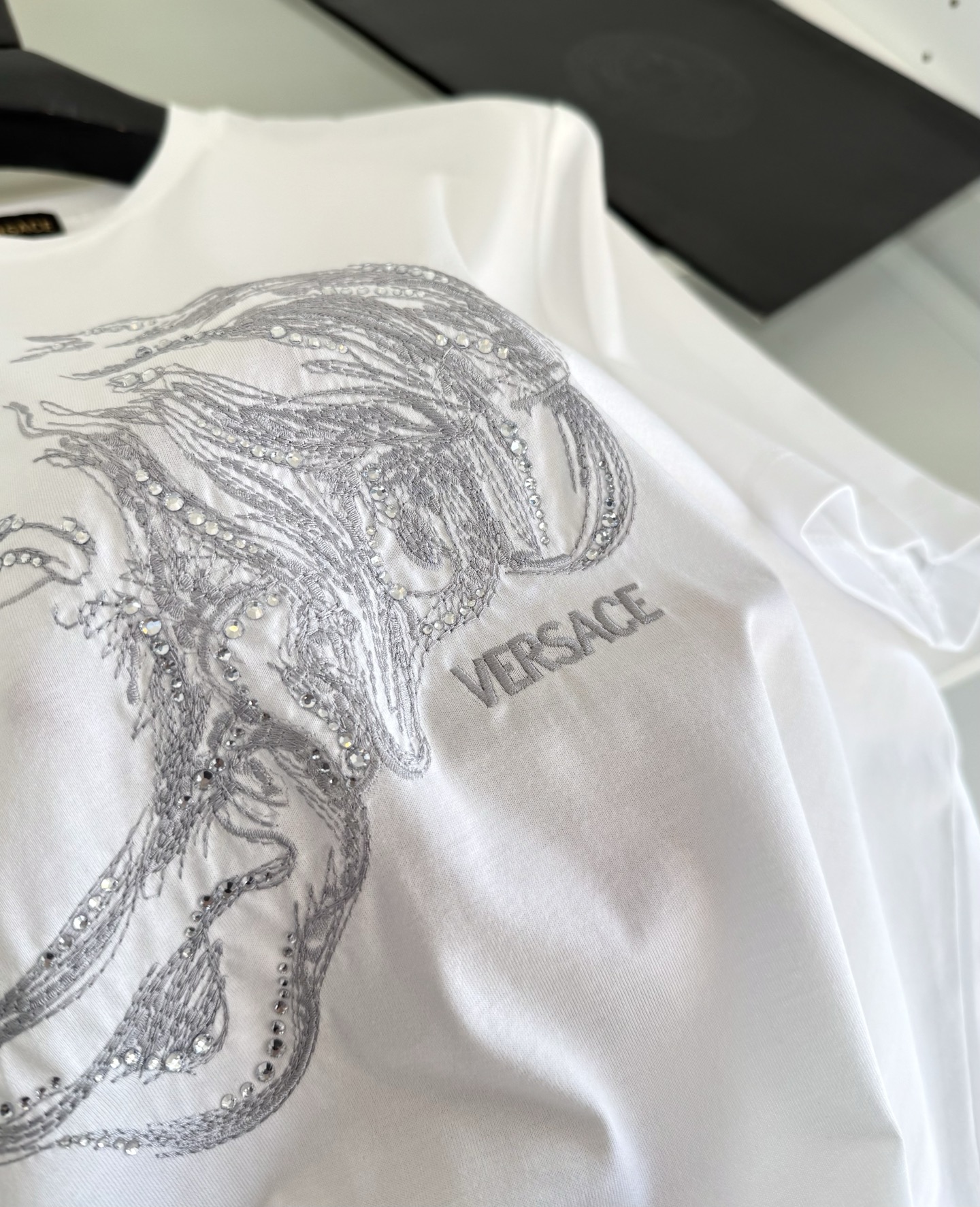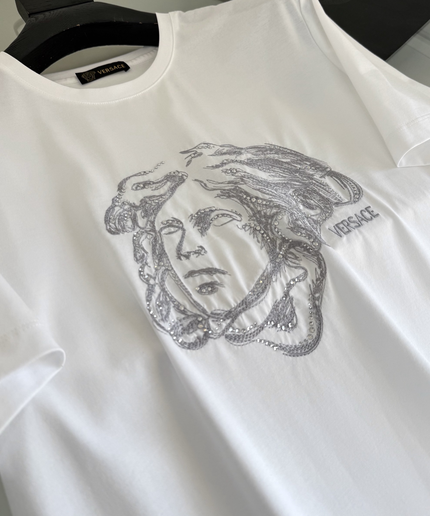 Details: Classic round-neck short-sleeved T-shirt with an embroidered design. It has high-density embroidery with rhinestones, made by an imported embroidery machine, showing fine craftsmanship. The silky cotton fabric is comfortable and breathable