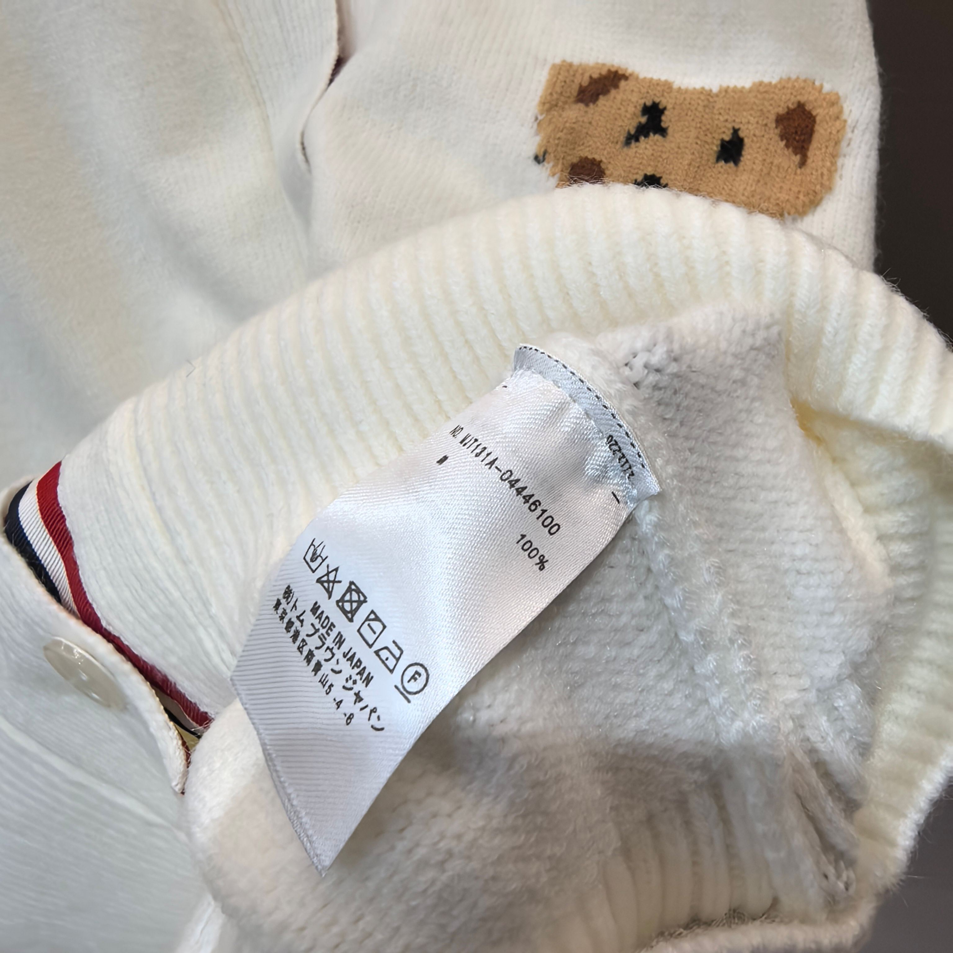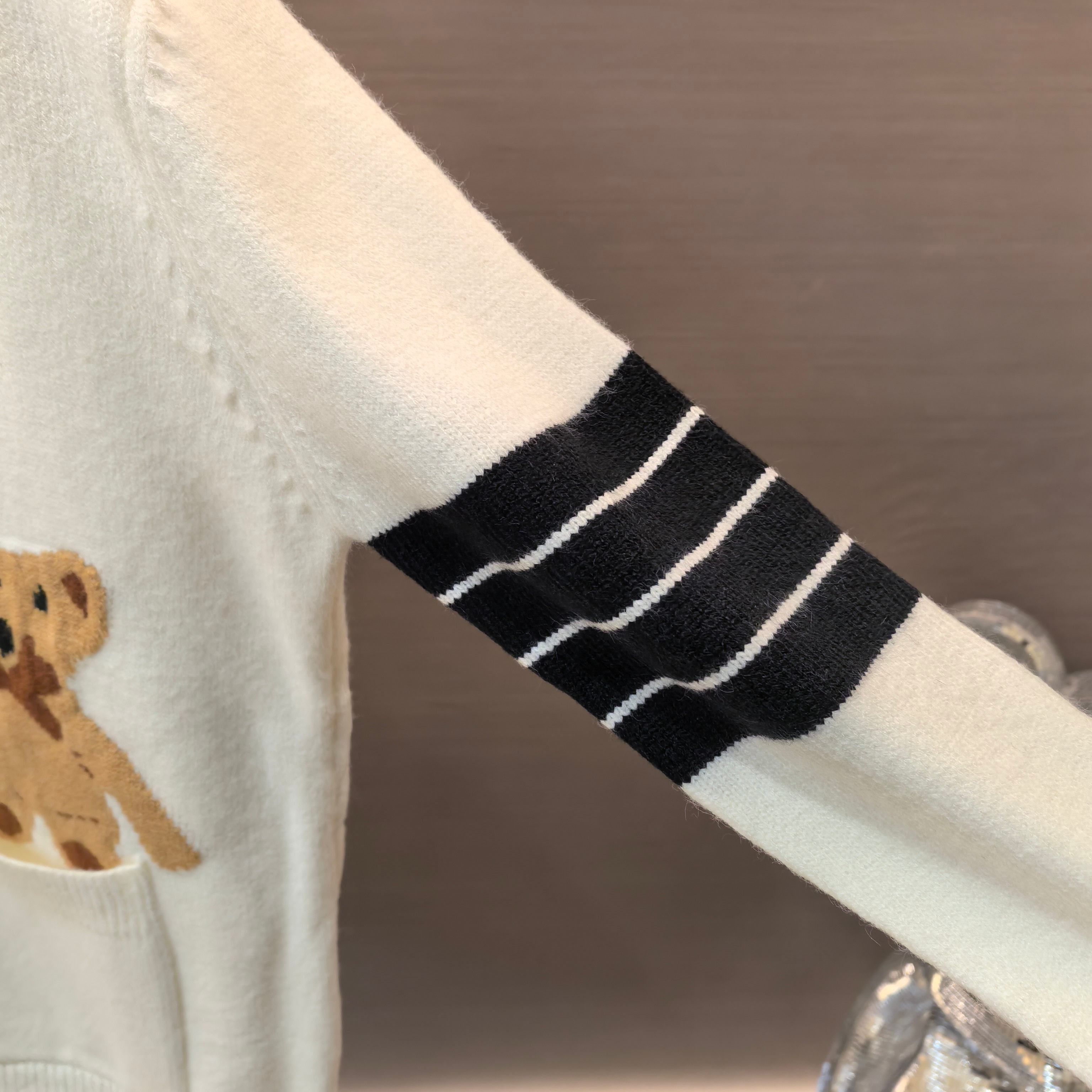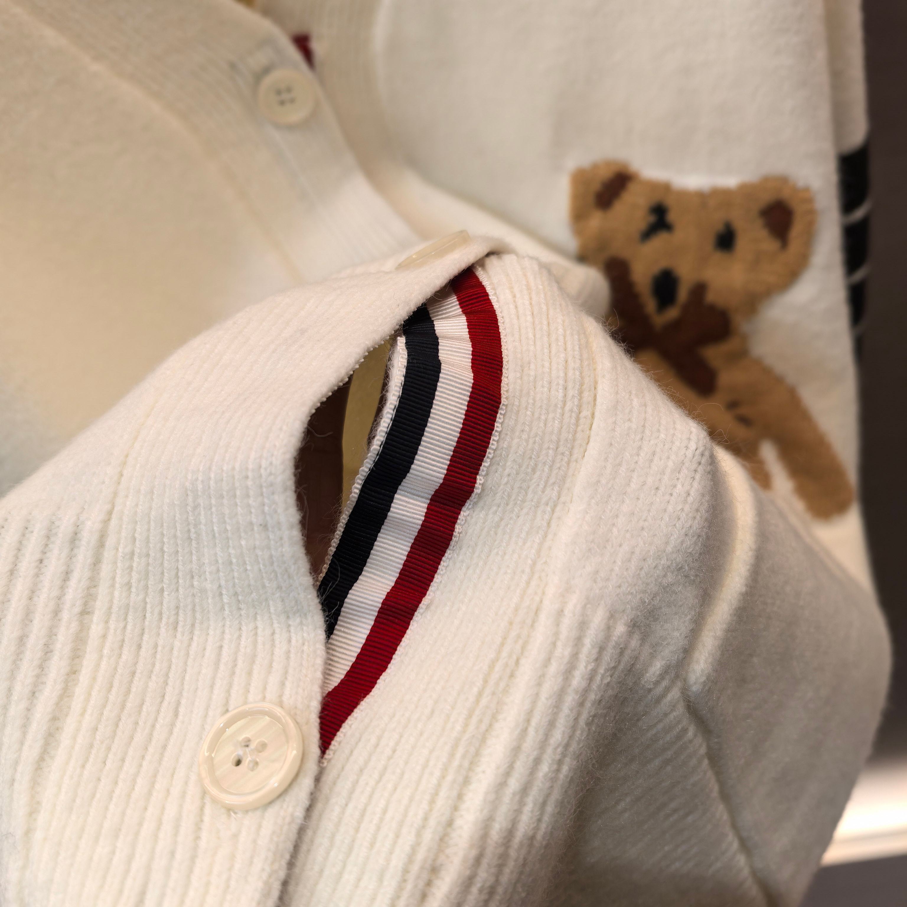 Details: Cartoon Bear Four-Stripe Alpaca Wool Cardigan, Oversized Fit, Available in White and Gray, with Mother-of-Pearl Buttons