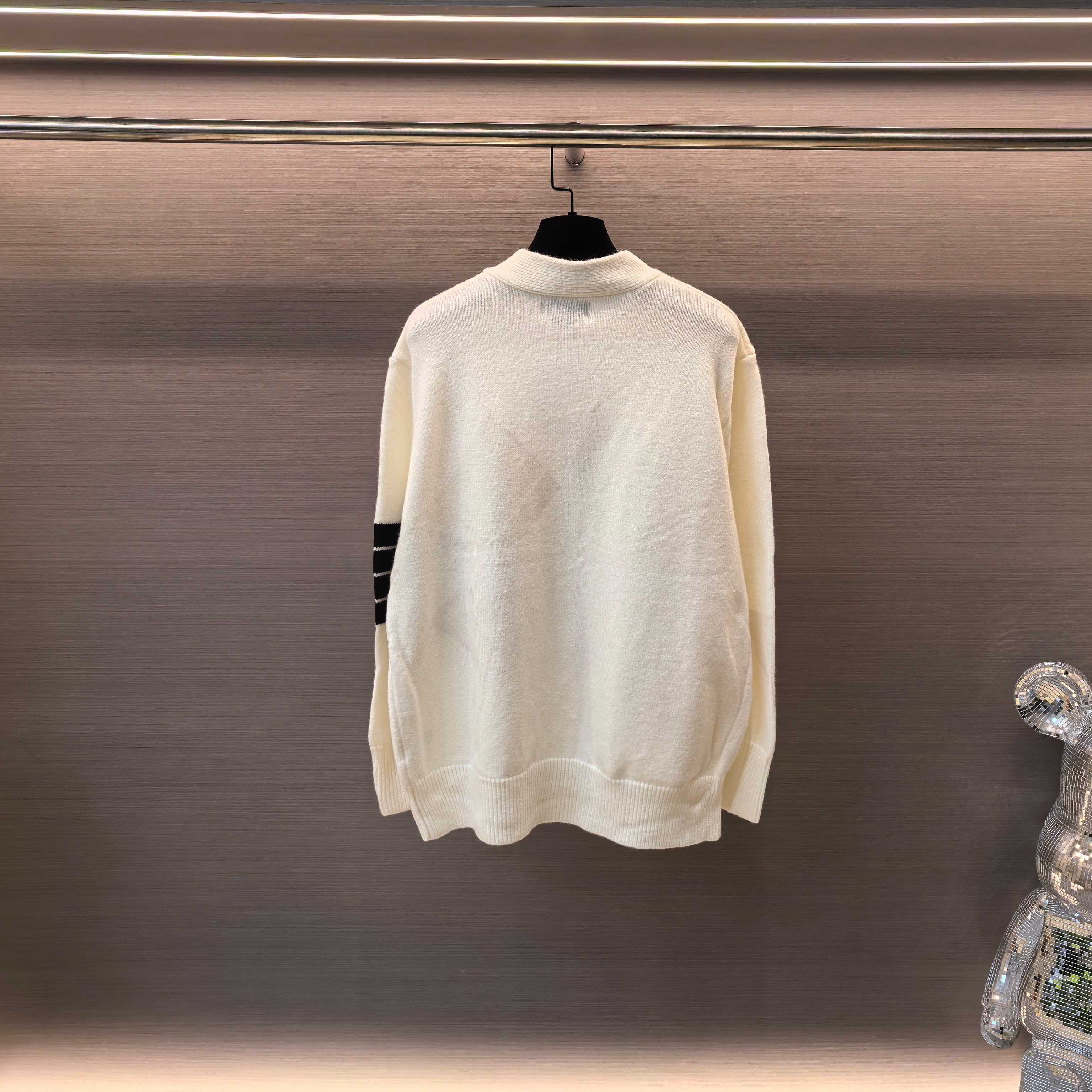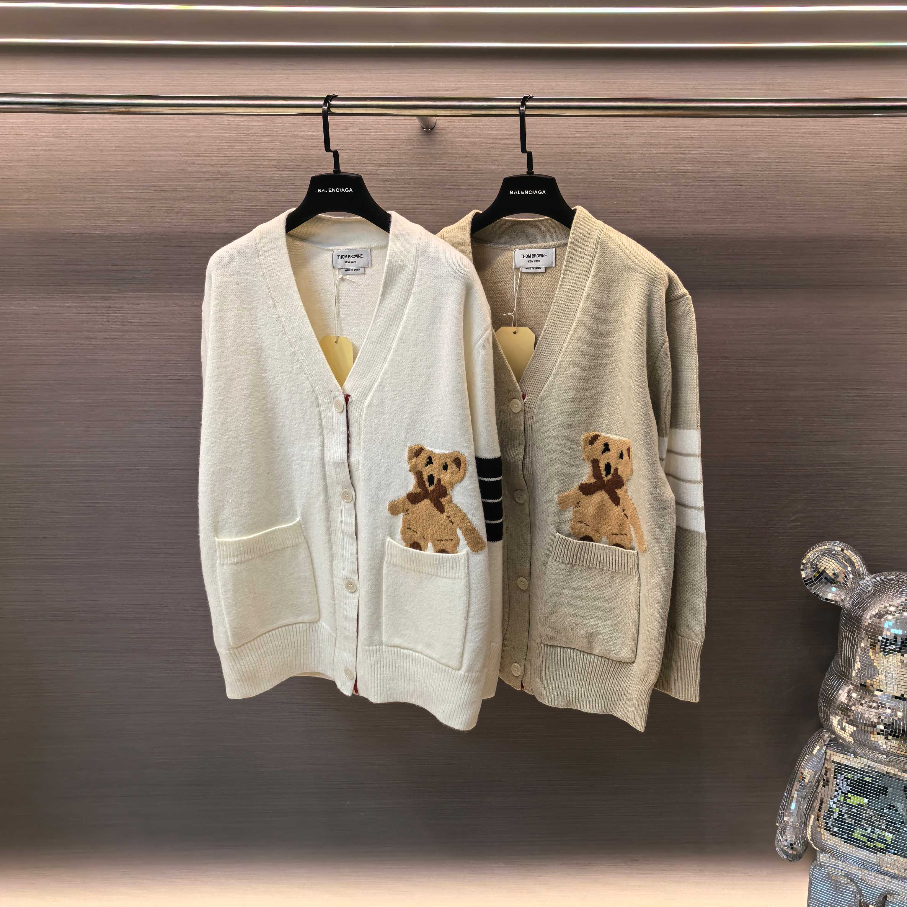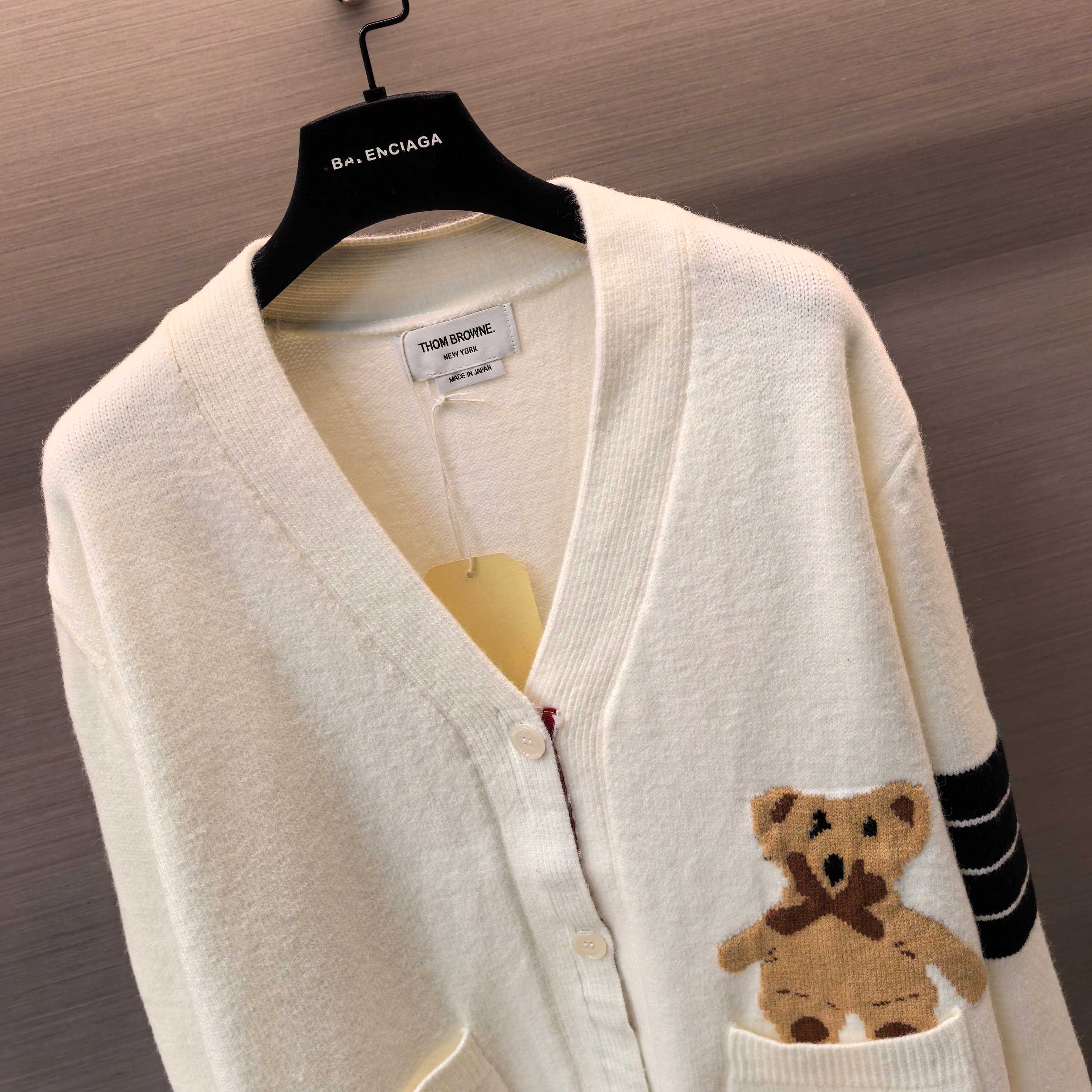 Details: Cartoon Bear Four-Stripe Alpaca Wool Cardigan, Oversized Fit, Available in White and Gray, with Mother-of-Pearl Buttons