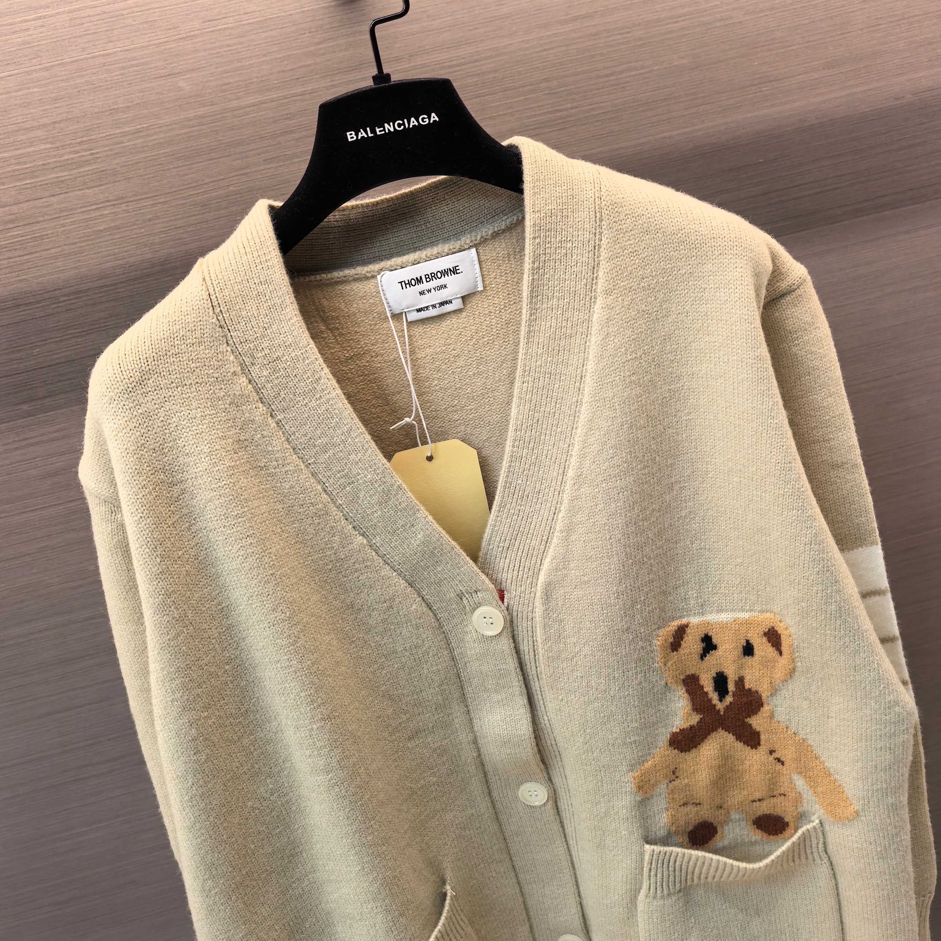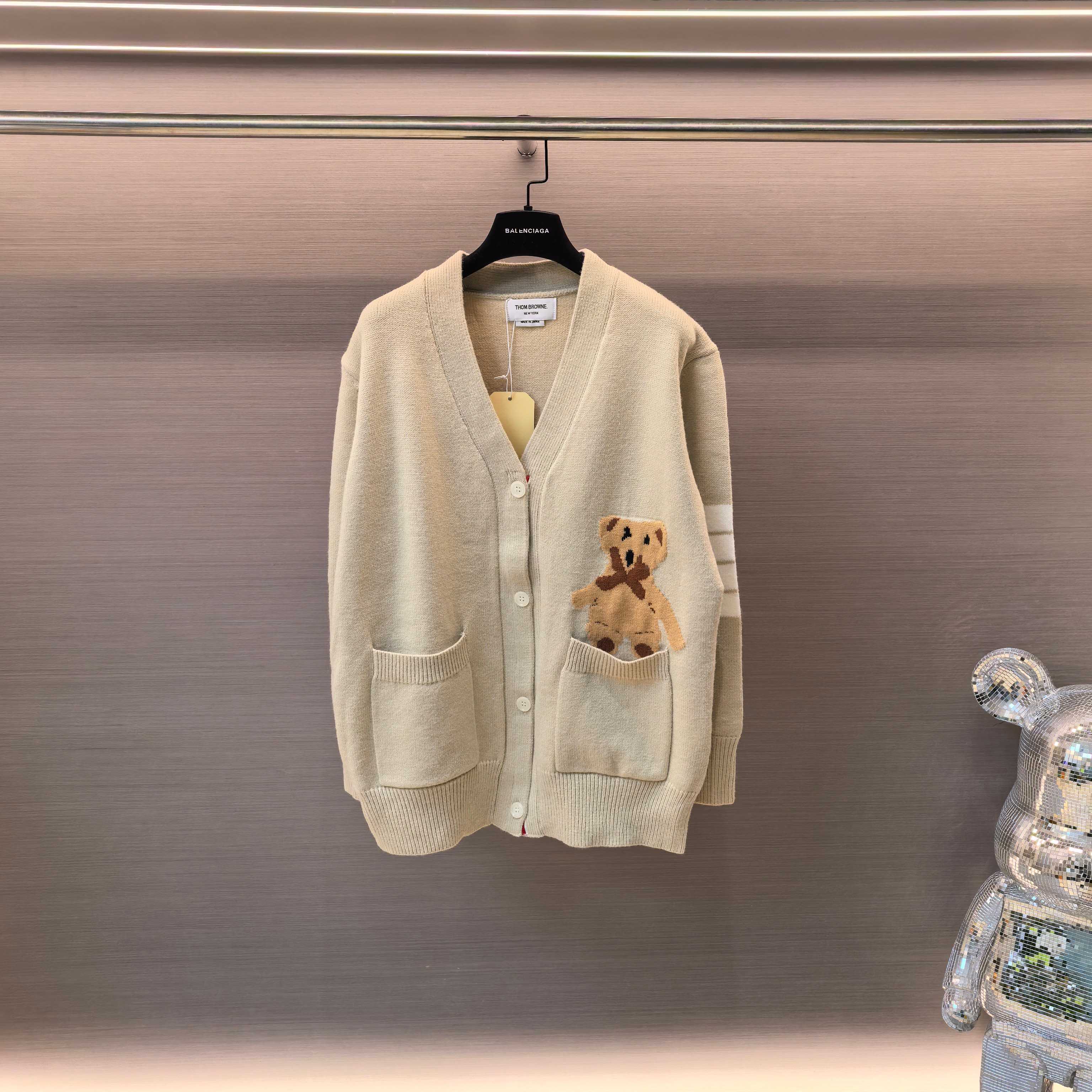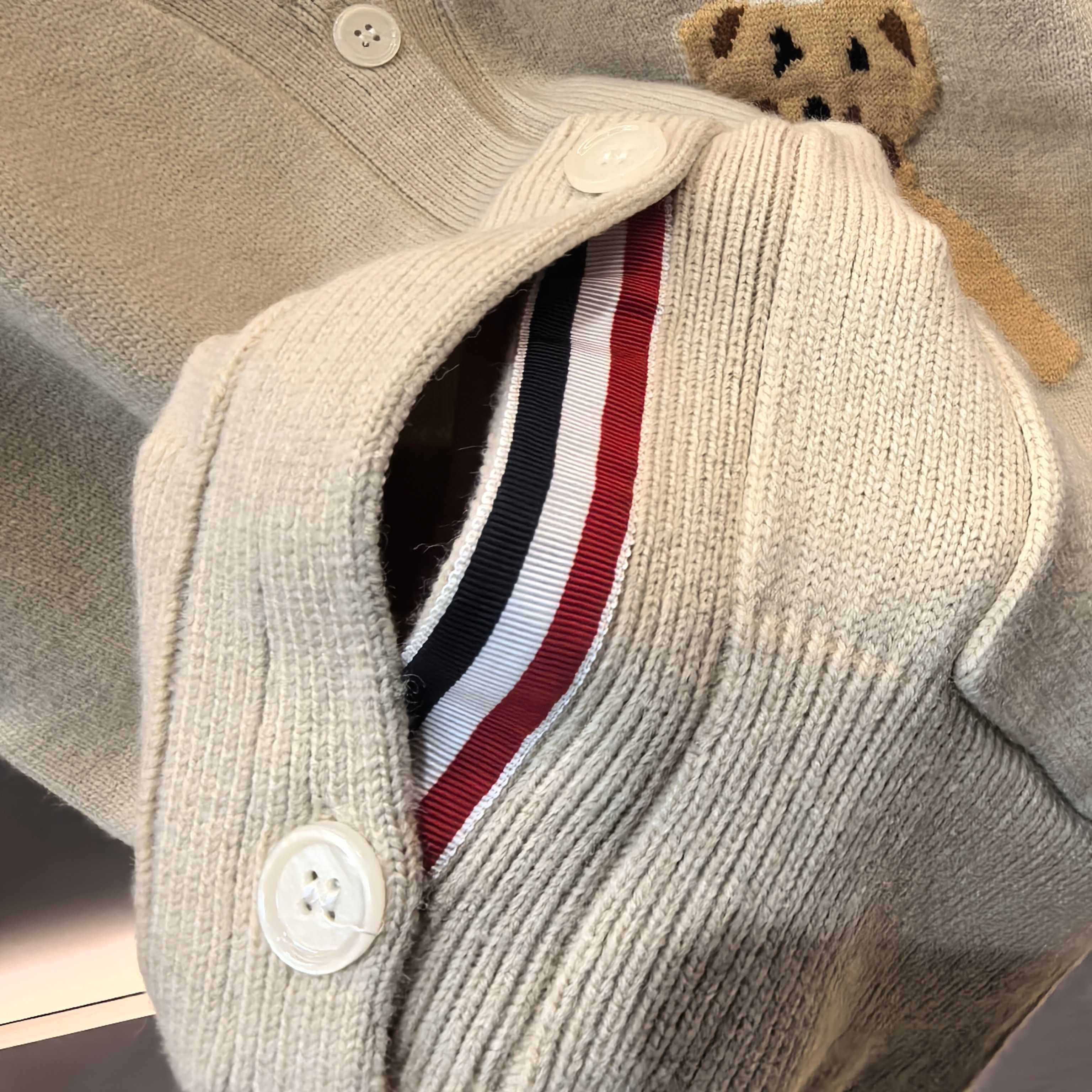 Details: Cartoon Bear Four-Stripe Alpaca Wool Cardigan, Oversized Fit, Available in White and Gray, with Mother-of-Pearl Buttons