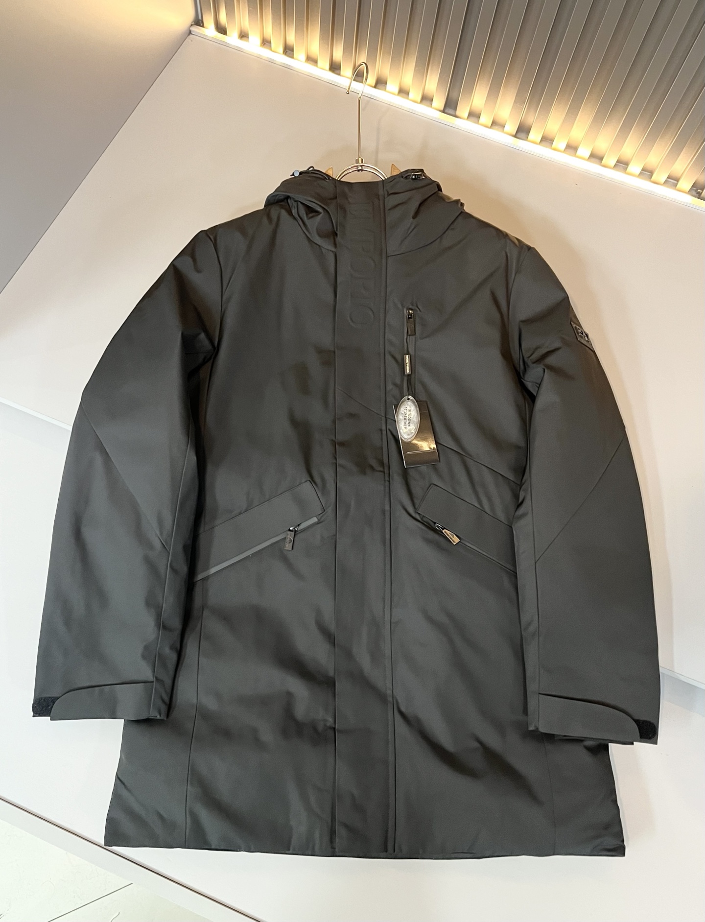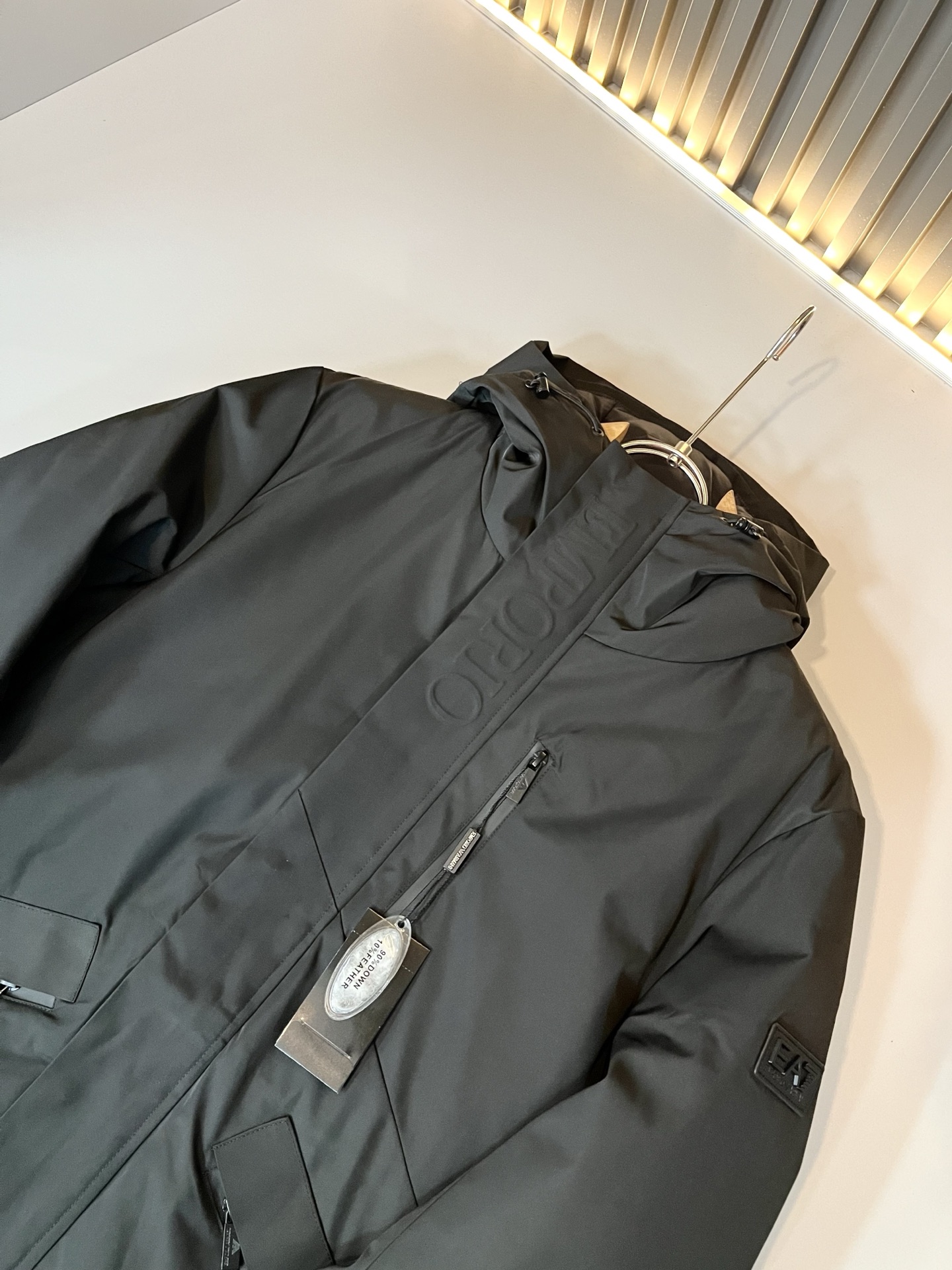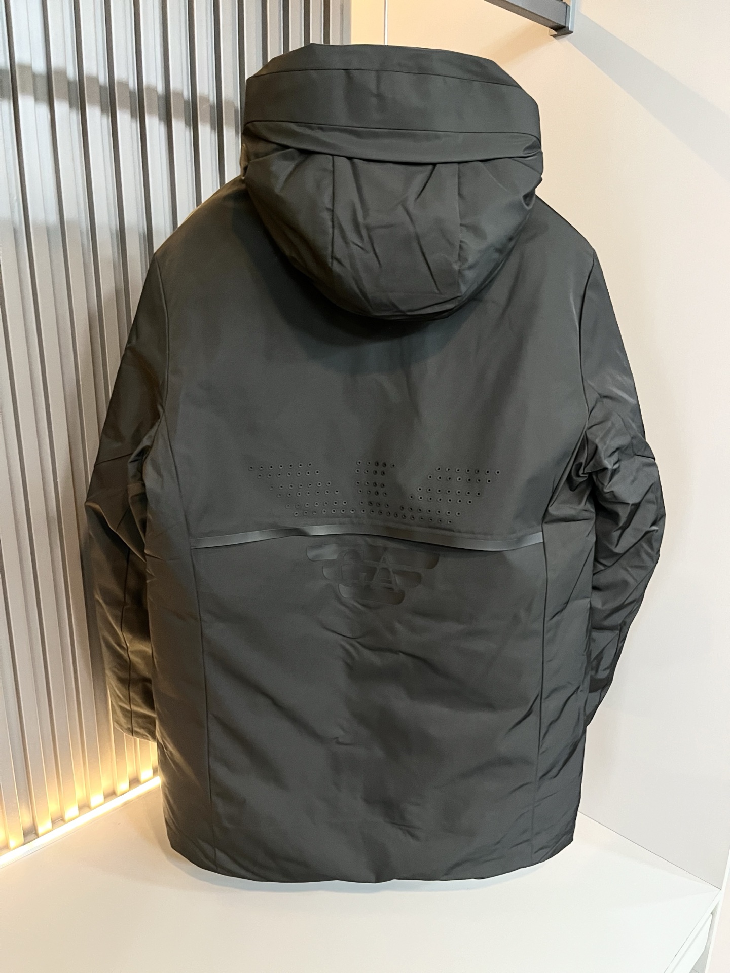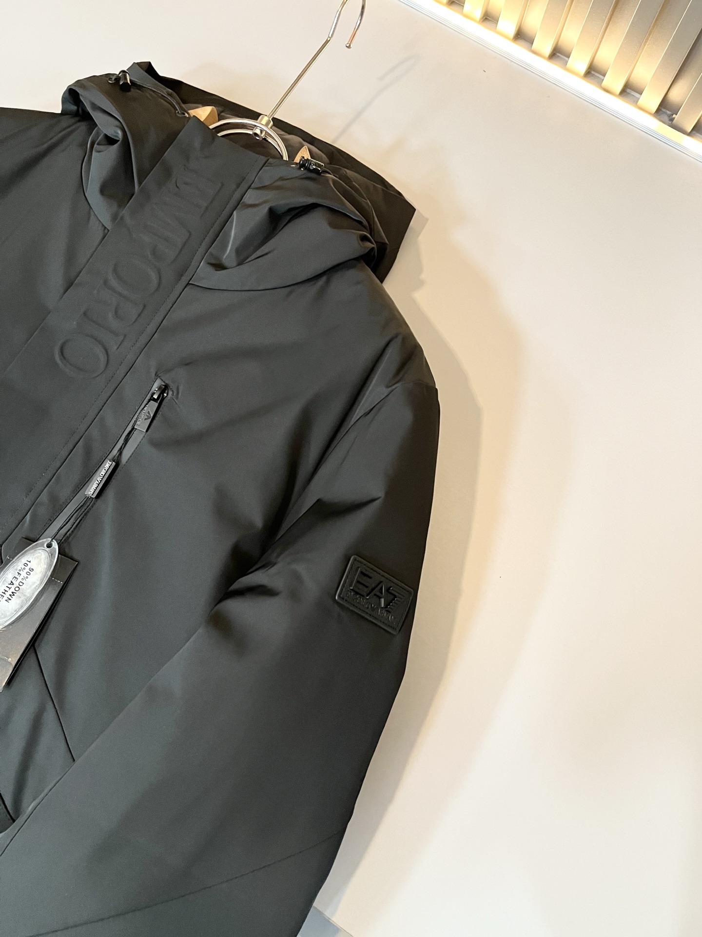 Details: New down jacket with a logo, constructed of tech fabric and filled with white duck down