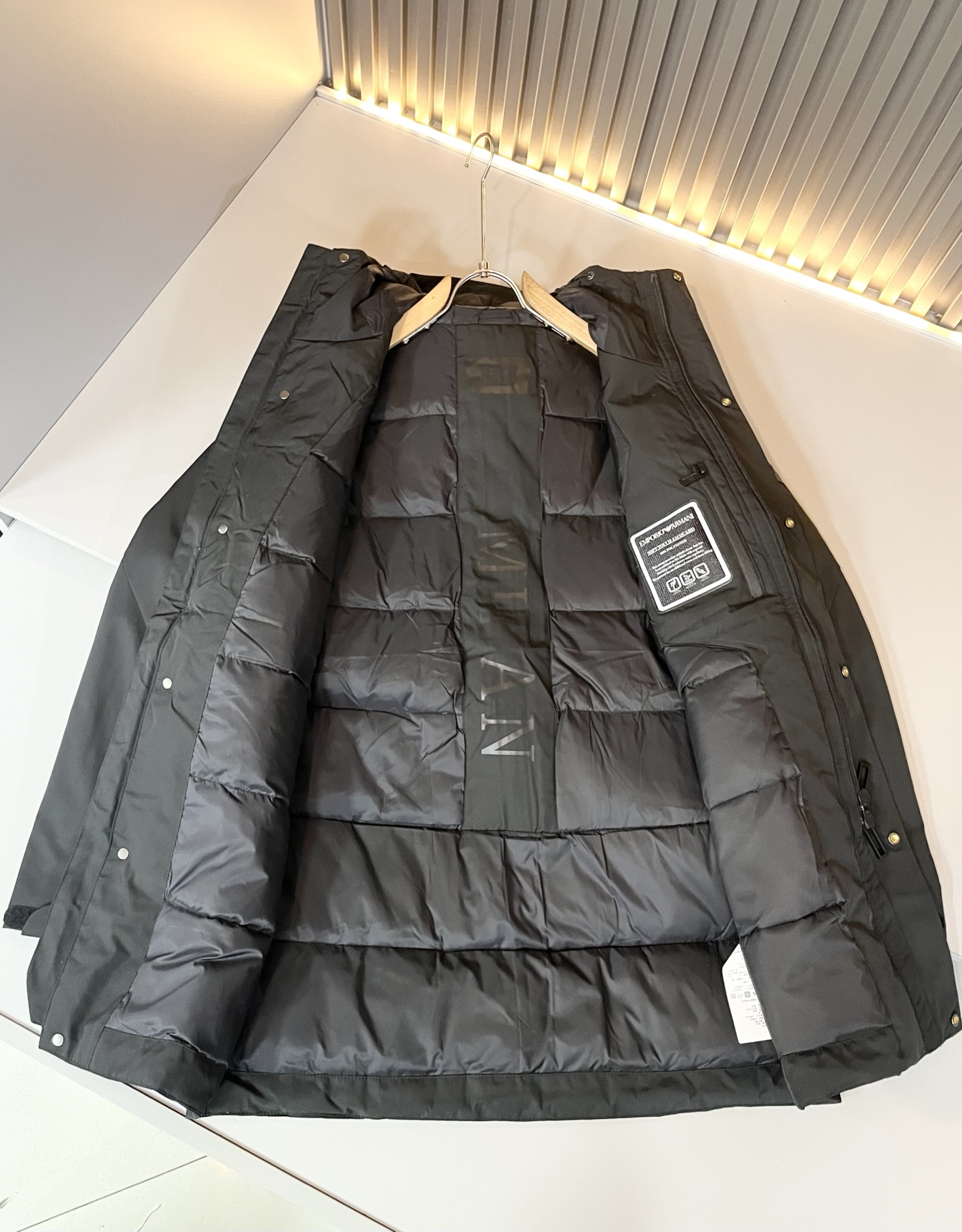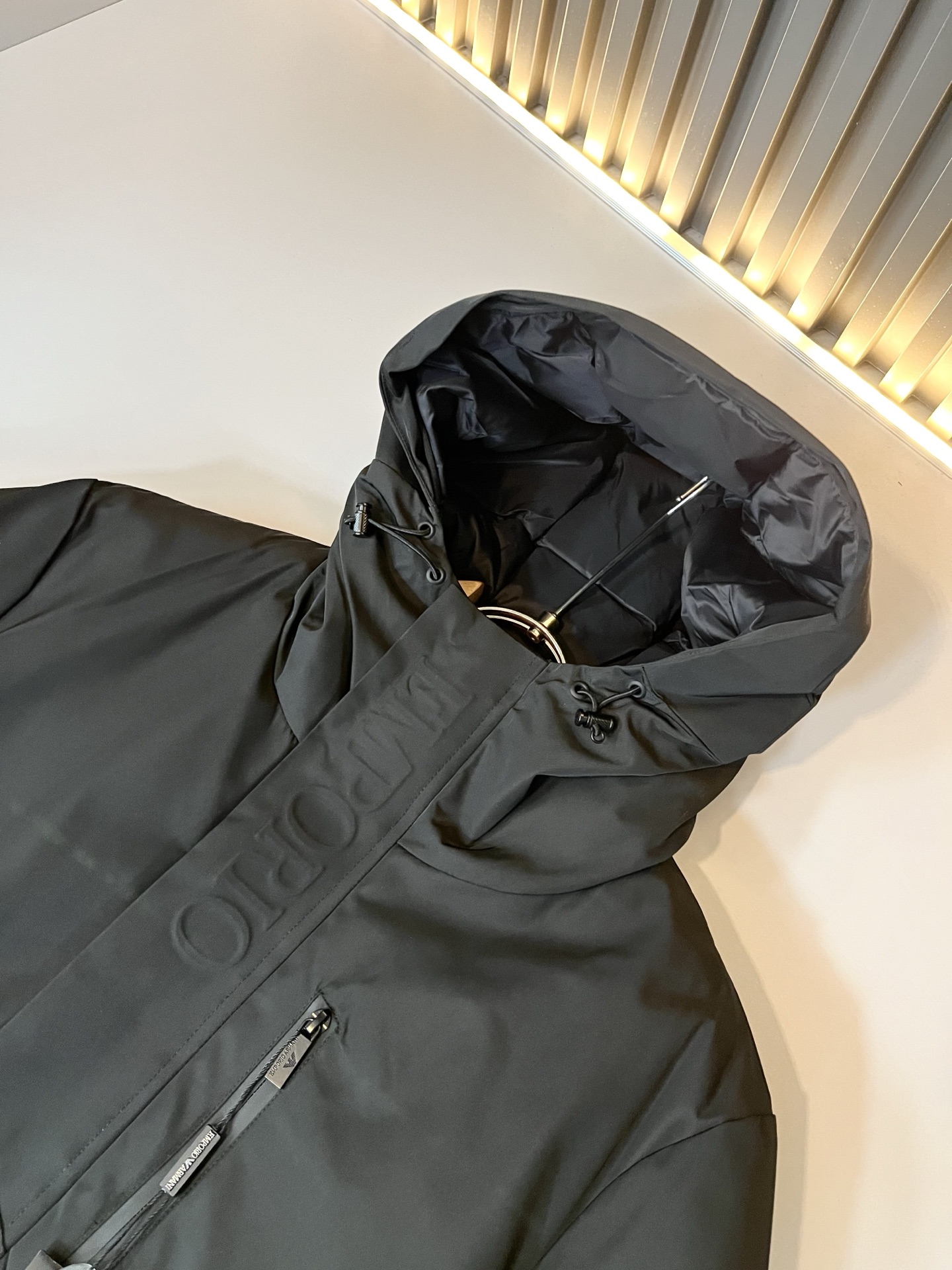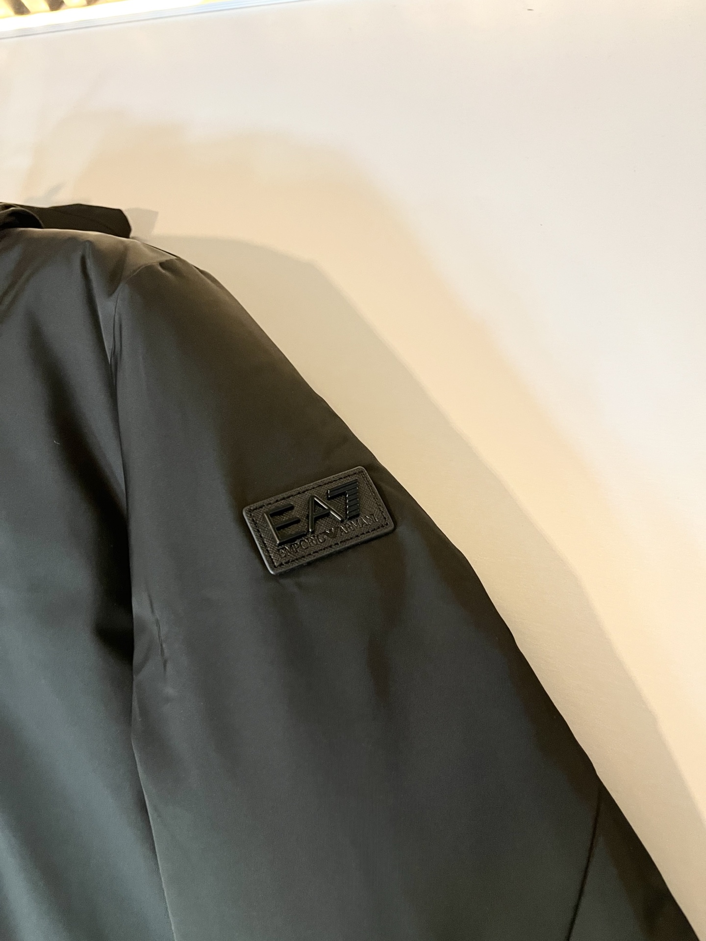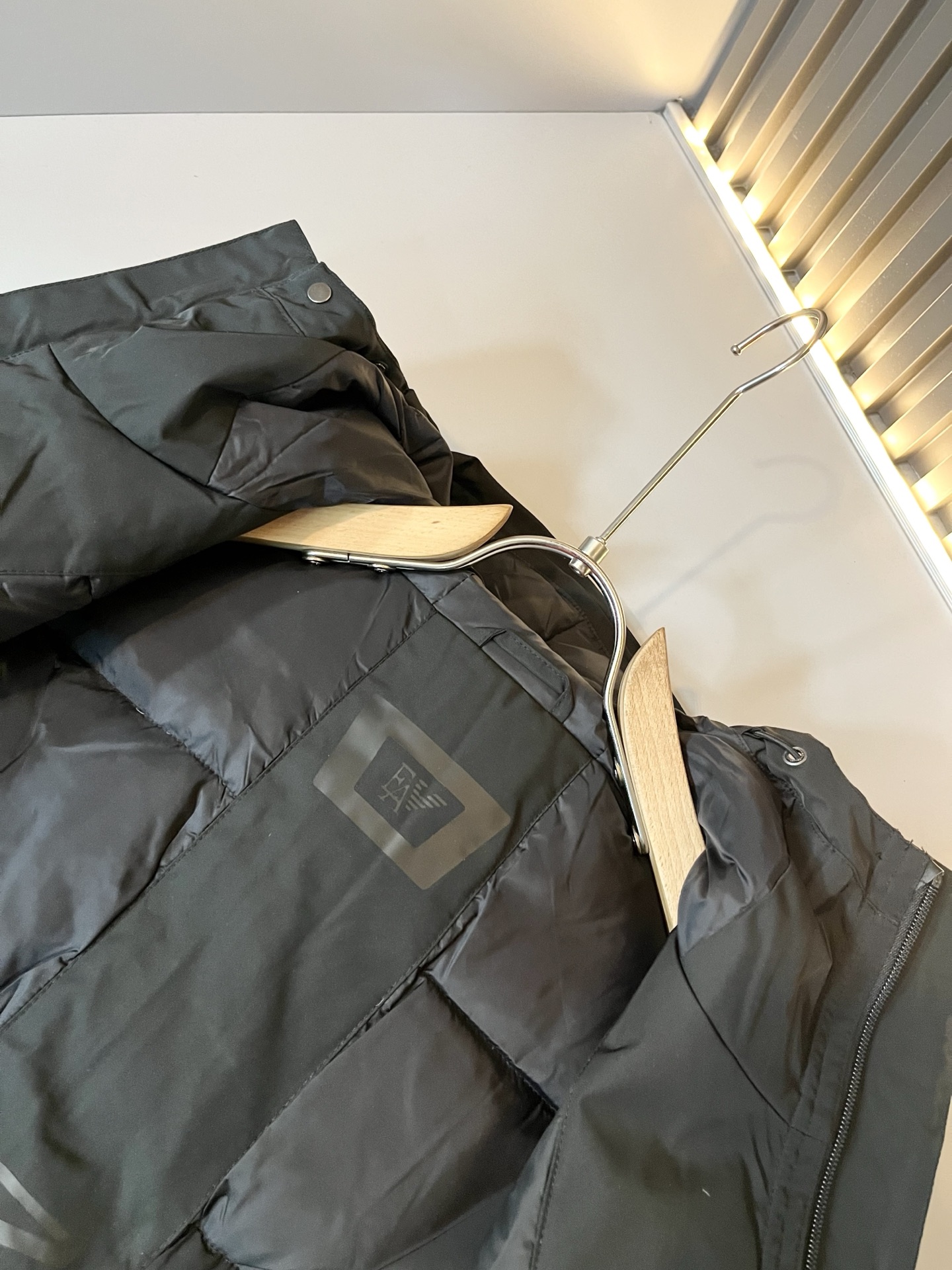 Details: New down jacket with a logo, constructed of tech fabric and filled with white duck down