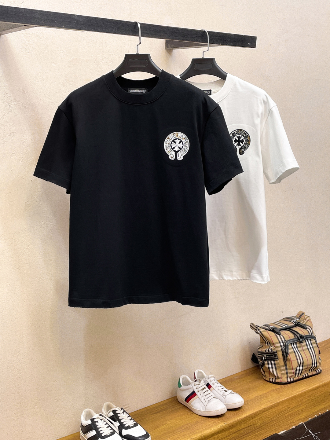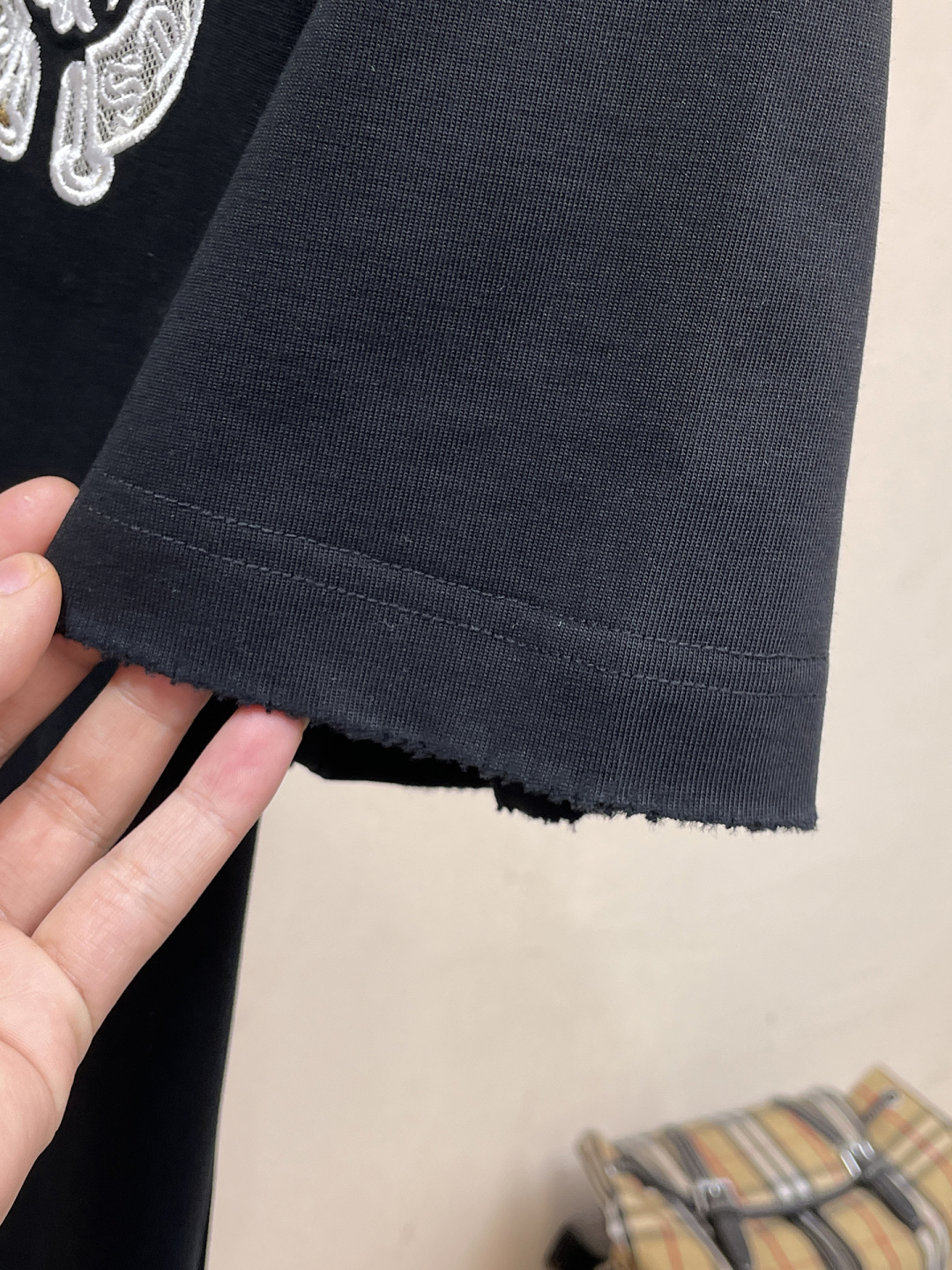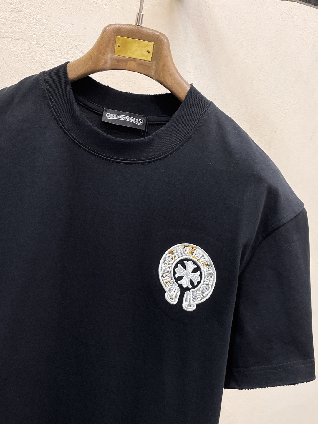 Details: Crew-neck short-sleeve T-shirt with embroidery and frayed edges, made of cotton fabric