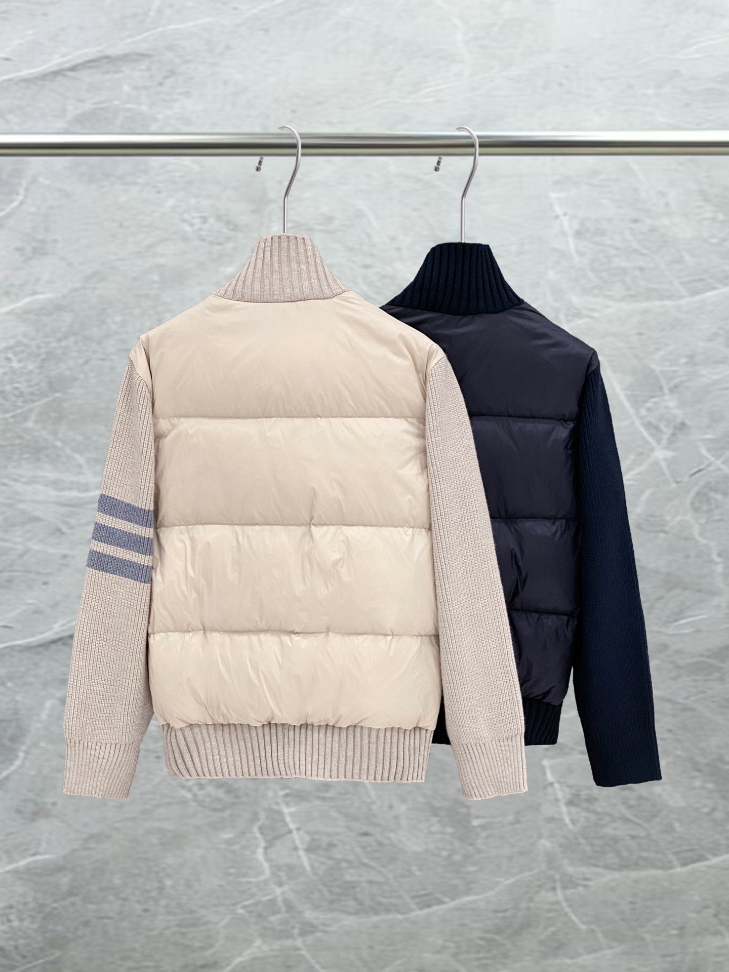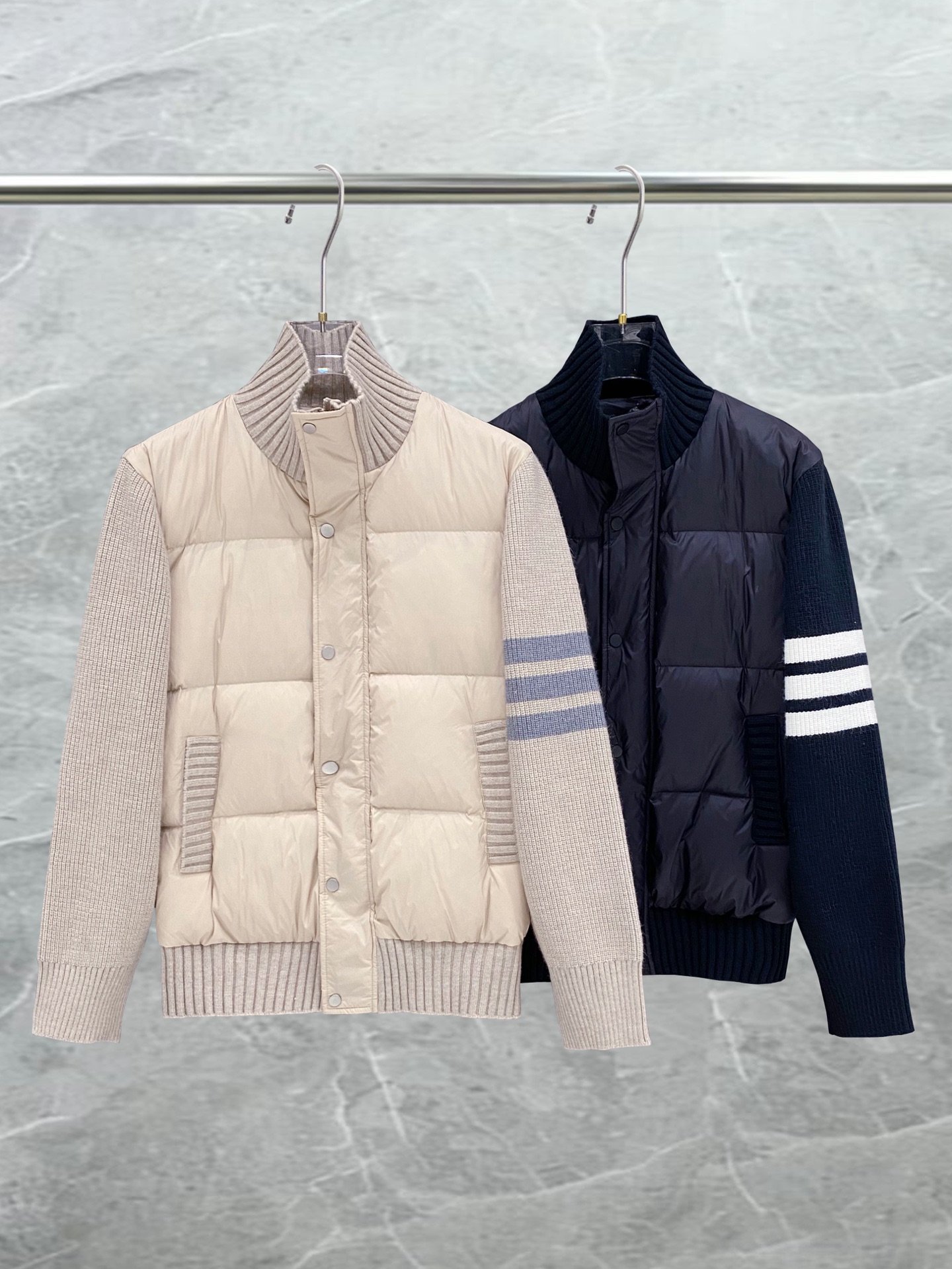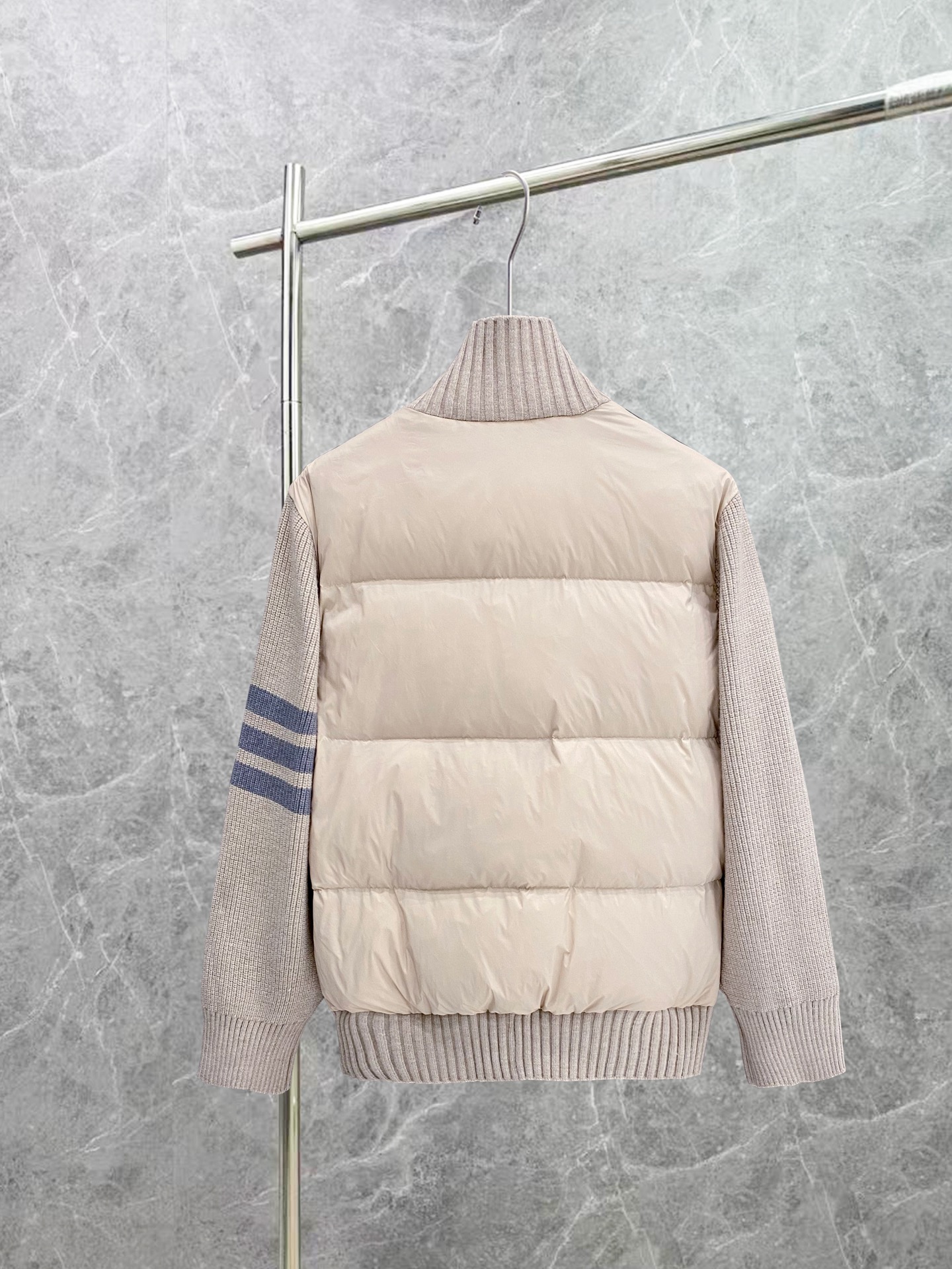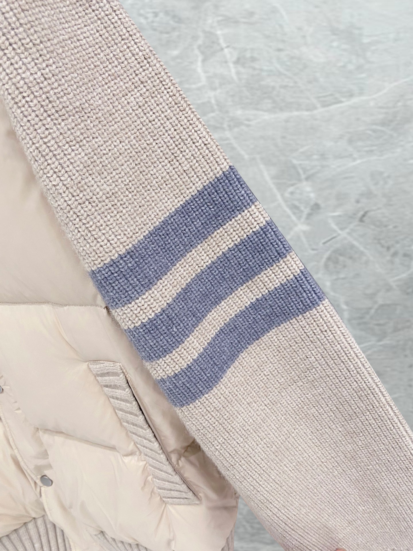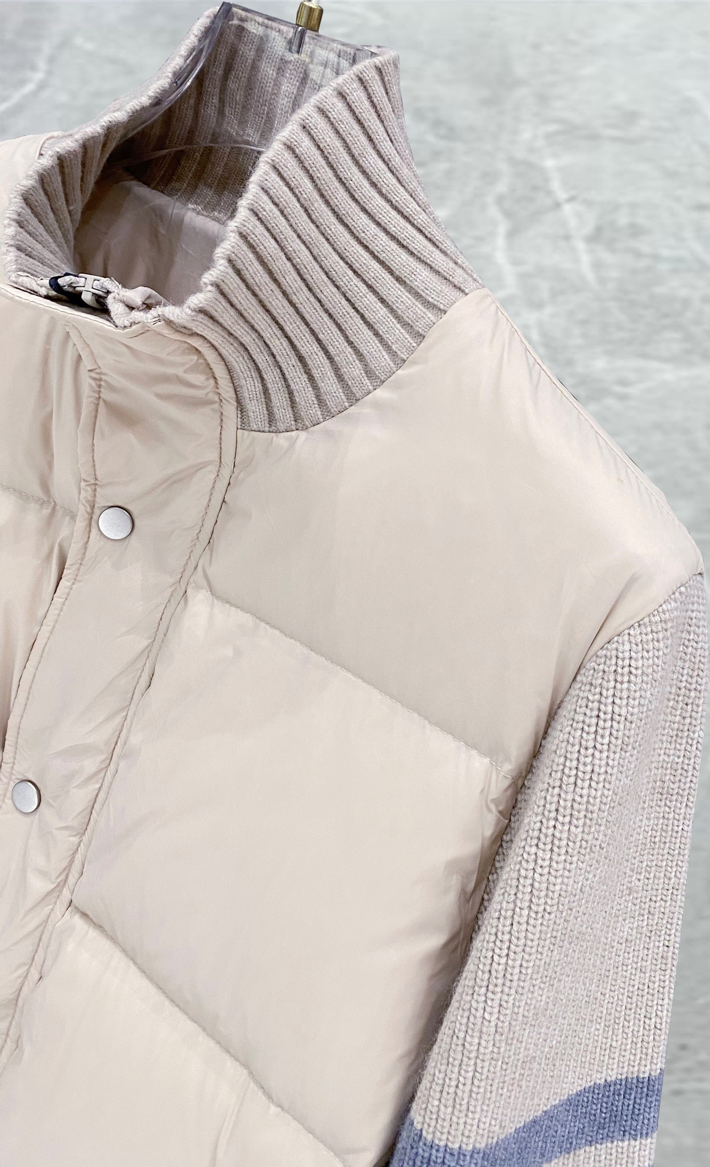 Details: Knitted - sleeved hooded down jacket with horizontal quilting, a slim fit, filled with new - standard white duck down, and a lightweight waterproof outer fabric.