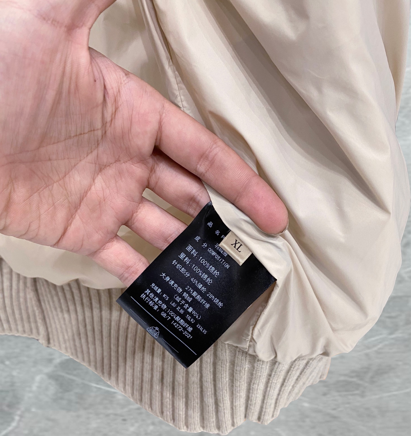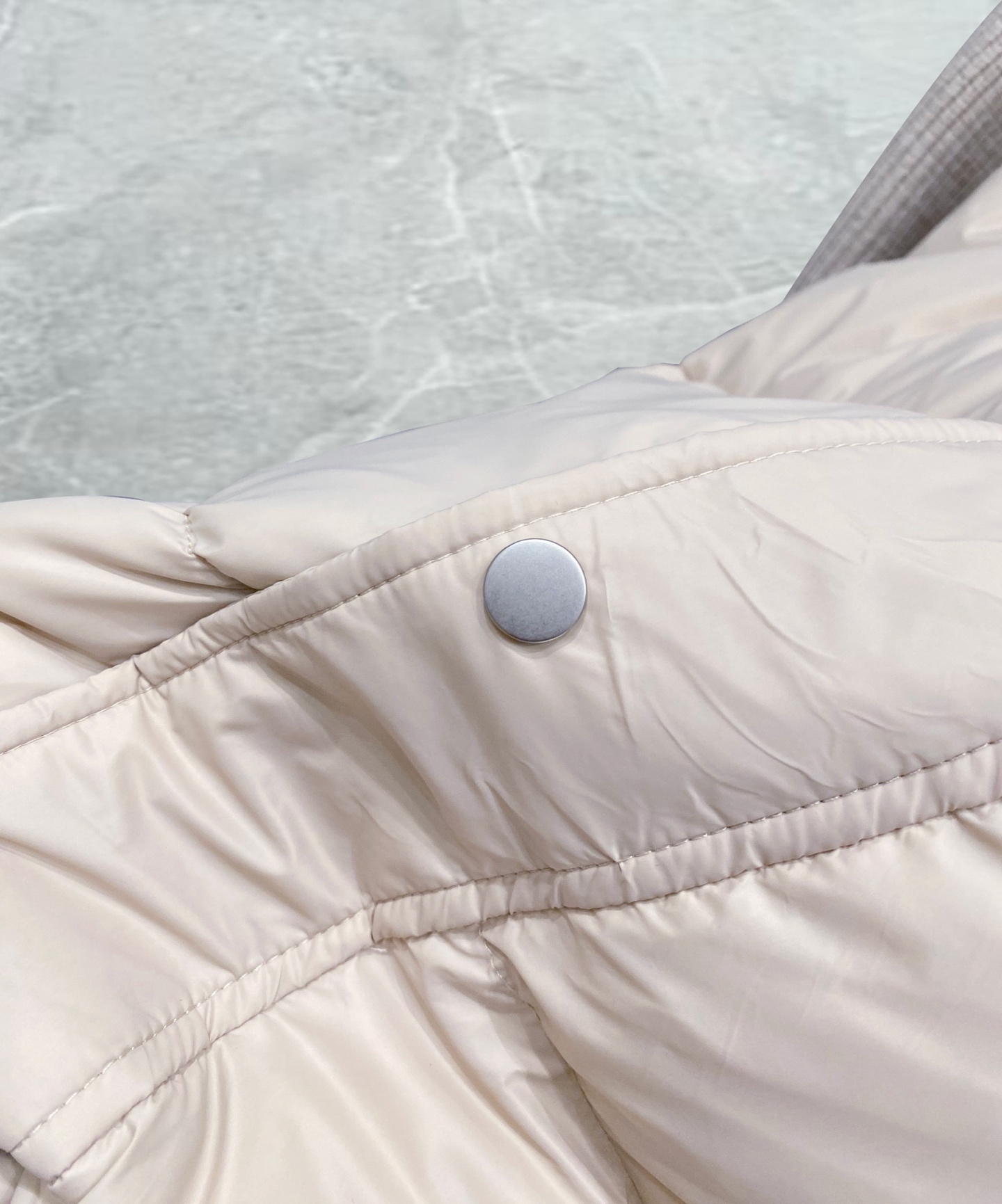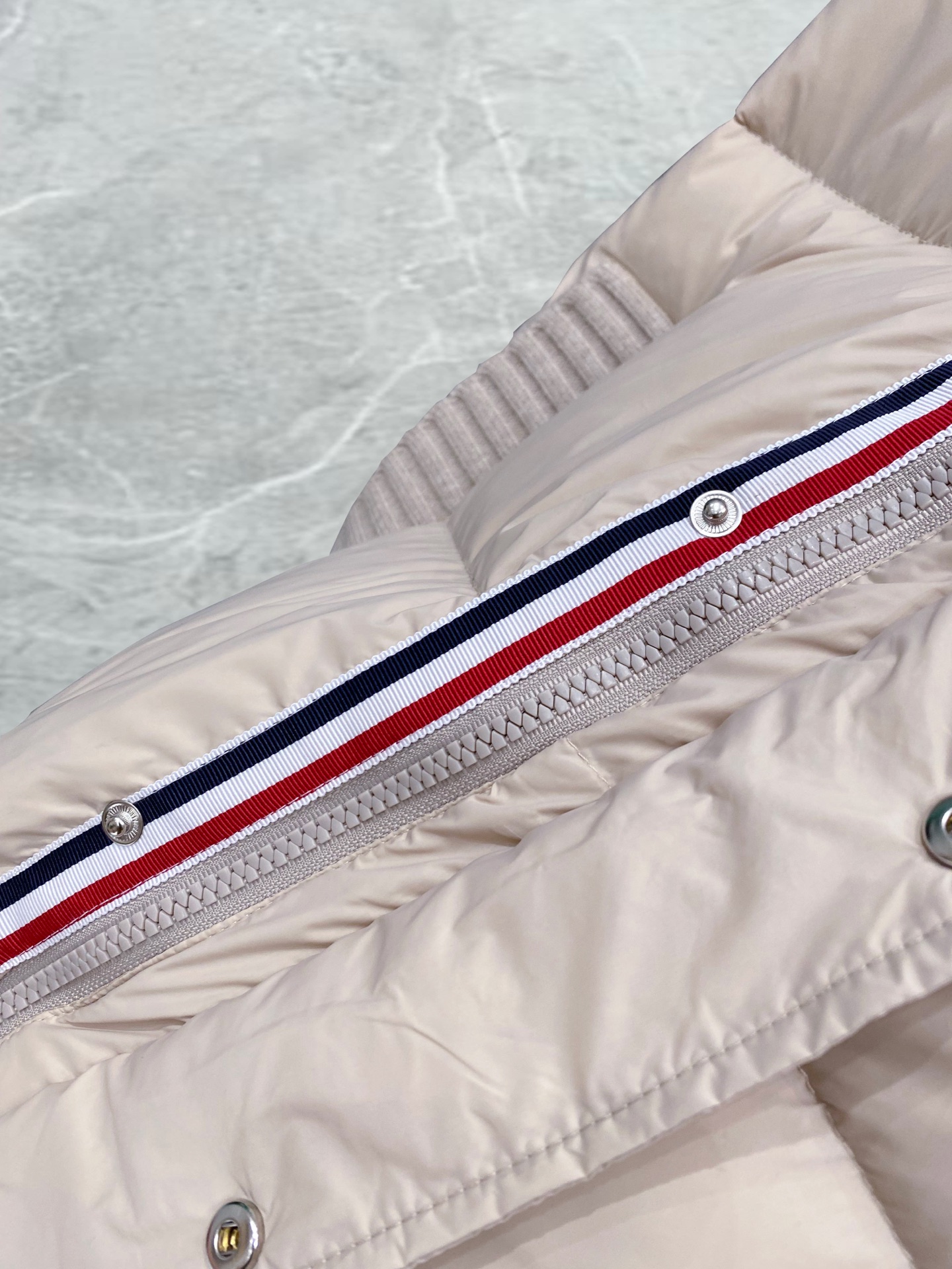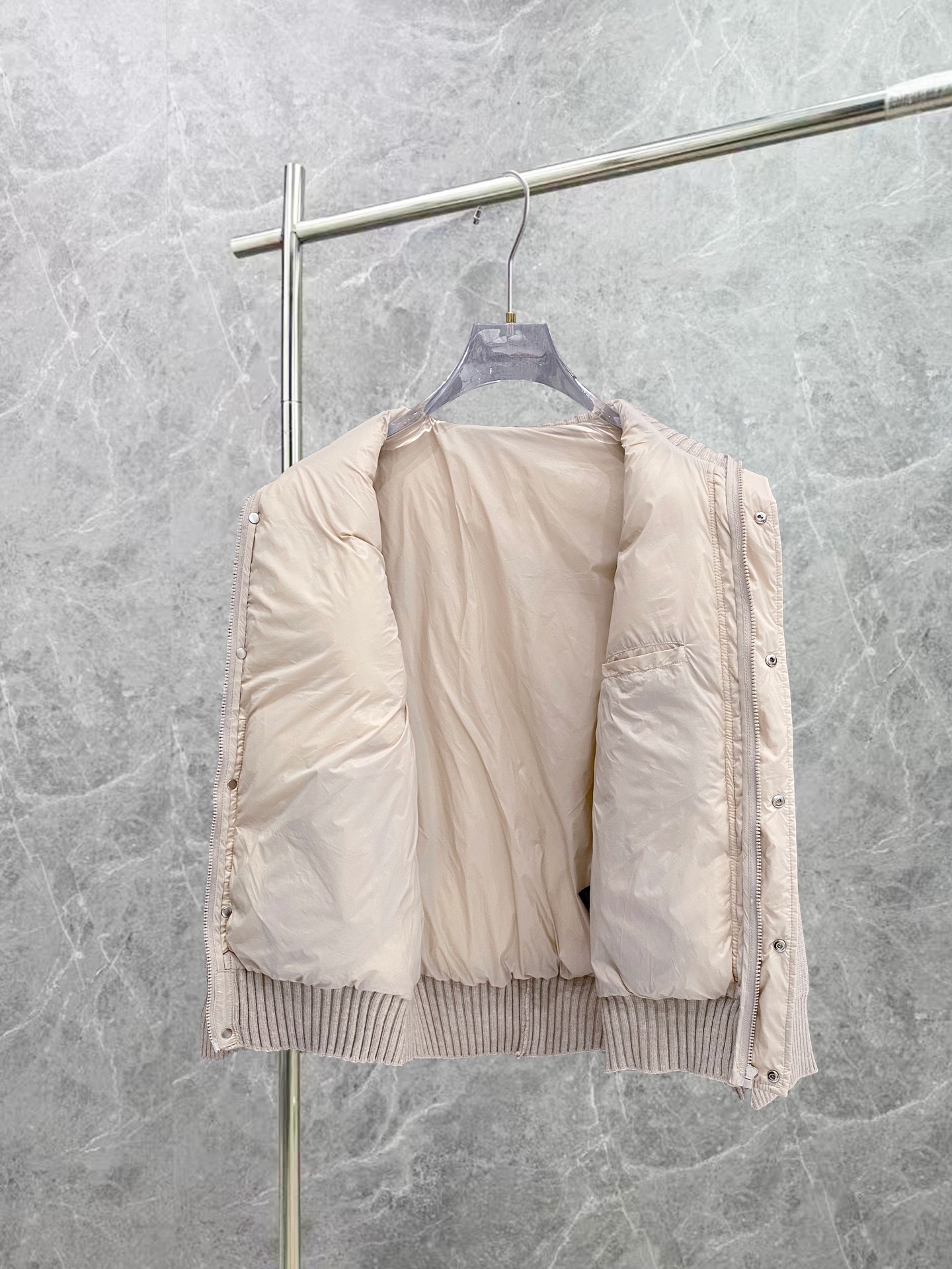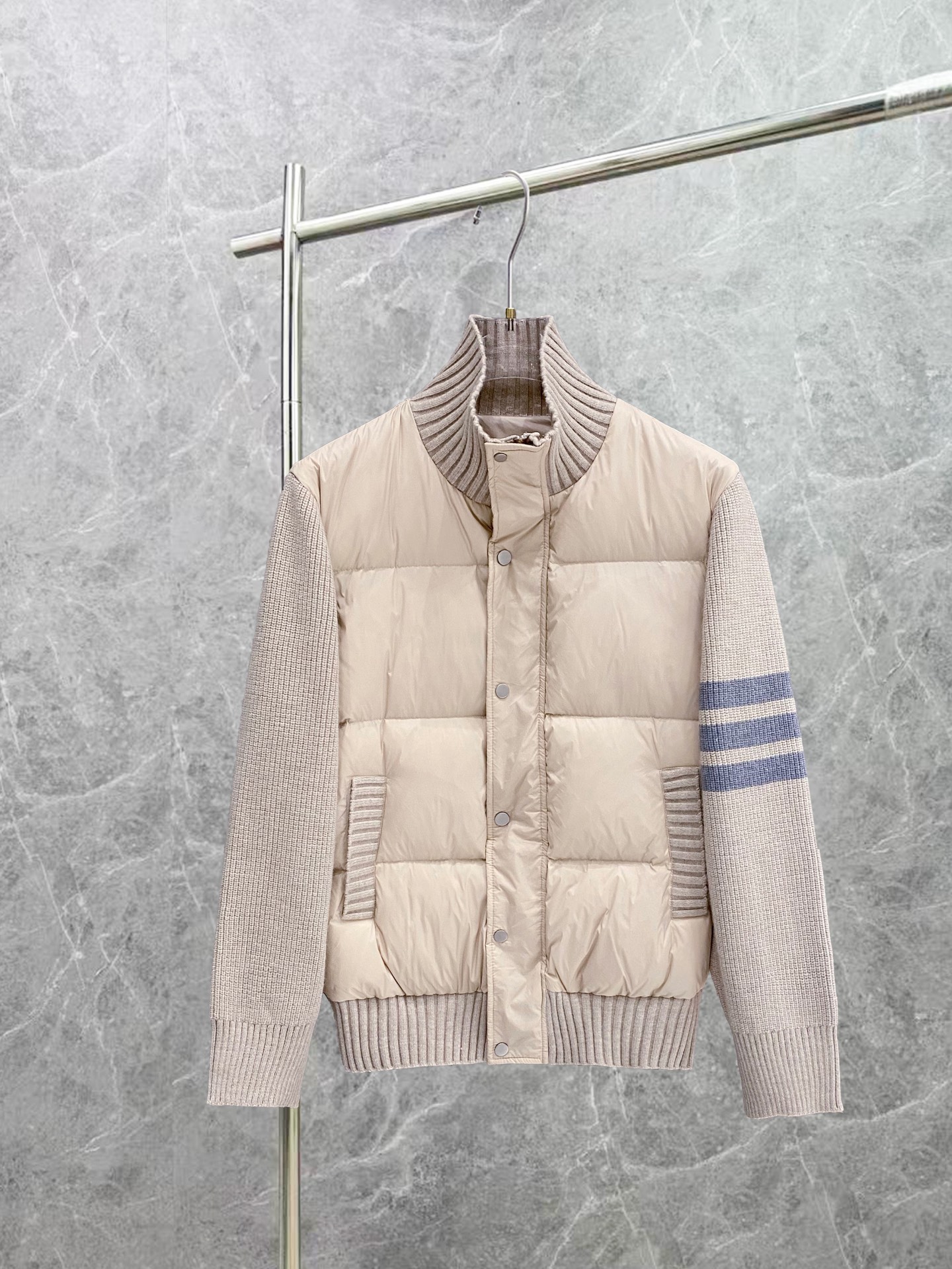 Details: Knitted - sleeved hooded down jacket with horizontal quilting, a slim fit, filled with new - standard white duck down, and a lightweight waterproof outer fabric.