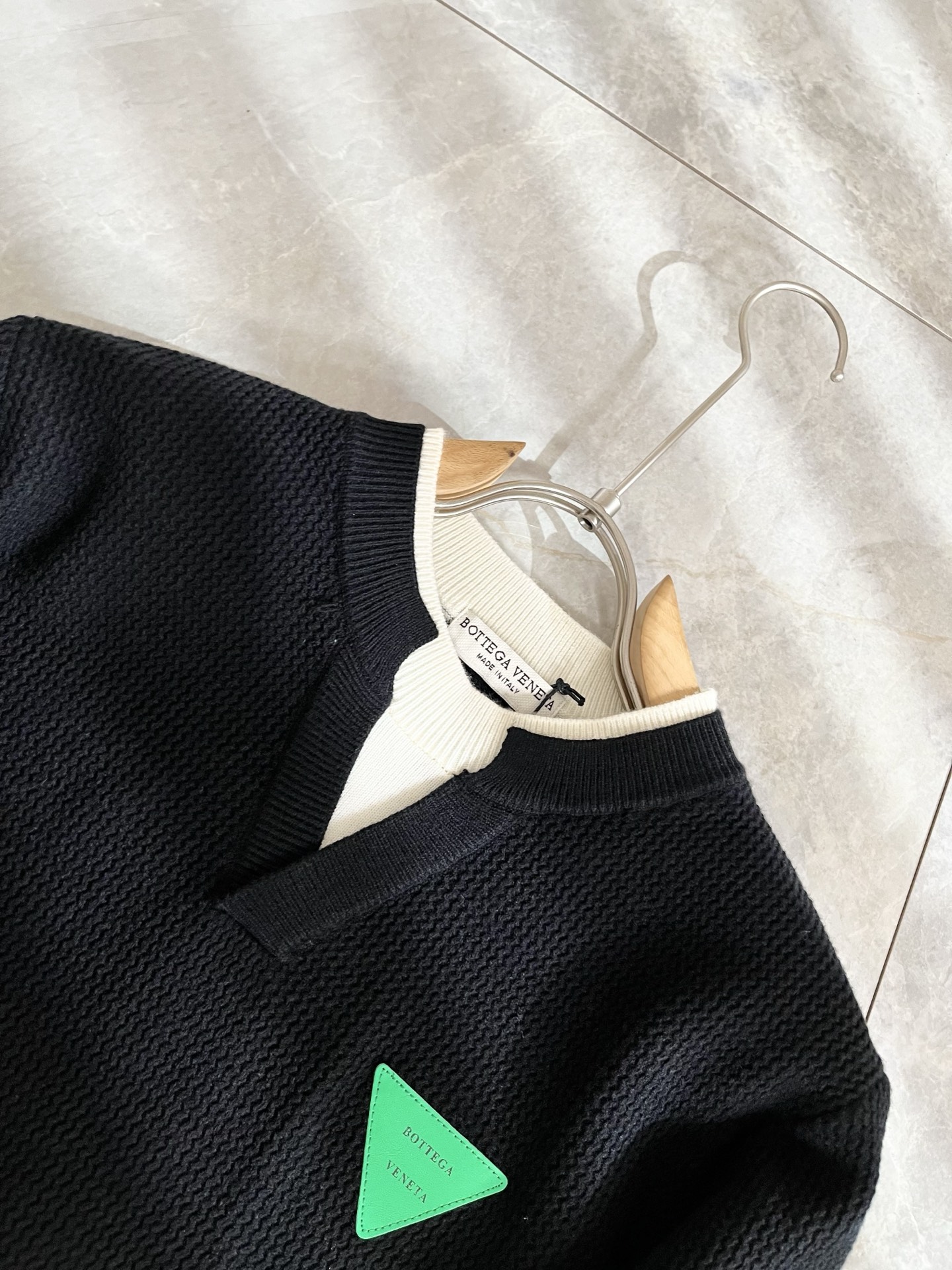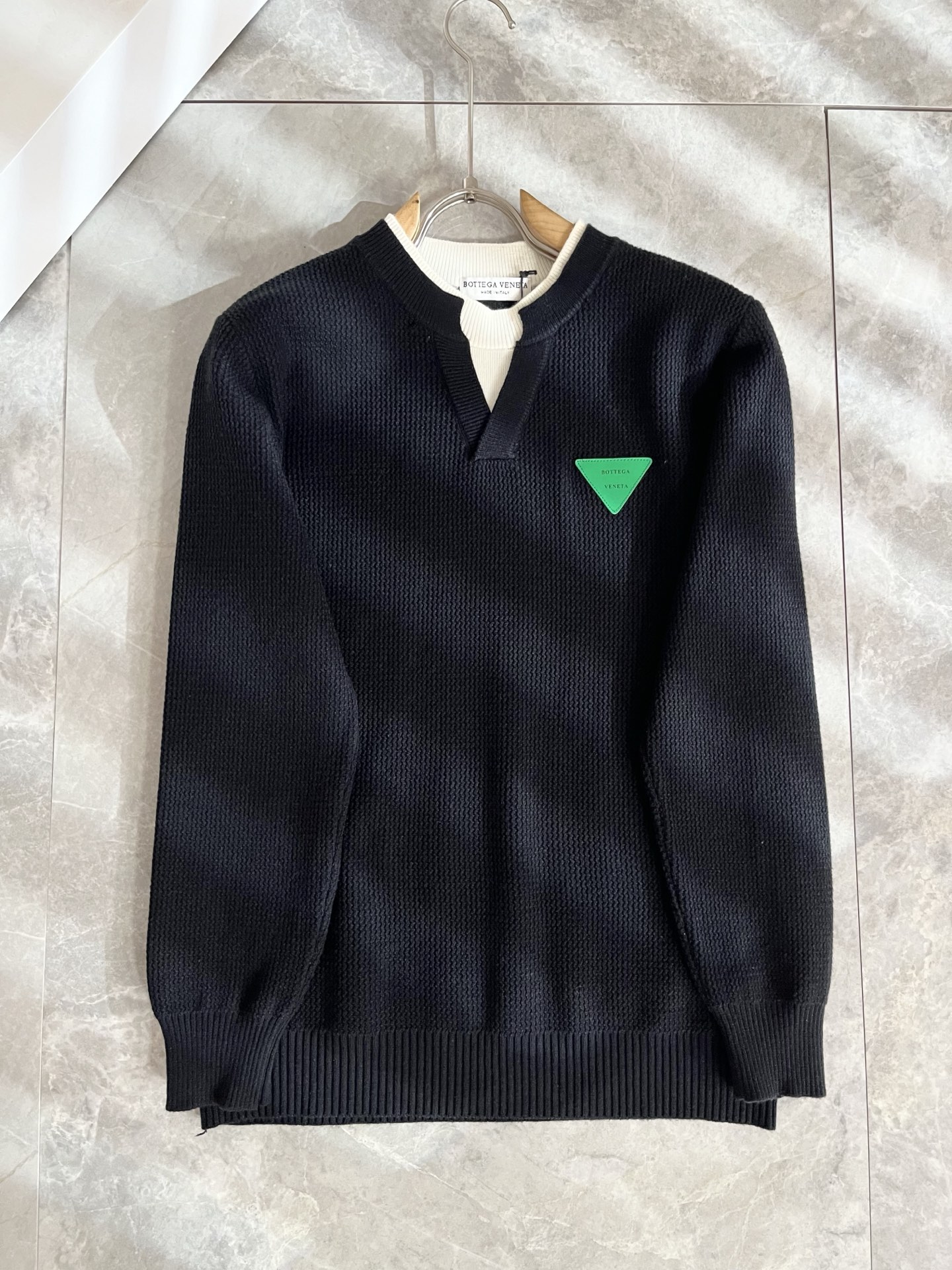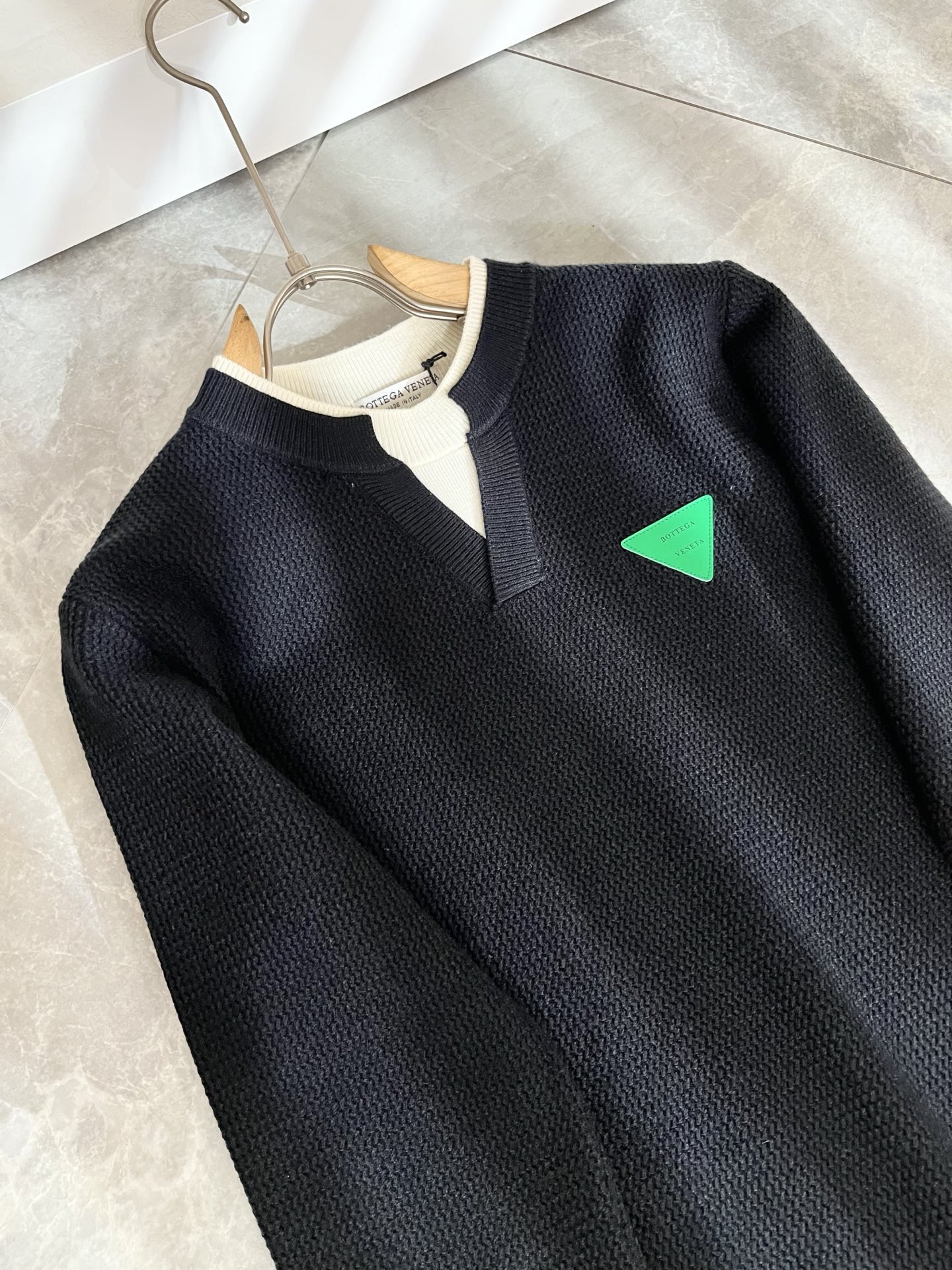 Details: Solid-color knitted wool sweater with custom fabric and leather logo design