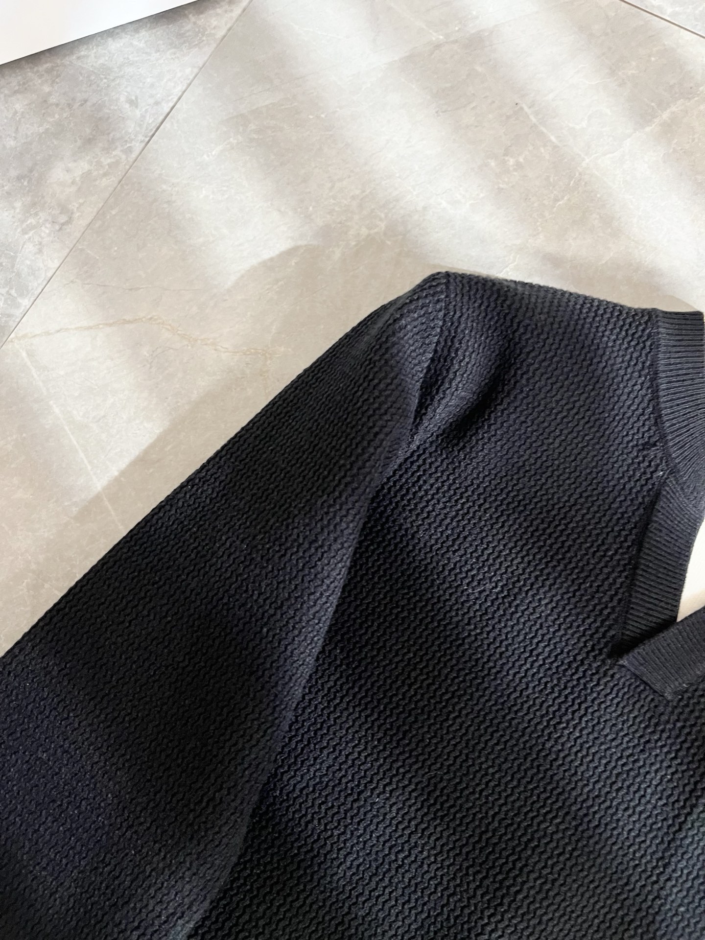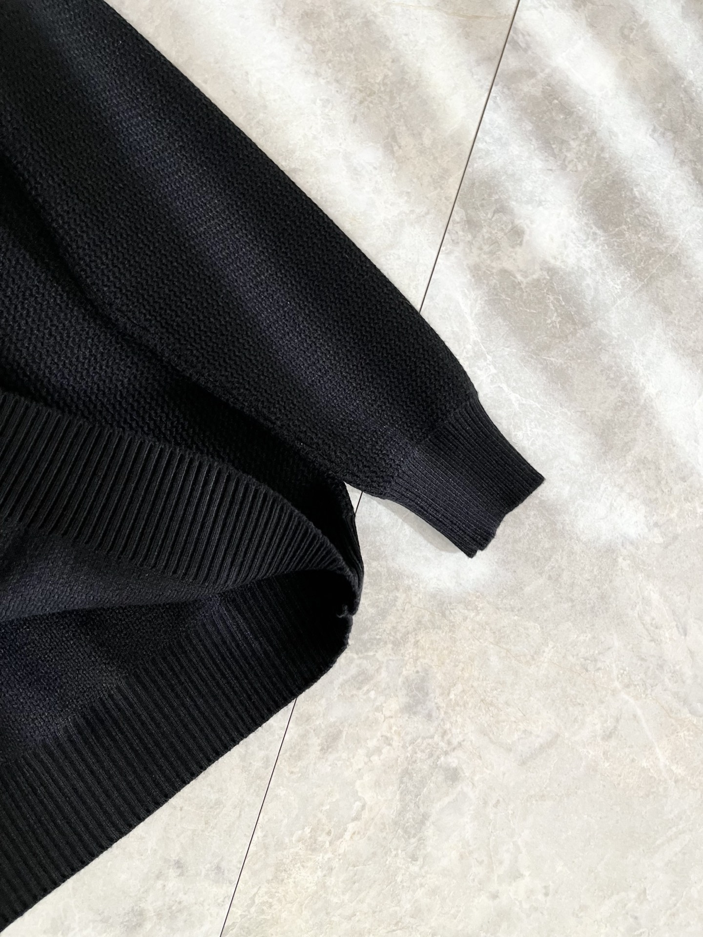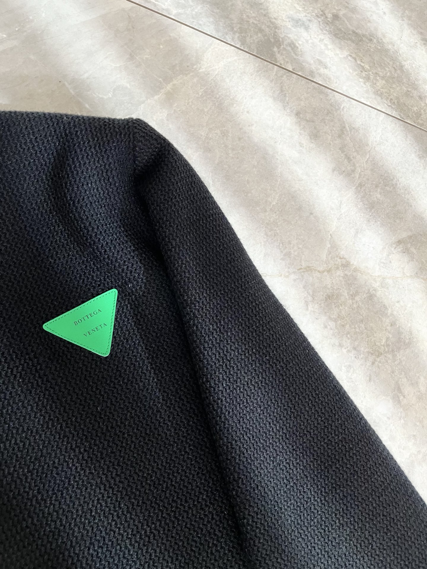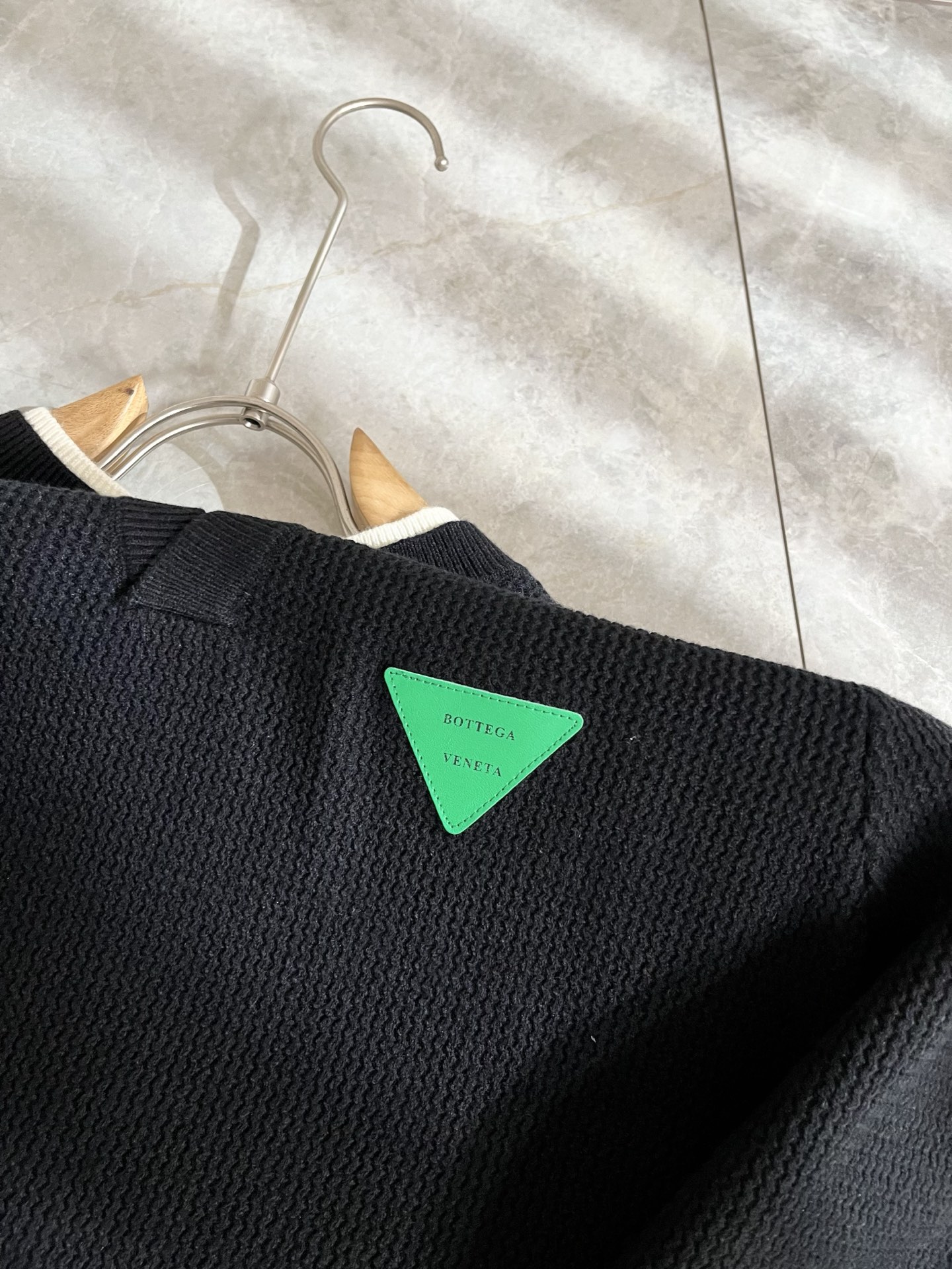 Details: Solid-color knitted wool sweater with custom fabric and leather logo design