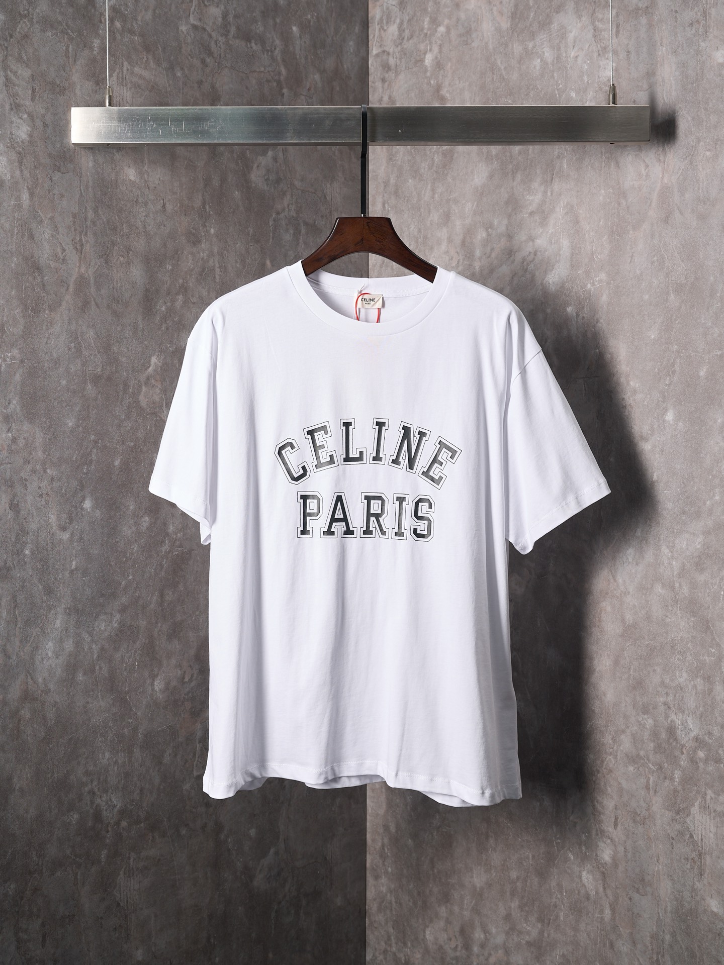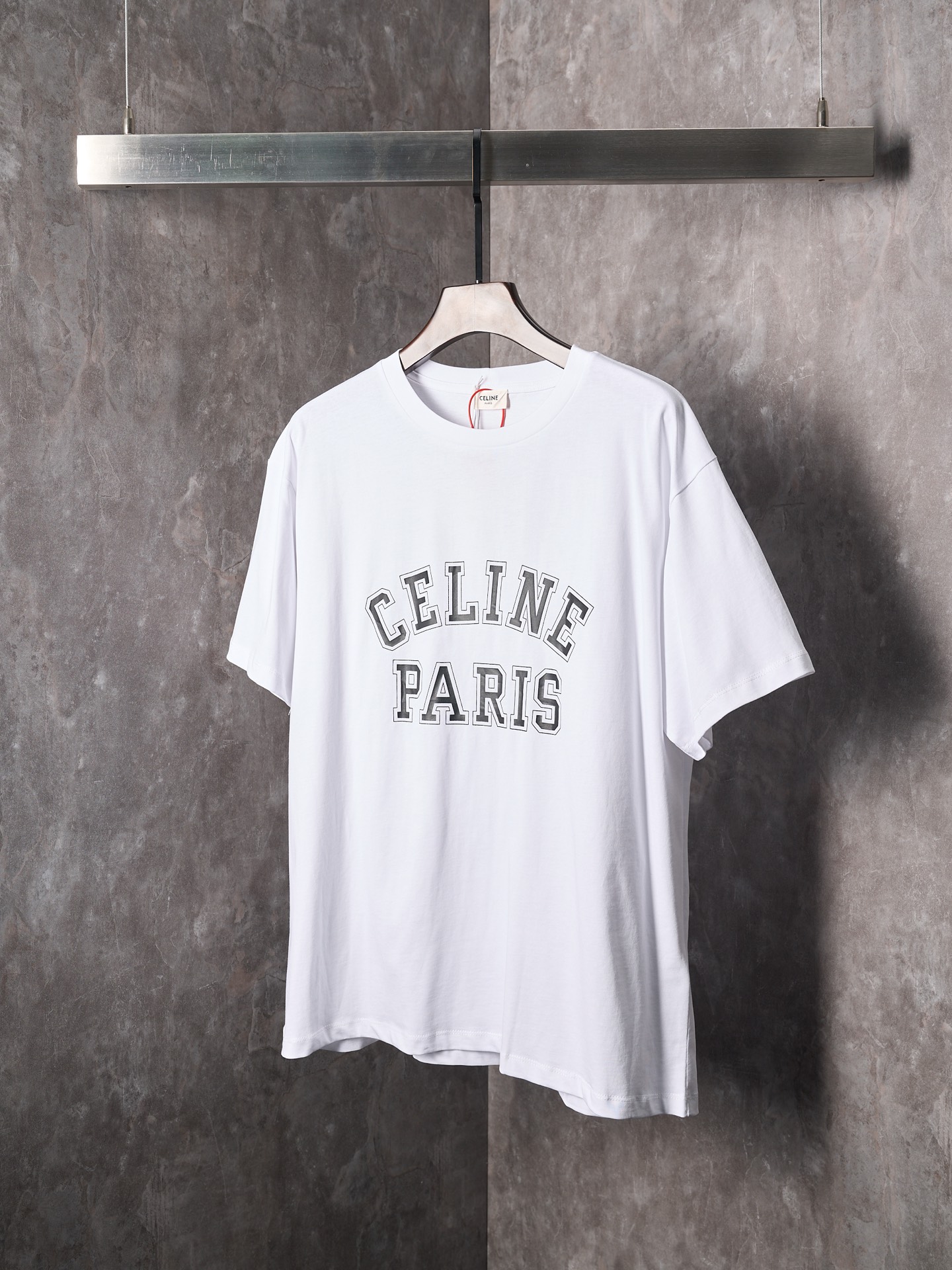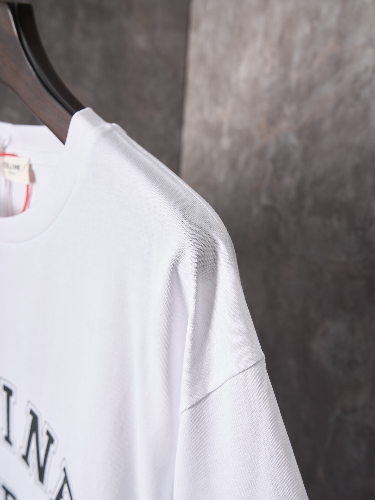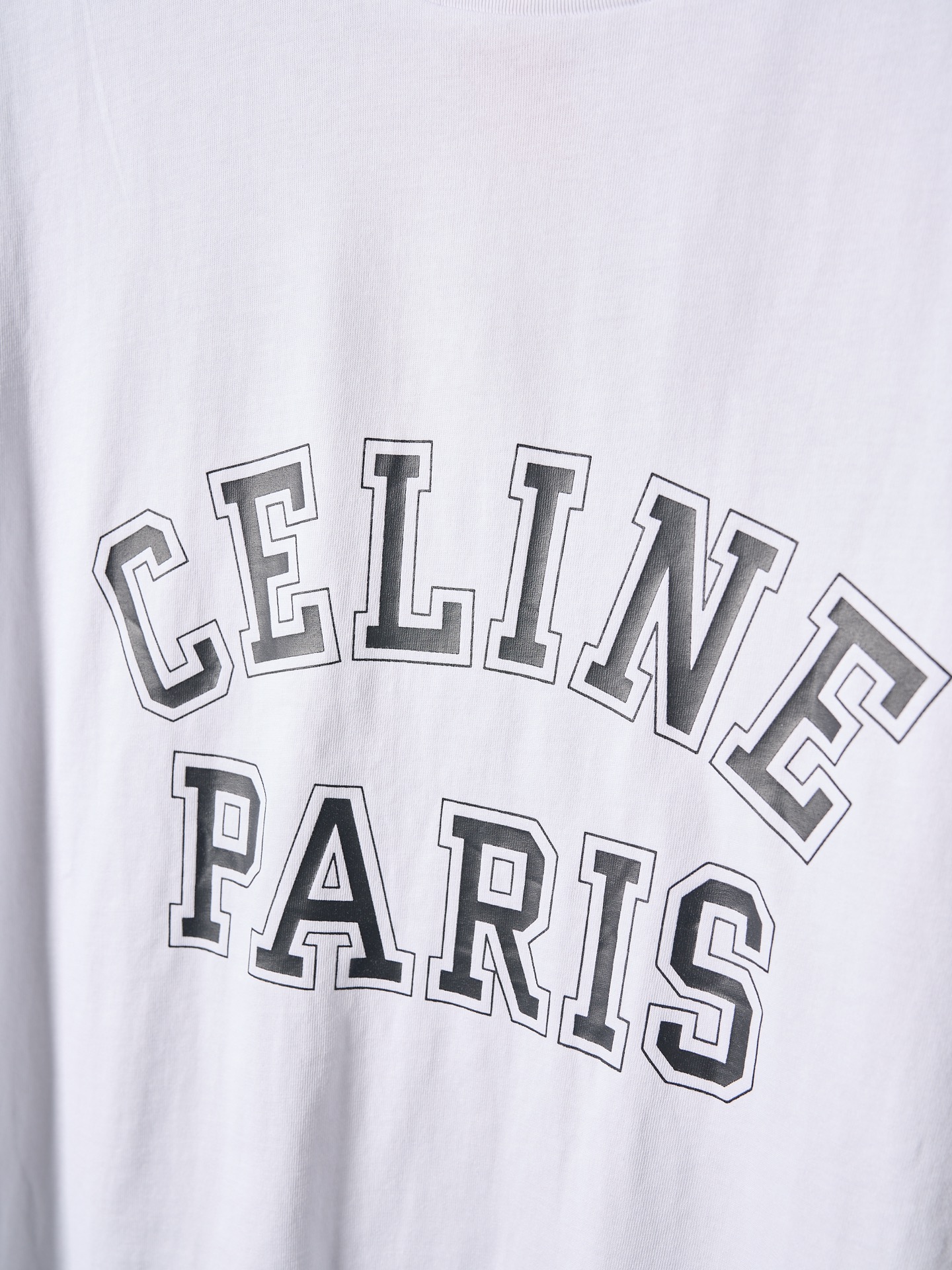 Details: Ivory-colored short-sleeved round-neck top with a logo print, featuring a loose fit