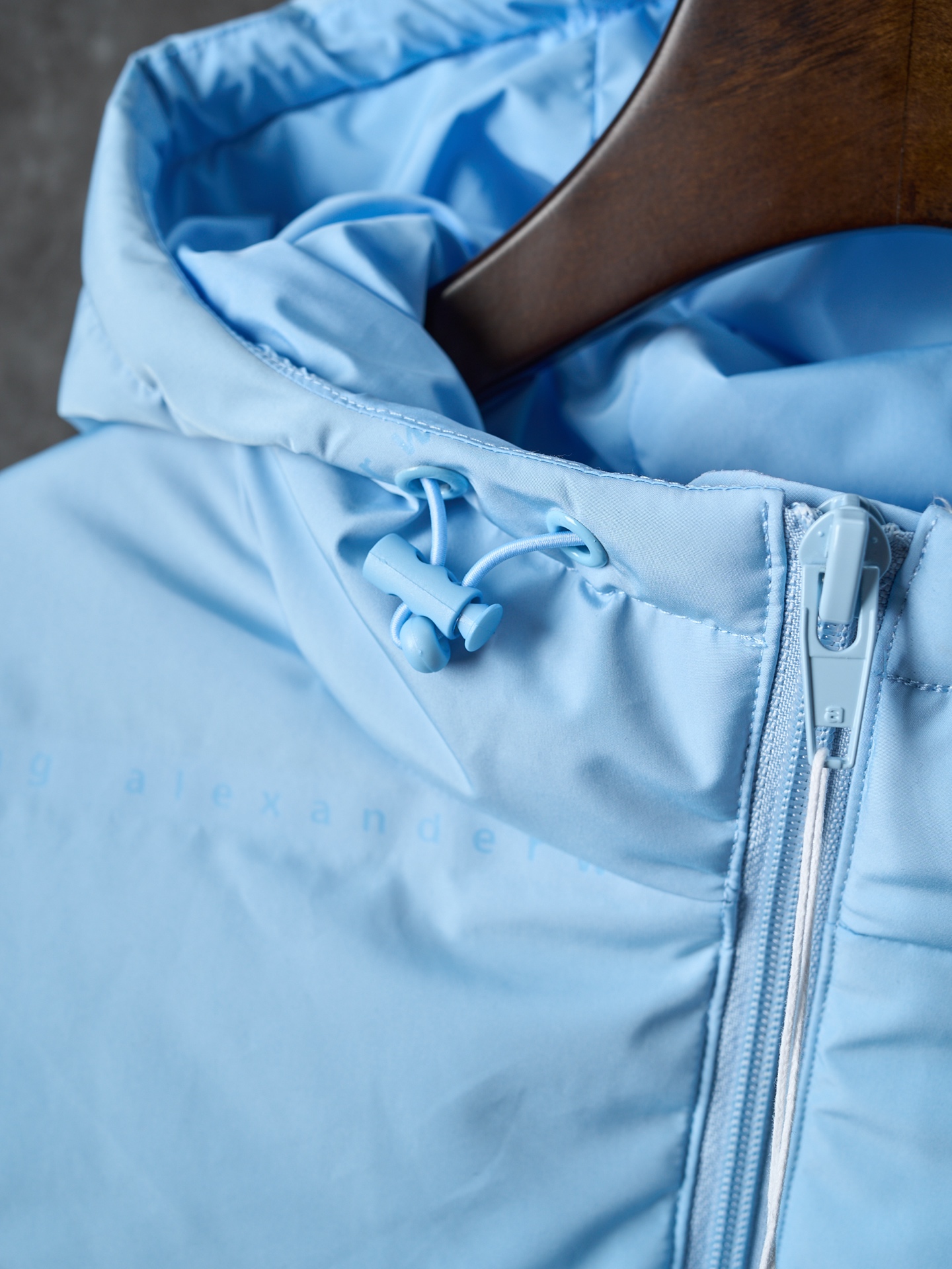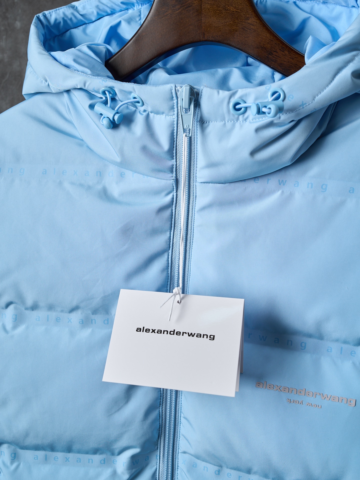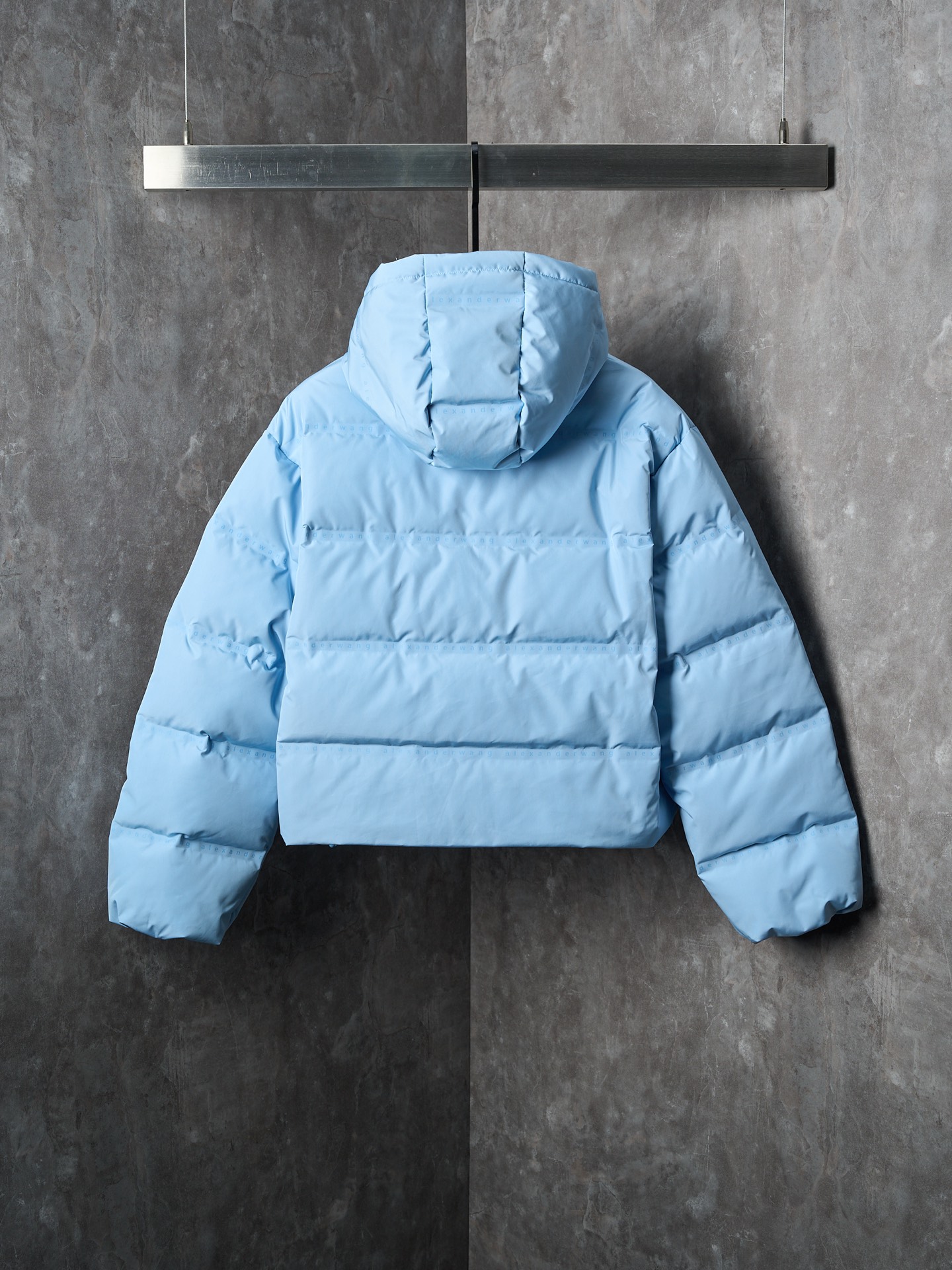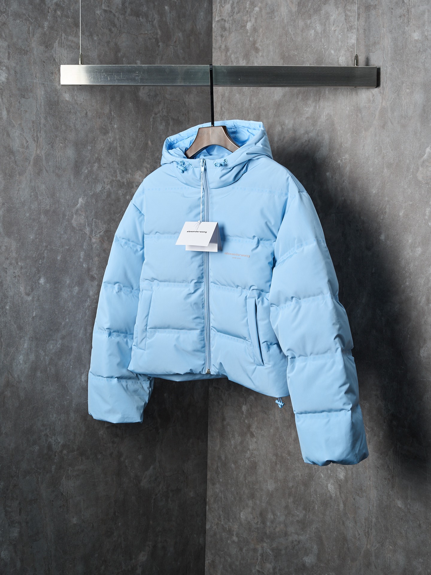 Details: Short hooded down jacket with small letter check pattern. Available in black, blue, white, and pink. Features logo print on chest, front zipper, pockets, elastic hem, funnel neck, and lined interior.