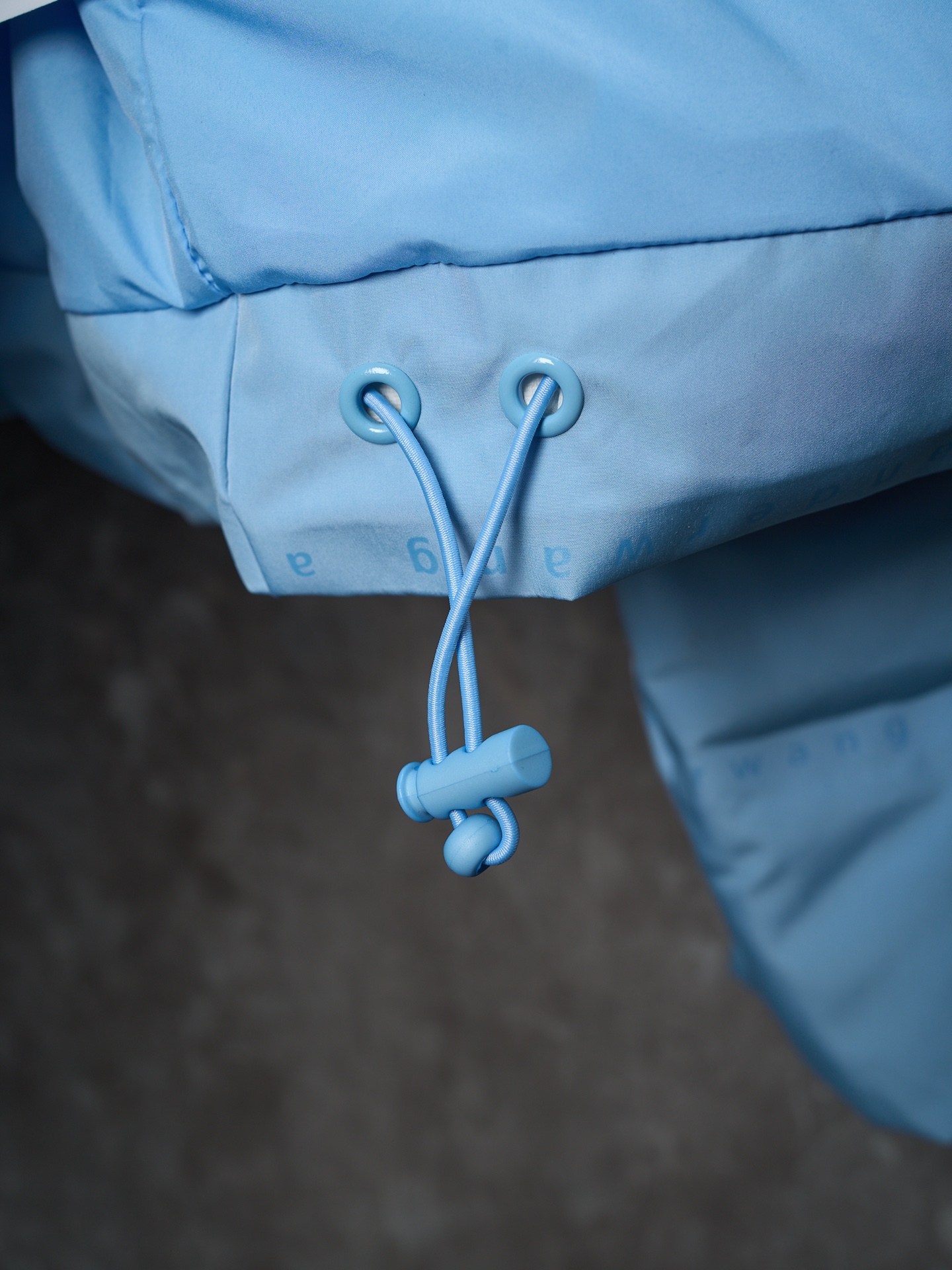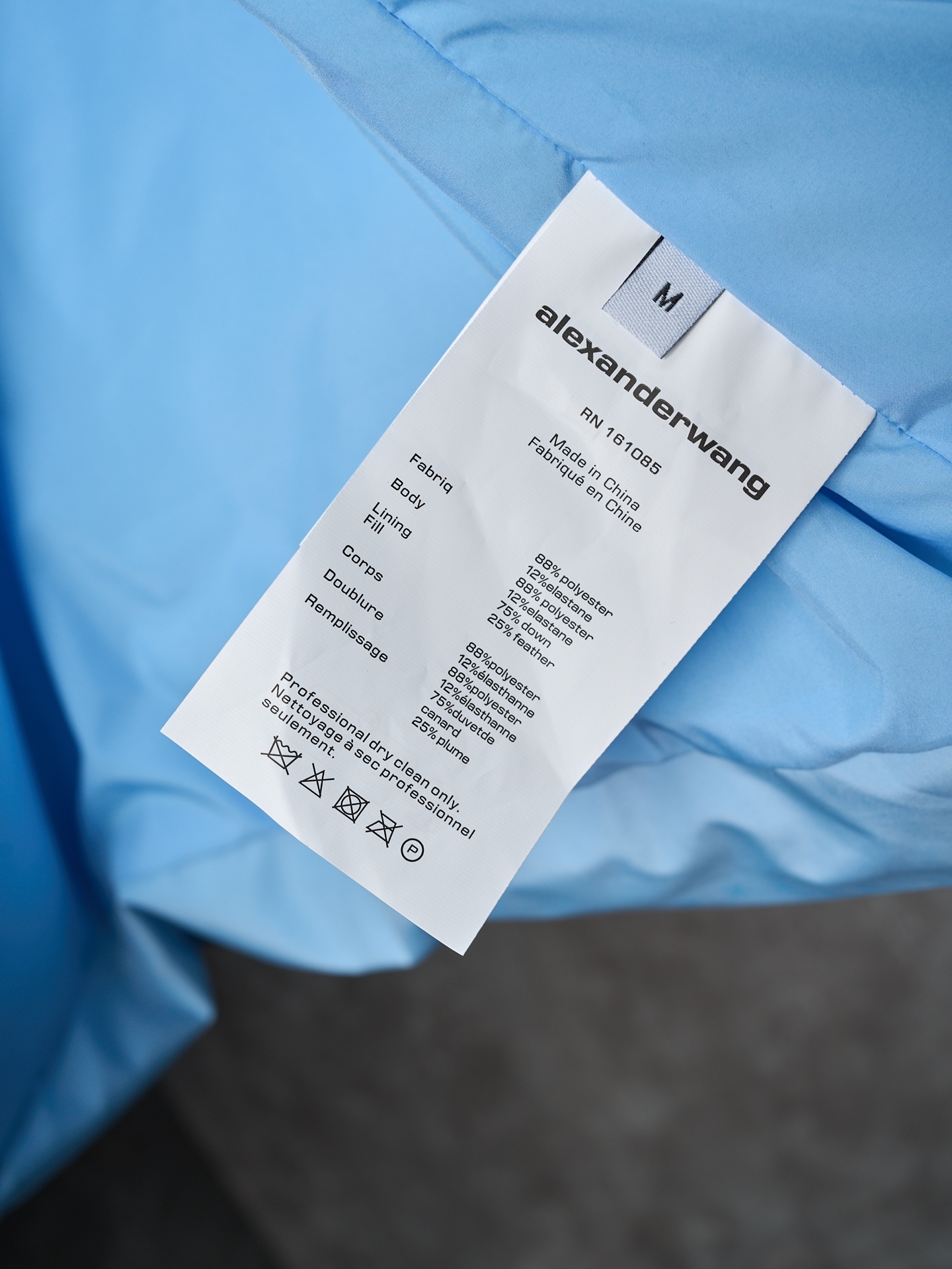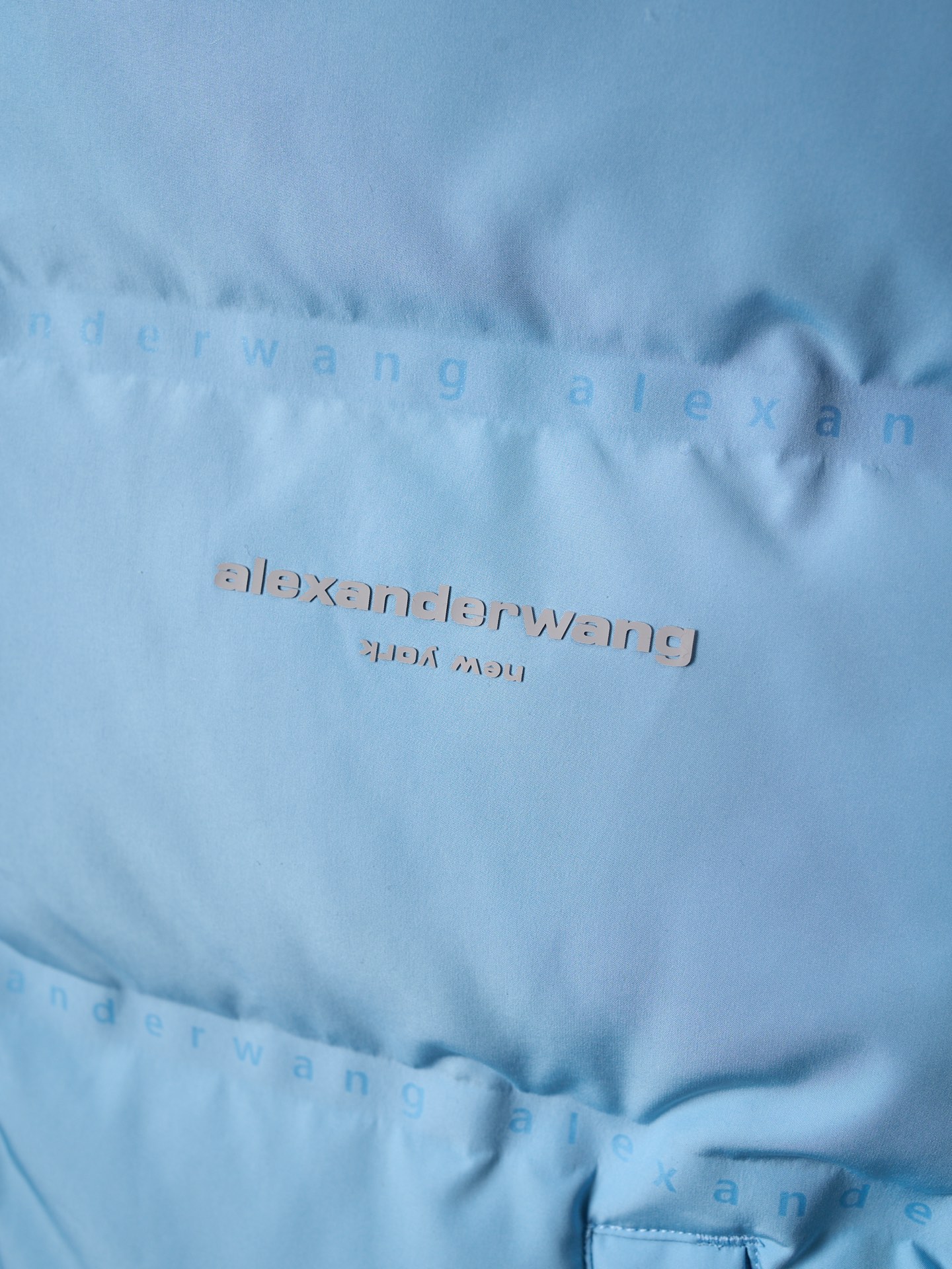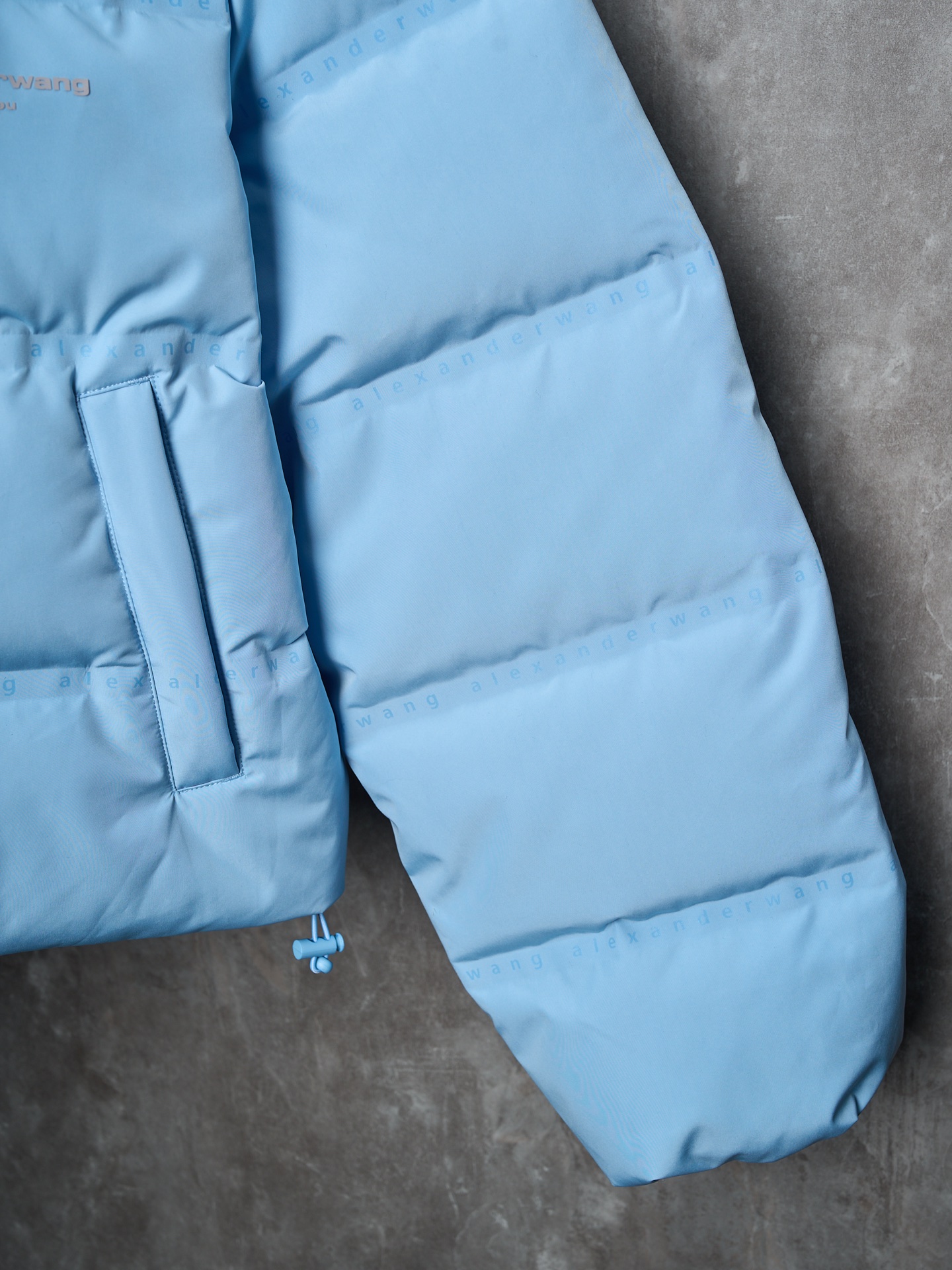 Details: Short hooded down jacket with small letter check pattern. Available in black, blue, white, and pink. Features logo print on chest, front zipper, pockets, elastic hem, funnel neck, and lined interior.