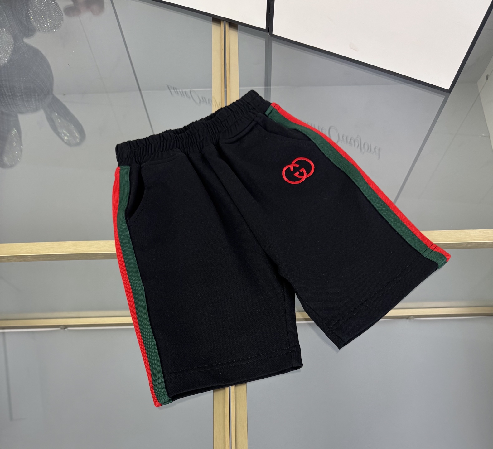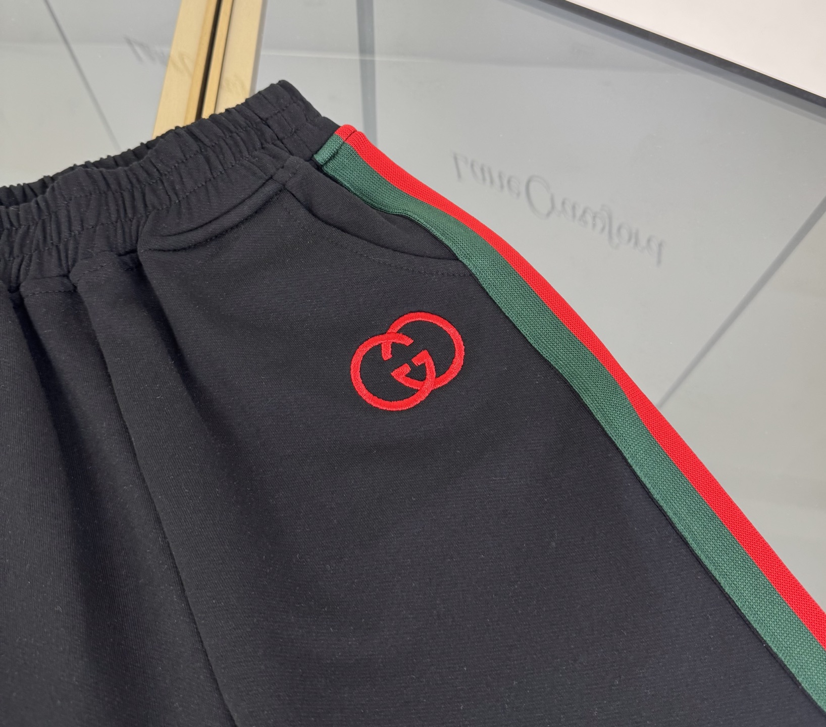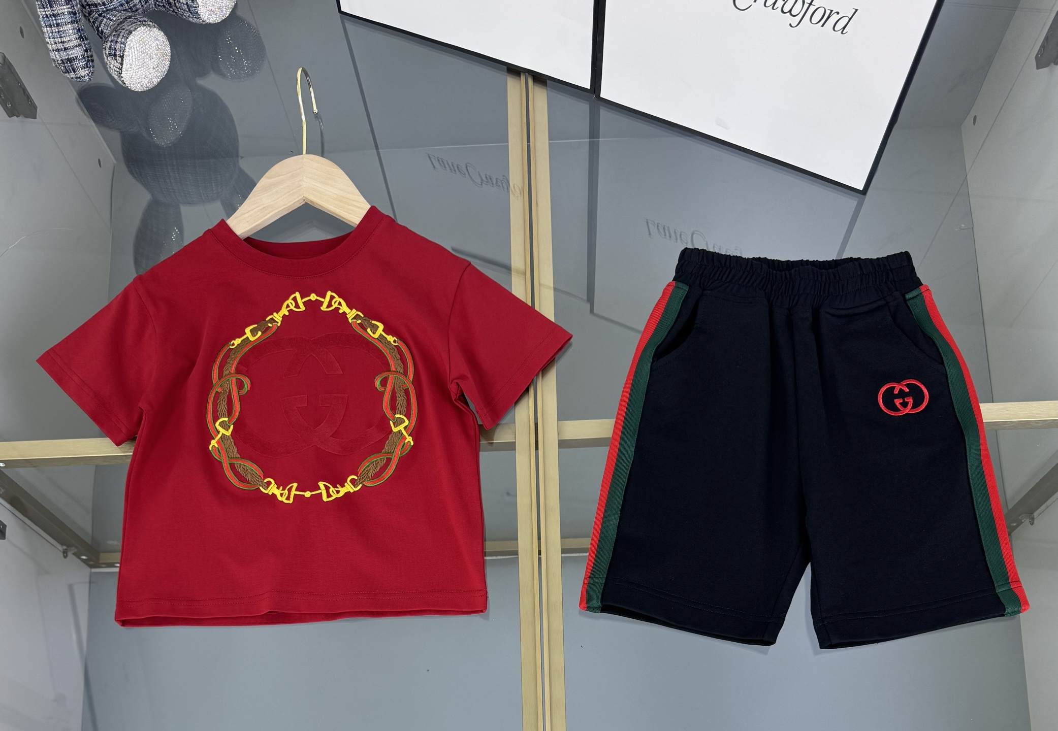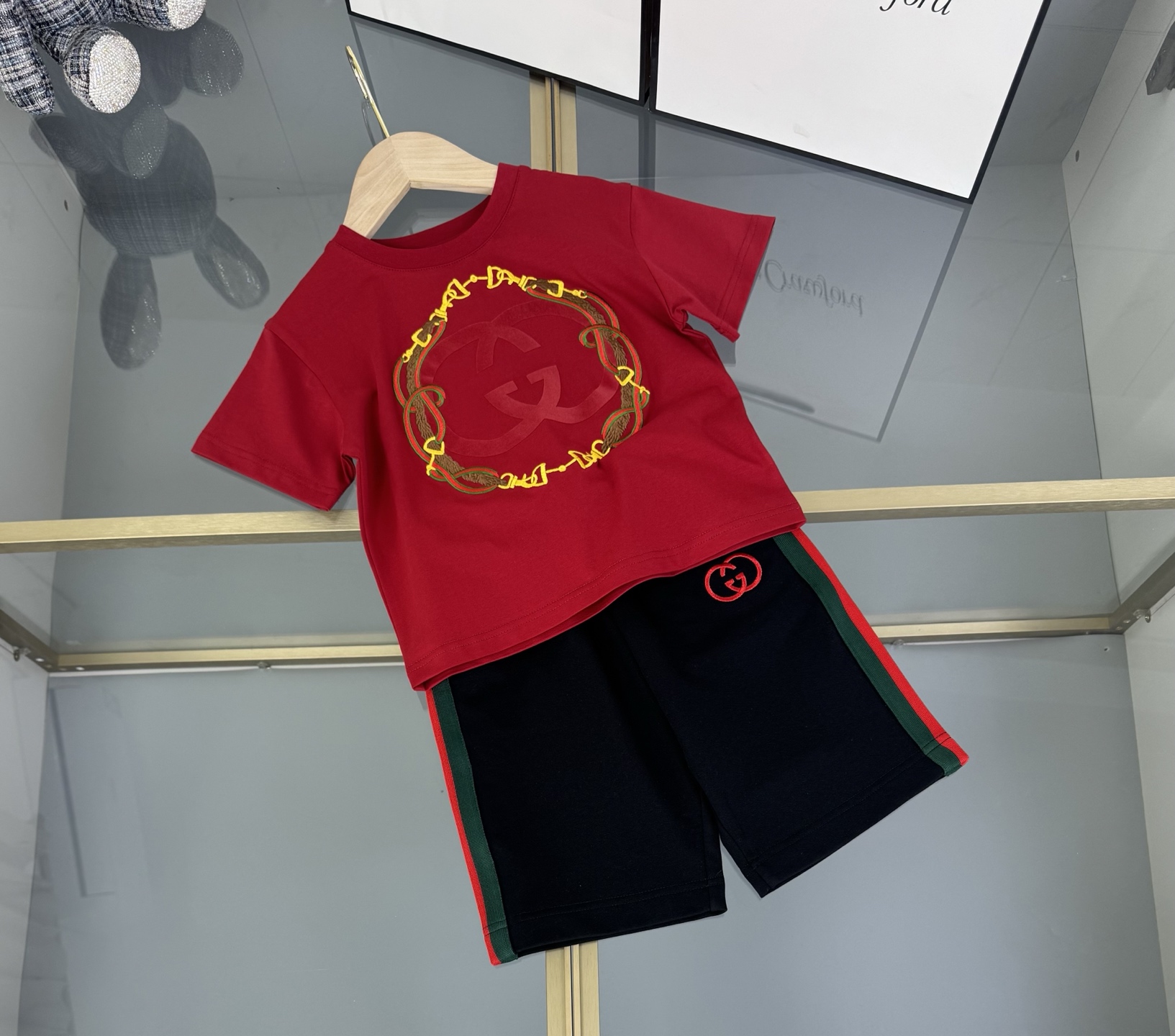 Details: High-end childrens Gucci suit with double-G 3D print and custom webbing splicing
