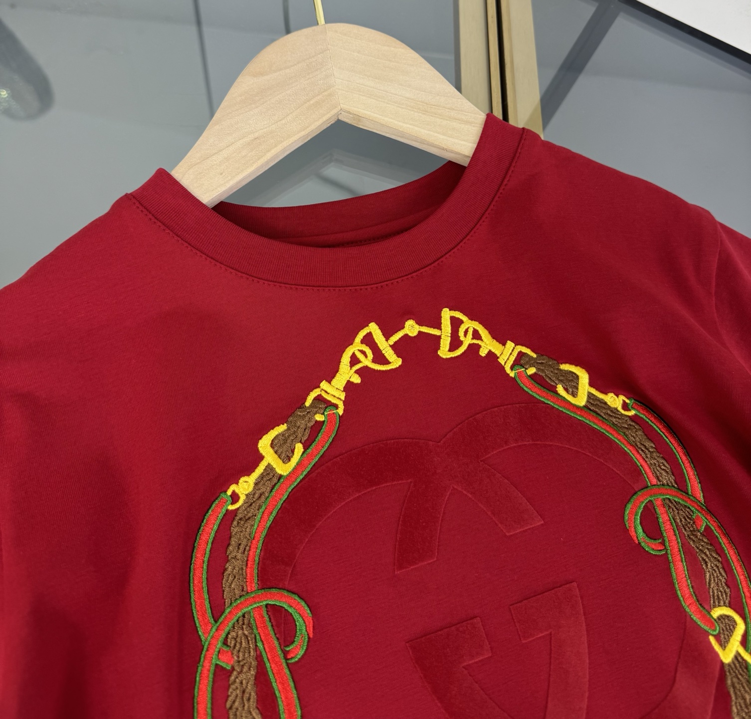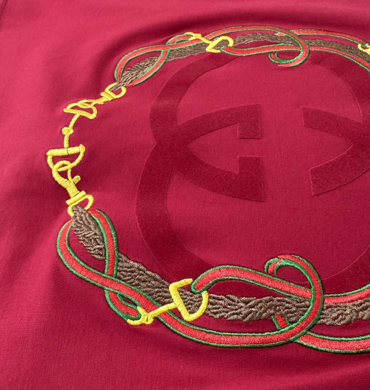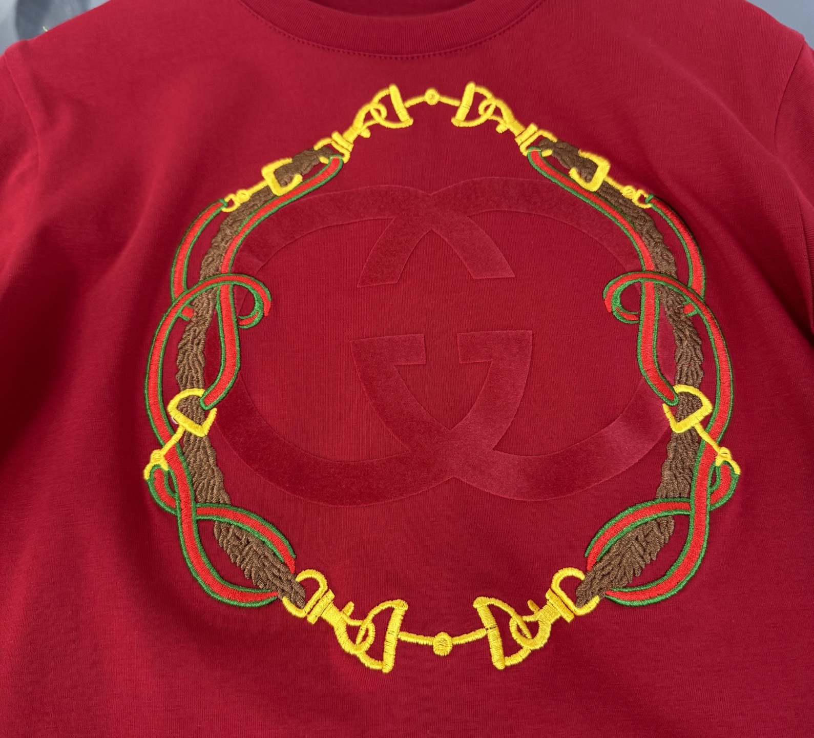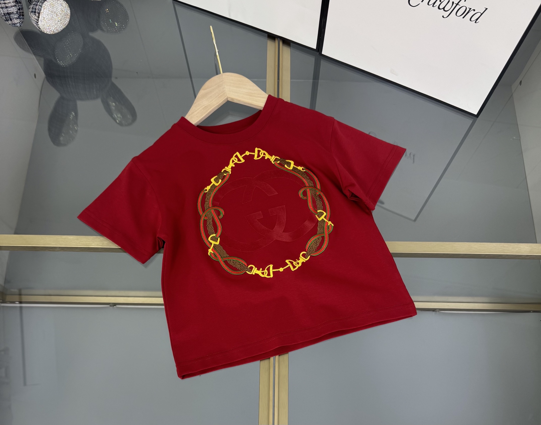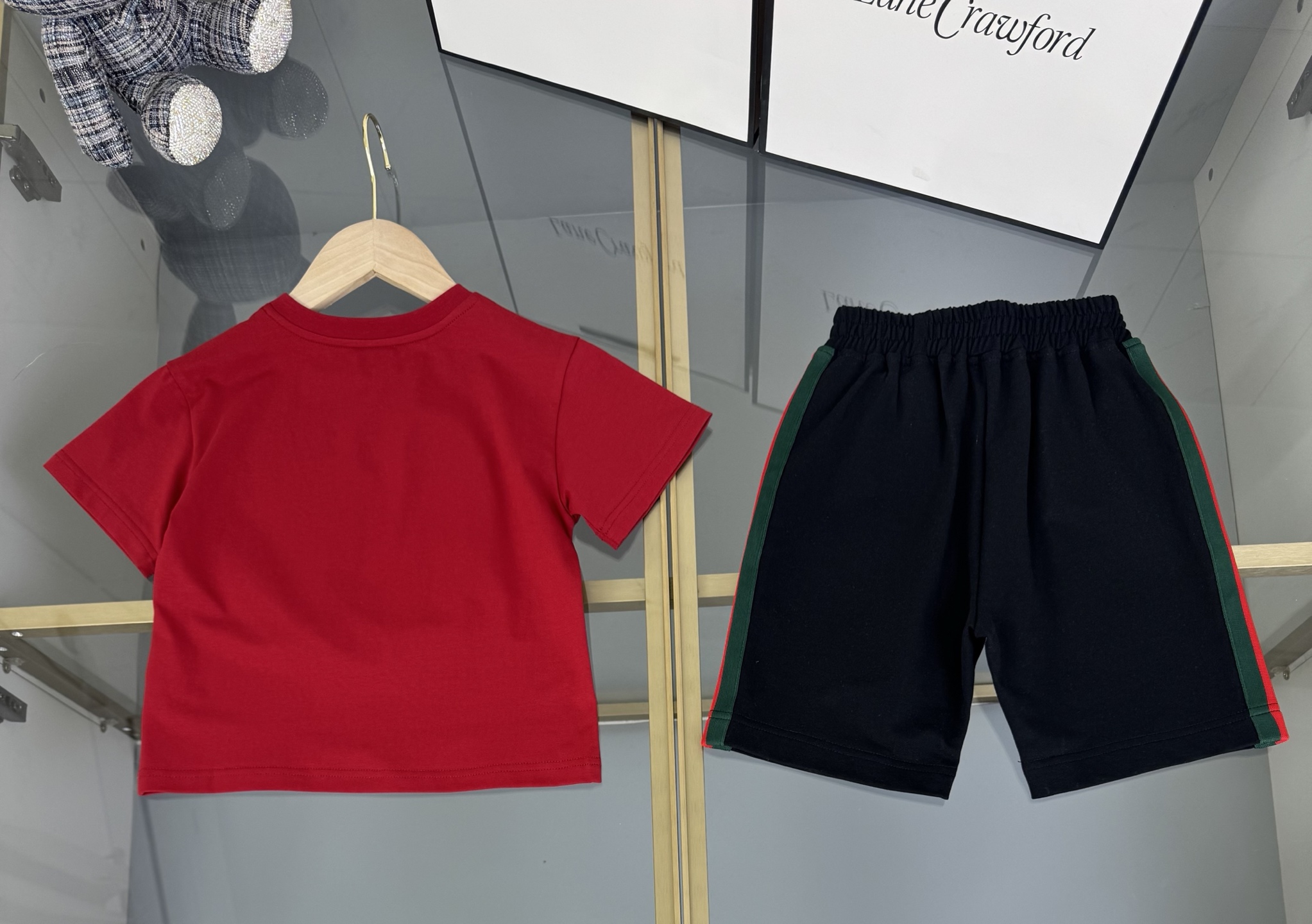 Details: High-end childrens Gucci suit with double-G 3D print and custom webbing splicing