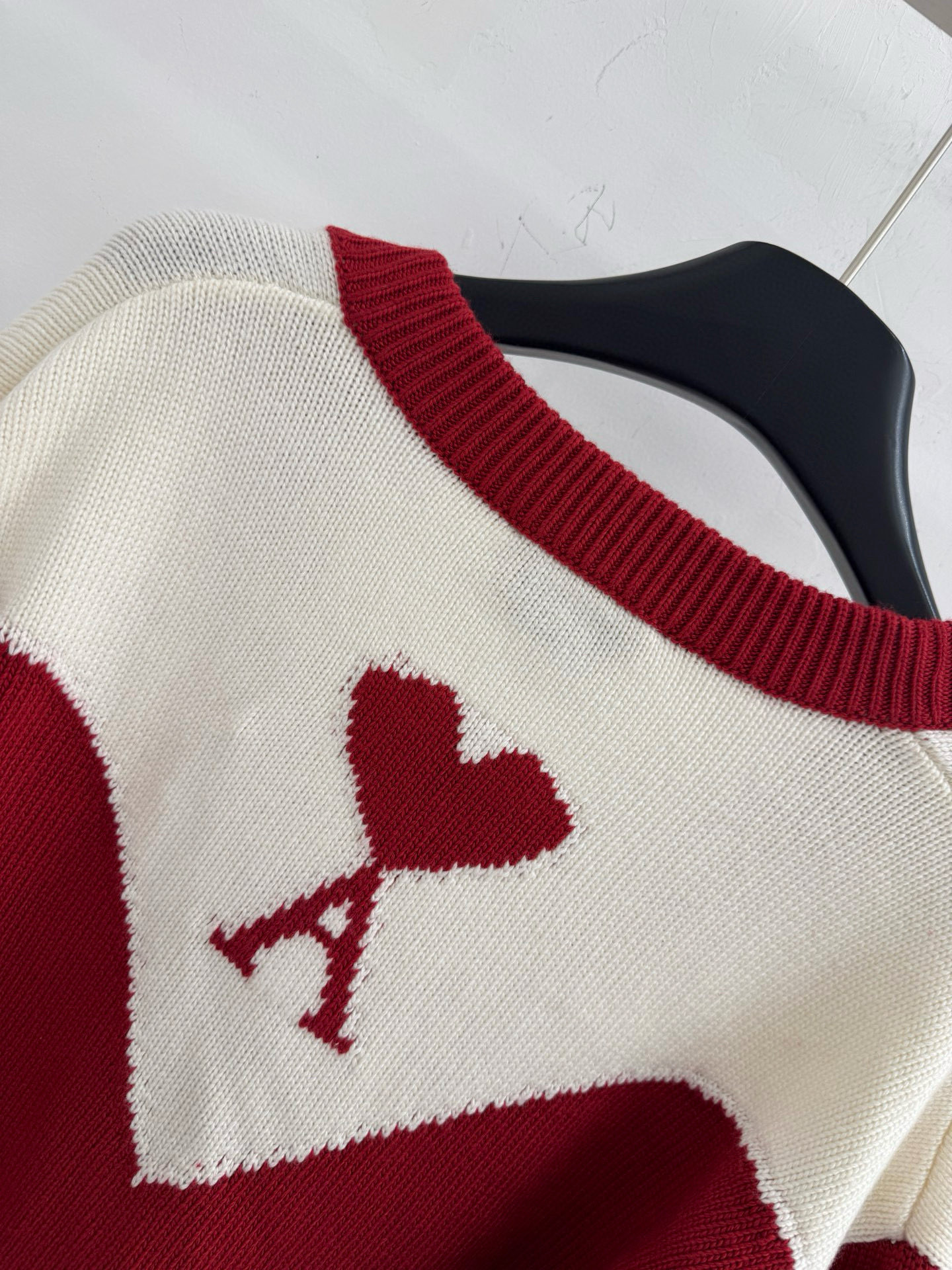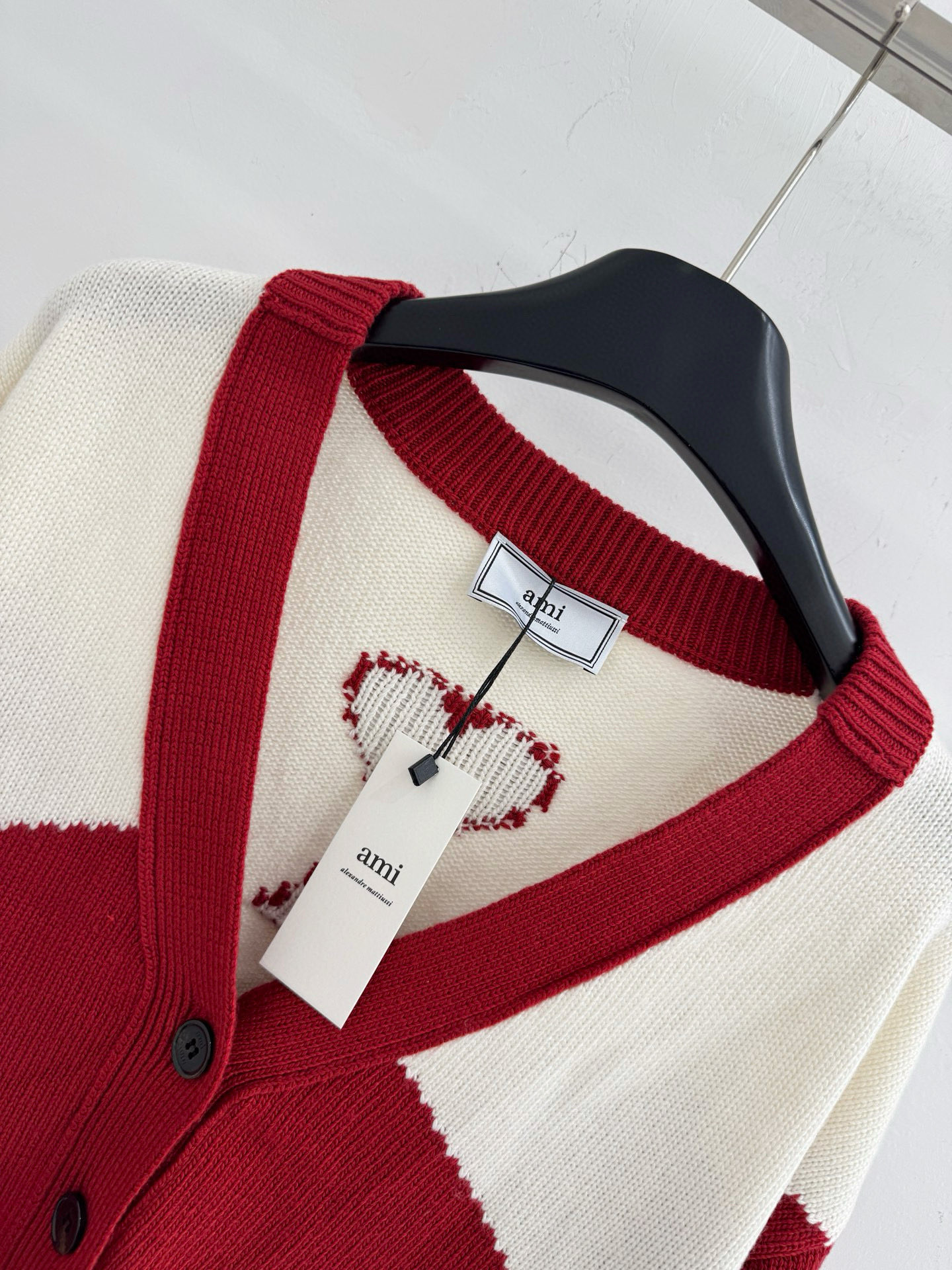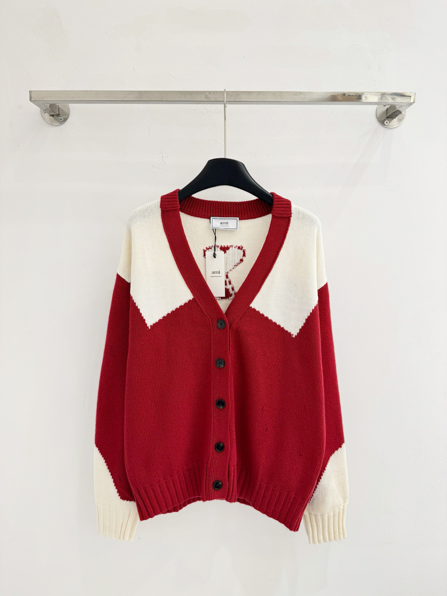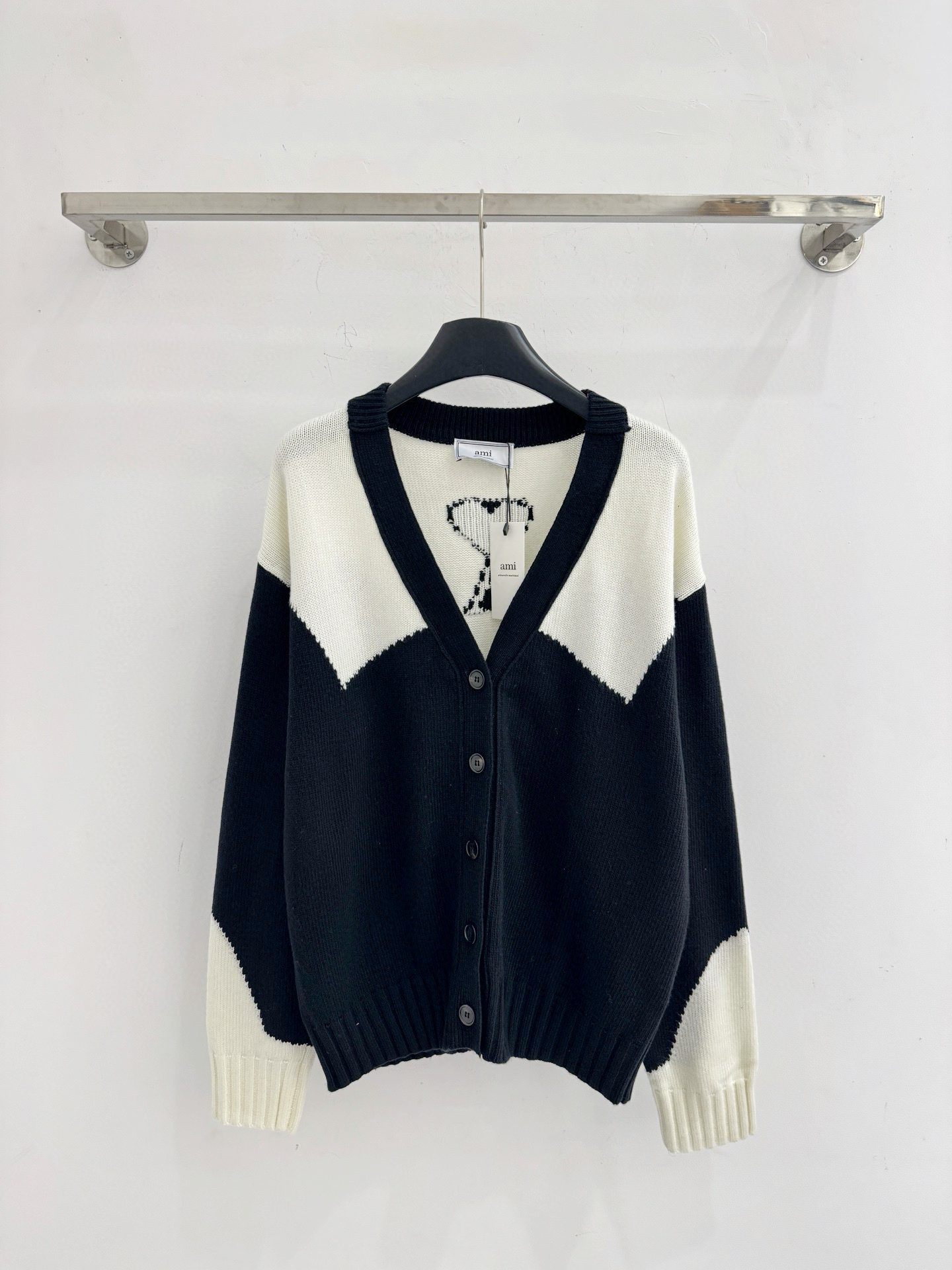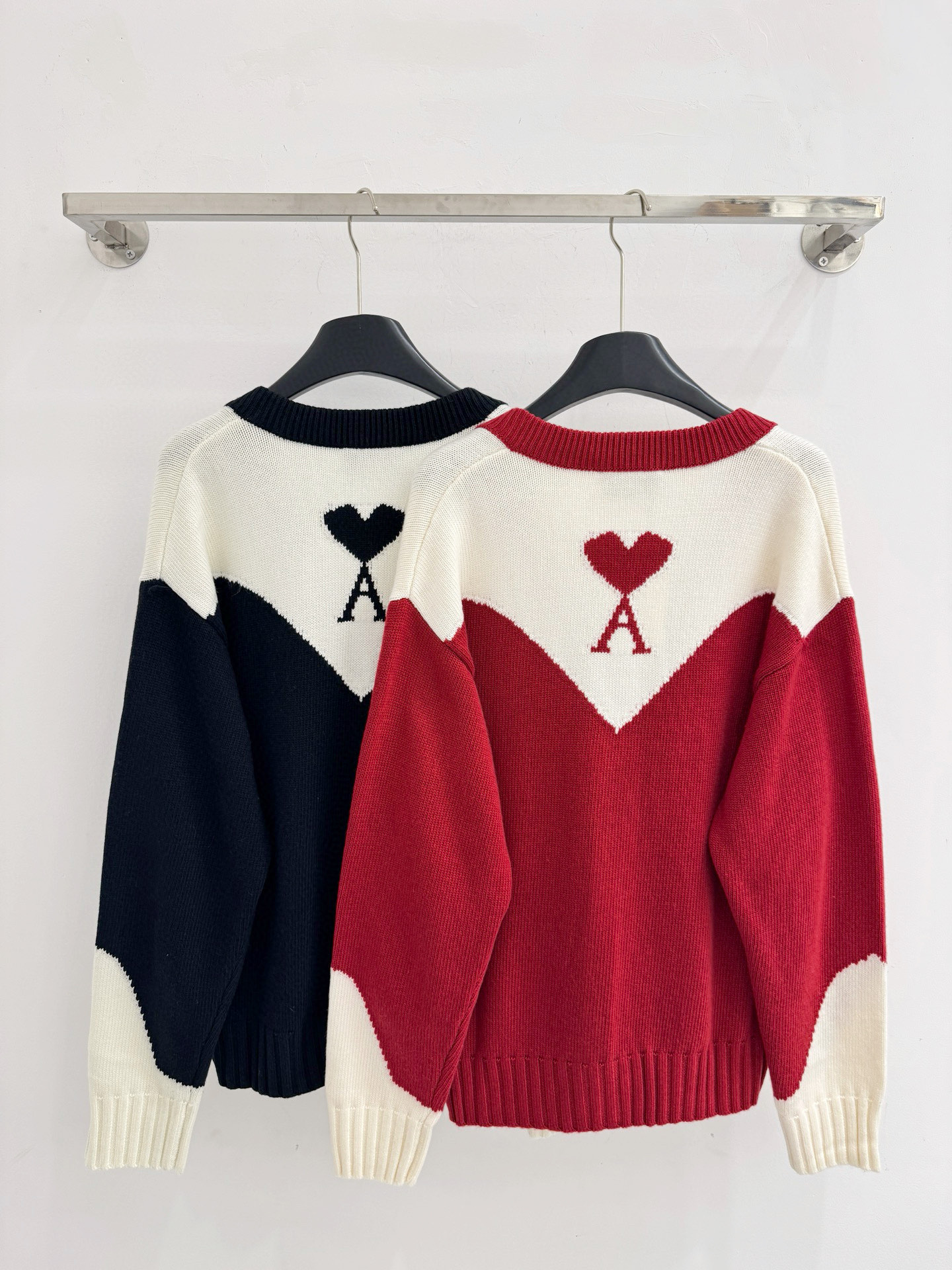 Details: Autumn and winter color-blocked V-neck knitted cardigan with heart and letter jacquard on the back.