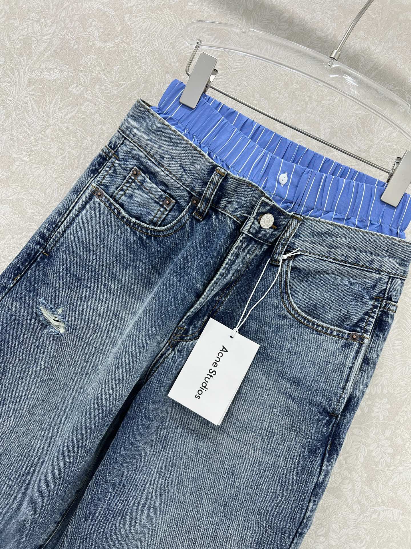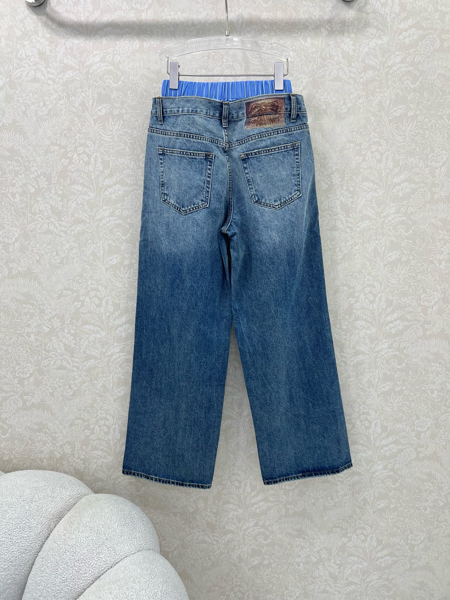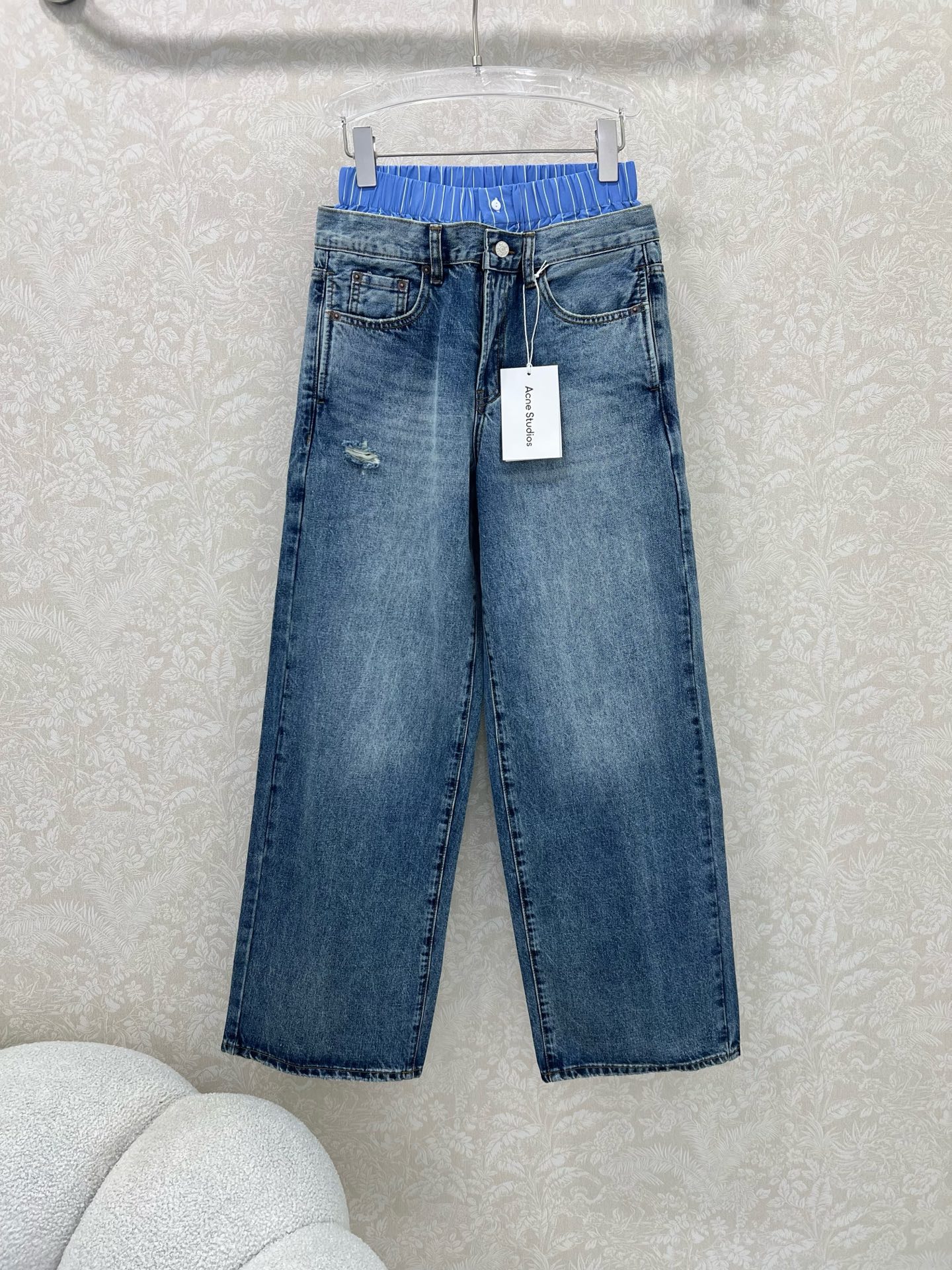 Details: Trendy wide-leg jeans with a dual-waistband design, made from custom denim, suitable for both men and women, in two colors.